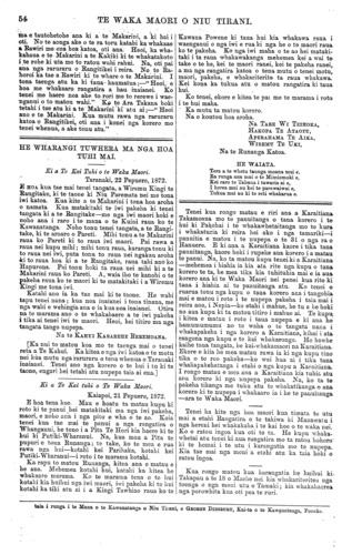 TE WAKA MAORI O NIU TIRANI. 53 rere tonu mai ana ki konei i tenei takiwa, na aua tima i hono; ko nga tima ki te moana ko nga rerewe ki uta, nga rerewe o konei me nga rerewe o kona—mana tatou e whakakotahi, e whakakotahi ki te aroha, ki te rongo pai, ki te whairawatanga. I mua ai ko Ingarani anake mana e tango nga huruhuru, nga muka, nga hinu, me nga mea ke atu e mahia atu ana e tatou—ko tenei kua tuwhera te ara ki Amerika, na ka rua nga putanga mo nga taonga o tenei motu, ka rua hoki nga huarahi mai mo te moni me te rawa ki a tatou. Ko tetahi tena o nga mahi pai o tenei Kawanatanga o Niu Tirani; na ratou hoki i tiki ki reira whaka- rite ai i aua tima kia haere mai ki konei ki te kawe mai i nga Meera, ki te homai i nga taonga pai o tena kainga, ki te tiki mai hoki i o konei taonga ka mau atu ki reira. No te 21 o nga ra o Pepuere kua taha nei i rere atu ai i Po Neke nei tetahi o aua tima kawe meera, he tima nui rawa; nga tana taonga e taea ana e taua tima e rua mano kotahi rau e rua te kau ma wha—ko te Newata te ingoa (Nevada.) Nga utanga i mauria atu e taua tima, no nga kainga i a Ngaitahu kotahi mano kotahi rau kotahi te kau takai huruhuru, muka, pata hoki (wai u kau nei); no Po Neke e rima te kau ma iwa peeke huruhuru, e toru te kau peeke muka— kia tae ki Nepia, ki Akarana hoki, he nui ano nga huruhuru me nga muka kei aua kainga hei utanga mo runga ano i taua tima. E puta mai ana aua tima ki konei i roto i nga marama katoa. Na, ki te kore tatou e kite i te rawa i runga i tenei mahi, ehara i te tangata ke te he, na tatou ake ano te he. E pai ana kia kaha tonu tatou nga pakeha me nga maori ki te whakatupu harakeke hei muka, no te mea tera e pau katoa atu i taua whenua; he iwi nui hoki ia, he nui ona tangata, he kaha ki te mahi i nga mahi katoa, te whatu kahu, te whiri taura, te aha noa atu—ka kore e pau ki Ingarani o tatou muka tera e pau ki reira. Me ata mahi mame te whakatupu o te harakeke kia pai ai, kia pirangitia ai hoki—me mutu hoki te tahutahu ki te ahi kia toe ai hei muka. Ka kore tatou e whakaaro ki enei mea e kore hoki tatou e kite i te rawa, ka kuare tonu tatou— ehara hoki i te tangata mana tatou e whakakuare, ma tatou ano, ma te mangere. Kati hoki pea nga korero mo te taha ki Amerika; me whakaputa tenei kia kotahi noa hoki te kupu mo nga rerewe o etahi atu whenua. Tera ano hoki tetahi rerewe roa rawa e mahia ana i Kanata (Canada ), he kainga nui rawa kei te taha ki te Nota o Amerika. Ko tetahi pito tonu ia o taua whenua, engari he whenua no te Kuini—kei raro i te mana o te rangatiratanga o Ingarani. Taihoa e 1 korerotia nga mahi o tera whenua, hei tetahi atu takiwa. Ko nga motu rangatira katoa o te ao kai te mahi katoa i tenei hanga i te rerewe hei painga mo ratou—ekore hoki e pai kia mahue tatou ki muri, kia hapa ko tatou anake. I te tau 1851 e rua rau tonu maero te roa o nga rerewe o te whenua o Wi Wi me ka huia katoatia. I te tau 1857 kua wha mano e rima rau maero te roa o nga rerewe o taua kainga; tae rawa ki te tau 1865 kua waru mano maero. Kai te nui haere ano te mahi rerewe i Teamani, i Ruhia, me etahi atu whenua kei reira. Nga rerewe o Peina (Spain) inaianei, e tae ana ki te wha mano maero te roa. Kei Itari (Italy ) e toru mano maero te roa— engari e mahia atu ana inaianei e rua rau e rua te kau ma rima maero i roto i te tau kotahi, ia tau ia tau. Ko Inia (India), he kainga nui no Ingarani, kai te rima mano e ono rau maero o nga rerewe o reira inaianei. Na, me titiro koutou, e whai ana te Kawanatanga o tenei motu ki te tauira kua oti te whakatakoto e te ao katoa; a me kaha tatou ki te hapai i a ratou (i a te Kawana- tanga) tikanga kia pera ai hoki tatou me era motu. RANGITIKEI. He mea tuku mai i Rangitikei na te tangata. KUA maha nga tau e kawe ana a Ngatikauwhata i ana tikanga pupuri mo Rangitikei. No tera tau ka korero tahi ratou ko te Makarini, ka whakaotia hoki i reira te nuinga o nga raruraru. I tenei taenga mai o te Makarini i Hanuere o tenei tau ka whakaotia katoatia. Ko nga kupu enei a Ngatikauwhata i te ra i oti ai te korero ki Whanganui—i haere hoki ratou ki reira kia kite i a te Makarini. Kei runga ko ERINA KOORO, ka mea;— " Whakarongo mai e te Makarini. To matou kupu ki a koe kua mutu i tenei ra nga raruraru o Rangitikei, mutu mutu rawa. Kaore he kupu ki muri atu nei o te iwi mo taua wahi penei me nga ra kua mahue atu nei i nga tau e kawe ana. Kei mea koe e te Makarini he kupu iti taku kupu, he kupu pono; kua mutu i tenei ra nga tautohe me nga raruraru ki runga ki ena wahi. Koia taka kupu ki a koe, mau tetahi whakaaro ki a matou mo te otinga rawatanga o tenei korero ka oti nei i tenei ra." Kai runga ko HOETA:— " Ka tika e te Makarini nga korero o Erina. Kua roa e kawa ana nga tautohe me nga raruraru o Rangitikei. Kia rongo mai koe, kua mutu era mea; kaore he whakaaro ki muri, kore rawa; kua oti i tenei ra, oti rawa nga korero mo taua whenua, kua marama matou e noho nei. Mau hoki e tuku mai tetahi whakaaro ki a matou mo te whakaotinga o tenei korero." Kai runga ko WERETA. KIMATE: " Whakarongo mai e te Makarini; ka tika te kupu a Erina Kooro. Kua mutu i tenei ra nga raruraru katoa o Rangitikei. Heoi ano kua mutu te taha ki a matou ko toku iwi—ka hoki atu nei matou kua oti. Kei a matou te tikanga mo te iwi. Mau hoki te whakaaro ki a matou hei whakaotinga." Kai runga ko TE MIRITANA:— " Ka tika nga kupu a Erina e te Makarini. Kua mutu nga raruraru katoa. Mau hoki te whakaaro ki a matou." Kai runga ko TE Kooro TE ONE:— " Heoi ano e te Makarini, kua mutu i konei nga raruraru Kaore he kino a mua—kua mutu ta matou ki Rangitikei. Heoi. Ka tae te rongo ki a te Ara Takana, me etahi atu o Ngatikauwhata, ka whakaae hoki ratou ki te ahua pai o te otinga. I muri o tenei, i te 29 o nga ra o Hanuere, ka tae mai te Makarini ki Tutae- nui ki Rangitikei kia kite i nga tangata o Ngatipi- kiahu, o Ngatirangatahi, o Ngatimaniapoto, e noho ano i te Reureu, i Kakariki hoki. Nawai ra, ka hui katoa mai ki Tutaenui, ka tu te kororo ki reira mo nga rohe