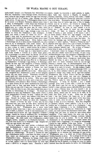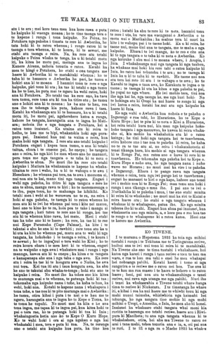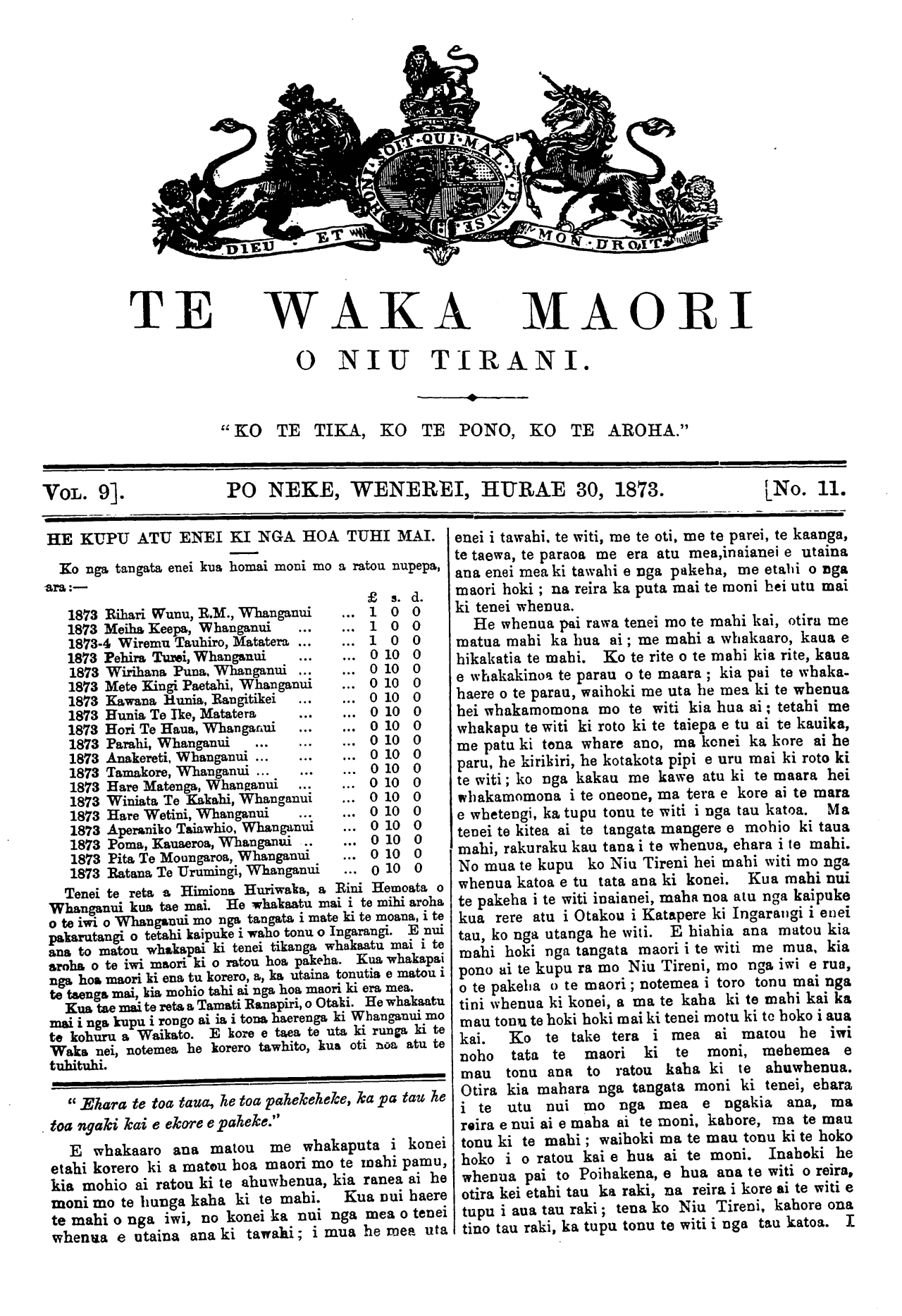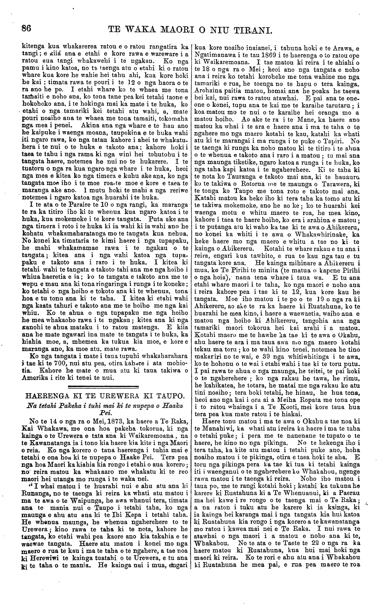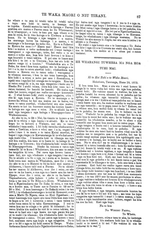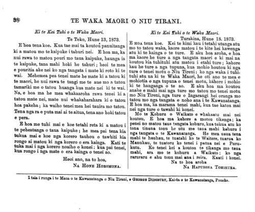 TE WAKA MAORI O NIU TIRANI. Ki te Eai Tuhi o te Waka Maori. Te Teko, Hune 13, 1873. E E hoa tena koe. Kua tae mai ta koutou panuitanga ki a matou mo te kaipuke i tahuri nei. E hoa ma, ka nui rawa to matou pouri mo taua kaipuke, haunga ia te kaipuke, tana mahi hoki he tahuri; heoi te mea e pouritia ake nei ko nga tangata i mate ki roto ki te wai. Mehemea pea tenei mate he mate ki a tatou ki te maori, he nui rawa te tangi me te aue mo a tatou tamariki me o tatou huanga kua mate nei ki te wai. Na, e hoa ma he mea whakaaroha rawa tenei ki a tatou mate nei, mate nui whakaharahara ki o tatou hoa pakeha; ka waiho tenei mea hei tauira mo tatou. Tena nga ra e puta mai ai te aitua, tena ano hoki tatou e pera. E hoa me tuhi mai e koe tetahi reta ki a matou i te peheatanga o taua kaipuke ; he mea pai tena kia tukua mai e koe nga korero tauhou o tawhiti kia rongo ai matou ki nga korero o era kainga. Kati te tuka mai i nga korero noaiho o konei; kua pai tenei, kua rongo i nga mate o era kainga o tenei ao. Heoi ano, na to hoa, NA HONE HOROMONA. Ki te Kai Tuhi o te Waka Maori. Turakina, Hune 18, 1873. E HOA tena koe. Kei te kimi kau i tetahi utanga atu mo to tatou waka, kaore matou i te kite hei kawenga atu ki te kainga o te ture. E aku hoa aroha, e hoa ma kaore he ture a nga tangata maori e ki mai na koutou kia tuhituhi atu matou i etahi ture ; kahore kau he ture a nga tupuna, kua mohio houtou ki nga ture o tenei motu o Niu Tireni; ko nga waka i tuhi- tuhi atu na ki te Waka Maori, he oti ano te mea e mohiotia o nga tupuna o tenei motu, kahore i mohio ki te hanganga o te ao. E aku hoa ma koutou anake e mahi mai nga ture mo tatou mo tenei motu mo Niu Tireni, nga ture o Ingarangi hei oranga mo tatou mo nga tangata e noho ana i te Kawanatanga. E hoa ma, ka marama tenei mahi, kua tae katoa mai nei nga ture o tawahi ki konei. Mo te Kohuru o Waikato e whakaatu mai nei koutou. E hoa ma kahore a motou tikanga; ka penei no matou taua tangata kohuru, ku a tukua atu ko tona tinana tonu he utu mo taua mahi kohuru i nga tangata o te Kawanatanga. He mea uaua tena mahi te hauhau, te tuatahi ko te Waitere, tuarua ko Manukau, te tuatoru ko tenei i patua nei e Puru- kutu. Ko tenei kei a koutou te tikanga mo taua mahi, ara mo te kohura a Waikato; ko nga raruraru e ahu tonu mai ana i reira. Kaati i konei. Na to hoa aroha NA HAPURONA TOHIKURA. I taia i runga i te Maua o te Kawanatanga o Niu Tirani, e GEORGE DIDSBURY, Kai-ta o te Kawanatanga, Poneke.