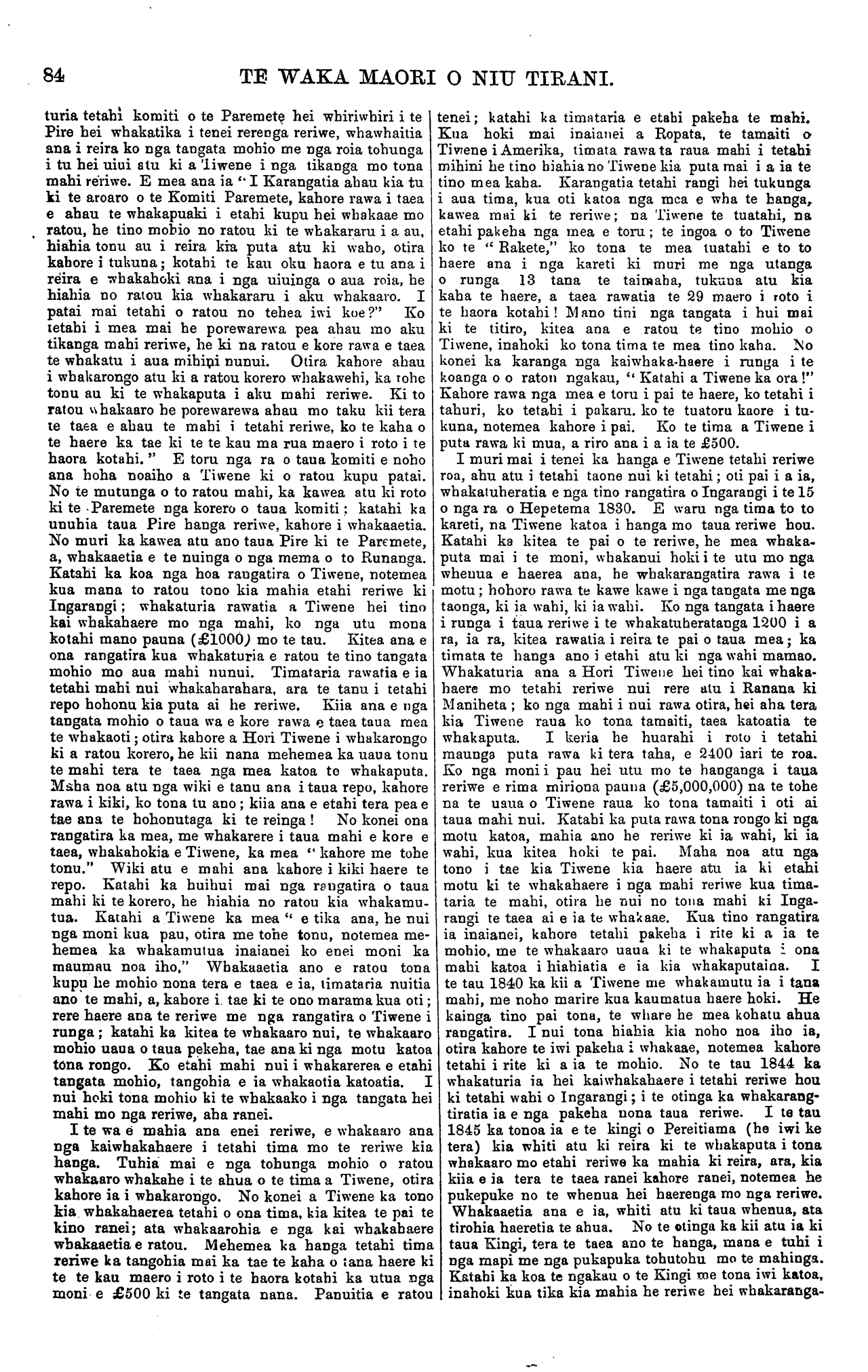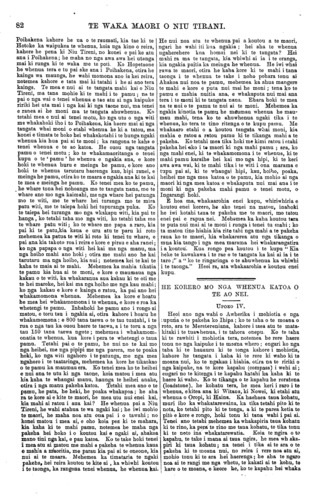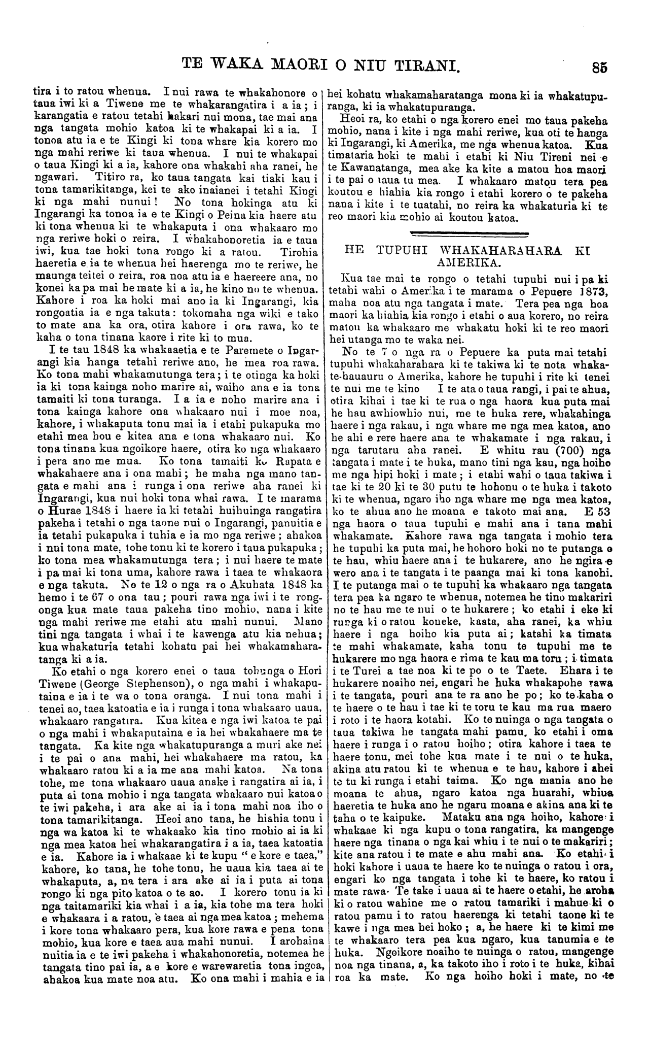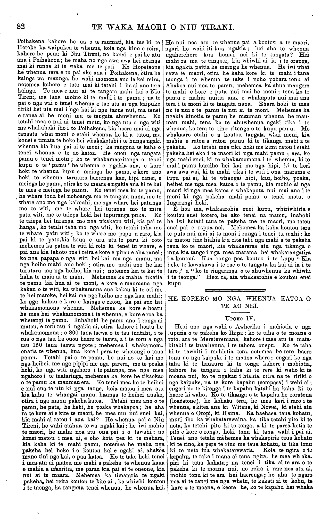TE WAKA MAORI O NIU TIRANI. Ki te Eai Tuhi o te Waka Maori. Te Teko, Hune 13, 1873. E E hoa tena koe. Kua tae mai ta koutou panuitanga ki a matou mo te kaipuke i tahuri nei. E hoa ma, ka nui rawa to matou pouri mo taua kaipuke, haunga ia te kaipuke, tana mahi hoki he tahuri; heoi te mea e pouritia ake nei ko nga tangata i mate ki roto ki te wai. Mehemea pea tenei mate he mate ki a tatou ki te maori, he nui rawa te tangi me te aue mo a tatou tamariki me o tatou huanga kua mate nei ki te wai. Na, e hoa ma he mea whakaaroha rawa tenei ki a tatou mate nei, mate nui whakaharahara ki o tatou hoa pakeha; ka waiho tenei mea hei tauira mo tatou. Tena nga ra e puta mai ai te aitua, tena ano hoki tatou e pera. E hoa me tuhi mai e koe tetahi reta ki a matou i te peheatanga o taua kaipuke ; he mea pai tena kia tukua mai e koe nga korero tauhou o tawhiti kia rongo ai matou ki nga korero o era kainga. Kati te tuka mai i nga korero noaiho o konei; kua pai tenei, kua rongo i nga mate o era kainga o tenei ao. Heoi ano, na to hoa, NA HONE HOROMONA. Ki te Kai Tuhi o te Waka Maori. Turakina, Hune 18, 1873. E HOA tena koe. Kei te kimi kau i tetahi utanga atu mo to tatou waka, kaore matou i te kite hei kawenga atu ki te kainga o te ture. E aku hoa aroha, e hoa ma kaore he ture a nga tangata maori e ki mai na koutou kia tuhituhi atu matou i etahi ture ; kahore kau he ture a nga tupuna, kua mohio houtou ki nga ture o tenei motu o Niu Tireni; ko nga waka i tuhi- tuhi atu na ki te Waka Maori, he oti ano te mea e mohiotia o nga tupuna o tenei motu, kahore i mohio ki te hanganga o te ao. E aku hoa ma koutou anake e mahi mai nga ture mo tatou mo tenei motu mo Niu Tireni, nga ture o Ingarangi hei oranga mo tatou mo nga tangata e noho ana i te Kawanatanga. E hoa ma, ka marama tenei mahi, kua tae katoa mai nei nga ture o tawahi ki konei. Mo te Kohuru o Waikato e whakaatu mai nei koutou. E hoa ma kahore a motou tikanga; ka penei no matou taua tangata kohuru, ku a tukua atu ko tona tinana tonu he utu mo taua mahi kohuru i nga tangata o te Kawanatanga. He mea uaua tena mahi te hauhau, te tuatahi ko te Waitere, tuarua ko Manukau, te tuatoru ko tenei i patua nei e Puru- kutu. Ko tenei kei a koutou te tikanga mo taua mahi, ara mo te kohura a Waikato; ko nga raruraru e ahu tonu mai ana i reira. Kaati i konei. Na to hoa aroha NA HAPURONA TOHIKURA. I taia i runga i te Maua o te Kawanatanga o Niu Tirani, e GEORGE DIDSBURY, Kai-ta o te Kawanatanga, Poneke.