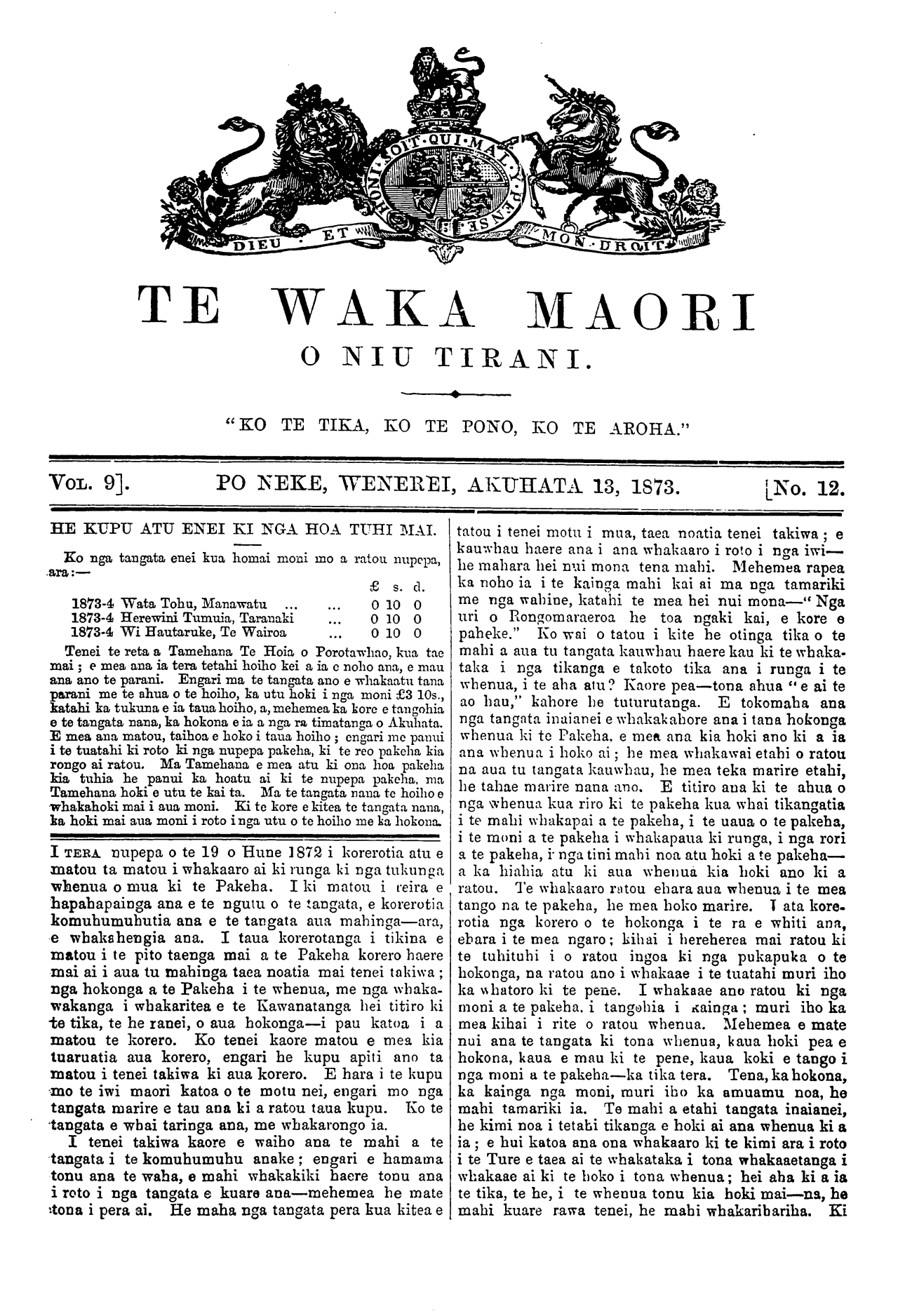 Te Waka Maori o Niu Tirani 1871-1877: Volume 9, Number 12. 13 August 1873 |