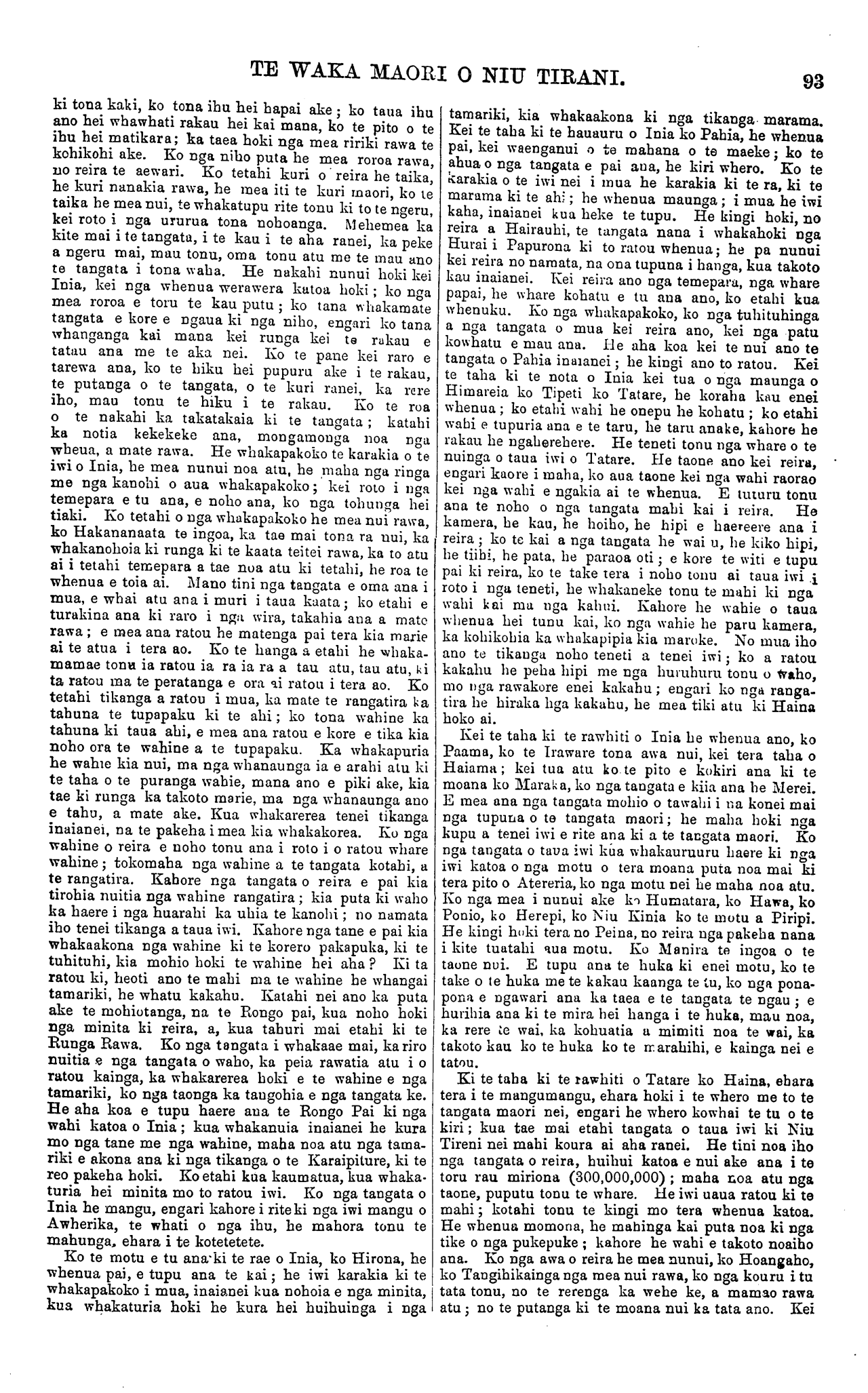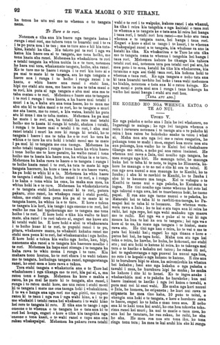 TE WAKA MAORI O NIU TIRANI. "KO TE TIKA, KO TE PONO, KO TE AROHA." VOL. 9]. PO NEKE, WENEREI, AKUHATA 13, 1873. [No. 12. HE KUPU ATU ENEI KI NGA HOA TUHI MAI. Ko nga tangata enei kua homai moni mo a ratou nupepa, ara:— £ 3. d. 1873-4 Wata Tohu, Manawatu ... ... O 10 O 1873-4 Herewini Tumuia, Taranaki ... O 10 O 1873-4 Wi Hautaruke, Te Wairoa ... O 10 O Tenei te reta a Tamehana Te Hoia o Porotawhao, kua tae mai ; e mea ana ia tera tetahi hoiho kei a ia e noho ana, e mau ana ano te parani. Engari ma te tangata ano e whakaatu tana parani me te ahua o te hoiho, ka utu hoki i nga moni £3 103., katahi ka tukuna e ia taua hoiho, a, mehemea ka kore e tangohia e te tangata nana, ka hokona e ia a nga ra timatanga o Akuhata. E mea aua matou, taihoa e hoko i taua hoiho ; engari me panui i te tuatahi ki roto ki nga nupepa pakeha, ki te reo pakeha kia rongo ai ratou. Ma Tamehana e mea atu ki ona hoa pakeha kia tuhia he panui ka hoatu ai ki te nupepa pakeha, ma Tamehana hoki e utu te kai ta. Ma te tangata nana te hoiho e whakahoki mai i aua moni. Ki te kore e kitea te tangata nana, ka hoki mai aua moni i roto i nga utu o te hoiho me ka hokona I TERA nupepa o te 19 o Hune 1872 i korerotia atu e matou ta matou i whakaaro ai ki runga ki nga tukunga whenua o mua ki te Pakeha. I ki matou i reira e hapahapainga ana e te ngutu o te tangata, e korerotia komuhumuhutia ana e te tangata aua mahinga—ara, e whakahengia ana. I taua korerotanga i tikina e matou i te pito taenga mai a te Pakeha korero haere mai ai i aua tu mahinga taea noatia mai tenei takiwa ; nga hokonga a te Pakeha i te whenua, me nga whaka- wakanga i whakaritea e te Kawanatanga hei titiro ki te tika, te he ranei, o aua hokonga—i pau katoa i a matou te korero. Ko tenei kaore matou e mea kia tuaruatia aua korero, engari he kupu apiti ano ta matou i tenei takiwa ki aua korero. E hara i te kupu mo te iwi maori katoa o te motu nei, engari mo nga tangata marire e tau ana ki a ratou taua kupu. Ko te tangata e whai taringa ana, me whakarongo ia. I tenei takiwa kaore e waiho ana te mahi a te tangata i te komuhumuhu anake ; engari e hamama tonu ana te waha, e mahi whakakiki haere tonu ana i roto i nga tangata e kuare ana—mehemea he mate tona i pera ai. He maha nga tangata pera kua kitea e tatou i tenei motu i mua, taea noatia tenei takiwa ; e kauwhau haere ana i ana whakaaro i roto i nga iwi— he mahara hei nui mona tena mahi. Mehemea rapea ka noho ia i te kainga mahi kai ai ma nga tamariki me nga wahine, katahi te mea hei nui mona—" Nga uri o Rongomaraeroa he toa ngaki kai, e kore e paheke." Ko wai o tatou i kite he otinga tika o te mahi a aua tu tangata kauwhau haere kau ki te whaka- taka i nga tikanga e takoto tika ana i runga i te whenua, i te aha atu? Kaore pea—tona ahua "e ai te ao hau," kahore he tuturutanga. E tokomaha ana nga tangata inaianei e whakakahore ana i tana hokonga whenua ki te Pakeha e mea ana kia hoki ano ki a ia ana whenua i hoko ai; he mea whakawai etahi o ratou na aua tu tangata kauwhau, he mea teka marire etahi, he tahae marire nana ano. E titiro aua ki te ahua o nga whenua kua riro ki te pakeha kua whai tikangatia i te mahi whakapai a te pakeha, i te uaua o te pakeha, i te moni a te pakeha i whakapaua ki runga, i nga rori a te pakeha, i nga tini mahi noa atu hoki a te pakeha— a ka hiahia atu ki aua whenua kia hoki ano ki a ratou. Te whakaaro ratou ehara aua whenua i te mea tango na te pakeha, he mea hoko marire. I ata kore- rotia nga korero o te hokonga i te ra e whiti ana, ehara i te mea ngaro; kihai i hereherea mai ratou ki te tuhituhi i o ratou ingoa ki nga pukapuka o te hokonga, na ratou ano i whakaae i te tuatahi muri iho ka whatoro ki te pene. I whakaae ano ratou ki nga moni a te pakeha, i tangohia i kainga ; muri iho ka mea kihai i rite o ratou whenua. Mehemea e mate nui ana te tangata ki tona whenua, kaua hoki pea e hokona, kaua e mau ki te pene, kaua koki e tango i nga moni a te pakeha—ka tika tera. Tena a, ka hokona, ka kainga nga moni, muri iho ka amuamu nga, he mahi tamariki ia. Te mahi a etahi tangata inaianei, he kimi noa i tetahi tikanga e hoki ai ana whenua ki a ia ; e hui katoa ana ona whakaaro ki te kimi ara i roto i te Ture e taea ai te vvhakataka i tona whakaaetanga i whakaae ai ki te hoko i tona whenua; hei aha ki a ia te tika, te he, i te whenua tonu kia hoki mai—na, he mahi kuare rawa tenei, he mahi whakarihariha. Ki