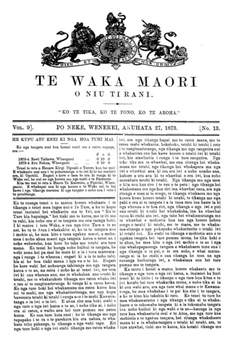 Te Waka Maori o Niu Tirani 1871-1877: Volume 9, Number 13. 27 August 1873 |