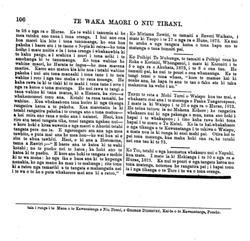 106 TE WAKA MAORI O NIU TIRANI. te 28 o nga ra o Hurae. Ko te wahi i tanumia ai he mea tutohu ano nana i tona oranga. I hui ano ona hoa maori kia kite i tona tanumanga, ko ona hoa pakeha i haere atu i te taone o Nepia ki reira—ko tona hoiho i mate nuitia e ia i tona oranga i whakauwhia ki te kahu pango, a i arahina i muri i tona arihi i te amohanga ki te tanumanga. Ko tona wahine he wahine maori, ko Harata te ingoa—he mea marena mame. Kaore ano matou kia kite noa i tetahi wahine pakeha i nui atu tona manaaki i tona tane i to tera wahine i roto i nga tau maha o to raua moenga. He kaha rawa ia ki te tiaki ki te mahi i tona tane i roto i nga ra katoa o tona matenga. He nui rawa te tangi o taua wahine ki tana matua, ki a Hanara, ku riro—e whakamomori tonu ana. Kotahi ta raua tamaiti, he wahine. Kua whakaakona taua kotiro ki nga tikanga rangatira katoa a te pakeha. Kua marenatia ia ki tetahi rangatira pakehai te oranga ano o tona matua— a kei reira ano raua e noho ana i naianei. Heoi, kua riro atu tenei tangata tika, tenei tangata ngakau nui— e kore hoki e kitea wawetia e nga maori o Ahuriri tetahi tangata pera me ia. E ngarongaro atu ana nga mea tawhito, e puta mai ana he mea hou—ko wai hua Ai e rite te ahua tawhiti. Heoi, e ki ana a Horomona, tama a Rawiri;—" E haere ana te katoa ki te wahi kotahi; no te puehu nei te katoa; ka hoki ano te katoa ki te puehu. E kore ano hoki te tangata e mohio ki te wa mona: ko nga ika e haoa ana ki te kupenga nanakia, ko nga manu ka mau i te mahanga; rite tonu ki a ratou nga tamariki a te tangata e mahangatia nei i te wa o te he e puta whakarere mai ana ki a ratou," Ko Miriama Rewiti, te tamaiti a Reweti Waikato, i mate ki Taupo i te 17 o nga ra o Hune, 1873. Ka nui te aroha a nga tangata katoa o tona hapu mo te matenga o taua tamaiti pai. Ko Poihipi Te Muhunga, te tamaiti a Poihipi raua ko Roka o Kormiti, Whanganui, i mate ki Koroniti i te 5 o nga ra o Akuhata, 3873, i te 8 o ona tau. He tamaiti pai, ka nui te pouri o ona whanaunga. Ko te tangi tenei o tona whaea, "kore te mamae kai ki noake ana, ka kapa tu ana te tau o raku ate ki taku makauroa ka wehe i au." TENEI te reta a Mohi Turei o Waiapu kua tae mai, e whakaatu mai ana i te matenga o Paaka Tangaroapeau I mate ia ki Waiapu i te 10 o nga ra o Hurae, 1 1873. He teina tuturu ia no Mokena Kohere ; he rangatira whakaaro nui ki nga pakanga o mua, nana ano hoki i hapai i te whakapono; i tino kaha rawa hoki tona hapai i te maru o Te Kuini. Ko ia te kai-whakahaere o nga tikanga a te Kawanatanga i te takiwa o Waiapu, a mate noa ia ki runga ki enei mahi pai. Otira kei te pai tona matenga, kua maha hoki ona ra, ka tutuki nei ona tau ki te 75. Ko TIO, tetahi o nga kaumatua whakaaro nui o Napuhi, kua mate. I mate ia ki Hokianga i te 3 O o nga ra o Hurae, 1873. Ka nui te pouri o nga tangata katoa mo tona matenga, notemea he rangatira pai; i hapai tonu ia i nga tikanga o te Ture i te wa o tona oranga. taia i runga i te Mana o te Kawanatanga o Niu Tirani, e GEORGE DIDSBURY, Kai-ta o te Kawanatanga, Poneke.