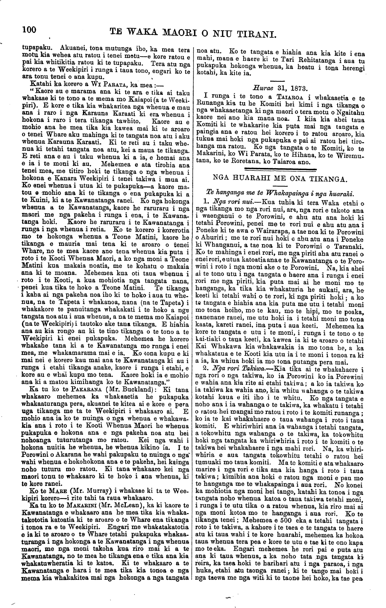 TE WAKA MAORI O NIU TIRANI. KO TE TIKA, KO TE PONO, KO TE AROHA." VOL. 9]. PO NEKE, WENEREI, AKUHATA 27, 1873. [No. 13. HE KUPU ATU ENEI KI NGA HOA TUHI MAI. Ko nga tangata enei kua homai moni mo a ratou nupepa, wa:— £ 3. (d. 1873-41 Rewi Taikawa, Whangarei ... O 10 O 1873-4 Eru Nehua, Whangarei ... ... O 10 O Tenei te reta a Henare Kingi Tipuaki o Torere, kua tae mai E whakaatu mai ana i te poharatanga o te iwi ki te tai rawhiti ara, ki Opotiki. Engari e kore e taea te uta ki runga ki te Waka nei, he nui no nga korero mo nga mahi o te Paremete. Kua tae mai te reta a Haora Te Kairoto, o Pipiriki, Whan- ganui. E whakapai ana ki nga korero o te Waka nei, te kai kawe i nga tikanga marama ki nga tangata e noho ana i roto i te pouritanga. Ko te roanga tenei o to matou korero whakaatu i te tikanga o tenei mea ingoa nui o re Ture, a ko te kupu tenei inaianei hei whakarite ma te iwi, ara " Ko te Ture kia hapainga," hei tiaki mo te katoa, mo te iti mo te rahi, kia noho ora ki te tangata me ona taonga hoki. I ki matou i tera Waka, e rua nga tino Ture o te ao nei. ko ta te Atua i whakakite ai, ko ta te tangata ano i mohio ai, he mea kite e tona ngakau maori, a mehe- mea i noho ahua maori nga tangata katoa o tenei ao, i noho wehewehe; kua kore he take mo tetahi atu ture mona. Ko tenei he hunga noho huihui te tangata, he wehi nona kei pa mai he mate ki a ia i tona mararata- nga i runga i te whenua ; engari ki a ia te noho tahi, kia ai he hoa tiaki mona i nga wa o te he. Engari he kore wahi hei nohoanga tahitanga mo nga tangata katoa o te ao, na reira i noho ke ai tenei iwi, me tera iwi ki ona whenua ano. me te whakahoa ano tetahi ki tetahi, me te whakatakoto tikanga mo ratou whaka iwi e tau ai te rangimarietanga ki runga ki a ratou katoa. Ko nga ture hoki hei whakamana ma ratou katoa kua oti te mahi, me nga whakariteritenga me nga kupu kawenata tetahi ki tetahi i runga ano i te mahi Kawana- tanga o ia iwi o ia iwi. E ahua rite ana hoki etahi o nga ture o nga iwi katoa o te ao, i noho tika ai, i noho ora ai ratou, a waiho ana hei ture pumau mo ratou katoa. Ko aua ture koia enei: ko te tikanga mo nga tupapaku i te ra o te parekura kia ata nehua, te wha- katu tohu pakanga, te tikanga o nga wahi tapu. Kei nga ture hoki o nga iwi etahi tikanga mo ratou whaka- iwi ara nga tikanga hapai mo to ratou mana, mo to ratou mahi whakarite, hokohoko, tetahi ki tetahi i roto i te rangimarietanga, nga tikanga mo nga rangatira nui e whakaritea ana hei kawe korero o tetahi iwi ki tetahi iwi, kia atawhaitia i runga i te ture rangatira. Nga take tika mo te whawhai, me ona ritenga hei whaka- mana mo tetahi, nga tikanga hei whakaputa ma nga iwi e whawhai ana ki era atu iwi e noho noaiho ana, kahore e uru ana ki te whawhai o era iwi, kua noho mauahara tetahi ki tetahi. Nga tikanga mo nga mea e kiia ana kua riro i te rau o te patu: nga tikanga hei whakamana mo ngahua riri ina whawhai raua, ara nga ritenga e mau ai te rongo, te tikanga whakaora mo nga korero kawe korero tetahi ki tetahi, te tikanga mo nga pahi e ora ai te tangata i a ia taua mea ma haere ia ki nga whenua o te hoa riri, nga tikanga o nga iwi e piri ana tetahi ki tetahi hei whakakaha, ina ka whawhai ratou ki etahi atu iwi, nga take hei whakamutunga mo te whawhai e mohiotia kua tau nga korero hohou rongo o tetahi ki tetahi, me te mana, me te whaka- maoritanga o nga pukapuka whakariterite o tetahi iwi ki tetahi iwi. Ko etahi tu tikanga e mohiotia ana e te ngakau tangata hei ture pumau mona, he tika hoki o te ahua, he mea kite e nga iwi mohio o te ao i nga tini whakapaparanga tangata e whakahaere tonu ana i nga tikanga o te pai, o te ata noho, e whai matau- ranga ai ia. ko etahi o aua tikanga he mea na nga runanga huihuinga iwi, a whakataua ana hei ture pumau mo te tangata. Ka mutu i konei a matou korero whakaatu mo te tikanga o nga ture o nga iwi katoa, a, inaianei ka huri tenei ki te titiro i te tikanga o nga ture kua kitea e te iwi kotahi hei ture whakatika mona, e noho tika ai ia ki ona wahi ano, ara nga ture whai mana o te Kawana- tanga, he mea whakahau i te pai kia rite i te tangata, a ko te kino kia takahia ki raro. Ko tenei tu ture he mea whakamarama i nga tikanga e tika ai te whaka- haere o te tokomaha tangata ki a ia tokomaha tangata ina noho huihui ki nga wahi o te ao—haunga ia nga ture kua whakaaturia mai e te Atua, me nga ture kua mohiotia e te ngakau tangata, hei ritenga whakahaere mona ki a ia whaka-tangata o tetahi ki tetahi, ara, te ture atawhai, tiaki mo te katoa, kia kotahi tikanga mo