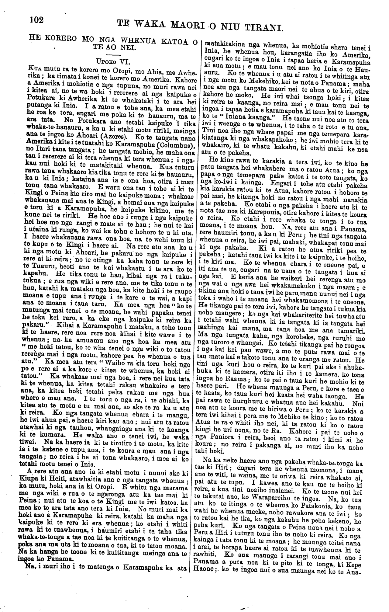 102 TE WAKA MAORI O NIU TIRANI. HE KORERO MO NGA WHENUA KATOA O TE AO NEI. UPOKO VI. KUA mutu ra te korero mo Oropi, mo Ahia, mo Awhe- rika ; ka timata i konei te korero mo Amerika. Kahore a Amerika i mohiotia e nga tupuna, no muri rawa nei i kitea ai, no te wa hoki i rererere ai nga kaipuke o Potukara ki Awherika ki te whakataki i te ara hei putanga ki Inia. I a ratou e tohe ana, ka mea etahi he roa ke tera, engari me poka ki te hauauru, ma te ara tata. No Potukara ano tetahi kaipuke i tika whaka-te-hauauru, a ka u ki etahi motu ririki, meinga ana te ingoa ko Ahoari (Azores). Ko te tangata nana Amerika i kite i te tuatahi ko Karamapuha (Columbus), no Itari taua tangata; he tangata mohio, he maha ona tau i rererere ai ki tera whenua ki tera whenua; i nga- kau nui hoki ki te matakitaki whenua. Kua tuturu rawa tana whakaaro kia tika tonu te rere ki te hauauru, ka u ki Inia; kataina ana ia e ona hoa, otira i mau tonu tana whakaaro. E waru ona tau i tohe ai ki te Kingi o Peina kia riro mai he kaipuke mona; whakaae whakauaua mai ana te Kingi, a homai ana nga kaipuke e toru ki a Karamapuha, he kaipuke kikino, me te kune nei te ririki. He hoe ano i runga i nga kaipuke hei hoe mo nga rangi e mate ai te hau ; he nui te kai i utaina ki runga, ko wai ka tohu e hohoro te u ki uta. I haere whakauaua rawa ona hoa, na te wehi tonu ki te kupu 6 te Kingi i haere ai. Na rere atu ana ka u ki nga motu ki Ahoari, he pakaru no nga kaipuke i rere ai ki reira; no te otinga ka kaha tonu te rere ki te Tuauru, heoti ano te kai whakaatu i te ara ko te kapahu. He tika tonu te hau, kihai nga ra i tuku- tukua ; e rua nga wiki e rere ana, me te tika tonu o te hau, katahi ka mataku nga hoa, ka kite hoki i te raupo moana e tupu ana i runga i te kare o te wai, a kapi ana te moana i taua taru. Ka mea nga hoa<< ko te mutunga mai tenei o te moana, he wahi papaku tenei he toka kei raro. a ka eke nga kaipuke ki reira ka pakaru." Kihai a Karamapuha i mataku, a tohe tonu ki te hawe, rere noa rere noa kihai i kite wawe i te whenua; na ka amuamu ano nga hoa ka mea atu " me hoki tatou, ko te wha tenei o nga wiki o to tatou rerenga mai i nga motu, kahore pea he whenua o tua atu." Ka mea atu tera " Waiho ra ara toru hoki nga po e rere ai a ka kore e kitea te whenua, ka hoki ai tatou." Ka whakaae mai nga hoa, i rere nei kua tata ki te whenua, ka kitea tetahi rakau whakairo e tere ana, ka kitea hoki tetahi peka rakau me nga hua whero e mau ana. I te toru o nga ra, i te ahiahi, ka kitea atu te motu e tu mai ana, ao ake te ra ka u atu ki reira. Ko nga tangata whenua ehara i te mangu, he iwi ahua pai, e haere kiri kau ana ; nui atu ta ratou atawhai ki nga tauhou, whangainga ana ki te kaanga ki te kumara. He waka ano o tenei iwi, he waka tiwai. Na ka haere ia ki te tirotiro i te motu, ka kite ia i te katene e tupu, aua. i te koura e mau ana i nga tangata; no reira i he ai tona whakaaro, i mea ai ko tetahi motu tenei o Inia. A rere atu ana ano ia ki etahi motu i nunui ake ki Kiupa ki Heiti, atawhaitia ana e nga tangata whenua ; ka mutu, hoki ana ia ki Oropi. E whitu nga marama me nga wiki e rua o te ngaronga atu ka tae mai ki Pema; nui atu te koa o te Kingi me te iwi katoa ka mea ko to ara tata ano tera ki Inia. No muri mai ka hoki ano a Karamapuha ki reira, katahi ka maha nga kaipuke ki te rere ki era whenua; ko etahi i whiti rawa ki te tuawhenua, i haumiri etahi i te. taha tika whaka-te-tonga a tae noa ki te kuititanga o te whenua, poka ana ma uta ki te moana o tua, ki to tatou moana. Na ka hanga he taone ki te kuititanga meinga ana te ingoa ko Panama. Na, i muri iho i te matenga o Karamapuha ka ata matakitakina nga whenua, ka mohiotia ehara tenei i Inia, he whenua hou, karangatia iho ko Amerika, engari ko te ingoa o Inia i tapaa hetia e Karamapuha ki aua motu ; e mau tonu nei ano ko Inia o te Hau- auru. Ko te whenua i u atu ai ratou i te whitinga atu i nga motu ko Mekehiko, kei te nota o Panama; maha noa atu nga tangata maori nei te ahua o te kiri, otira kahore he moko. He iwi whai taonga h.oki; i kitea ki reira te kaanga, no reira mai; e mau tonu nei te ingoa i tapaa hetia e karamapuha ki taua kai te kaanga, ko te " Iniana kaanga." He taone nui noa atu to tera iwi i waenga o ta whenua, i te taha o te roto e tu ana. Tini noa iho nga whare papai me nga temepara kara- kiatanga ki nga whakapakoko; he iwi mohio tera ki te whakairo, ki te whatu kakahu, ki etahi mahi ke noa atu o te pakeha. He kino rawa te karakia a tera iwi, ko te kino he patu tangata hei whakahere ma o ratou Atua ; ko nga papa o nga temepara pake katoa i te toto tangata, ko nga ko-iwi i kainga. Engari i tohe atu etahi pakeha kia karakia ratou ki te Atua, kahore ratou i hohoro te pai mai, he kitenga hoki no ratou i nga mahi nanakia a te pakeha. Ko etahi o nga pakeha i haere atu ki te nota tae noa ki Kareponia, otira kahore i kitea te koura o reira. Ko etahi i rere whaka te tonga i to tua moana, i te moana hou. Na, rere atu ana i Panama, rere haumiri tonu, a ka u ki Peru ; he tini nga tangata whenua o reira, he iwi pai, mahaki, whakapai tonu mai ki nga pakeha. Ki a ratou he atua ririki pea te pakeha ; katahi taua iwi ka kite i te kaipuke, i te hoiho, i te kiri ma. Ko te whenua ehara i te oneone pai, e iti ana te ua, engari na te uaua o te tangata i hua ai nga kai. E keria ana he waikeri hei rerenga atu mo nga wai o nga awa hei whakamakuku i nga maara; e tikina ana hoki e taua iwi he paru. manu nunui nei i nga toka i waho i te moana hei whakamomona i te oneone. He tikanga pai to tera iwi, kahore he tangata i tukua kia noho mangere ; ko nga kai whakariterite hei tuwha atu i tetahi wahi whenua ki ia tangata ki ia tangata hei mahinga kai mana, ma tana hoa me ana tamariki. Ma nga tangata kaha, nga koroheke, nga ruruhi me nga turoro e whangai. Ko tetahi tikanga pai he rongoa i nga kai kei pau wawe, a mo te puta rawa mai o te tau mate kai e takoto tonu ana te oranga mo ratou. He tini nga kuri hou o reira, ko te kuri pai ake i ahuka- huka ki te kamera, otira iti iho i te kamera, ko to