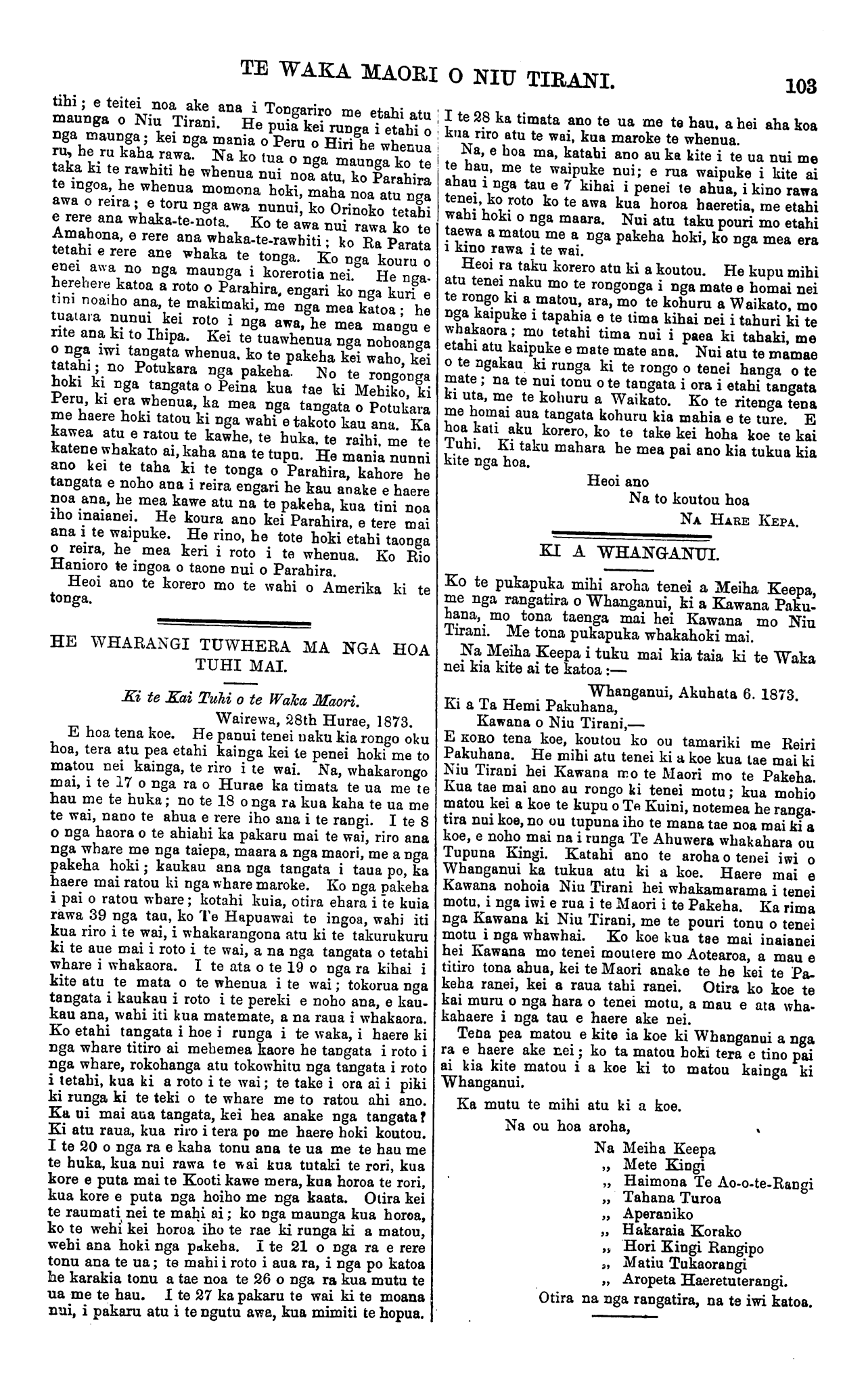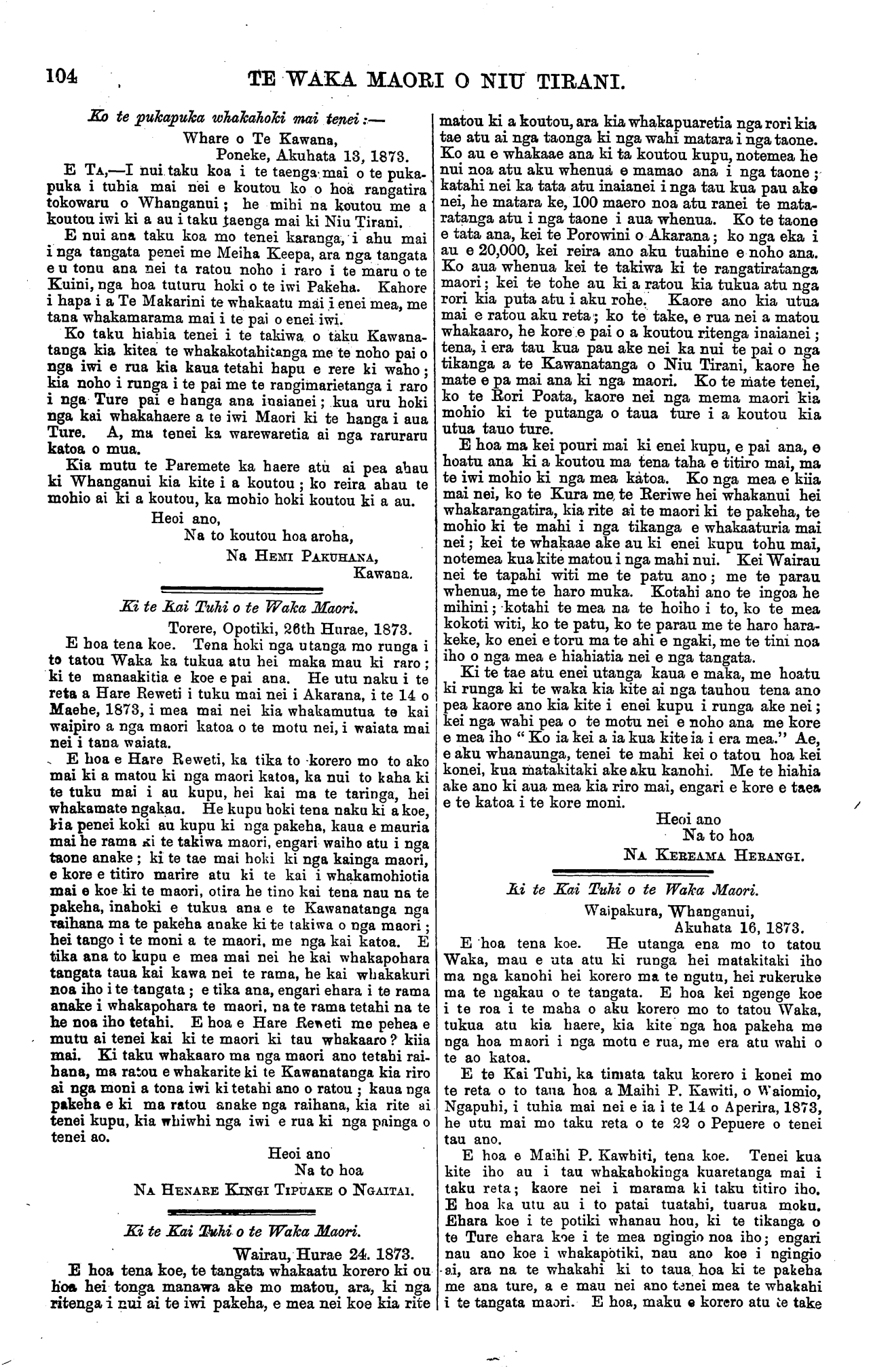 104 TE WAKA MAORI O NIU TIRANI. Ko te pukapuka whakahoki mai tenei:— Whare o Te Kawana, Poneke, Akuhata 13, 1873. E TA,—I nui taku koa i te taenga mai o te puka- puka i tuhia mai nei e koutou ko o hoa rangatira tokowaru o Whanganui; he mihi na koutou me a koutou iwi ki a au i taku taenga mai ki Niu Tirani. E nui ana taku koa mo tenei karanga, i ahu mai i nga tangata penei me Meiha Keepa, ara nga tangata e u tonu ana nei ta ratou noho i raro i te maru o te Kuini, nga hoa tuturu hoki o te iwi Pakeha. Kahore i hapa i a Te Makarini te whakaatu mai i enei mea, me tana whakamarama mai i te pai o enei iwi. Ko taku hiahia tenei i te takiwa o taku Kawana- tanga kia kitea te whakakotahitanga me te noho pai o nga iwi e rua kia kaua tetahi hapu e rere ki waho; kia noho i runga i te pai me te rangimarietanga i raro i nga Ture pai e hanga ana inaianei; kua uru hoki nga kai whakahaere a te iwi Maori ki te hanga i aua Ture. A, ma tenei ka warewaretia ai nga raruraru katoa o mua. Kia mutu te Paremete ka haere atu ai pea ahau ki Whanganui kia kite i a koutou ; ko reira ahau te mohio ai ki a koutou, ka mohio hoki koutou ki a au. Heoi ano, Na to koutou hoa aroha, Na HEMI PAKUHANA, Kawana. Ki te Kai Tuhi o te Waka Maori. Torere, Opotiki, 26th Hurae, 1873. E hoa tena koe. Tena hoki nga utanga mo runga i to tatou Waka ka tukua atu hei maka mau ki raro ; ki te manaakitia e koe e pai ana. He utu naku i te reta a Hare Reweti i tuku mai nei i Akarana, i te 14 o Maehe, 1873, i mea mai nei kia whakamutua te kai waipiro a nga maori katoa o te motu nei, i waiata mai nei i tana waiata. E hoa e Hare Reweti, ka tika to -korero mo to ako mai ki a matou ki nga maori katoa, ka nui to kaha ki te tuku mai i au kupu, hei kai ma te taringa, hei whakamate ngakau. He kupu hoki tena naku ki a koe, kia penei koki au kupu ki nga pakeha, kaua e mauria maihe rama Ki te takiwa maori, engari waiho atu i nga taone anake ; ki te tae mai hoki ki nga kainga maori, e kore e titiro marire atu ki te kai i whakamohiotia mai e koe ki te maori, otira he tino kai tena nau na te pakeha, inahoki e tukua ana e te Kawanatanga nga Taihana ma te pakeha anake ki te takiwa o nga maori; hei tango i te moni a te maori, me nga kai katoa. E tika ana to kupu e mea mai nei he kai whakapohara tangata taua kai kawa nei te rama, he kai whakakuri noa iho i te tangata; e tika ana, engari ehara i te rama anake i whakapohara te maori, na te rama tetahi na te he noa iho tetahi. E hoa e Hare Reweti me pehea e mutu ai tenei kai ki te maori ki tau whakaaro ? kiia mai. Ki taku whakaaro ma nga maori ano tetahi rai- hana, ma ratou e whakarite ki te Kawanatanga kia riro ai nga moni a tona iwi ki tetahi ano o ratou ; kaua nga pakeha e ki ma ratou anake nga raihana, kia rite ai tenei kupu, kia whiwhi nga iwi e rua ki nga painga o tenei ao. Heoi ano Na to hoa NA HENARE KINGI TIPUAKE o NGAITAI. Ki te Kai Tuhi o te Waka Maori. Wairau, Hurae 24. 1873. E hoa tena koe, te tangata whakaatu korero ki ou Ko» hei tonga manawa ake mo matou, ara, ki nga ritenga i nui ai te iwi pakeha, e mea nei koe kia rite matou ki a koutou, ara kia whakapuaretia nga rori kia tae atu ai nga taonga ki nga wahi matara i nga taone. Ko au e whakaae ana ki ta koutou kupu, notemea he nui noa atu aku whenua e mamao ana i nga taone ; katahi nei ka tata atu inaianei i nga tau kua pau ake nei, he matara ke, 100 maero noa atu ranei te mata- ratanga atu i nga taone i aua whenua. Ko te taone e tata ana, kei te Porowini o Akarana; ko nga eka i au e 20,000, kei reira ano aku tuahine e noho ana. Ko aua whenua kei te takiwa ki te rangatiratanga maori; kei te tohe au ki a ratou kia tukua atu nga rori kia puta atu i aku rohe. Kaore ano kia utua mai e ratou aku reta; ko te take, e rua nei a matou whakaaro, he kore e pai o a koutou ritenga inaianei ; tena, i era tau kua pau ake nei ka nui te pai o nga tikanga a te Kawanatanga o Niu Tirani, haere he mate e pa mai ana ki nga maori. Ko te mate tenei, ko te Rori Poata, kaore nei nga mema maori kia mohio ki te putanga o taua ture i a koutou kia utua taua ture. E hoa ma kei pouri mai ki enei kupu, e pai ana, e hoatu ana ki a koutou ma tena taha e titiro mai, ma te iwi mohio ki nga mea katoa. Ko nga mea e kiia mai nei, ko te Kura me, te Reriwe hei whakanui hei whakarangatira, kia rite ai te maori ki te pakeha, te mohio ki te mahi i nga tikanga e whakaaturia mai nei; kei te whakaae ake au ki enei kupu tohu mai, notemea kua kite matou i nga mahi nui. Kei Wairau nei te tapahi witi me te patu ano; me te parau whenua, me te haro muka. Kotahi ano te ingoa he mihini; kotahi te mea na te hoiho i to, ko te mea kokoti witi, ko te patu, ko te parau me te haro hara- keke, ko enei e toru ma te ahi e ngaki, me te tini noa iho o nga mea e hiahiatia nei e nga tangata. Ki te tae atu enei utanga kaua e maka, me hoatu ki runga ki te waka kia kite ai nga tauhou tena ano pea kaore ano kia kite i enei kupu i runga ake nei; kei nga wahi pea o te motu nei e noho ana me kore e mea iho " Ko ia kei a ia kua kite ia i era mea." Ae, e aku whanaunga, tenei te mahi kei o tatou hoa kei konei, kua matakitaki ake aku kanohi. Me te hiahia ake ano ki aua mea kia riro mai, engari e kore e taea e te katoa i te kore moni. Heoi ano Na to hoa NA KEREAMA HERANGI. Ai te Kai Tuhi o te Waka Maori. Waipakura, Whanganui, Akuhata 16. 1873. E hoa tena koe. He utanga ena mo to tatou Waka, mau e uta atu ki runga hei matakitaki iho ma nga kanohi hei korero ma te ngutu, hei rukeruke ma te ngakau o te tangata. E hoa kei ngenge koe i te roa i te maha o aku korero mo to tatou Waka, tukua atu kia haere, kia kite nga hoa pakeha me nga hoa maori i nga motu e rua, me era atu wahi o te ao katoa. E te Kai Tuhi, ka timata taku korero i konei mo te reta o to taua hoa a Maihi P. Kawiti, o Waiomio, Ngapuhi, i tuhia mai nei e ia i te 14 o Aperira, 1873, he utu mai mo taku reta o te 28 o Pepuere o tenei tau ano. E hoa e Maihi P. Kawhiti, tena koe. Tenei kua kite iho au i tau whakahokinga kuaretanga mai i taku reta; kaore nei i marama ki taku ti
