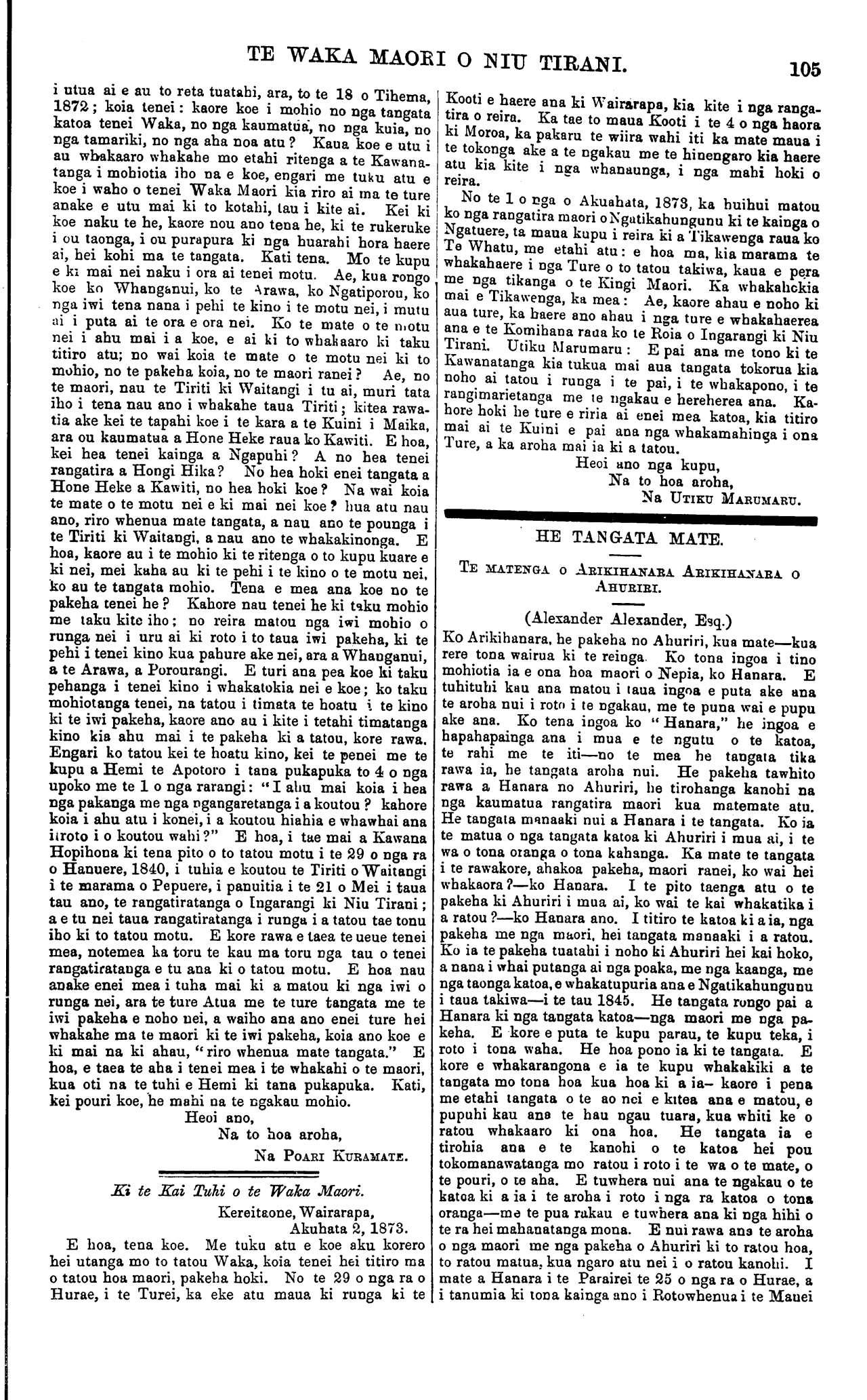 TE WAKA MAORI O NIU TIRANI. 105 i utua ai e au to reta tuatahi, ara, to te 18 o Tihema, 1872; koia tenei: kaore koe i mohio no nga tangata katoa tenei Waka, no nga kaumatua, no nga kuia, no nga tamariki, no nga aha noa atu ? Kaua koe e utu i au whakaaro whakahe mo etahi ritenga a te Kawana- tanga i mohiotia iho na e koe, engari me tuku atu e koe i waho o tenei Waka Maori kia riro ai ma te ture anake e utu mai ki to kotahi, tau i kite ai. Kei ki koe naku te he, kaore nou ano tena he, ki te rukeruke i ou taonga, i ou purapura ki nga huarahi hora haere ai, hei kohi ma te tangata. Kati tena. Mo te kupu e ki mai nei naku i ora ai tenei motu. Ae, kua rongo koe ko Whanganui, ko te Arawa, ko Ngatiporou, ko nga iwi tena nana i pehi te kino i te motu nei, i mutu ai i puta ai te ora e ora nei. Ko te mate o te motu nei i ahu mai i a koe, e ai ki to whakaaro ki taku titiro atu; no wai koia te mate o te motu nei ki to mohio, no te pakeha koia, no te maori ranei ? Ae, no te maori, nau te Tiriti ki Waitangi i tu ai, muri tata iho i tena nau ano i whakahe taua Tiriti; kitea rawa- tia ake kei te tapahi koe i te kara a te Kuini i Maika, ara ou kaumatua a Hone Heke raua ko Kawiti. E hoa, kei hea tenei kainga a Ngapuhi ? A no hea tenei rangatira a Hongi Hika? No hea hoki enei tangata a Hone Heke a Kawiti, no hea hoki koe ? Na wai koia te mate o te motu nei e ki mai nei koe ? hua atu nau ano, riro whenua mate tangata, a nau ano te pounga i te Tiriti ki Waitangi, a nau ano te whakakinonga. E hoa, kaore au i te mohio ki te ritenga o to kupu kuare e ki nei, mei kaha au ki te pehi i te kino o te motu nei. ko au te tangata mohio. Tena e mea ana koe no te pakeha tenei he ? Kahore nau tenei he ki taku mohio me taka kite iho; no reira matou nga iwi mohio o runga nei i uru ai ki roto i to taua iwi pakeha, ki te pehi i tenei kino kua pahure ake nei, ara a Whanganui, a te Arawa, a Porourangi. E turi ana pea koe ki taku pehanga i tenei kino i whakahokia nei e koe; ko taku mohiotanga tenei, na tatou i timata te hoatu i te kino ki te iwi pakeha, kaore ano au i kite i tetahi timatanga kino kia ahu mai i te pakeha ki a tatou, kore rawa. Engari ko tatou kei te hoatu kino, kei te penei me te kupu a Hemi te Apotoro i tana pukapuka to 4 o nga upoko me te 1 o nga rarangi: " I ahu mai koia i hea nga pakanga me nga ngangaretanga i a koutou ? kahore koia i ahu atu i konei; i a koutou hiahia e whawhai ana i roto i o koutou wahi ?" E hoa, i tae mai a Kawana Hopihona ki tena pito o to tatou motu i te 29 o nga ra o Hanuere, 1840, i tuhia e koutou te Tiriti o Waitangi i te marama o Pepuere, i panuitia i te 21 o Mei i taua tau ano, te rangatiratanga o Ingarangi ki Niu Tirani; a e tu nei taua rangatiratanga i runga i a tatou tae tonu iho ki to tatou motu. E kore rawa e taea te ueue tenei mea, notemea ka toru te kau ma toru nga tau o tenei rangatiratanga e tu ana ki o tatou motu. E hoa nau anake enei mea i tuha mai ki a matou ki nga iwi o runga nei, ara te ture Atua me te ture tangata me te iwi pakeha e noho nei, a waiho ana ano enei ture hei whakahe ma te maori ki te iwi pakeha, koia ano koe e ki mai na ki ahau, " riro whenua mate tangata." E hoa, e taea te aha i tenei mea i te whakahi o te maori, kua oti na te tuhi e Hemi ki tana pukapuka. Kati, kei pouri koe, he mahi na te ngakau mohio. Heoi ano, Na to hoa aroha, Na POARI KURAMATE. Ki te Kai Tuhi o te Waka Maori. Kereitaone, Wairarapa, Akuhata 2, 1873. E hoa, tena koe. Me tuku atu e koe aku korero hei utanga mo to tatou Waka, koia tenei hei titiro ma o tatou hoa maori, pakeha hoki. No te 29 o nga ra o Hurae, i te Turei, ka eke atu maua ki runga ki te Kooti e haere ana ki Wairarapa, kia kite i nga ranga- tira o reira. Ka tae to maua Kooti i te 4 o nga kaore ki Moroa, ka pakaru te wiira wahi iti ka mate maua i te tokonga ake a te ngakau me te hinengaro kia haere atu kia kite i nga whanaunga, i nga mahi hoki o reira. No te 1 o nga o Akuhata, 1873, ka huihui matou ko nga rangatira maori o Ngutikahungunu ki te kainga o Ngatuere, ta maua kupu i reira ki a Tikawenga raua ko Te Whatu, me etahi atu: e hoa ma, kia marama te whakahaere i nga Ture o to tatou takiwa, kaua e pera me nga tikanga o te Kingi Maori. Ka whakahokia mai e Tikawenga, ka mea: Ae, kaore ahau e noho ki aua ture, ka haere ano ahau i nga ture e whakahaerea ana e te Komihana raua ko te Roia o Ingarangi ki Niu Tirani. Utiku Marumaru : E pai ana me tono ki te Kawanatanga kia tukua mai aua tangata tokorua kia noho ai tatou i runga i te pai, i te whakapono, i te rangimarietanga me te ngakau e hereherea ana. Ka- hore hoki he ture e mia ai enei mea katoa, kia titiro mai ai te Kuini e pai ana nga whakamahinga i ona Ture, a ka aroha mai ia ki a tatou. Heoi ano nga kupu, Na to hoa aroha, Na UTIKU MARUMARU. HE TANGATA MATE. TE MATENGA O ARIKIHANARA ARIKIHANARA O AHURIRI. (Alexander Alexander, Esq.) Ko Arikihanara, he pakeha no Ahuriri, kua mate—kua rere tona wairua ki te meinga Ko tona ingoa i tino mohiotia ia e ona hoa maori o Nepia, ko Hanara. E tuhituhi kau ana matou i taua ingoa e puta ake ana te aroha nui i roto i te ngakau, me te puna wai e pupu ake ana. Ko tena ingoa ko " Hanara," he ingoa e hapahapainga ana i mua e te ngutu o te katoa, te rahi me te iti—no te mea he tangata tika rawa ia, he tangata aroha nui. He pakeha tawhito rawa a Hanara no Ahuriri, he tirohanga kanohi na nga kaumatua rangatira maori kua matemate atu. He tangata manaaki nui a Hanara i te tangata. Ko ia te matua o nga tangata katoa ki Ahuriri i mua ai, i te wa o tona oranga o tona kahanga. Ka mate te tangata i te rawakore, ahakoa pakeha, maori ranei, ko wai hei whakaora?—ko Hanara. I te pito taenga atu o te pakeha ki Ahuriri i mua ai, ko wai te kai whakatika i a ratou ?—ko Hanara ano. I titiro te katoa ki aia, nga pakeha me nga maori, hei tangata manaaki i a ratou. Ko ia te pakeha tuatahi i noho ki Ahuriri hei kai hoko, a nana i whai putanga ai nga poaka, me nga kaanga, me nga taonga katoa, e whakatupuria ana e Ngatikahungunu i taua takiwa—i te tau 1845. 