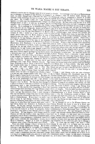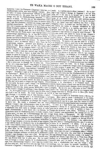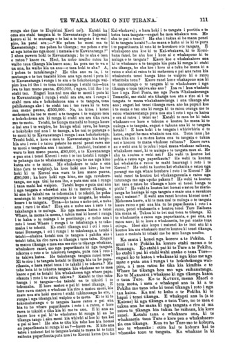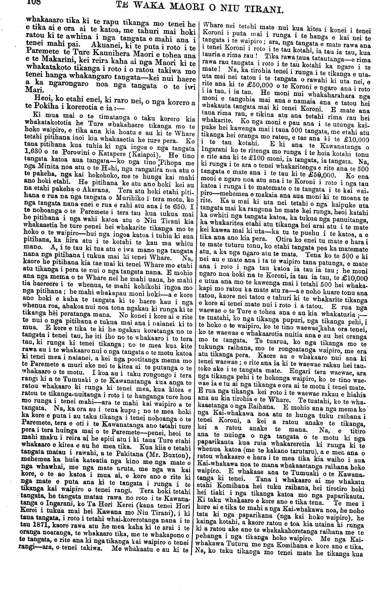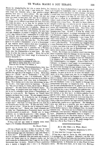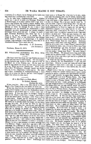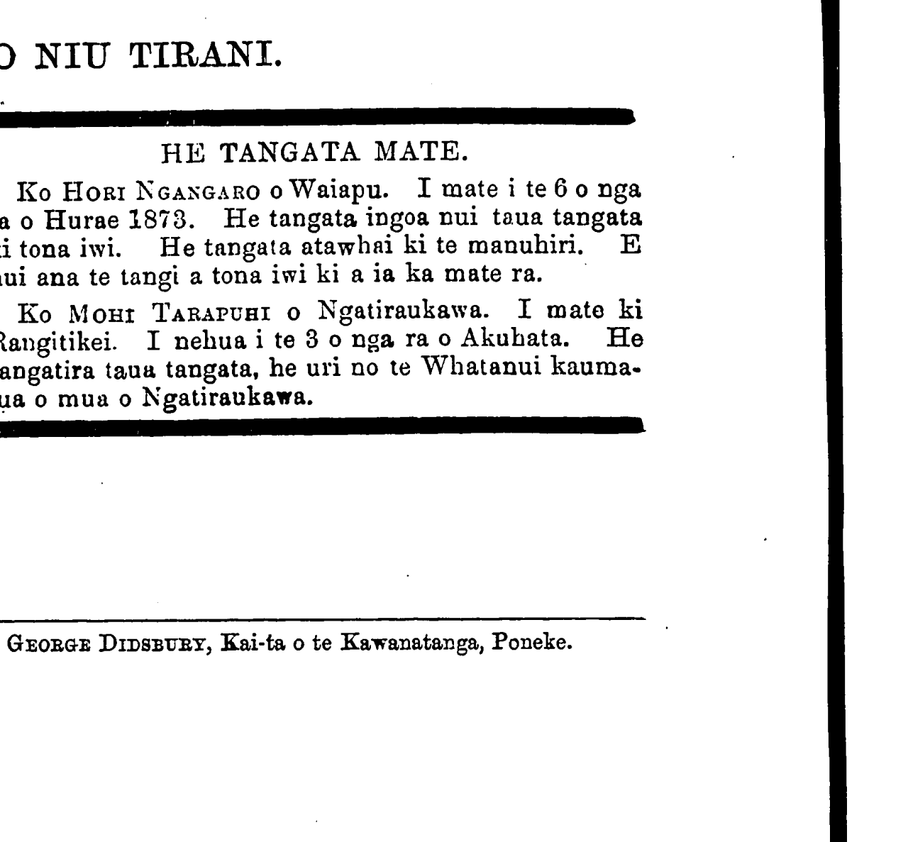 NIU TIRANI. HE TANGATA MATE. Ko HORI NGANGARO o Waiapu. I mate i te 6 o nga a o Hurae 1873. He tangata ingoa nui taua tangata i tona iwi. He tangata atawhai ki te manuhiri. E ui ana te tangi a tona iwi ki a ia ka mate ra. Ko MOHI TARAPUHI o Ngatiraukawa. I mate ki Rangitikei. I nehua i te 3 o nga ra o Akuhata. He rangatira taua tangata, he uri no te Whatanui kauma- ua o mua o Ngatiraukawa. GEORGE DIDSBURY, Kai-ta o te Kawanatanga, Poneke.