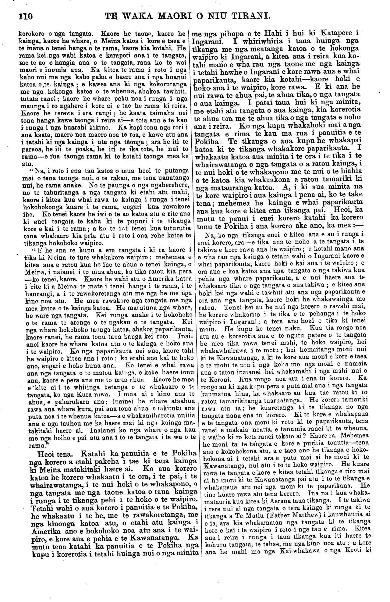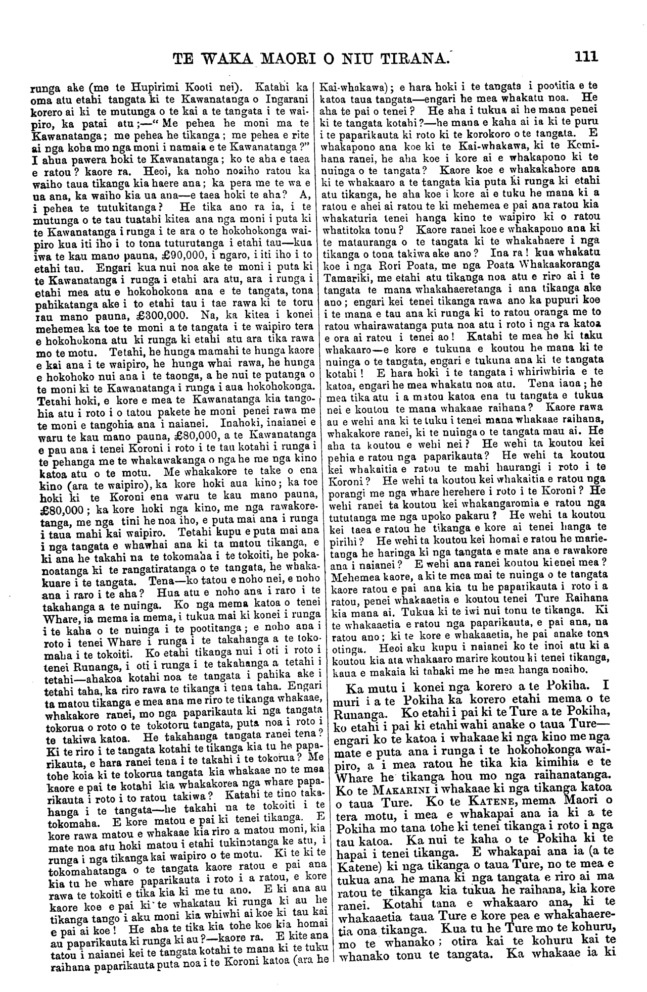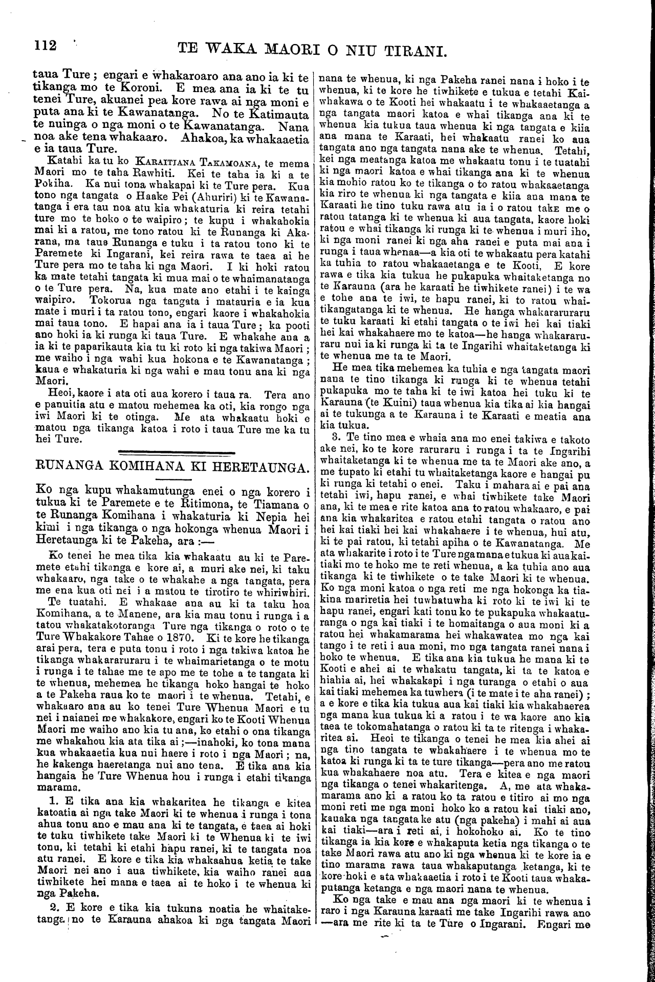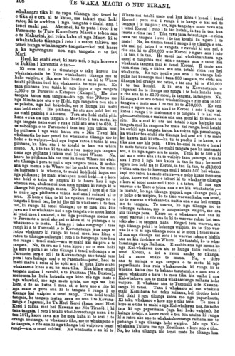 TE WAKA MAORI O NIU TIRANI. 115 Hurai, he whakarihariha kei riro a ratou kotiro, he whakarihariha ano kei tango i nga kotiro ke. Koia taku kupu me whakahe rawa i nga pakeha e tango marena kore ana i a tatou wahine. Ko nga wahine katoa kaore ano i marenatia me tango noa mai me whai utu ranei te tane raua tahi ano ko te wahine ki taua Ture ; ma nga Kai-whakawa ratou e whakahe. Me tango ano te wahine enga maori, ko taua Ture ano hei tuara mo ratou; ta te mea ko te pakeha he iwi mohio ki tena mea ki te marena, a me herehere hoki te wahine e moe noa iho ana i te pakeka. Kaore au e mohio ki te he o te maori e moe marena kore ana i te wahine. E hara tena mea i ona tupuna; he mea tupu rnai nga rangatira o te maori e rangona nei nga ingoa i roto i nga wahine ki hai i marenatia ki a ratou tane. He roea pai ano te marena ma te hunga e hiahia ana. He marena tonu na.te maori te whakaaetanga no nga matua iho ra ano, tuku iho, tuku iho. Na, koia tenei, kaua te iwi mohio e whakahoki i a ia ki te kuaretanga E nga wahine maori katoa e moe ana i te pakeha, e kore ianei koutou e aroha ki a koutou ? Kei peneitia koutou me to koutou hoa e panuitia nei e Wiremu Paora. Hei kupu tena ki o koutou mea e whai wha- kaaro ana kia whakaarohia e ia tenei mea. Ko tana aroha ki a koe kei tena wa anake. Mutu iho a, hei muri iho, ka tangi koe i tenei tangi ki a koutou ko o koutou tamariki:— Kaore te whakama o te tamariki e, Tautokorna rawa te putanga ki waho ra ; Kei whea to matua nana koe i wero mai— Tena ka riro i te tini o te wahine, a. E pa e te Umakau Ohomatakamokamo, tena koe. I ui nei koe ki au, " He aha te Rukuruku ?" E hoa, he kete te rukuruku, he kete ki hai i ki i te kai— putikia iho nga kai ki te tangere o te kete. Koia tena kupu a te " Putiki" me te "Rukuruku;" e rua hoki nga kupu o tena mea i roto i te whakatauki. Ko te Rukuruku a Whakaotirangi, me tenei ano ko te Putiki a Whakaotirangi, mutu tonu tena mea te Rukuruku i kona. Tote matau me te aho tona takotoranga he ipu, ara he oko ; tona ingoa tuturu he taputapu. Te rua o ui, " Ko wai te matua, te whaea, me te tane a Whaka- otirangi ?" Ko taku korero ano hei korero maku. Ko Puhaorangi te tangata nona tena waka a te Arawa. I riri ia mo te wahanga o tana whare e Tamatekapua, na kona ia i noho atu ai. Ko Ngatoro, no Tainui tena tangata, me kaore koe i rongo. Ko ena tangata tokorua he tohunga anake. Ki to mohio ko wai te tohunga o Tainui i muri i te rironga o Ngatoro i a te Arawa? Tena i mate a Tamatekapua ki whea ? Kei whea hoki e tanu ana? Nau hoki i ui huna mai ki a au, koia ka uia hunatia atu e au ki a koe. E tika ana tena, i wha- nau mai au i a koe. E hoa, ko wai te tupuna o te motu nei e hapa ana i au ? Kaore aku kupu whakahe mo to waka mo Ngamahanga-a-Tuamatua,, kaore ano kia mohiotia noatia e te motu nei. Katahi ano te kapu whakahe mo to waka ka puta atu i toku mangai. E taea hoki te aha i te papai o nga tangata o runga i a Tainui i rere mai ai au wahine e waiho mai na e koe hei amuamunga mai mau ki a au. E hoa, e ora nei ano ranei te tangata nona tenei ingoa a Te Umakau Ohomatakamokama? Na HOANI NAHE. [E hoa e Hoani, na wai i korero ki a koe ki tena Ture e ki nei koe e mea ana te Pire o taua Ture, " ma te Kawanatanga nga awa wai-maori i nga wahi katoa o te motu nei ?" E he ana matou ki tena Ture. Aku- anei he tangata whakakiki teka pea nana ena korero ki a koe—ko tetahi pea o te tu tangata e waiho nei he mahi mana ko te whakaowhiti kau i nga iwi, ko te wha- kararuraru kau i te motu. Kotahi te Ture e mohiotia ana e matou e hangaia ana i roto i te Paremete inaianei, he Ture whakatuwhera i nga awa kia taea ai e te tangata te whakaheke mai i ona rakau ki waho. Mehemea e noho ana koe i to wahi whenua i te kauru o tetahi awa, tena ranei koe e pai kia katia atu koe ki runga e te tangata o te taha ki raro rnai?—kia kore hoki koe e tukua ki te whakaheke mai ki waho i o rakau i mahi ai koe hei hoko oranga mou ? Na, ko te tikanga tena o taua Ture. He mea kia kore e kaha te tangata e noho ana i te taha ki raro ki te kati i te awa ki te tangata e noho ana i te taha ki runga, mo ana rakau kia whakahekea mai ki waho. Kua kitea hoki taua whakaaro i etahi tangata (pakeha) i mea ai kia hangaia taua Ture. E hara i te mea ka mana taua Ture ki te motu katoa i te otinga tonutanga mai i roto i te Paremete ; engari, tona tikanga, e tukua ana ki nga Huparitene mana he whakamana i roto i tona Poro- wini i tona Porowini—e kore ranei. Tena ano hoki e whakarongo te Huparitene ki te whakaaro a nga tangata i roto i tona Porowini. Ki te hiahia nga tangata katoa o tona Porowini kia kore e whakaturia taua Ture i roto i a ratou, ma ratau e pa atu ki te Huparitene. Tena, ko te kupu e ki na koe roa te Kawanatanga nga awa katoa, kaore matou e mohio ana ki tena. Tetahi. Ko te. kupu mo te wahine maori moe marena kore i te pakeha, kaore he tikanga i te ture mo tena. Kai te he ou whakaaro ki te ahua o tenei hanga, o te ture, i hangaia ai. Ki hai i hangaia te ture hei whakakuare i te tangata, hei whakataurereka i te tangata, engari hei whakarangatira i te tangata. E kore e taea te wha kakuare i te tangata i tenei rangi o te maramatanga, o te mautauranga, o te rangatiratanga o te au katoa. E ki ana te ture he rangatira nga tangata katoa ; kei a ia ake ano tona whakaaro ki te tikanga mona ake, ara ki te kore ia e tahuri ki te takahi ki te tukino i tetahi atu tangata; ka pera ia ka he ia i te ture—he takahi hoki tana i ta te ture e hapai ana, ara ko te rangatiratanga o te tangata. Mehemea ka hangaia he ture kia kore e moe te wahine i tana tane e paingia ana e tona ngakau he whakakuare tena i te tangata, he here i tona tinana me ona whakaaro i roto i a ia—katahi te tikanga wha- kataurereka rawa atu i te tangata ko tena. E ki ana koe he mea whakarihariha ki te pakeha me ka riro i a koe tona tuahine hei wahine mau. Kaore ra te ture e ki ana kia kore koe e moe i tetahi wahine pakeha mau. Ki te mea he tangata pai koe, he tangata whai oranga mo tau wahine, a ka kite koe i te wahine pakeha