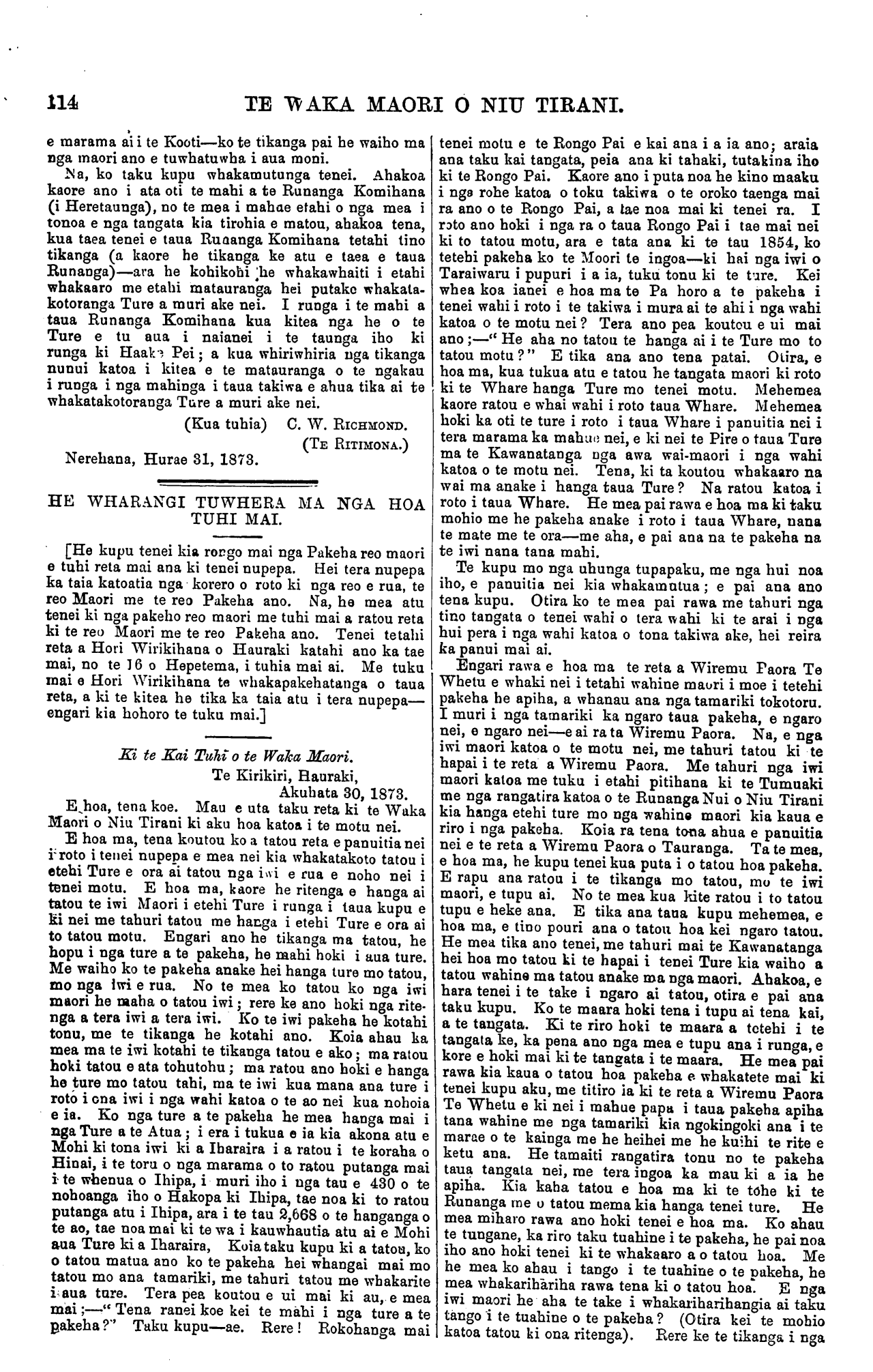 TE WAKA MAORI O NIU TIRANI. e marama ai i te Kooti—ko te tikanga pai he waiho ma nga maori ano e tuwhatuwha i aua moni. Na, ko taku kupu whakamutunga tenei. Ahakoa kaore ano i ata oti te mahi a te Runanga Komihana (i Heretaunga), no te mea i mahue etahi o nga mea i tonoa e nga tangata kia tirohia e matou, ahakoa tena, kua taea tenei e taua Runanga Komihana tetahi tino tikanga (a kaore he tikanga ke atu e taea e taua Runanga)—ara he kohikohi he whakawhaiti i etahi whakaaro me etahi matauranga hei putake whakata- kotoranga Ture a muri ake nei. I runga i te mahi a taua Runanga Komihana kua kitea nga he o te Ture e tu aua i naianei i te taunga iho ki runga ki Haake Pei; a kua whiriwhiria nga tikanga nunui katoa i kitea e te matauranga o te ngakau i runga i nga mahinga i taua takiwa e ahua tika ai te whakatakotoranga Tare a muri ake nei. (Kua tuhia) C. W. RICHMOND. (TE RITIMONA.) Nerehana, Hurae 31, 1873. HE WHARANGI TUWHERA MA NGA HOA TUHI MAI. [He kupu tenei kia rongo mai nga Pakeha reo maori e tuhi reta mai ana ki tenei nupepa. Hei tera nupepa ka taia katoatia nga korero o roto ki nga reo e rua, te reo Maori me te reo Pakeha ano. Na, he mea atu tenei ki nga pakeho reo maori me tuhi mai a ratou reta ki te reo Maori me te reo Pakeha ano. Tenei tetahi reta a Hori Wirikihana o Hauraki katahi ano ka tae mai, no te 1 6 o Hepetema, i tuhia mai ai. Me tuku mai e Hori Wirikihana te whakapakehatanga o taua reta, a ki te kitea he tika ka taia atu i tera nupepa— engari kia hohoro te tuku mai.] Ki te Kai Tuhi o te Waka Maori. Te Kirikiri, Hauraki, Akuhata 30,1873. E hoa, tena koe. Mau e uta taku reta ki te Waka Maori o Niu Tirani ki aku hoa katoa i te motu nei. E hoa ma, tena koutou ko a tatou reta e panuitia nei i roto i tenei nupepa e mea nei kia whakatakoto tatou i etehi Ture e ora ai tatou nga iwi e rua e noho nei i tenei motu. E hoa ma, kaore he ritenga e hanga ai tatou te iwi Maori i etehi Ture i runga i taua kupu e Ki nei me tahuri tatou me hanga i etehi Ture e ora ai to tatou motu. Engari ano he tikanga ma tatou, he hopu i nga ture a te pakeha, he mahi hoki i aua ture. Me waiho ko te pakeha anake hei hanga ture mo tatou, mo nga iwi e rua. No te mea ko tatou ko nga iwi maori he maha o tatou iwi; tere ke ano hoki nga rine- nga a tera iwi a tera iwi. Ko te iwi pakeha he kotahi tonu, me te tikanga he kotahi ano. Koia ahau ka mea ma te iwi kotahi te tikanga tatou e ako; ma ratou hoki tatou e ata tohutohu; ma ratou ano hoki e hanga he ture mo tatou tahi, ma te iwi kua mana ana ture i roto i ona iwi i nga wahi katoa o te ao nei kua nohoia e ia. Ko nga ture a te pakeha he mea hanga mai i nga Ture a te Atua; i era i tukua e ia kia akona atu e Mohi ki tona iwi ki a Iharaira i a ratou i te koraha o Hinai, i te toru o nga marama o to ratou putanga mai i te whenua o Ihipa, i muri iho i nga tau e 430 o te nohoanga iho o Hakopa ki Ihipa, tae noa ki to ratou putanga atu i Ihipa, ara i te tau 2,668 o te hanganga o te ao, tae noa mai ki te wa i kauwhautia atu ai e Mohi aua Ture ki a Iharaira, Koia taku kupu ki a tatou, ko o tatou matua ano ko te pakeha hei whangai mai mo tatou mo ana tamariki, me tahuri tatou me whakarite i aua ture. Tera pea koutou e ui mai ki au, e mea mai;—" Tena ranei koe kei te mahi i nga ture a te pakeha?" Taku kupu—ae. Rere! Rokohanga mai tenei motu e te Rongo Pai e kai ana i a ia ano; araia ana taku kai tangata, peia ana ki tahaki, tutakina iho ki te Rongo Pai. Kaore ano i puta noa he kino maaku i nga rohe katoa o toku takiwa o te oroko taenga mai ra ano o te Rongo Pai, a tae noa mai ki tenei ra. I roto ano hoki i nga ra o taua Rongo Pai i tae mai nei ki to tatou motu, ara e tata ana ki te tau 1854, ko tetehi pakeha ko te Maori te ingoa—ki hai nga iwi o Taraiwaru i pupuri i a ia, tuku tonu ki te ture. Kei whea koa ianei e hoa ma te Pa horo a te pakeha i tenei wahi i Toto i te takiwa i mura ai te ahi i nga wahi katoa o te motu nei ? Tera ano pea koutou e ui mai ano;—" He aha no tatou te hanga ai i te Ture mo to tatou motu ?" E tika ana ano tena patai. Otira, e hoa ma, kua tukua atu e tatou he tangata maori ki Toto ki te Whare hanga Ture mo tenei motu. Mehemea kaore ratou e whai wahi i roto taua Whare. Mehemea hoki ka oti te ture i Toto i taua Whare i panuitia nei i tera marama ka mahue nei, e ki nei te Pire o taua Ture ma te Kawanatanga nga awa wai-maori i nga wahi katoa o te motu nei. Tena, ki ta koutou whakaaro na wai ma anake i hanga taua Ture ? Na ratou katoa i roto i taua Whare. He mea pai rawa e hoa ma ki taku mohio me he pakeha anake i Toto i taua Whare, nana te mate me te ora—me aha, e pai ana na te pakeha na te iwi nana tana mahi. Te kupu mo nga uhunga tupapaku, me nga hui noa iho, e panuitia nei kia whakamutua; e pai ana ano tena kupu. Otira ko te mea pai rawa me tahuri nga tino tangata o tenei wahi o tera wahi ki te arai i nga hui pera i nga wahi katoa o tona takiwa ake, hei reira ka panui mai ai. Engari rawa e hoa ma te reta a Wiremu Paora Te Whetu e whaki nei i tetahi wahine maori i moe i tetehi pakeha he apiha, a whanau ana nga tamariki tokotoru. I muri i nga tamariki ka ngaro taua pakeha, e ngaro nei, e ngaro nei—e ai ra ta Wiremu Paora. Na, e nga iwi maori katoa o te motu nei, me tahuri tatou ki te hapai i te reta a Wiremu Paora. Me tahuri nga iwi maori katoa me tuku i etahi pitihana ki te Tumuaki me nga rangatira katoa o te Runanga Nui o Niu Tirani kia hanga etehi ture mo nga wahine maori kia kaua e riro i nga pakeha. Koia ra tena tona ahua e panuitia nei e te reta a Wiremu Paora o Tauranga. Ta te mea, e hoa ma, he kupu tenei kua puta i o tatou hoa pakeha. E rapu ana ratou i te tikanga mo tatou, mo te iwi maori, e tupu ai. No te mea kua kite ratou i to tatou tupu e heke ana. E tika ana taua kupu mehemea, e hoa ma, e tino pouri ana o tatou hoa kei ngaro tatou. He mea tika ano tenei, me tahuri mai te Kawanatanga hei hoa mo tatou ki te hapai i tenei Ture kia waiho a tatou wahine ma tatou anake ma nga maori. Ahakoa, e hara tenei i te take i ngaro ai tatou, o