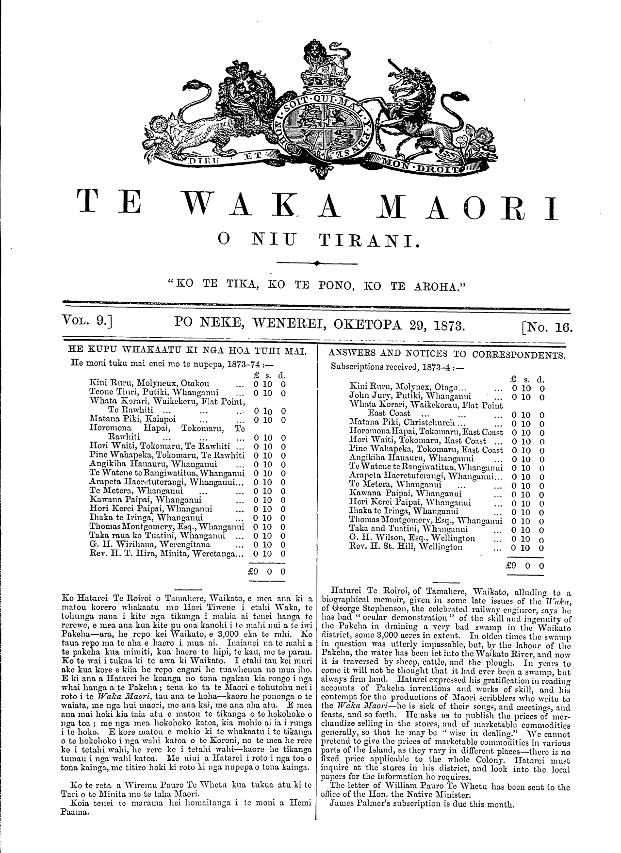 Te Waka Maori o Niu Tirani 1871-1877: Volume 9, Number 16. 29 October 1873 |