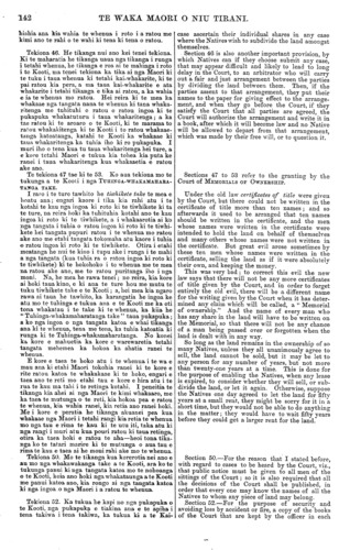 TE WAKA MAORI O NIU TIRANI UI whenua kore aua; engari Id te tikanga o te ture hou me matua pa Id nga tane me nga wahine me nga tamariki katoa korero ai, a ka waiho ano hoki tetahi whenua rahi mo ratou katoa (kei te tokomahatanga o ratou te tikanga) hoi nohoanga mo ratou hei mate- nga mo ratou—no te mea e kore e tika kia hokoa taua whenua e te tangata, kia tangohia atu ranei i a ratou, kia panaia ranei ratou i tana whenua hei ma- hinga ma ratou Ko nga tekiona e timata ana i te 33 haere ki te 46 mo te whakawakanga a te Kooti i nga take ki te whenua. Ko te tekiona 33 e mea aua ki te mea o ki ana. etahi Maori he whenua ta ratou (ara kia whakawakia) me matua tono ratou ki te Kooti kia whakaritea Ida ruritia taua whenua, kia hangaia hoki he mapi hei whakaatu i nga rohe. Ko te tikanga o te ruritanga ka korerotia mariretia e au akuanei. Tekiona 34. Ko nga Maori e ki ana he whenua ta ratou, a e hiahia aua kia whakawakia e to Kooti to ratou take ki taua whenua, me tuku e ratou he panui ki a to Kai-whakawa Tumuaki ki Akarana (a te Penetana) he mea whakaatu i taua whenua me ona rohe, me whakaatu hoki e ratou ki a ia nga ingoa, o nga iwi mo nga tangata katoa e whai tikanga, ana ki taua whenua ki la ratou whakaaro. Mehemea o nui atu ana i te tokorua nga tangata e tono ana ki te whenua (kia whakawakia). penei, kia tokotoru o ratou e tuhituhi i o ratou ingoa ki te pukapuka panui. Tekiona 35. Na. no te mea o kore e tika o kore hoki e whakaaetia kia mahia ngarotia tetahi mea, kei te tukunga panui ki a to Kai-whakawa Tumuaki ki Akarana o nga tangata, o tono ana ki to whenua (kia whakawakia) 1110 tuku hold e ratou he panui ano ki nga tangata katoa atu e mohiotia aua e ratou o tohe ana ki taua whenua hei whakaatu ki aua tangata i Io ratou tononga ki a to Penetana. A me tupato ratou kia tae rawa ano taua, panui ki aua tangata, no te mea ka meingatia kia korero marire ratou i ruto i te Kooti te wahi i hoatu ai taua panui me te tangata i hoatu ai. Tekiona 36. No te mea ko nga mahinga katoa i roto i te Kooti he mea mahi nui tonu i tu aroaro o nga tangata katoa, na ho mea tika ia kia panuitia atu kia hohoro to rongo nga tangata katoa ki tu takiwa e noho ai te Kooti mo nga whenua katoa e meatia ana kia whakawakia—no reira ka panuitia nga kereme katoa ki to reo Ingarihi me te reo Maori i roto i te Kahiti Pakeha mo to Kahiti Maori. a ka tukua atu ki nga wahi katoa o Io motu. Tekiona 37 me te 38. He tekiona enei o tau ana ki runga ki nga mahi a etahi apiha he mahi uiui ki to tikanga Id to peheatanga ranei o aua kereme i te wa kaore ano kia whakarangona ara i mua mai o Ie whakawakanga. He mea hoki kia ahei ai ratou te whakakore i aua kereme whenua mehemea kaore i tika, koi maumautia nga taima o te Kooti ki runga Id te mea hanga noaiho, ki to mea whakarihariha kau noaiho ranei. Tekiona. 30. E ki ana tenei tekiona ko nga Maori e tono ana ki te whenua me whakarite he tikanga, i mua mai o Io whakawakanga, e taea ai io utu ki a to Kuini mo te ruritanga o te whenua kua ruritia ra. He mea tenei kia pono ai te utunga i a to Kuini mo to mahi kua whakamahia e ia mo nga Maori. Tekiona 40 tao ki te 44 mo nga nohoanga a te Kooti, me to pataitanga a te Kooti ki nga kai korero. Tekiona 45. He tikanga nui kei roto i tenei tekiona. Ma tenei tekiona, ka kite ai nga Maori i te rahi o te wahi e tika ana kia riro i tera i tera o ratou i roto i tetahi piihi whenua puku. Na, ahakoa o ahei ano te Kimi i te rahi o to wahi ki te tangata me te pupuri tahi ano hold i te whenua puku ki a ratou katoa mau ai; engari kei nga meatanga katoa e man, woman and child will be counted, and a large piece of land for the whole of them, in proportion to their numbers, will be kept for them ; where they can live, and where they may die, for it will not be lawful for any one to sell that land, or take it away from them, or prevent them from living on that land and cultivating it. Sections 33 to 46 refer to the investigation of titles by the Court. Section 33 declares that if any Natives claim any land, they must in the first place apply to the Court to have a survey made of the land, and maps pre- pared showing the boundaries of Iho land. The manner of making Iho survey I will speak about presently. Section 34.—Any Natives who claim any Iand, and wish their title to bo investigated by the Court must give notice to the Chief Judge at Auckland (Fenton), describing the land by boundaries, and telling him the names of every tribe or persons whom they think also have A claim to the land. Where there are more than two Natives claiming the land three of them must sign the application. Section 35.—As it is not allowed io do anything in secret, the Natives who claim the land, when they apply to the Chief Judge at Auckland must send a notice to all the persons whom they believe also claim the land to tell them that they have applied to Fenton, and they must take care that these persons receive that notice, ior they will have to tell the Court where the notice was delivered and to what person it was delivered. Section 36.—Ay all business in the Court is often in public before all men, it is required to Iet all men know in timo when the Court is going to sit and what cl;ui!'.s aro Io bo licard. TIicreforu :\\}\\ eh'iims ure publislied in .English and Maori in the Ga^cffc. ;ind in the Kahiti ;md .sent about ;ill ovc'r Ihe cou!itrv. Sections ?>"! nini 3S rcfer to tlio duties oi' uiil'ercnt olilccrs to make i;Kjuiries about tliesc c!;iiins bei'uro tlicy aro l-.card, so tliat tliov in;iy bo nb!u In put a ?-;lop to Ihein if tlicy iT-ro not good (-•hiii;i?-, ;unl lo ])rcvcnt t!ic Court wasting time ovcr ;i c;i^u ^vliicli is t'rivoloiis or vexatious-;. Section 39 providcs th;it, befoi'c tlic cl;iiin is heard, llio Natives wlio cluim tlio Ianei will nn'aiigo about my ing the Qu?cn i'ov the survev that li;is been mado of t!ie l;uid. Tins is to mako sure t!i;lt tl'.o Queen. v>-ill bo paid Io;.' tlio work slio h;is liail done ior the Natives. Sections 40 to 41- retcr to t