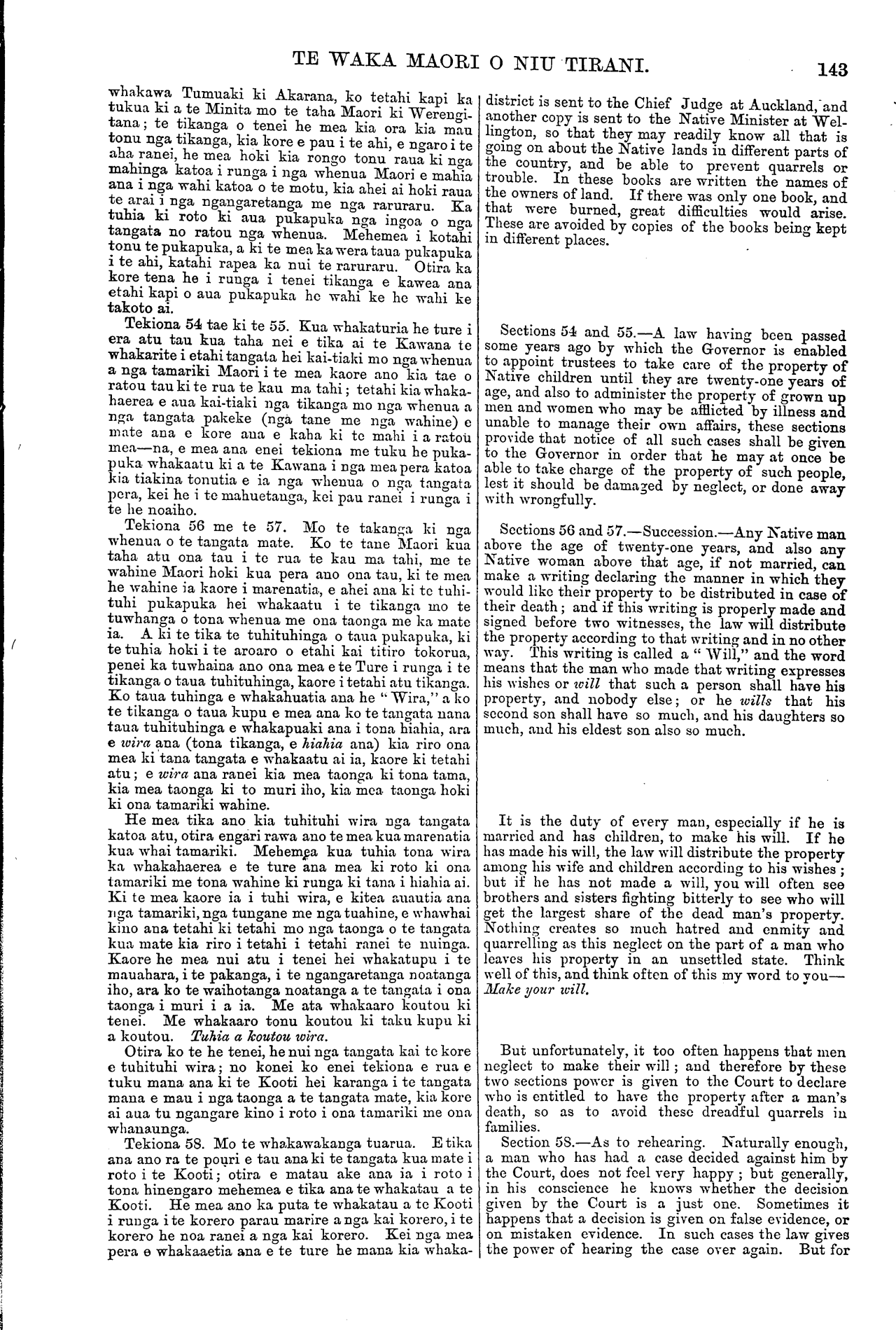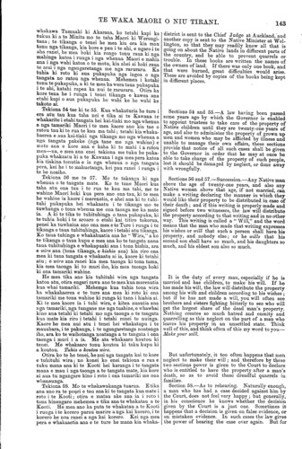 TE WAKA MAORI O NIU TIRANI. 143 whakawa Tumuaki ki Akarana, ko tetahi kapi ka tukua ki a te Minita mo te taha Maori ki Werengi- tana; te tikanga o tenei he mea kia ora kia mau tonu nga tikanga, kia kore e pau i te ahi, e ngaro i te aha ranei, he mea hoki kia rongo tonu raua ki nga mahinga katoa i runga i nga whenua Maori e mahia ana i nga wahi katoa o te motu, kia ahei ai hoki raua te arai i nga ngangaretanga me nga raruraru. Ka tuhia ki roto ki aua pukapuka nga ingoa o nga tangata no ratou nga whenua. Mehemea i kotahi tonu te pukapuka, a ki te mea kawera taua pukapuka i te ahi, katahi rapea ka nui te raruraru. Otira ka kore tena he i runga i tenei tikanga e kawea ana etahi kapi o aua pukapuka he wahi ke he wahi ke takoto ai. Tekiona 54 tae ki te 55. Kua whakaturia he ture i era atu tau kua taha nei e tika ai te Kawana te whakarite i etahi tangata hei kai-tiaki mo nga whenua a nga tamariki Maori i te mea kaore ano kia tae o ratou tau ki te rua te kau ma tahi; tetahi kia whaka- haerea e aua kai-tiaki nga tikanga mo nga whenua a nga tangata pakeke (nga tane me nga wahine) e mate ana e kore aua e kaha ki te mahi i a ratou mea—na, e mea ana enei tekiona me tuku he puka- puka whakaatu ki a te Kawana i nga mea pera katoa kia tiakina tonutia e ia nga whenua o nga tangata pera, kei ho i te mahuetanga, kei pau ranei i runga i te he noaiho. Tekiona 56 me te 57. Mo te takanga ki nga whenua o te tangata mate. Ko te tane Maori kua taha atu ona tau i to rua te kau ma tahi, me te wahine Maori hoki kua pera ano ona tau, ki te mea he wahine ia kaore i marenatia, e ahei ana ki te tuhi- tuhi pukapuka hei whakaatu i te tikanga mo te tuwhanga o tona whenua me ona taonga me ka mate ia. A ki te tika te tuhituhinga o taua pukapuka, ki te tuhia hoki i te aroaro o etahi kai titiro tokorua, penei ka tuwhaina ano ona mea ete Ture i runga i te tikanga o taua tuhituhinga, kaore i tetahi atu tikanga. Ko taua tuhinga e whakahuatia ana he "Wira," a ko te tikanga o taua kupu e mea ana ko te tangata nana taua tuhituhinga e whakapuaki ana i tona hiahia, ara e wira ana (tona tikanga, e hiahia ana) kia riro ona mea ki tana tangata e whakaatu ai ia, kaore ki tetahi atu; e wir a ana ranei kia mea taonga ki tona tama, kia mea taonga ki to muri iho, kia mea. taonga hoki ki ona tamariki wahine. He mea tika ano kia tuhituhi wira nga tangata katoa atu, otira engari rawa ano te mea kua marenatia kua whai tamariki. Mehemea kua tuhia tona wira ka whakahaerea e te ture ana mea ki roto ki ona tamariki me tona wahine ki runga ki tana i hiahia ai. Ki te mea kaore ia i tuhi wira, e kitea auautia ana nga tamariki, nga tungane me nga tuahine, e whawhai kino ana tetahi ki tetahi mo nga taonga o te tangata kua mate kia riro i tetahi i tetahi ranei te nuinga. Kaore he mea nui atu i tenei hei whakatupu i te mauahara, i te pakanga, i te ngangaretanga noatanga iho, ara ko te waihotanga noatanga a te tangata i ona taonga i muri i a ia. Me ata whakaaro koutou ki tenei. Me whakaaro tonu koutou ki taku kupu ki a koutou. Tuhia a koutou wira. Otira ko te he tenei, he nui nga tangata kai te kore e tuhituhi wira; no konei ko enei tekiona e rua e tuku mana ana ki te Kooti hei karanga i te tangata mana e mau i nga taonga a te tangata mate, kia kore ai aua tu ngangare kino i roto i ona tamariki me ona whanaunga. Tekiona 58. Mo te whakawakanga tuarua. E tika ana ano ra te pouri e tau ana ki te tangata kua mate i roto i te Kooti; otira e matau ake ana ia i roto i tona hinengaro mehemea e tika ana te whakatau a te Kooti. He mea ano ka puta te whakatau a te Kooti i runga ite korero parau marire a nga kai korero, i te korero he noa ranei a nga kai korero. Kei nga mea pera e whakaaetia ana e te ture he mana kia whaka- district is sent to the Chief Judge at Auckland/and another copy is sent to the Native Minister at Wel- lington, so that they may readily know all that is going on about the Native lands in different parts of the country, and be able to prevent quarrels or trouble. In these books are written the names of the owners of land. If there was only one book, and that were burned, great difficulties would arise. These are avoided by copies of the books being kept in different places. Sections 54 and 55.—A law having been passed some years ago by which the Governor is enabled to appoint trustees to take care of the property of Native children until they are twenty-one years of age, and also to administer the property of grown up men and women who may be afflicted by illness and unable to manage their own affairs, these sections provide that notice of all such cases shall be given to the Governor in order that he may at once be able to take charge of the property of such people, lest it should be damaged by neglect, or done away with wrongfully. Sections 56 and 57.—Succession.—Any Native man above the age of twenty-one years, and also any Native woman above that age, if not married, can make a writing declaring the manner in which they would like their property to be distributed in case of their death; and if this writing is properly made and signed before two witnesses, the law will distribute the property according to that writing and in no other way. This writing is called a " Will," and the word means that the man who made that writing expresses his wishes or will that such a person shall have hia property, and nobody else; or he mills that his second son shall have so much, and his daughters so much, and his eldest son also so much. It is the duty of every man, especially if he is married and has children, to make his will. If he has made his will, the law will distribute the property among his wife and children according to his wishes ; but if he has not made a will, you will often see brothers and sisters fighting bitterly to see who will get the largest share of the dead man's property. Nothing creates so much hatred and enmity and quarrelling as this neglect on the part of a man who leaves his property in an unsettled state. Think well of this