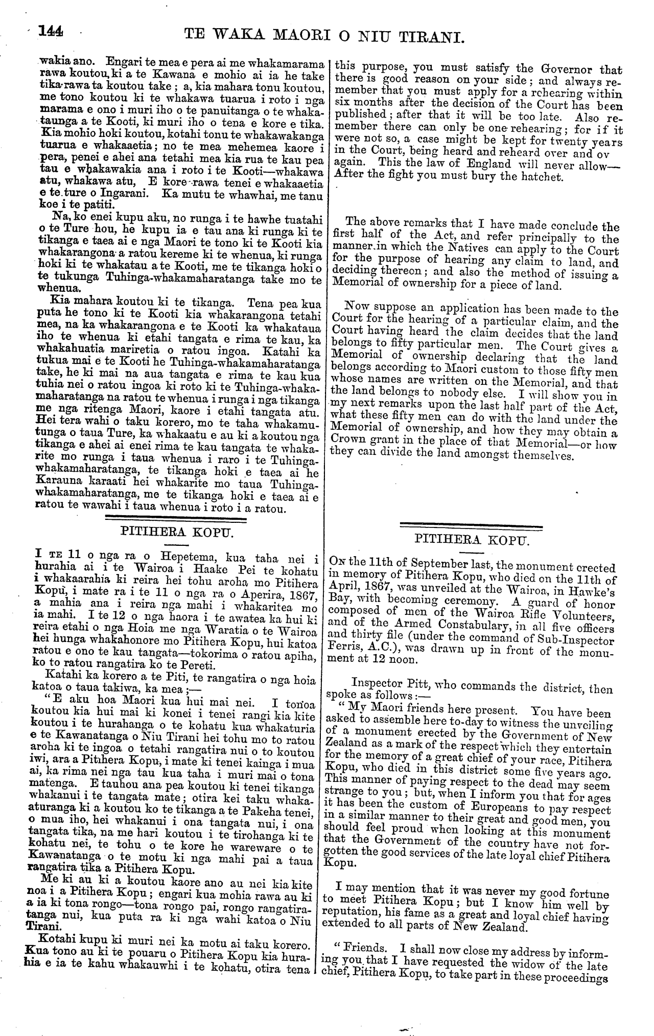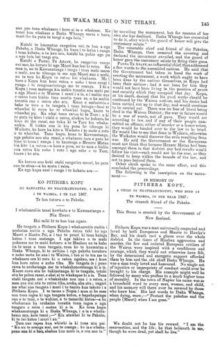 TE WAKA MAORI O NIU TIRANI 145 ano pea tona whakaaro i kore ai ia e whakaae. Ko tenei kua whakaae a Ihaka Whanga mana o hura, muri iho ka puta te tangi a nga hoia." Katahi te kaumatua rangatira nei. te hoa a nga Pakeha, a Ihaka Whanga, ka hura i te kahu i runga i taua kohatu, a tu kau ana, katahi ka puhia nga pu a nga hoia hei tangi atu. Katahi a PAORA. TE APATU, ho rangatira rongo nui ano, ka korero ki nga Maori kua hui ki reira. Ka mea ia, na te Kawanatanga i tango i taua mahi mana e mahi, ara to tikanga ia ma nga Maori ano e mahi, no te mea ko Kopu to ratou kai whakaora. Me i kore a Kopu kua kore ratou e noho i taua ranei i runga i to rangimarietanga me te oranga. I ki a Kopu i tona matenga kia mahia tonutia ana mahi pai e nga Maori o te Wairoa i muri i a ia, a i mahia ano e ratou tona hiahia taea noatia taua ra, a ka mahia tonutia ano o ratou ako atu. Kaua e maharatia, e heke to toto o te tangata i taua kainga—heoi te whawhai ki roira ko to whawhai kupu, kaore te whawhai pu. Ka whai tonu ratou ki te Ture ; a ki te puta he kino i etahi o ratou, ahakoa ho kohuru ho kino iti iho ranei, me tuku ki te Ture kia whaka- wakia. E hiahia ana ia kia pona ho tikanga ki Waikato, ka. kore ka kite a Waikato i te mate o roto o te whawhai. Tana kupu, kaua te Kawanatanga. nga pakeha noa atu ranei, e whakaaro tera e puta he kino ki koua i runga i to haerenga o Henare Matua kia kite i a ratou—e kore e pora, no to mea e hiahia ana a ratou kia noho i roto i nga rohe o te Ture, kaore i ko atu. Ka korero ano hoki etahi rangatira maori, ho pera ano te ahua—a ka mutu i reira. Ko nga kupu enei i runga i te kohatu ara :— KO PITIHERA KOPU HE RANGATIRA NO NGATIKAHUNGUNU, I MATE I TE WAIROA, TE TAU 1867. Te hoa tuturu o te Pakeha. I whakaarahia tenei kowhatu e te Kawanatanga o Niu Tirani. Hei mihi ki te hoa kua ngaro. He tangata a Pitihera Kopu i whakaarotia nuitia i arohaina nuitia e nga Pakeha ratou tahi ko nga Maori o Haake Pei, a i tau te pouri ki taua kainga katoa i tona matenga. I nga takiwa o te mahi pokanoa mo te mahi kohuru a te Hauhau na te kaha na te uaua a taua tangata, raua ko te kaumatua a Ihaka Whanga, ki te awhina i nga pakeha torutoru e noho motu ke ana i te Wairoa, i tau ai te toa me te whakaaro ora ki roto ki o ratou ngakau, me i kore kua kore ratou e noho tika. He tangata ia i pono rawa te arohatanga me te whakahonoretanga ki a ia. Kaore rawa atu he tukinotanga ki te tangata, tetahi atu he pehea ranei, e ahei ai te whakapae ki a ia. Tena etahi tangata nei e whakakake noa ana i a ratou, e mea ana nui atu to ratou tika, aroha, aha atu ; engari me whai aua tangata i muri i te tauira kua takoto i a Pitihera Kopu. I te taone o Nepia i mua ai he mea noa tona ingoa ki nga tangata katoa, e hapahapainga ana e te tane, e te wahine, e te tamariki katoa—a ka whakanuia ka arohaina tonutia tona ingoa e nga tangata o reira i matau ki a ia. Ko tona kupu whakamutunga ki a Ihaka Whanga, i a ia e whaka- hemo ana, koia tenei;—" Kia atawhai ki te Pakeha, ki te iwi katoa i muri i au." Tera ano rapea kua whiwhi ia ki tona utu pai. " Ko au te aranga mai, me te oranga ; ko ia e whaka- pono ana ki a hau, ahakoa kua mate ia, e ora ano ia." by unveiling the monument, but for reasons of her own she has declined. Ihaka Whanga has consented to do it, after which the guard of honor will give the customary salute." The venerable chief and friend of the Pakehas, Ihaka Whanga, then removed the covering and declared the monument unveiled, and the guard of honor gave the customary salute by firing their guns. PAORA TE APATU, influential chief, then addressed a few words to the assembled natives. He said that the Government had taken in hand the work of erecting the monument, a work which ought to have been done by the natives themselves, as Kopu had been their saviour; had it not been for him they would not have been living in the position of peace and security which they occupied that day. Kopu, at. his death, desired that his good works should bo continued by the Wairoa natives, and his desire had been carried out up to that Jay, and would continue to bo carried out. There was no fear of blood being shed in the Wairoa roa District; the war in future would be a war of words, not of guns. They would act according to law, and if any of their people com- mitted an offence, either of murder or a lesser crime, they would bo handed over to the law to be tried. He would like to see that done in Waikato, otherwise the Waikatos would discover the evils resulting from war. Ho said the Government or the Europeans must not think that because Henare Matua had been amongst them in that district any bad results would follow his visit—such would not bo the case, as they desired to keep within Iho bounds of the law, and not to pass beyond them. Other chiefs? spoke to the same effect, and this concluded the proceedings. The following is the inscription ou the monu- ment :— IN MEMORY OF PITIHERA KOPU, A CHIEF OF NGATIKAHUNGUNU WHO DIED AT TE WAIROA, IN THE YEAR 1867 : The staunch friend of the Pakeha. This Stone ia erected by the Government of Now Zealand. Pitihera Kopu was a man universally respected and loved by both Europeans and Maoris in Hawke's Bay, and his death cast a gloom over the whole district. In the times of Hauhau aggression and murder, the few and isolated European settlers of the Wairoa were inspired with a confidence and courage, which they would not otherwise have felt, by the determined and energetic support afforded them by him and the old chief Ihaka Whanga. He was a man truly loved and honoured. No single act of injustice or impropriety of conduct could ever be brought tu his charge. His example might well be followed by many who profess to a much higher tone of morality. In the town of Napier his name was as a household word to every man, woman, and child, and his memory will there ever be revered by those who knew him. His last words to Ihaka Whanga, when dying, were ;—" Protect the pakehas and the people 