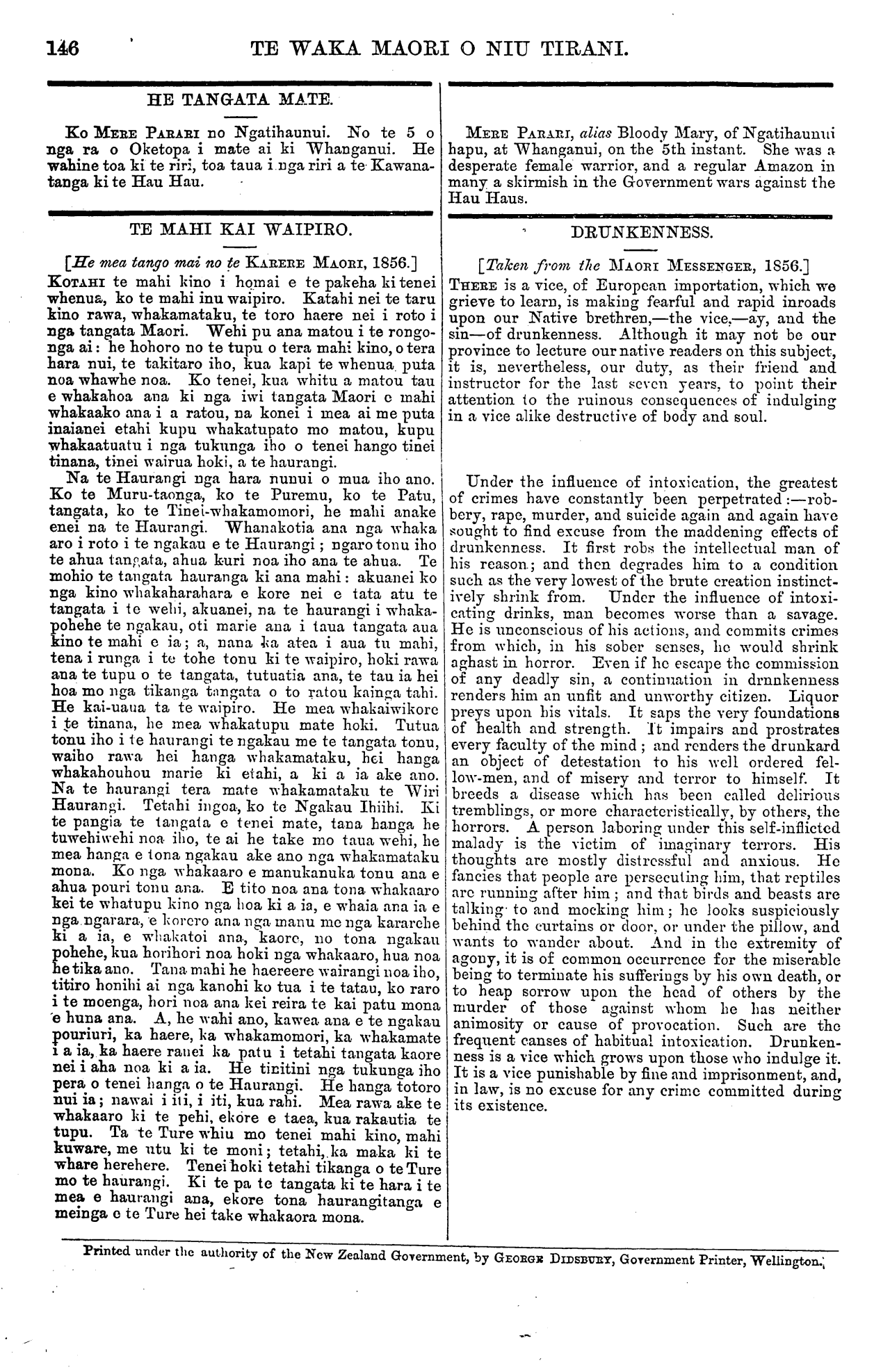 146 TE WAKA MAORI O NIU TIRANI. HE TANGATA MATE. Ko MERE PARARI no Ngatihaunui. No te 5 o nga ra o Oketopa i mate ai ki Whanganui. He wahine toa ki te riri, toa taua i nga riri a te Kawana- tanga ki te Hau Hau. TE MAHI KAI WAIPIRO. [He mea tango mai no te KARERE MAORI, 1856.] KOTAHI te mahi kino i homai e te pakeha ki tenei whenua, ko te mahi inu waipiro. Katahi nei te taru kino rawa, whakamataku, te toro haere nei i roto i nga tangata Maori. Wehi pu ana matou i te rongo- nga ai: he hohoro no te tupu o tera mahi kino, o tera hara nui, te takitaro iho, kua kapi te whenua puta noa whawhe noa. Ko tenei, kua whitu a matou tau e whakahoa ana ki nga iwi tangata Maori e mahi whakaako ana i a ratou, na konei i mea ai me puta inaianei etahi kupu whakatupato mo matou, kupu whakaatuatu i nga tukunga iho o tenei hango tinei tinana, tinei wairua hoki, a te haurangi. Na te Haurangi nga hara nunui o mua iho ano. Ko te Muru-taonga, ko te Puremu, ko te Patu, tangata, ko te Tinei-whakamomori, he mahi anake enei na te Haurangi. Whanakotia ana nga whaka aro i roto i te ngakau e te Haurangi; ngaro tonu iho te ahua tangata, ahua kuri noa iho ana te ahua. Te mohio te tangata hauranga ki ana mahi: akuanei ko nga kino whakaharahara e kore nei e tata atu te tangata i te wehi, akuanei, na te haurangi i whaka- pohehe te ngakau, oti marie aua i taua tangata aua kino te mahi e ia; a, nana ka atea i aua tu mahi, tena i runga i tu tohe tonu ki te waipiro, hoki rawa ana te tupu o te tangata, tutuatia ana, te tau ia hei hoa mo nga tikanga tangata o to ratou kainga tahi. He kai-uaua ta te waipiro. He mea whakaiwikore i te tinana, he mea whakatupu mate hoki. Tutua tonu iho i te haurangi te ngakau me te tangata tonu, waiho rawa hei hanga whakamataku, hei hanga whakahouhou marie ki etahi, a ki a ia ake ano. Na te haurangi tera mate whakamataku te Wiri Haurangi. Tetahi ingoa, ko te Ngakau Ihiihi. Ki te pangia te tangata e tenei mate, tana hanga he tuwehiwehi noa. iho, te ai he take mo taua wehi, he mea hanga e tona ngakau ake ano nga whakamataku mona. Ko nga whakaaro e manukanuka tonu ana e ahua pouri tonu ana. E tito noa ana tona whakaaro kei te whatupu kino nga hoa ki a ia, e whaia ana ia e nga ngarara, e korero ana nga. manu me nga kararehe ki a ia, e whakatoi ana, kaore, no tona ngakau pohehe, kua horihori noa hoki nga whakaaro, hua noa he tika ano. Tana. mahi he haereere wairangi noa iho, titiro honihi ai nga kanohi ko tua i te tatau, ko raro i te moenga, hori noa ana kei reira te kai patu mona e huna ana. A, he wahi ano, kawea ana e te ngakau pouriuri, ka haere, ka whakamomori, ka whakamate i a ia, ka haere ranei ka patu i tetahi tangata kaore nei i aha noa ki a ia. He tinitini nga tukunga iho pera o tenei hanga o te Haurangi. He hanga totoro nui ia; nawai i iti, i iti, kua rahi. Mea rawa ake te whakaaro ki te pehi, ekore e taea, kua rakautia te tupu. Ta te Ture whiu mo tenei mahi kino, mahi kuware, me utu ki te moni; tetahi, ka maka ki te whare herehere. Tenei hoki tetahi tikanga o teTure mo te haurangi. Ki te pa te tangata ki te hara i te mea e haurangi ana, ekore tona haurangitanga e meinga o te Ture hei take whakaora mona. MERE PARARI, alias Bloody Mary, of Ngatihaunui hapu, at Whanganui, on the 5th instant. She was a desperate female warrior, and a regular Amazon in many a skirmish in the Government wars against the Hau Haus. DRUNKENNESS. [Taken from the MAORI MESSENGER, 1856.] THERE is a vice, of European importation, which we grieve to learn, is making fearful and rapid inroads upon our Native brethren,—the vice,—ay, and the sin—of drunkenness. Although it may not bo our province to lecture our native readers on this subject, it is, nevertheless, our duty, as their friend and instructor for the last seven years, to point their attention to the ruinous consequences of indulging in a vice alike destructive of body and soul. Under the influence of intoxication, the greatest of crimes have constantly been perpetrated :—rob- bery, rape, murder, and suicide again and again have sought to find excuse from the maddening effects of drunkenness. It first robs the intellectual man of his reason.; and then degrades him to a condition such as the very lowest of the brute creation instinct- ively shrink from. Under the influence of intoxi- cating drinks, man becomes worse than a savage. He is unconscious of his actions, and commits crimes from which, in his sober senses, ho would shrink aghast in horror. Even if he escape the commission of any deadly sin, a continuation in drunkeness renders him an unfit and unworthy citizen. Liquor preys upon his vitals. It saps the very foundations of health and strength. it impairs and prostrates every faculty of the mind ; and renders the drunkard an object of detestation to his well ordered fel- low-men, and of misery and terror to himself. It breeds a disease which has been called delirious tremblings, or more characteristically, by others, the horrors. A person laboring: under this self-inflicted malady is the victim of imaginary terrors. His thoughts are mostly distressful and anxious. Ho fancies that people are persecuting him, that reptiles aro running after him ; and that birds and beasts are talking to and mocking him ; he looks suspiciously behind the curtains or door, or under the pillow, and wants to wander about. And in the extremity of agony, it is of common occurrence for the miserable being to terminate his sufferings by his own death, or to heap sorrow upon the head of others by the murder of those against whom he has neither animosity or cause of provocation. Such are the frequent causes of habitual intoxication. Drunken- ness is a vice which grows upon those who indulge it. It is a vice punishable by fine and imprisonment, and, in law, is no excuse for any crime committed during its existence. Printed under the authority of the New Zealand Government, by GEORGE DIDSBURY, Government Printer, Wellington.