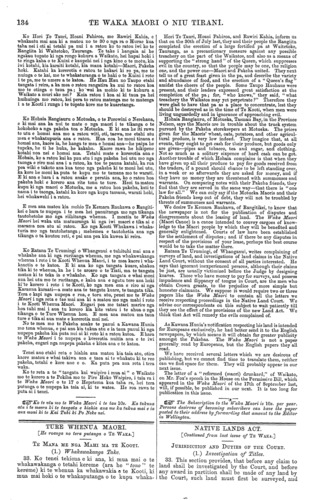 134 TE WAKA MAORI O NIU TIRANI. Ko Hori Te Tauri, Hoani Pahiroa, me Rawiri Kahia, e whakaatu mai aua ki a matou no te 30 o nga ra o Hurae kua taha nei i oti ai tetahi pa nui i a ratou ko to ratou iwi ko te Rangiita ki Waitetoko, Tauranga. Te take i hangaia ai he ngakau tupato ki nga rongo kohuru a Waikato, hei hapai hoki i te ringa kaha o te Kuini e kaupehi nei i nga kino o te motu, kia iwi kotahi, kia karaiti kotahi, kia mana kotahi—Maori, Pakeha hoki. Katahi ka korerotia e ratou te hakari ki ro pa, me te nuinga o te kai, me te whakaturanga o te haki o te Kuini i roto i te pa, me te umere a te katoa. He Hau Hau no Taupo etahi tangata i reira, a ka mea o ratou rangatira ka nui to ratou koa rao te otinga o taua pa; ko "wai ka mohio ki te kohuru a Waikato a muri ako nei ? Koia ratou i koa ai ki taua pa hei huihuinga mo ratou, kei pera to ratou matenga me te matenga i a te Kooti i runga i te tupato kore me te kuaretanga. Ko Hohaia Rangiauru o Motueka, o te Porowini o Nerehana, e ki mai ana ka nui te mate o nga maori i te tikanga o te hokohoko a nga pakeha toa o Motueka. E ki ana he iti rawa te utu e homai ana mo a ratou witi, oti, taewa, me etahi atu mea e whakatupuria ana e ratou. Hua noa he moni tinana e homai ana, kaore ia, he hanga te mea e homai ana—he paipa he tupeka, he ti he huka, he kakahu. Kaore rawa he hikipene kotahi noa nei e homai ana. Tetahi mate e korerotia ana e Hohaia, ko a ratou kai ka pau atu i nga pakeha hei utu mo nga taonga o riro mai ana i a ratou, ka toe te pauna katahi, ka rua pea wiki e takoto ana kua tono nga pakeha ki te moni hei utu, ka kore he moni ka puta te kupu mo te tamana mo te warati. E ki ana e hara i a ratou anake e peratia ana, ko o ratou hoa pakeha hoki e korero ana rite tonu te ture. Heoi ta matou kupu ki nga maori o Motueka, me a ratou hoa pakeha, kati te nama i te taonga, katahi ka kore nga kupu tamana, warati hoki, hei whakawehi i a ratou. E mea ana matou kia .mohio Te Kemara Raukawa o Rangiti- kei e hara te nupepa i te mea hei panuitanga mo nga tikanga tautohetohe mo nga riihitanga whenua. I meatia te Waka Maori hei waka uta matauranga ki nga iwi maori e tika ai e marama noa atu ai ratou. Ko nga Kooti Whakawa i whaka- turia mo nga tautohetanga ; mehemea e tautohetia ana nga tikanga o ta koutou reti, e pai ana pea kia kawea ki reira. Ko Ratana Te Urumingi o Whanganui e tuhituhi mai aua e whakahe ana ki nga ruritanga whenua, me nga whakawakanga whenua i roto i te Kooti Whenua Mao ri, i te mea kaore i wha- kaaetia e te katoa. E ki ana ko nga tangata kuare, ahakoa tika ki te whenua, ka he i te aroaro o te Tiati, ma te tangata matau ki te teka ia e whakahe. Ko nga tangata e whai moni aua hei utu mo (e ruritanga, e kaha ana e ngutu tere aua hoki ki te korero i roto i te Kooti, ko nga mea ena e riro ai nga Karauna karaati—a mate ana te tangata kuare, te tangata tika. Tera e kapi nga nupepa e rua, e toru atu, penei me te Waka Maori i nga reta e tae mai ana ki a matou mo nga mahi i roto i to Kooti Whenua Maori. Engari pea me tatari marire nga hoa tuhi mai i aua tu korero kia kite ratou i te ahua o nga tikanga o te Ture Whenua hou. E mea aua matou ma taua ture e tika ai aua mate e korerotia mai nei. No te mea mo te Pakeha anake te panui a Kawana Hunia mo tona whenua, e pai ana kia tukua atu e ia taua panui ki nga nupepa pakeha kia puta nui ai ki roto ki a ratou kat.oa. E hara te Waka Maori i te nupepa e korerotia nuitia ana e te iwi pakeha, engari nga nupepa pakeha e kitea ana e te katoa. Tenei ano etahi reta e hiahia ana matou kia taia atu, otira kaore matou e whai takiwa ana e taea ai to whakatu ki te reo pakeha, tetahi e kore ano e o. Ka puta pea aua reta i tera waka. Ko te reta a te " tangata kai waipiro i mua ai" o Waikato mo te korero a te Pokiha mo to Pire Hoko Waipiro, i taia ra i te Waka Maori o te 17 o Hepetema kua taha ra, hei tera putanga o te nupepa ka taia ai, ki te watea. He roa rawa te puta ai i tenei. Ko te utu mo te Waka Maori i te tau 10s. Ka tukuna atu. i te meera ki ie tangata e hiahia ana me ka tukua mai e ia aua moni ki te Kai Tuhi ki Po Neke nei. TURE WHENUA MAORI. [ He roanga no tera putanga o TE WAKA,] TE MANA ME NGA MAHI MA TE KOOTI. (1.) Whakawakanga Take. 33. Ko tenei tekiona e ki ana, ki mua mai o te whakawakanga o tetahi kereme (ara he "tono" te kereme) ki te whenua ka whakawakia e te Kooti, ki mua mai hoki o te whakaputanga o te kupu whaka- Hori Te Tauri, Hoani Pahiroa, and Rawiri Kahia, inform us that on the 30th of July last, they and their people the Rangiita completed the erection of a large fortified pa at. Waitetoko, Tauranga, as a precautionary measure against any possible treachery on the part of the Waikatos, and also as a means of supporting the " strong hand " of the Queen, which suppresses evil in the country, so that the people may begone, the religion one, and the power one—Maori and Pakeha united. They next tell us of a great feast given in the pa, and describe the variety and abundance of food, and the erection of a " Queen's flag " amidst the cheers of the people. Some Taupo Hauhaus were present, and their leaders expressed great satisfaction at the completion of the pa ; for, " who knows," they said, " what treachery the Waikatos may yet perpetrate ?" Therefore they were glad to have that pa as a place to concentrate, lest they should be destroyed as in the time of Te Kooti, when men were living unguardedly and in ignorance of approaching evil. Hohaia Rangiauru, of Motueka, Tasman Bay, in the Province Nelson, says the Maoris are in trouble about the truck system pursued by the Pakeha storekeepers at Motueka. The prices given for the Maoris' wheat, oats, potatoes, and other agricul- tural produce, is very low indeed. They imagine that, at all events, they ought to get cash for their produce, but goods only are given—pipes and tobacco, tea and sugar, and clothing. Not so much as a solitary sixpence of hard cash can be got. Another trouble of which Hohaia complains is that when they have given up al