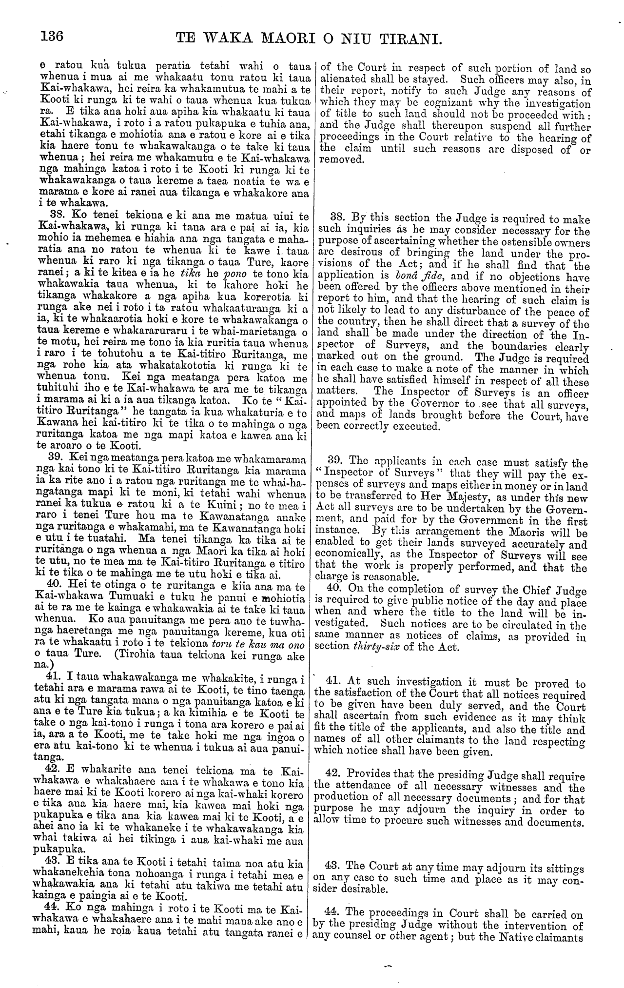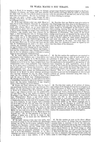 TE WAEA MAORI O NIU TIRANI. 135 tau a te Kooti ki te tangata i runga i te tikanga wahanga o te whenua, me matua ruri taua whenua me kawe hoki ki roto ki te Kooti takoto ai kia rua mapi tika o tana, whenua. Ko aua tu ruritanga me aua mapi me mahi i runga i nga ritenga me nga tikanga o taua Ture, me nga tikanga e mana ana mo te ruritanga whenua. 34. Ki ta tenei tekiona e ahei ano etahi Maori te tuku atu ki te Kai-whakawa Tumuaki he pukapuka whakaatu i to ratou ki e whai take ana ratou ki tetahi piihi whenua Maori, me to ratou hiahia, kia whakawakia to ratou take e to Kooti kia tukua ai e te Kooti tetahi Tuhinga mo runga i taua whenua hei whakaatu i nga tangata nana taua whenua—ko te ingoa o taua Tuhinga kua kiia he Tuhinga-whaka- maharatanga take. Ko taua pukapuka whakaatura- nga e tukua ana ki te Kai-whakawa Tumuaki me tuku i runga i te ara o nga whakaritenga o te Kooti, me whakaatu ki roto nga rohe o taua piihi whenua ki ona ingoa Maori ano, ki te kore nga ingoa me ata tika he whakaaturanga ke ranei o te ahua o taua whenua, me whakahua hoki nga ingoa o nga hapu me nga iwi katoa e whai tikanga ana ki taua whenua, a mehemea e hira atu ana i te tokorua nga tangata o tono ana kia whakawakia taua whenua o kore e tika kia iti iho i te tokotoru o ratou e tuhituhi i o ratou ingoa ki taua pukapuka whakaaturanga. 35. Ko tenei tekiona e mea ana me tuku hoki e aua tangata e tono whakawa aua, i taua takiwa ano i tukua ai ta ratou panui ki te Kai-whakawa, me tuku ano e ratou tetahi kapi o taua pukapuka tono whakawa ki ia iwi ki ia iwi, hapu, tangata ranei, kua whakahuatia i roto i taua pukapuka tono whakawa ra, ki ta ratou ranei e whakaaro ai e whai tikanga ana ki etahi wahi o te whenua kua korerotia i roto i taua pukapuka tono. A i te nohoanga o te Kooti kia whakawakia taua kereme mo whakamarama aua kai-tono ki te Kooti i to ratou tukunga peratanga atu i aua kapi whakaatu ki aua iwi, hapu, tangata ranei, kia tino marama ai to Kooti ki tena; a me tuhi iho ano e te Kooti taua whakamaramatanga. He tikanga tika rawa tenei; he mea hoki ia kia kore e whakawakia wawetia he take ki te whenua i te mea kaore ako kia matua whakaaturia ki nga tangata katoa e whai tikanga ana ki te whenua. 36. E mea ana tenei tekiona me tuku ho kapi o nga panuitanga kereme katoa, (ara nga tononga wha- kawa), me nga panuitanga o nga nohoanga katoa o te Kooti ki te whakawa take ki te whenua, mo nga ingoa o nga whenua e meatia aua kia whakawakia, me tuku katoa atu ki nga Apiha o te Takiwa, nga Komihana o nga Whenua Karauna, me nga Komi- hana Whenua-rahui Maori, o nga takiwa katoa i takoto ai te whenua, tetahi wahi ranei o te whenua, e whakawakia ana, me tuku hoki ki te tangata e tono ana ki te whakawa, ki nga tangata hoki e whakahe ana ki te take o te kai tono, me tuku hoki ki etahi atu tangata e tika ai ki to whakaaro o te Kaiwha- kawa Tumuaki hei tuwhatuwha ma ratou ki nga tangata; me ta hoki ki roto ki te Kahiti ki te reo Maori, ki roto hoki ki te Kahiti Pakeha o te Poro- wini i takoto ai te whenua ki te reo Maori me te reo Ingarihi ano. Na, ka tino panuitia ki te katoa te mahinga e mahia ana, a ka tae te rongo ki nga tangata katoa i te wa kaore ano kia timataria te whakawakanga. 37. Ko tenei tekiona e tono ana i aua apiha, kua korerotia ki runga ra, kia ata tirohia aua panuitanga kereme, me ka tae atu ki a ratou, mehemea kaore i tukua ki a te Karauna, i ahatia ranei, i tetahi taima e matauria ana e Tatou ake ano, tetahi wahi o taua whenua e tonoa ana kia whakawakia, a me tuhituhi e ratou katoa he pukapuka whakaatu i ta ratou i kite ai ki te Kai-whakawa Tumuaki, ki te Kai- whakawa noa ranei e whakahaere ana i nga tikanga o te Kooti i roto i taua takiwa; a ki te kitea proper maps thereof in duplicate lodged in the Court. Such surveys and maps must be made in conformity with the provisions of the said Act, and of any rules in force relating to surveys. 84. Provides that any Natives may give notice to the Chief Judge that they claim to be interested in a piece of Native land, and that they desire that their claim should be investigated by the Court in order that a writing showing who are the owners may bo issued for such piece of land—this writing is called a Memorial of Ownership. The notice to the Chief Judge must be given as directed by the rules of the Court, and must specify the boundaries of the said land by Native names, or other proper description, and must also state the names of every tribe and hapu interested in the land; and when there aro more than two claimants it must be signed by not less than three of the claimants. 35. By this section the applicants are required io send, at the same time, a copy of such notice of ap- plication to each of the tribes, hapus, or persons named in such notice of application, or believed by the applicants to be interested in any portion of the laud comprised in such application. And at the sitting of the Court for the hearing of the claim, the applicants must satisfy the Court that they have so served such notices, and the Court will make a note thereof. This is a very proper provision, and is intended to prevent the investigation of title to land without all parties interested being first duly in- formed of it. 36. Provides that copies of all notices of claims, and notices of all sittings of Court for investigation of titles, with names of lands to be investigated, shall be forwarded to each of the District Officers, Com- missioners of Crown Lands, Inspectors of Surveys, and Native Reserves Commissioners, in whose district the land or any portion thereof may be respectively situate; and also to the claimant and counter- claimant, and to such other persons for distribution as the Chief Judge shall think fit, and shall be in- serted in the Kahiti in the Maori language, and in the Gazette of the Province in which the laud is situate in the Maori and English languages—so that general publicity will be given to the proceedings, and all persons will have received due information before 