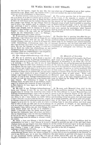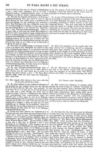 TE WAKA MAORI O NIU TIRANI. 137 uru mai hei kai korero ; engari he mea tika kia whiriwhiria e nga Maori nana nga kereme tetahi u ratou ano hei kai whakahaere i a ratou korero. 45. Ko tenei tekiona e mea ana, kei tana nohoanga ano o te Kooti, ki to mea ra e hiahia ana to nuinga o nga kai-tono kia peratia, me kimi to Kooti kia kitea te rahi o te wahi (kaore ano kia wahia) e tika aua kia riro i runga i nga ritenga me nga tikanga Maori Id tena ki tena o nga tangata nana te whenua; a kei nga peratanga o kore o rehitatia (tuhituhia) nga ingoa o nga tangata nana te whenua Id to kore e matua kite taua rahinga o to wahi ki ia tangata ki ia tangata o ratou, a ko aua wahi mo ata tuhituhi marire me ata whakaatuatu i roto i te Tuhinga- whakamaharatanga take o taua whenua. 46. E mea ana tenei tekiona, kei runga i te whaka- haeretanga o nga tekiona kua tuhia, ki runga ako nei, etahi tekiona ranei ki muri iho mo nga tikanga wawahi whenua, o ahei ano to Kooti ki te tango mai i etahi whakaritenga, whakaaetanga ranei, kua oti ake i nga kai-tono mo a ratou hoa tautohe i roto i a ratou ake ano hei tikanga mo ratou ; a o ahei ana, ano te Kooti kia waiho aua whakaritenga me aua whakaaetanga kia whai tikanga ana i roto i toua kupu whakatau i etahi atu whakawakanga o aua tangata ra ano i taua taima ra ano, i muri iho ranei. (2.) Nga tuhinga-whakamaharatanga take whenua 47. Kia oti te whakawa ma to Kooti o mea kia tuhia ki te Kooti Rouru he Tuhinga-whkamahara- tanga take, pera mo te Ahua Nama 1 i te korero Apiti i te mutunga o te Ture, me tuhi ki roto ki Iaua Tuhinga te ingoa mo etahi kupu whakaatu i te ahua o te whenua, me nga ingoa o nga tangata kai oa nana taua whenua, nga tangata ranei e ki ai na ratou taua whenua i runga i a ratou whakaritenga ake ano kia korerotia ki runga ake ra (tekiona 40), me nga ingoa o a ratou hapu ; tetahi, ki to mea e hiahia aua te nuinga o nga tangata nana to whenua kia peratia, me tuhi ano ki roto ki taua Tuhinga-whakamaharatanga te rahi o te wahi ma tena ma tena onga tangata nana taua whenua. Mo whakaahua ki runga ki aua Tuhinga katoa, me apiti ranei ki aua Tuhinga, tetahi mapi o te whenua kua korerotia Id roto, a me tuhi e te Kai-whakawa ki tona ingoa me huri hoki ki te hiiri o te Kooti. 48. Me apiti ki aua Tuhinga-whakamaharatanga katoa enei tikanga Id raro iho na, ara ;—ko nga tangata nana te whenua kua korerotia, i roto i taua Tuhinga-whakamaharatanga e kore e ahei te hoko to tuku pehea atu ranei i taua whenua, engari o ahei ano ratou te reti i taua whenua mo tetahi takiwa e kore o hira atu i te rua te kau ma tahi tau ; engari, te tikanga o taua roti hei nohoanga tonutanga ia mo to tangata i a ia te reti i to wa ano e retia ai, e kore o tika he riihi o ki ana me taka mai ki a ia te whenua a te wa e mutu ai tetahi atu roti e mana ana ki tetahi atu tangata i taua takiwa ano, ara toua tikanga, kia mutu marire tetahi roti ka tika ai te whakarite i tetahi; e kore hoki e tika kia homai wawe he moni hei mea kia whakaaetia taua reti, e kore ano hoki e tika he whakaritenga i roto i te riihi kia whakahoutia te reti me ka taea te mutunga o te takiwa i retia ai, he whakaritenga ranei kia hokona to whenua i totahi atu takiwa. 49. Otira, e kore aua tikanga e kiia hei tikanga whakakahore i te hoko o taua whenua ki te mea e whakaae katoa ana nga tangata nana taua whenua ki te hoko, hei whakakahoretanga ranei i te wahanga o taua whenua i runga i nga tikanga o te Ture, mehemea e hiahiatia ana kia pera. 50. Ko te kupu whakatau a te Kooti i runga i nga whakawakanga kereme katoa me hohoro te panui Id roto ki nga Kahiti, pera me te mea kua whakaritea mo nga panuitanga kereme (tekiona 36), a ko nga tangata e whakataua ai e te Kooti to whenua ki a may select one of themselves to act as their spokes- man and conduct the case in their behalf. 45. This section provides that at the same sitting of the Court, if the majority in number of the claimants shall so desire it, the Court shall ascertain the amount of the proportlonate undivided share that each owner of such laud is entitled to according to Native custom and usage ; and in any such case the names of such owners are not to be registered until such amount bo ascertained, which amount shall be clearly set forth in the Memorial of Owner- ship of the land. 46. Provides that in carrying into effect the pre- ceding sections, or any subsequent sections regarding partitions of land, the Court may adopt any arrange- ments made by the claimants and couuter-claimants amount themselves, and the Court may make such arrangement an element ill its determination of any concurrent or subsequent case between the same parties (2.) Memorials of Ownership. 47. After the completion of the inquiry, the Court shall cause to be inscribed on the Court Rolls a Memorial of Ownership in the Form No. 1 of the Schedule to the Act, giving the name and description of the laud, the names of all the owners thereof, or who aro to bo regarded as owners under any arrange- ment amongst themselves as before mentioned, and of their respective hapu ; and also, if required by the majority in number of the owners, the amount oi the proportionate share of each owner. Every such Memorial must have (drawn thereon or annexed thereto a plan of the land comprised therein, and must bo signed by the Judge and scaled with the Seal of the Court. 4S. To every such Memorial there shall be the following conditions annexed, viz.: that the owners of the laud referred to in such Memorial have not power to sell or otherwise dispose of the said land, except that they may lease the same for any term not exceeding twenty-one years ; but such lease must be in actual possession, and not to come into posses- sion of the lessee at the expiration of any then existing lease to any other person, and there must bo no premium or foregift, or any agreement or covenant for renewal or ior purchase at a future time. 49. But nothing in the above conditions shall be deemed to preclude any sale of the said land where all t