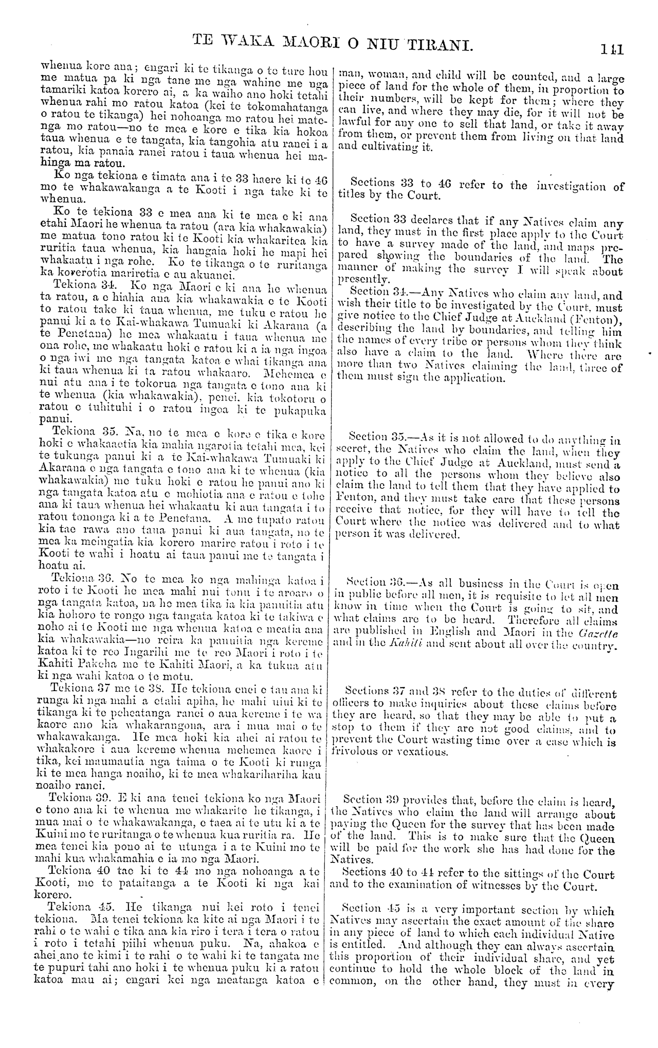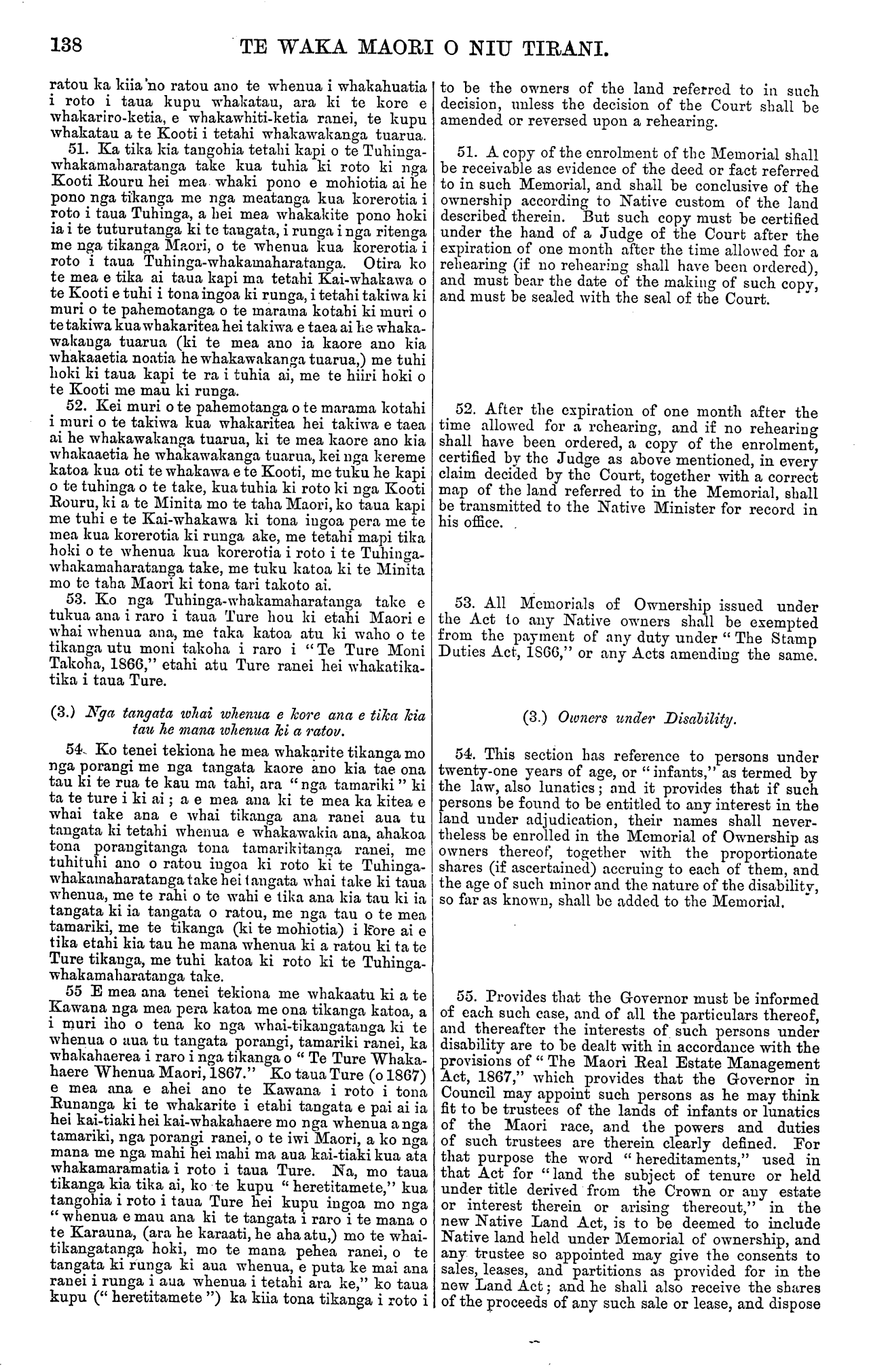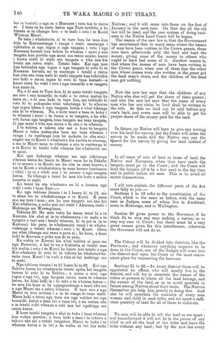1-1.0 TE WAKA MAORI O NIU TIRANI. hei te tuatahi o nga ra o Hanuere i tera tau to mana ai. I taua ra ka mate katoa nga Ture tawhito, a ka timata ai te tikanga hou o to mahi i roto i te Kooti Whenua Maori. Te take i whakaturia ai to ture hou he mea kua kite te Kawanatanga i runga i etahi meatanga i tuhituhia ai nga ingoa o.nga tangata i roto inga Karauna karaati kua hokoa te whenua i muri e aua tangata kua puritia nga moni ma ratou anake, kaore i hoatu etahi ki etahi atu tangata e tika ana kia I hoatu ma ratou etahi. Tetahi take. Kei nga mea kua tuhituhia nga ingoa o nga tangata ki roto ki te Karauna karaati, no te matenga o tetahi o ratou kua riro atu tona wahi ki etahi .tangata kua tuhituhia ano hoki o ratou ingoa ki roto ki taua karaati—a kaore rawa he wahi i riro i nga tamariki o te tangata kua mate ra. Na, e ki ana te Ture hou, ki te mate tetahi tangata me riro i ona tamariki te wahi o to ratou matua ka mate ra ; e ki ana hoki te ture hou, me tuhituhi ki roto ki to pukapuka whai taketanga ki te whenua nga ingoa katoa o nga tangata katoa e whai tikanga ana ki te whenua. Na, e kore tenei e taea te hoko i te whenua i muri i te tuara o te tangata, a ka whi- whi katoa nga tangata, tena tangata me tena tangata, ki nga moni e tika aua mana o to utu o te whenua. I te takiwa e takoto ake nei e kore te tangata Maori o tuku pukapuka here mo tona whenua i runga i te ruritanga (ara he mokete, ho aha atu) ; engari ma te Kooti e whakarite kia ruritia te whenua, a ma te Maori nana te whenua e utu te ruritanga ki a te Kuini ki tetahi wahi whenua hei whakarite mo te moni. Kei nga hokonga whenua mo nga riihitanga whenua katoa ka haere to Maori raua ko te Pakeha ki te aroaro o to Kooti, mo ka rite ta raua korero, a ma te Kooti o whakatuturu ta raua korero (mehemea i tika) i te ra e whiti ana i to aroaro o nga tangata katoa. Te tikanga o tenei he mea kia kore o mahia hunatia te mahi. Ko tenei ka ata whakaatu au ki a koutou nga wahi i roto i taua Ture ;— Ko nga tekiona timata i to 1 haere ki to 19, mo te ahua mo te whakaturanga o te Kooti. E pena ano me tera i mua; ara ko aua tangata nei ano hei Kai-whakawa, e noho mai nei etahi i Akarana, etahi i Hokianga mo Werengitana. Tekiona 20. He mea tuku he mana tenei ki a te Kawana kia ahei ai ia te whakamutu i te mahi a te tangata e ruri ana i tetahi whenua, ki te pai ia (a to Kawana) kia pera, te whakamutu ranei i te whaka- wakanga o tetahi whenua i roto i to Kooti. Otira me whai tikanga nui rawa e pera ai; ka kore, e kore hoki te Kawana e poka noa ki te pera. Ka wahia to Koroni kia whai takiwa ai pera me nga Porowini, a kei te wa e hiahiatia ai tetahi mea kia mahia i roto i te Kooti ka haere mai tetahi o nga Kai-whakawa ki roto ki te takiwa ka whakatuwhe- ratia tona Kooti i te wahi e tika ai hei mahinga me te mahi. Nga tekiona timata i te 2 1 haere ki te 32. Kei nga Takiwa katoa ka whakaturia tetahi apiha hei tangata tumau ki roto ki te Takiwa ; a mana e uiui nga ingoa o nga iwi, nga tangata ranei, nana te whenua katoa, ka kimi hoki ia i to rahi o te whenua katoa— he mea kia kore ai he ngangaretanga a muri ake nei a nga Maori mo a ratou whenua. E taea ano e nga Maori te tino awhina i a ia ki runga ki taua mahi Mana hoki e tatau nga tane me nga wahine me nga tamariki katoa o tena iwi o tena iwi, a ka wehea atu e ia tetahi wahi whenua e rahi ana hei ngakinga ma ratou katoa. E kore tetahi tangata e ahei te hoko i taua whenua kua wehea peratia; e kore hoki e taea i te takiwa e takoto ake nei o tetahi rangatira Maori te hoko i te whenua katoa a te iwi a ka waiho te iwi kia noho Natives ; and it will come into force on the first of January in the next year. On that day all the old law will be dead, and the new system of doing busi- ness in the Native Land Court will be begun. The reason of the new law is, that the Government has ascertained that in many cases where the names of men have been written in the Crown grants, these men have afterwards sold the land and kept the money, giving none of the money to others who ought to have had some of it. Another reason is, that where the names of men have been written in the Crown grant, when one of them dies the other men whoso names were also written in the grant got the dead man's share, and the children of the dead man got nothing. Now the new law says that the children of any Native who dies will get the share of their parent; and also the new law says that the name of every man who has any claim to land shall be written in the title. So that no land can be sold behind any u one's back, and every man will be able to get his proper share of the money paid for the land. In future, no Native will have to give any writing over his land for survey, but the Court will order the survey to be made, and the Native can pay the Queen for the survey by giving her land instead of money. In all cases of sale of land or lease of land, the Native and European, when they have made the bargain, must go to the Court; and the Court will bind the bargain (if it bo a fair one) in the day timo and in public before all men. This is to avoid all secret transactions. I will now explain the different parts of the Act more fully to you :— Sections 1 to 19 refer to the constitution of the Court, which is the same as before, with the same men as Judges, some of whom live in Auckland, some in Hokianga, and in Wellington. Section 20 gives power to the Governor, if he think fit, to stop any man making a survey, or to stay any case in Court; but there must be a very great reason given for this interference, otherwise the Governor will not do so. The Colony will bo divided into districts, like the Provinces ; and whenever anything requires to bo done in the Court, one of the Judges will come into the district and open his Court in the most conve- nient place for transacting the business. Sections 21 to 32.—In every district there will bo appointed an officer, who will mostly live in the district, and will try to ascertain the names of the trib