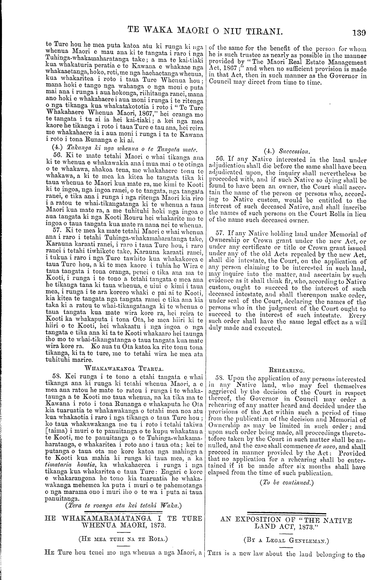 TE WAKA MAORI O NIU TIRANI. 139 te Ture hou he mea puta katoa atu ki runga ki nga whenua Maori e mau ana ki te tangata i raro i nga Tuhinga-whakamaharatanga take; a ma te kai-tiaki kua whakaturia peratia e to Kawana e whakaae nga whakaaetanga, ho ko, reti, me nga haehaetanga whenua, kua whakaritea i roto i taua Ture Whenua hou; maua hoki e tango nga wahanga o nga moni e puta mai ana i runga i aua hokonga, riihitanga ranei, mana ano hoki e whakahaere i aua moni i runga i te ritenga o nga tikanga kua whakatakotoria i roto i " Te Ture Whakahaere Whenua Maori, 1867," hei oranga mo te tangata i tu ai ia hei kai-tiaki; a kei nga mea kaore he tikanga i roto i taua Ture e tau ana, hei reira me whakahaere ia i aua moni i runga i ta te Kawana i ro to i tona Runanga e ki ai. (4.) Takanga ki nga whenua o te Tangata mate. 56. Ki te mate tetahi Maori e whai tikanga ana ki te whenua e whakawakia ana i mua mai o te otinga o te whakawa, ahakoa tena, mo whakahaere tonu to whakawa, a ki te moa ka kitea he tangata tika Id taua whenua te Maori kua mate ra, me kimi to Kooti ki te ingoa, nga ingoa ranei, o te tangata, nga, tangata ranei, e tika ana i runga i nga ritenga Maori kia riro i a ratou te whai-tikangatanga ki te whenua a taua Maori kua mate ra, a me tuhituhi hoki nga ingoa o aua tangata ki nga Kooti Rouru hei whakarite mo te ingoa o taua tangata kua mate ra nana nei te whenua. 57. Ki te mea ka mate tetahi Maori e whai whenua ana i raro i tetahi Tuhinga-whakamaharatanga take, Karauna karaati ranei, i raro i taua Ture hou, i raro ranei i tetahi tiwhikete take, Karauna karaati ranei, i tukua i raro i nga Ture tawhito kua whakakorea e taua Ture hou, a ki te mea kaore i tuhia ho Wira e taua tangata i toua oranga, penei e tika ana ma te Kooti, i runga i te tono a tetahi tangata o mea ana he tikanga tana ki taua whenua, e uiui e kimi i taua mea, i runga i te ara korero whaki e pai ai te Kooti, kia kitea te tangata nga tangata ranei e tika ana kia taka ki a ratou te whai-tikangatanga ki to whenua o taua tangata kua mate wira kore ra, hei reira te Kooti ka whakaputa i tona Ota, he mea hiiri ki te hiiri o te Kooti, hei whakaatu i nga ingoa o nga tangata e tika ana ki ta te Kooti whakaaro hei taunga iho mo te whai-tlkangatanga o taua tang.ata kua mate wira kore ra. Ko aua tu Ota katoa ka rito tonu toua tikanga, ki ta te ture, me to tetahi wira he mea ata tuhituhi marire. WHAKAWAKANGA. TUARUA. 58. Kei runga i te tono a etahi tangata e whai tikanga ana ki runga ki tetahi whenua Maori, a e mea ana ratou he mato to ratou i runga i to whaka- taunga a te Kooti me taua whenua, na ka tika ma te Kawana i roto i tona Runanga o whakaputa he Ola kia tuaruatia te whakawakanga o totahi mea noa atu kua whakaotia i raro i nga tikanga o taua Ture hou ; ko taua whakawakanga me tu i roto i tetahi takiwa [taima) i muri o to panuitanga o te kupu whakatau a te Kooti, me to panuitanga o to Tuhinga-whakama- haratanga, e whakaritea i roto ano i taua ota; kei te putanga o taua ota me kore katoa nga mahinga a te Kooti kua mahia ki runga ki taua mea, a ka timataria houtia, ka whakahaerea i runga i nga tikanga kua whakaritea e taua Ture : Engari e kore e whakarangona ho tono kia tuaruatia he whaka- wakanga mehemea ka puta i muri o te pahemotanga o nga marama ono i muri iho o te wa i puta ai taua panuitanga. (Tera te Toanga atu kei tetahi Waka.) HE WHAKAMARAMATANGA I TE TURE WHENUA MAORI, 1873. (HE MEA TUHI NA TE ROIA.) HE Ture hou tenei mo nga whenua a nga Maori, a of the same for the benefit of the person for whom he is such trustee as nearly as possible in the manner provided by "The Maori Real Estate Management Act, 1867 ;" and vvhen no sufficient provision is made in that Act, then in such manner as the Governor in Council may direct from time to time. (4.) Succession. 56. If any Native interested in the laud under adjudication shall die before the same shall have been adjudicated upon, the inquiry shall nevertheless bo proceeded with, and if such Native so dying shall be found to have been an owner, the Court shall ascer- tain the name of the person or persons who, accord- ing to Native custom, would bo entitled to the interest of such deceased Native, and shall inscribe the names of such persons; on the Court Rolls in lieu of the name such deceased owner. 57. If any Native holding land under Memorial of Ownership or Crown grant under the new Act, or under any certificate or title or Crown grant issued under any of the old Acts repealed by the now Act, shall die intestate, the Court, on the application of any person claiming to be interested in such land, may inquire into the matter, and ascertain by such evidence as it shall think fit, who, according to Native custom, ought to succeed to the interest of such deceased intestate, and shall thereupon mako order, under seal of the Court, declaring the names of the persons who in the judgment of the Court ought to succeed to the interest of such intestate. Every such order shall have the same legal effect as a will duly made and executed. REHEARING. 38. Upon the application of any persons interested in any Native land, who may feel themselves aggrieved by the decision of the Court in respect thereof, the Governor in Council may order a rehearing of any matter heard and decided under the provisions of the Act \\vithin such a period of time from the publication of the decision and Memorial of Ownership as may be limited in such order ; and upon such order being made, all proceedings thereto- tofore taken by the Court in such matter shall be an- nulled, and the case shall commence de novo, and shall proceed in manner provided by the Act: Provided that no application for .1 rehearing shall bo enter- tained if it be made after six months shall have elapsed from the time of such publication. (To be continued.) AN EXPOSITION OF "THE NATIVE LAND ACT, 1873." (By A LEGAL GENTLEMAN.) This is a now law about the laud belonging to the