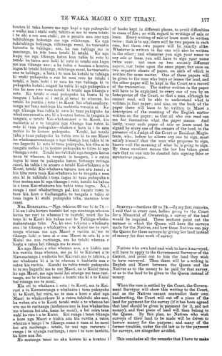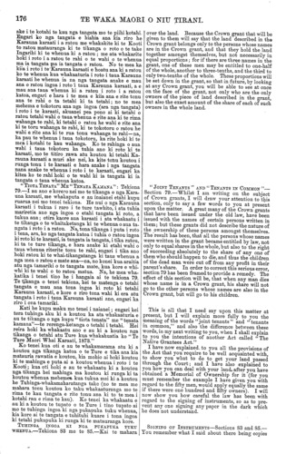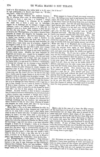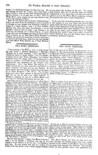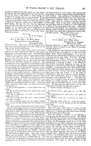 TE WAKA MAORI O NIU TIRANI. 181 kua kore e mohio ki ena kupu katoa—no nga matua te tikanga, tuku iho ki nga tamariki pai tonu te ahua. Ko te pai tenei o nga Maori o tenei kainga ko te kaha ki te karakia i nga ra i nga po katoa. E rua karakia o te ra kotahi, ko to te po ka toru ai. Kaore e tata mai tenei kai te waipiro, ka whitu pea nga tau e mahue ana taua kai i a ratou, ara i nga tangata o tenei kainga. Ko nga ture hei whiu mo nga mea kino, hei pehi hoki, kua tu, ara mo te kanga, mo te puremu, mo te korero teka, mo te ringa pa ki te wahine, mo nga mea kino katoa, e meatia ana kia araia atu kia kaua e puta mai ki o ratou rohe katoa. Heoi taku korero. Na to hoa. Na N. W. PAETAI. Ki a te Kai Tuhi. o Te Waka Maori. Hotereni Taone wahi o Hauraki, Oketopa 16, 1873. E HOA tena koe. Tenei taku reta ka tukua atu ki a koe, mau e uta atu ki runga ki to tatou waka, me ho mea e watea ana he takotoranga. E hoa ko te take o tenei reta i tuhia ai he titiro naku ki to mate o o tatou hoa Maori e noho ana ki nga taone, ki nga wahi tutata ranei. Ko tenei mate e kitea atu ana e ahau o hara no ratou, engari na taua i hoatu tenei mate mo ratou. Koia tenei he kai- ponu no taua ki te tuku atu ki a ratou nga ture a te Pakeha e whai tikanga, ana mo nga taone, kia tuhia hoki ki to reo Maori kia marama ai o tatou hoa. Ka nui hoki taku titiro ki nga Maori o tenei takiwa e hara tonu ana ki nga ture Pakeha, a kawea aua. ki te wha- kawa, a meinga ana e to Kaiwhakawa kia utu ; e hara i te mea he kino no ratou i he ai,; engari ho kuare, no reira ka hara kau noa iho, kaore ratou e mohio e ho ana te mahi e mahi nei ratou. Haunga ra ia te haurangi, e mohiotia ana te ture mo tena—he whaka- matautau tonu na etahi o nga Maori i mohio ai ratou ki te ture mo tena. Otira tena ano etahi ture e mana ana i roto i nga taone, kaore rawa e mohiotia o nga tangata Maori. No te paanga o to hara ki a ratou katahi ratou ka mohio, he ture ano tenei! Koia enei etahi o nga mea e noho kuaro nei ratou ki nga ture mo aua mea:— I. Ko te whakaomaoma i o ratou hoiho i roto i te taone. II. Ko te whiu i nga hoiho, kau, poaka ranei, i nga taha taha o te rori. III. Ko to whaka-api i te taha o te rori Id to taonga, aha ranei. IV. Ko te hoiho, kau, aha ranei, e haero noa iho ana i roto i te taone. V. Ko te puhanga manu—ko nga manu e tiakina ana e te ture, me nga marama tika hei puhanga i aua mana. VI. Ko te timere o tetahi whare ana ka wera i to ahi. Otira he maha nga ture mo nga mea penei e mohiotia ana e taua, ko nga Maori kaore e mohio, engari mo to ratou hara ki tetahi o aua ture katahi ratou ka mohio, he ture ano tenei! Na e hoa, e te Kai Tuhi, ki taku whakaaro he mea he tenei na taua ki nga tangata Maori. Engari kia matua whakamaramatia atu nga ture ki a ratou Id to ratou reo nei ano, a Id te hara ratou i muri, na ratou tena. Ara he mea pai ma te Kawana- tanga e whakahau nga ture katua kia tuhia ki te reo Maori ka tuku mai ai ki te tari a te Kai-whakahaere mo te taha Maori o ia takiwa ki reira takoto ai hei titiro ma nga tangata Maori katoa o tera takiwa—a e -pai ana ano hoki te tuku mai ki nga rangatira o nga iwi ma ratou e panui atu ki ona tangata. Ko nga ture i tuhia Id te reo Maori i mua ai, he mea tika ki nga Kai-whakawa Maori anake. Kua kore e mana etahi o aua ture tawhito inaianei; engari kua hanga e te Paremete he ture hou, a e hanga tonu nei. Na, ka nui te pai kia panuitia ki nga reo e rua nga ture penei katoa, ana ka hanga e to Paremete, kia tika ai are unaccustomed to such words ; their parents are respectable, and their respectability has descended to their children. The excellence of the Maoris of this place consists in their earnest piety, and regular per- formance of religious duties every day and every night. They have two services every day, and one every night. They do not drink spirituous liquors, nor have they done so, I believe, for seven years past —that is to say, the people of this place. They have laws for the punishment and suppression of various offences, such as swearing, lying, fornication, adultery, and other vices, which they are anxious to keep with- out their borders. This is all I have to say. From your friend, N. W. PAETAI. To the Editor of the Waka Maori. Shortland Town, Hauraki, 16th October, 1873. FRIEND—Greeting,—I beg to request that you will take this letter on board of our Waka, if you have stowage room for ir. I am induced to write this letter because I see that our Native friends who reside in or near our towns labour under certain disadvantages. It is an evil which docs not proceed from themselves, but from us —we have put it upon them. It is this. We have neglected to give them in their own language the laws appertaining to towns, so that they may know clearly what is required of them. I see Maoris of this district continually breaking the laws of the Pakeha, for which they are taken before a Magistrate and fined; not because they have been guilty of any wilful wrong, but simply because they were ignorant of what the law was, and were unaware that what they were doing was wrong. I do not refer to drunkenness ; they know the law against drunken- ness—some of them have tried it so often that they are pretty well acquainted with it. But there are other laws in force in towns, in respect of which the Natives aro totally ignorant. It is only when they break some law that they become aware of its exist- ence. The following aro some matters of the laws respecting which they aro ignorant, namely:— 1. Furious riding or driving in towns. II. Driving horses, oxen, pigs, &c., on the side paths. HI. Obstructing the road paths with goods or other matters. IV. Horses, oxen, &c., wandering at large in towns. V. Shooting birds which aru under the protec- tion of the law; and the proper mouths for shooting such birds. VI. Chimneys ou fire. There are many other laws Ior things of this nature with which we aro familiar, but of which the Maoris know nothing until they break them, and then they find them