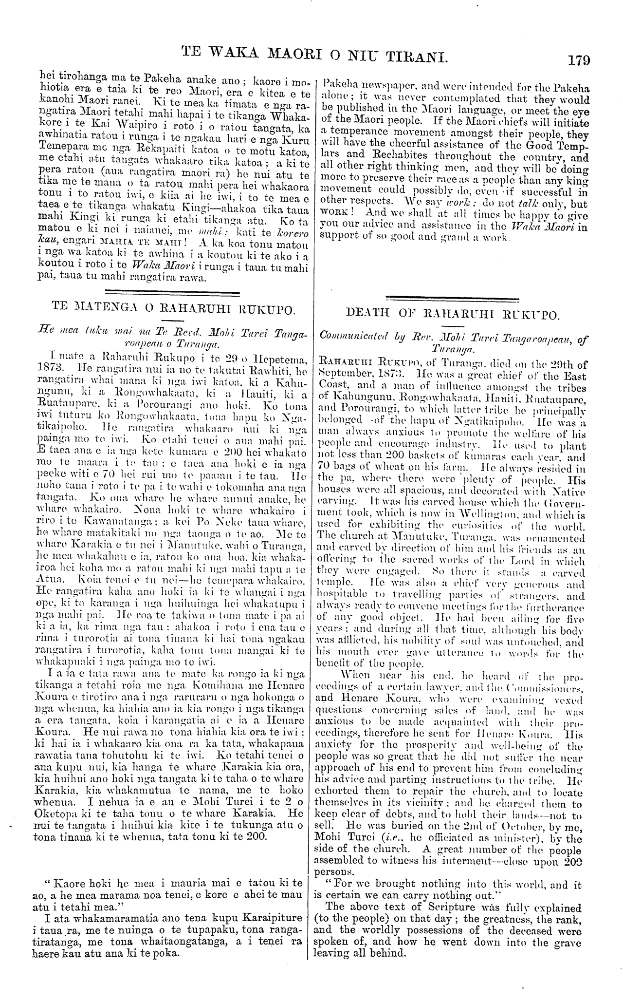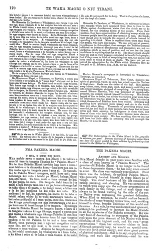 TE WAKA MAORI O NIU TIRANI. KO TE TIKA, KO TE PONO, KO TE AROHA." VOL. 9.] PO NEKE, WENEREI, TIHEMA 10, 1873. [No. 19. HE KUPU WHAKAATU KI NGA HOA TUHI MAI. He moni kua tae mai: £ s. ' d. 1873-74 Remi Te Tai Papahia o Hoki- anga, (No. 15, 1873.) ... O 10 O " John A. Field, o Waitotara, Whanganui (No. 19, 1873.) O 10 O 1873.—Wiremu Kerei o Amuri, Bluff, Marlborough ... ... O IO O " Tiakapu, Amuri Bluff, Marl- borough ... ... ... O IO O 1873-74.—Keita Kerei, Bluff, Marl- borough, (No. 19, 1873) ... O 10 O " Ani Pati, Bluff, Marlborough (No. 19, 1873) ... ... O 10 O " David Hughey, o Pokitana, Manawatu (No. 15, 1873) O 10 O " A. S. Allen, te Hupirimi Kooti, Werengitana (No. 15, 1873) ... ... ... O 10 O 1873.—Meiha Rapata Wahawaha, Tu- ranganui ... ... ... O 10 O 1874.—Meiha Rapata Wahawaha, Tu- ranganui ... ... ... O 10 O 1873-74—Ropata Paratini, M.P.C., Whanganui (Nama 15, 1873) ... ... ... O 10 O £5 10 O Kua tae mai ki a matou te reta a Henere Pangopango o Tangoio, Nepia. Me tuku e ia to 10s. ki te Kai Tuhi ki Po Neke nei. Ko Te Aho-o-te Rangi, he Hau Hau no Waikato, e ki mai ana kua ki nga Maori o Tauranga he iwi kohuru a Waikato, koia ra tona take i piri ai ki a te Kuini hei hapai i a to Kuini. A, e mea ana ki tana whakaaro kaore te Kuini e hiahia ana ki a ratou hei kai hapai i a ia, he nui hoki ona tangata Pakeha. Kua mate nga tarutaru o Niu Tirani i nga tarutaru a te Pakeha i kawea mai e ia; kua ngaro nga manu mo nga kiore o Niu Tirani, kua kapi tona turanga i a te Pakeha ; a ko nga tangata Maori me nga mea katoa atu o uta nei e whakangarongaro ana ano i te aroaro o te Pakeha, Kua tukua atu ki a Tuhakaraina o Waikato to Nama 13 me te 14 o te Waka i tono mai ua e ia. Ko tetahi atu pea tangata kai te tango i ana "nupepa, no te mea kua kawea rawa ano ki te meera ki Po Neke nei. Ko M. Mullooly o Uawa e tono ana kia tukua atu e matou kia toru ahua " wira" ki te reo Maori, hei te mea tuhi ki te kiri hipi. Me tono taua tangata, ki tetahi roia. Ko Maaka Pukeko o Otaki me tuku ki nga nupepa Pakeha tona panui mo te hoiho haere noa e noho ana i a ia. E ki ana NOTICES AND ANSWERS TO CORRESPONDENTS. Subscriptions received :— £ s. d. 1873-74.—Remi To Tai Papahia of Hoki- anga (No. 15, 1873) ... O 10 O " John A. Field, of Waitotara, Whanganui (No. 19, 1873) O 10 O 1873—William Kerei, of Amuri Bluff, Marlborough ... ... ... O IO O " Tiakapu, of Amuri Bluff, Marl- borough ... ... ... O IO o 1873-74.—Keita Kerei, of Amuri Bluff, Marlborough (No. 19, 1873). O 10 O " Ani Pati, of Amuri Bluff, Marl- borough (No. 19, 1873) ... O 10 O " David Hughey, Esq., of Foxton (No. 15, 1873) ... ... O 10 O " A. S. Allen, Esq., Registra Su- preme Court, Wellington. (No. 15, 1873) ... ... O 10 O 1873.—Major Ropata Wahawaha, Tura- nganui ... ... ... ... O 10 O 1874.—Major Ropata Wahawaha, Tura- nganui ... ... ... ... O 10 O 1873-74.— Robert Pharazyn, Esq., M.P.C., Whanganui (No. 15, 1873) O 10 O £5 10 O We have received the letter of Henry Pangopango, of Ta- ngoio, Napier. he can send the 10s. to the Editor at Wel- lington. Te Aho-o-te-Rangi, .1 Waikato Hauhau, says the Natives of Tauranga charge the Waikatos with being a murderous people, and give that as a reason why they (the Tauranga Natives) support the Queen. He thinks the Queen does not require their support, having plenty of Pakeha subjects. The indi- genous plants and vegetation of New Zealand have disappeared before the exotics introduced by the Pakeha; the Native birds and rats have disappeared and have been replaced by those of the Pakeha; and the Native inhabitants, and all other Native things, are disappearing in like manner before the Pakeha. Nos. 13 and 14 of the Waka have been sent to Tuhakaraina, of Waikato, as requested. Some other person must have got his papers from the post office, as they were certainly posted in Wellington. M. Mullooly, of Tolago Bay, asks us to send him three forms of wills on parchment, in the Maori language, for certain Natives. Apply to-any lawyer. Maaka Pukeho, of Otaki, must advertise in the European newspapers respecting the stray horse he has in his possession,