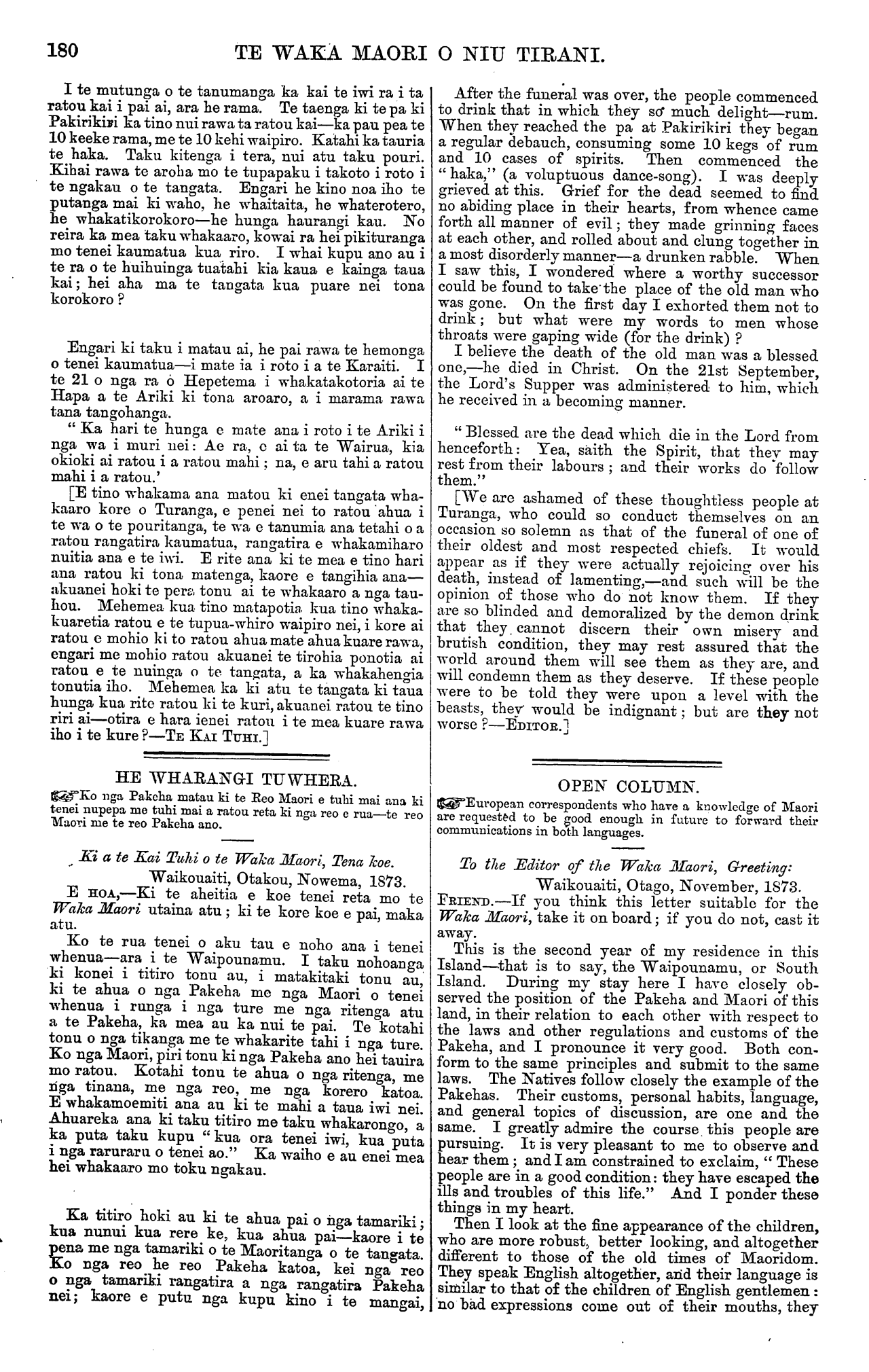 180 TE WAKA MAORI O NIU TIRANI. I te mutunga o te tanumanga ka kai te iwi ra i ta ratou kai i pai ai, ara he rama. Te taenga ki te pa ki Pakirikiri ka tino nui rawa ta ratou kai—ka pau pea te 10 keeke rama, me te 10 kehi waipiro. Katahi ka tauria te haka. Taku kitenga i tera, nui atu taku pouri. Kihai rawa te aroha mo te tupapaku i takoto i roto i te ngakau o te tangata. Engari he kino noa iho te putanga mai ki waho, he whaitaita, he whaterotero, he whakatikorokoro—he hunga haurangi kau. No reira ka mea taku whakaaro, kowai ra hei pikituranga mo tenei kaumatua kua riro. I whai kupu ano au i te ra o te huihuinga tuatahi kia kaua e kainga taua kai; hei aha ma te tangata kua puare nei tona korokoro ? Engari ki taku i matau ai, he pai rawa te hemonga o tenei kaumatua—i mate ia i roto i a te Kararti. I te 21 o nga ra 6 Hepetema i whakatakotoria ai te Hapa a te Ariki ki tona aroaro, a i marama rawa tana tangohanga. " Ka hari te hunga o. mate ana i roto i te Ariki i nga wa i muri nei: Ae ra, e ai ta te Wairua, kia okioki ai ratou i a ratou mahi; na, e aru tahi a ratou mahi i a ratou.' [E tino whakama ana matou ki enei tangata wha- kaaro kore o Turanga, e penei nei to ratou ahua i te wa o te pouritanga, te wa e tanumia ana tetahi o a ratou rangatira kaumatua, rangatira e whakamiharo nuitia ana e te iwi. E rite ana ki te mea e tino hari ana ratou ki tona matenga, kaore e tangihia ana— akuanei hoki te pera tonu ai te whakaaro a nga tau- hou. Mehemea kua tino matapotia, kua tino whaka- kuaretia ratou e te tupua-whiro waipiro nei, i kore ai ratou e mohio ki to ratou ahua mate ahua kuare rawa, engari me mohio ratou akuanei te tirohia ponotia ai ratou e te nuinga o te tangata, a ka whakahengia tonutia iho. Mehemea ka ki atu te tangata ki taua hunga kua rito ratou ki te kuri, akuanei ratou te tino riri ai—otira e hara ienei ratou i te mea kuare rawa iho i te kure ?—TE KAI TUHI.] HE WHARANGI TU WHERA. Ko nga Pakeha matau ki te Reo Maori e tuhi mai ana ki t.enei nupepa me tuhi mai a ratou reta ki nga reo e rua—te reo Maori me te reo Pakeha ano. Ki a te Kai Tuhi o te Waka Maori, Tena koe. Waikouaiti, Otakou, Nowema, 1873. E HOA,—Ki te aheitia e koe tenei reta mo te Waka Maori utaina atu ; ki te kore koe e pai, maka atu. Ko te rua tenei o aku tau e noho ana i tenei whenua—ara i te Waipounamu. I taku nohoanga ki konei i titiro tonu au, i matakitaki tonu au, ki te ahua o nga Pakeha me nga Maori o tenei whenua i runga i nga ture me nga ritenga atu a te Pakeha, ka mea au ka nui te pai. Te kotahi tonu o nga tikanga me te whakarite tahi i nga ture. Ko nga Maori, pin tonu ki nga Pakeha ano hei tauira mo ratou. Kotahi tonu te ahua o nga ritenga, me nga tinana, me nga reo, me nga korero katoa. E whakamoemiti ana au ki te mahi a taua iwi nei. Ahuareka ana ki taku titiro me taku whakarongo, a ka puta taku kupu "kua ora tenei iwi, kua puta i nga raruraru o tenei ao." Ka waiho e au enei mea hei whakaaro mo toku ngakau. Ka titiro hoki au ki te ahua pai o nga tamariki; kua nunui kua rere ke, kua ahua pai—kaore i te pena me nga tamariki o te Maoritanga o te tangata. Ko nga reo he reo Pakeha katoa, kei nga reo o nga tamariki rangatira a nga rangatira Pakeha nei; kaore e putu nga kupu kino i te mangai, After the funeral was over, the people commenced to drink that in which they so" much delight—rum. When they reached the pa at Pakirikiri they began a regular debauch, consuming some 10 kegs of rum. and 10 cases of spirits. Then commenced the "haka," (a voluptuous dance-song). I was deeply grieved at this. Grief for the dead seemed to find no abiding place in their hearts, from whence came forth all manner of evil; they made grinning faces at each other, and rolled about and clung together in a most disorderly manner—a drunken rabble. When I saw this, I wondered where a worthy successor could be found to take the place of the old man who was gone. On the first day I exhorted them not to drink; but what were my words to men whose throats were gaping wide (for the drink) ? I believe the death of the old man was a blessed ono,—he died in Christ. On the 21st September, the Lord's Supper was administered to him, which he received in a becoming manner. " Blessed are the dead which die in the Lord from henceforth: Yea, saith the Spirit, that they may rest from their labours ; and their works do follow them." [We are ashamed of these thoughtless people at Turanga, who could so conduct themselves on an occasion so solemn as that of the funeral of one of their oldest and most respected chiefs. It would appear as if they were actually rejoicing over his death, instead of lamenting,—and such will be the opinion of those who do not know them. If they are so blinded and demoralized by the demon drink that they. cannot discern their own misery and brutish condition, they may rest assured that the world around them will see them as they are, and will condemn them as they deserve. If these people were to be told they were upon a level with the beasts, they would be indignant; but are they not worse ?—EDITOR.] OPEN COLUMN. European correspondents who have a knowledge of Maori are requested to be good enough in future to forward their communications in both languages. To the Editor of the Waka Maori, Greeting: Waikouaiti, Otago, November, 1873. FRIEND.—If you think this letter suitable for the Waka Maori, take it on board; if you do not, cast it away. This is the second year of my residence in this Island—that is to say, the Waipounamu, or South Island. During my stay here I have closely ob- served the position of the Pakeha and Maori of this land, in their relation to each other with respect to the laws and other regulations and customs of the Pakeha, and I pronounce it very good. Both con- form to the same principles and submit to the same laws. The Natives follow closely the example of the Pakehas. Their customs, personal habits, language, and general topics of discussion, are one and the same. I greatly adm