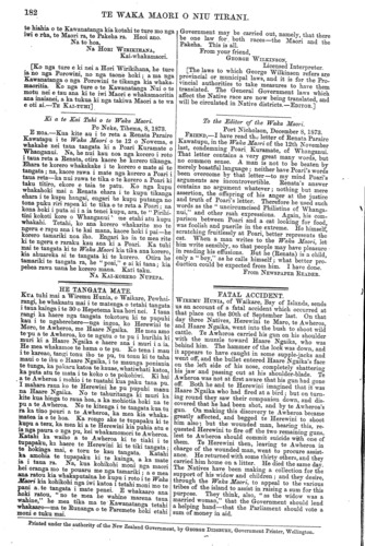 182 TE WAKA MAORI O NIU TIRANI. te hiahia o te Kawanatanga kia kotahi te ture mo nga iwi e rua, te Maori ra, te Pakeha ra. Heoi ano. Na to hoa, Na HOEI WIRIKIHANA, Kai-whakamaori. [Ko nga ture e ki nei a Hori Wirikihana, he ture ia no nga Porowini, no nga taone hoki; a ma nga Kawanatanga o nga Porowini te tikanga kia whaka- maoritia. Ko nga ture o te Kawanatanga Nui o te motu nei e tau ana ki te iwi Maori e whakamaoritia ana inaianei, a ka tukua ki nga takiwa Maori a te wa e oti ai.—TE KAI-TUHI] Ki a te Kai Tuhi o te Waka Maori. Po Neke, Tihema, 8, 1873. E HOA.—Kua kite au i te reta a Renata Paraire Kawatapu i te Waka Maori o te 12 o Nowema, e whakahe nei taua tangata ki a Poari Kuramate o Whanganui. Na, he nui kau noa nga korero i roto i taua reta a Renata, otira kaore he korero tikanga. Ehara te korero whakakake i te korero e mate ai te tangata; na, kaore rawa i mate nga korero a Poari i taua reta—ka nui rawa te tika o te korero a Poari ki taku titiro, ekore e taia te patu. Ko nga Kupu whakahoki mai a Renata ehara i te kupu tikanga ehara i te kupu hangai, engari he kupu putanga no tona puku riri rapea ki te tika o te reta a Poari; na kona hoki i puta ai i a ia tenei kupu, ara, te " Pirihi- tini kokoti kore o Whanganui'' me etahi at.u kupu whakahi. Tetahi, ko ana korero whakarite mo te ngeru e rapu ana i te kai mana, kaore hoki i pai—he korero tamariki noa iho. Engari ko ia te mea rite ki te ngeru e raraku kau ana ki a Poari. Ka tuhi mai te tangata ki te Waka Maori kia tika ana korero, kia ahuareka ai te tangata ki te korero. Otira he tamariki te tangata ra, he "poai," e ai ki tana; kia pehea rawa nana he korero mana. Kati taku. NA KAI-KORERO NUPEPA. HE TANGATA MATE. KUA tuhi mai a Wiremu Hunia, o Waikare, Pewhai- rangi, he whakaatu mai i te matenga o tetahi tangata i taua kainga i te 30 o Hepetema kua hori nei. I taua rangi ka haere nga tangata tokotoru ki te pupuhi kau i te ngaherehere—nga ingoa, ko Herewini te Moro, te Awheroa, me Haare Ngaika. He mea amo te pu a te Awheroa, ko te ngutu o te pu i hurihia ki muri ki a Haare Ngaika e haere ana i muri i a ia. He mea whakamoe te hama o te pu. Ko tena i mau i te kareao, tangi tonu iho te pu, tu tonu ki te taha maui o te ihu o Haare Ngaika, i te maunga poniania te tunga, ka pakaru katoa te kauae, whatiwhati katoa, ka puta atu te mata i te koko o te pokohiwi. Ki hai a te Awheroa i mohio i te tuatahi kua paku tana pu. I mahara raua ko te Herewini he pu pupuhi manu na Haare Ngaika. No te tahuritanga ki muri ka kite kua hinga to raua hoa, a ka mohiotia hoki na te pu a te Awheroa. No te kitenga i te tangata kua tu ra ka tino pouri a te Awheroa, ka mea kia whaka- matea ia e te hoa. Ka rongo ake te tupapaku ki te kupu a tera', ka mea ki a te Herewini kia puhia atu e ia nga paura o nga pu, kei whakamomori te Awheroa. Katahi ka waiho a te Awheroa ki te tiaki i te tupapaku, ka haere te Herewini ki te tiki tangata; te hokinga mai, e toru te kau tangata, Katahi ka amohia te tupapaku ki te kainga, a ka mate ia i taua ra. Na, kua kohikohi moni nga maori hei oranga mo te pouaru me nga tamariki; a e mea ana ratou kia whakaputaina he kupu i roto i te Waka Maori kia kohikohi nga iwi katoa i tetahi moni mo te pani a te tangata i mate penei. E whakaaro ana hoki ratou, "no te mea he wahine marena taua wahine," he mea tika ma te' Kawanatanga tetahi whakaaro—ma te Runanga o te Paremete hoki etahi moni e tuku mai. Government may be carried out, namely, that; there be one law for. both races—the Maori and the Pakeha. This is all. From your friend, GEORGE WILKINSON, Licensed Interpreter. [The laws to which George Wilkinson refers are provincial or municipal laws, and it is for the Pro- vincial authorities to take measures to have them translated. The General Government laws which affect the Native race are now being translated, and will be circulated in Native districts.—EDITOR.] To the Editor of the Waka Maori. Port Nicholson, December 8, 1873. FRIEND,—I have read the letter of Renata Paraire Kawatupu, in the Waka Maori of the 12th November last, condemning Poari. Kuramate, of Whanganui. That letter contains a very great many words, but no common sense. A man is not to be beaten by merely boastful language ; neither have Poari's words been overcome by that letter—to my mind Poari's arguments are incontrovertible Renata's answer contains no argument whatever ; nothing but mere assertion, the offspring of his anger at the justice and truth of Poari's letter. Therefore he used such words as the " uncircumcised Philistine of Whanga- nui," and other rash expressions. Again, his com- parison between Poari and a cat looking for food, was foolish and puerile in the extreme. He himself, scratching fruitlessly at Poari, better represents the cat. When a man writes to the Waka Maori, let him write sensibly, so that people may have pleasure in reading his effusions. But he (Renata) is a child, only a "boy," as he calls himself; what better pro- duction could be expected from him. I have done. From NEWSPAPER READER. FATAL ACCIDENT. WIREMU HUNIA, of Waikare, Bay of Islands, sends us an account of a fatal accident which occurred at that place on the 30th of September last. On that day three Natives, Herewini te Maro, te Awheroa, and Haare Ngaika, went into the bush to shoot wild cattle. Te Awheroa carried his gun on his shoulder with the muzzle toward Haare Ngaika, who was behind him. The hammer of the lock was down, and it appears to have caught in some supple-jacks and went off, and the bullet entered Haare Ngaika's face on the left side of his nose, completely shattering his jaw' and passing out at his shoulder-blade. Te Awheroa was not at first aware that his gun had gone off. Both he and te Herewini imagined that it was Haare Ngaika who had fired at a bird; but on turn- ing round they saw their companion down, and dis- covered that he had been shot, and by te Awheroa's gun. On making this discovery te Awheroa became greatly affected, and begged te Herewi