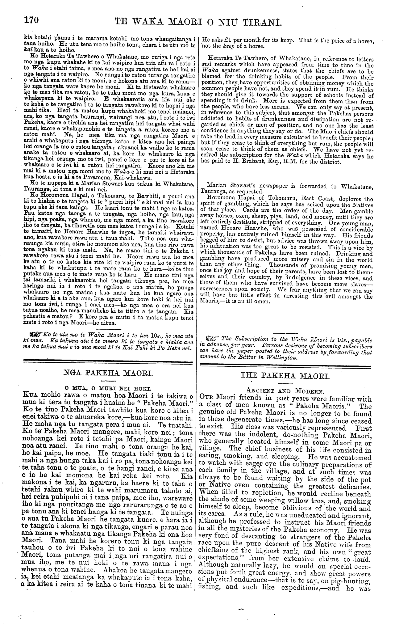 170 TE WAKA MAORI O NIU TIRANI. kia kotahi pauna i te marama kotahi mo tona whangaitanga i taua hoiho. He utu tena mo te hoiho tonu, ehara i te utu mo to kai kau a te hoiho. Ko Hetaraka Te Tawhero o Whakatane, mo runga i nga reta me nga kupu whakahe ki te kai waipiro kua taia atu ra i roto i te Waka, i etahi taima, e mea ana no nga rangatira te he i kai ai nga tangata i te waipiro. No runga i to ratou turanga rangatira e whiwhi ana ratou ki te moni, a e hokona atu ana ki te rama— ko nga tangata ware kaore he moni. Ki ta Hetaraka whakaaro ko te mea tika ma ratou, ko te tuku moni mo nga kura, kaua e whakapaua ki te waipiro. E whakaarotia ana kia nui ake te kaha o te rangatira i to te tangata rawakore ki te hapai i nga mahi tika. Heoi ta matou kupu whakahoki mo tenei inaianei, ara, ko nga tangata haurangi, wairangi noa atu, i roto i te iwi Pakeha, kaore e tirohia ana hei rangatira hei tangata whai wahi ranei, kaore e whakaponohia e te tangata a ratou korero me a ratou mahi. Na, he mea tika ma nga rangatira Maori e arahi e whakaputa i nga tikanga katoa e kitea aua hei painga hei oranga ia mo o ratou tangata; akuanei ka waiho ko te rama anake ta ratou e whakaaro ai, ka kore he whakaaro ki nga tikanga hei oranga me te iwi, penei e kore e nga te kore ai he whakaaro o te iwi ki a ratou hei rangatira. Kaore ano kia tae mai ki a matou nga moni mo to Waka e ki mai nei a Hetaraka kua hoatu e ia ki a te Paramena, Kai-whakawa. Ko te nupepa ki a Marian Stewart kua tukua ki Whakatane, Tauranga, ki tana e ki mai nei. Ko Horomona Hapai, o Tokomaru, te Rawhiti, e pouri ana ki te hiahia o te tangata ki te " purei hipi" e ki mai nei ia kua tupu ake ki taua kainga. He kaari tonu te mahi i nga ra katoa. Pau katoa nga taonga a te tangata, nga hoiho, nga kau, nga hipi, nga poaka, nga whenua, me nga moni, a ka tino rawakore iho te tangata, ka tihoretia ona mea katoa i runga i a ia. Kotahi te tamaiti, ko Henare Haawhe te ingoa, he tamaiti whairawa ano, kua rawakore rawa otu i taua mahi. Tohe noa ona wha- naunga kia mutu, otira ho moumou ako noa, kua tino riro rawa tona ngakau ki taua mahi. Na, he mano tini o te Pakeha i rawakore rawa atu i tenei mahi he. Kaore rawa atu he mea ke atu o te ao katoa kia rite ki te waipiro raua ko te purei te kaha ki te whakatupu i te mate raua ko te hara—ko te tino putake aua mea o te mato raua ko te hara. He mano tini nga tai tamariki i whakaarotia hei tangata tikanga pea, he mea haringa nui ia i roto i te ngakau o ana matua, ho punga whakaaro no nga matua; kua mate kua he kua ngaro ona whakaaro ki a ia ake ano, kua ngaro kua kore hoki ia hei nui mo tona iwi, i runga i enei mea—ko nga mea e ora noi kua tutua noaiho, he mea manuheko ki te titiro a te tangata. Kia peheatia e matou ? E kore pea e mutu i ta matou kupu tenei mate i roto i nga Maori he aitua. Ko te utu mo te Waka Maori i te tau 10s., he mea utu ki mua. Ka tukuna atu i te meera ki te tangata e hiahia ana me ka tukua mai e ia aua moni ki te Kai Tuhi ki Po Neke nei NGA PAKEHA MAORI. O MUA, O MURI NEI HOKI. KUA mohio rawa o matou hoa Maori i te takiwa o mua ki tera tu tangata i huaina he " Pakeha Maori." Ko te tino Pakeha Maori tawhito kua kore e kitea i enei takiwa o te ahuareka kore,—kua kore noa atu ia. He maha nga tu tangata pera i mua ai. Te tuatahi. Ko te Pakeha Maori mangere, mahi. kore nei; tona nohoanga kei roto i tet.ahi pa Maori, kainga Maori noa atu ranei. Te tino mahi o tona oranga he kai, he kai paipa, he moe. He tangata tiaki tonu ia i te mahi a nga hunga taka kai i ro pa, tona nohoanga kei te, taha tonu o te paata, o te hangi ranei, e kitea aua e ia he kai momona he kai reka kei roto. Kia makona i te kai, ka ngaruru, ka haere ki te taha o tetahi rakau whiro ki te wahi marumaru takoto ai, hei reira puhipuhi ai i tana paipa, moe iho, wareware iho ki nga pouritanga me nga rarurarunga o te ao e pa tonu ana ki tenei hanga ki te tangata. Te nuinga o aua tu Pakeha Maori he tangata kuare, e hara ia i te tangata i akona ki nga tikanga, engari e parau noa ana mana e whakaatu nga tikanga Pakeha ki ona hoa Maori. Tana mahi he korero tonu ki nga tangata tauhou o te iwi Pakeha ki te nui o tona wahine Maori, tona putanga mai i nga uri rangatira nui o mua iho, me te nui hoki o te rawa mana i nga whenua o tona wahine. Ahakoa he tangata mangere ia, kei etahi meatanga ka whakaputa ia i tona kaha, a ka kitea i reira ai te kaha o tona tinana ki te mahi He asks £1 per month for its keep. That is the price of a horse, not the keep of a horse. Hetaraka Te Tawhero, of Whakatane, in reference to letters and remarks which have appeared from time to time in the Waka against drunkenness, states that the chiefs are to be blamed, for the drinking habits of the people from their position, they. have opportunities of obtaining money which the common people have not, and they spend it in rum. He thinks they should give it towards the support of schools instead of spending it in drink. More is expected from them than from the people, who have less means. We can only say at present, in reference to this subject, that amongst the Pakehas persons addicted to habits of drunkenness and dissipation are not re- garded as chiefs or men of position, and no one has the least confidence in any thing they say or do. The Maori chiefs should take the lead in every measure calculated, to benefit their people; but if they cease to think of everything but rum, the people will soon cease to think of them as chiefs. We have not yet re- ceived the subscription for the Waka which Hetaraka says he has paid to H. Brabant, Esq., R.M. for the district. Marian Stewart's newspaper is forwarded to Whakatane, Tauranga, as requested. Horomona Hapai of Tokomaru, East Coast, deplores the spirit of gambling, which he says has seized upon the Natives of that place. Cards are the order of the day. Men gamble away horses, oxen, sheep, pigs, land, and money, until they are left; entirely destitute, stripped of everything. One young man, named Henare Haawhe, who was posses