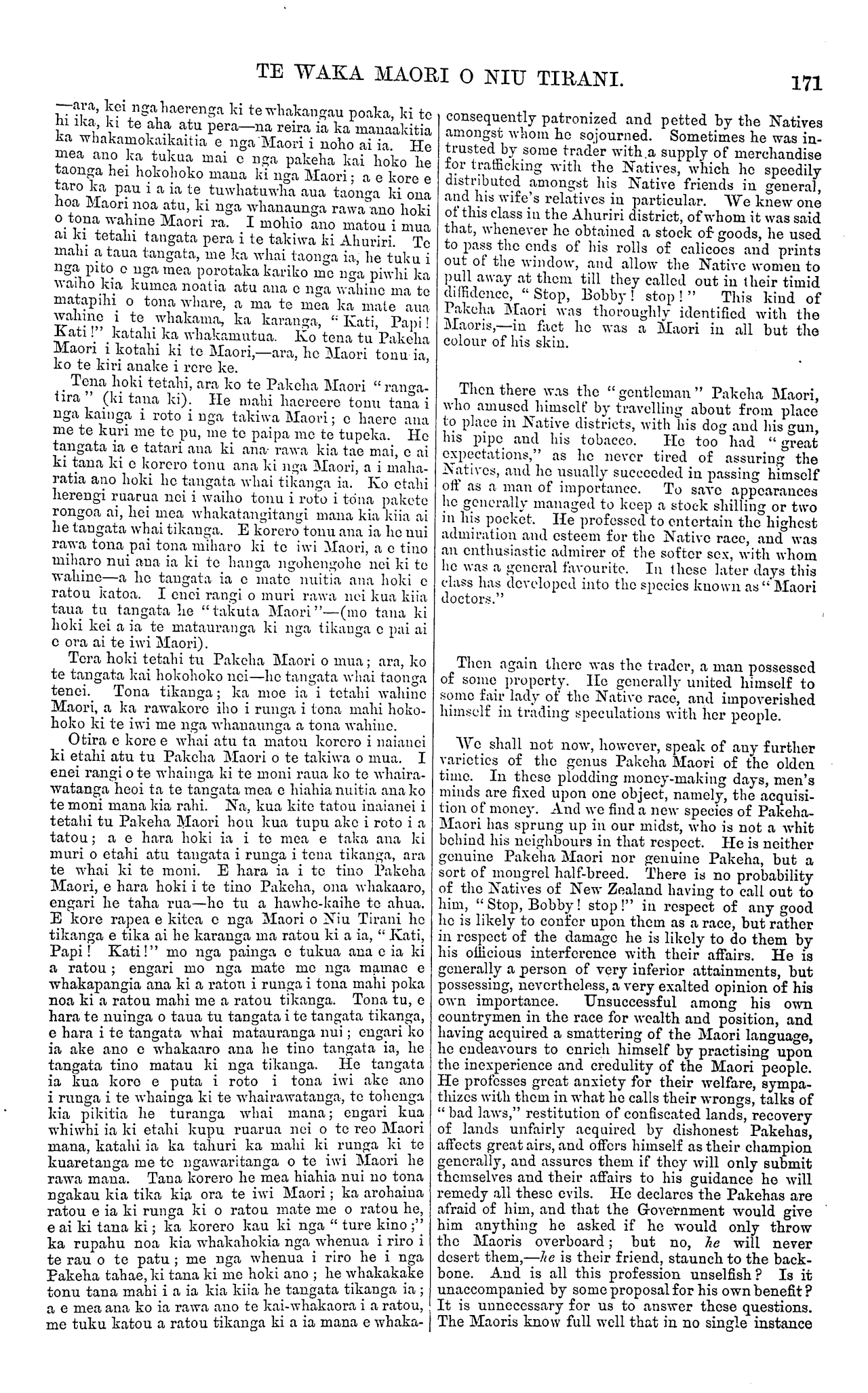 TE WAKA MAORI O NIU TIRANI. 171 —ara, kei nga haerenga ki te whakangau poaka, ki te hi ika, ki te aha atu pera—na reira ia ka manaakitia ka whakamokaikaitia e nga Maori i noho ai ia. He mea ano ka tukua mai e nga pakeha kai hoko he taonga hei hokohoko mana ki nga Maori; a e kore e taro ka pau i a ia te tuwhatuwha aua taonga Id ona hoa Maori noa atu, ki nga whanaunga rawa ano hoki o tona wahine Maori ra. I mohio ano matou i mua ai ki tetahi tangata pera i te takiwa Id Ahuriri. To mahi a taua tangata, me ka whai taonga ia., he tuku i nga pito o nga mea porotaka kariko mo nga piwhi ka waiho kia kumea noatia atu ana e nga wahine ma to matapihi o tona whare, a ma te mea ka mate aua wahine i te whakama ka karanga, " Kati, Papi! Kati!" katahi ka whakamutua. Ko tena tu Pakeha Maori i kotahi ki te Maori,—ara, ho Maori tonu ia, ko te kiri anake i rere ke. Tena hoki tetahi, ara ko te Pakeha Maori " ranga- tira " (ki tana ki). He mahi haereere tonu tana i nga kainga i roto i nga, takiwa Maori; e haere aua me te kuri me te pu, me to paipa me te tupeka. He tangata ia e tatari aua ki ana rawa kia tae mai, e ai ki taua ki o korero tonu ana ki nga Maori, a i maha- ratia ano hoki ho tangata whai tikanga ia. Ko etahi herengi ruarua noi i waiho tonu i ruto i tona pakete rongoa ai, hei mea whakatangitangi mana kia kiia ai he tangata whai tikanga. E korero tonu ana ia ho nui rawa tona pai tona miharo ki te iwi Maori, a o tino miharo nui aua ia ki to hanga ngohengohe nei ki to wahine—a ho tangata ia e mato nuitia aua hoki o ratou katoa. I enei rangi o muri rawa nei kua kiia taua tu tangata he "takuta Maori"—(mo taua ki hoki kei a ia te matauranga ki nga tikanga o pai ai e ora ai te iwi Maori). Tera hoki tetahi tu Pakeha Maori o mua; tira, ko te tangata kai hokohoko nei—he tangata whai taonga tenei. Tona tikanga; ka moe ia i tetahi wahine Maori, a ka rawakore iho i runga, i tona mahi hoko- hoko ki te iwi me nga whanaunga a toua wahine. O tira e kore e whai atu ta matou korero i naianei ki etahi atu tu Pakeha Maori o te takiwa o mua. I enei rangi o te whainga ki te moni raua ko te whaira- watanga heoi ta te tangata mea e hiahia nuitia, ana ko te moni mana Ida rahi. Na, kua kite tatou inaianei i tetahi tu Pakeha Maori hou kua tupu ako i roto i a tatou; a e hara hoki ia i te mea e taka aua ki muri o etahi atu tangata i runga i tena tikanga, ara te whai ki te moni. E hara ia i to tino Pakeha Maori, e hara hoki i te tino Pakeha, ona whakaaro, engari he taha rua—ho tu a hawhe-kaihe to ahua. E kore rapea e kitea e nga Maori o Niu Tirani ho tikanga e tika ai he karanga ma ratou ki a ia, " Kati, Papi! Kati!" mo nga painga o tukua ana o ia ki a ratou ; engari mo nga mate mo nga mamae e whakapangia ana ki a ratou i runga i tona mahi poka noa ki a ratou mahi me a ratou tikanga. Toua tu, e hara te nuinga o taua tu tangata i te tangata tikanga, e hara i te tangata whai matauranga nui; engari ko ia ake ano e whakaaro ana he tino tangata ia, he tangata tino matau ki nga tikanga. He tangata ia kua kore e puta i roto i tona iwi ake ano i runga i te whainga ki te whairawatanga., te tohenga kia pikitia he turanga whai mana; engari kua whiwhi ia ki etahi kupu ruarua nei o to reo Maori mana, katahi ia ka tahuri ka mahi ki runga ki te kuaretanga me te ngawaritanga o te iwi Maori he rawa maua. Taua korero he mea hiahia nui no tona ngakau kia tika kia ora te iwi Maori; ka arohaina ratou e ia ki runga ki o ratou mate me o ratou he, e ai ki tana ki; ka korero kau ki nga " ture kino ; i ka rupahu noa kia whakahokia nga whenua i riro i te rau o te patu ; me nga whenua i riro he i nga pakeha tahae, ki tana ki me hoki ano ; he whakakake tonu tana mahi i a ia kia kiia he tangata tikanga ia ; a e mea ana ko ia rawa ano te kai-whakaora i a ratou, me tuku katou a ratou tikanga ki a ia mana e whaka- consequently patronized and petted by the Natives amongst whom he sojourned. Sometimes he was in- trusted by some trader with a supply of merchandise for trafficking with the Natives, which he speedily distributed amongst his Native friends in general, and his wife's relatives in particular. We knew one of this class in the Ahuriri district, of whom it was said that, whenever he obtained a stock of goods, he used to pass the cuds of his rolls of calicoes and prints out of the window, and allow the Native women to pull away at them till they called out in their timid diffidence, "Stop, Bobby! stop!" This kind of Pakeha Maori was thoroughly identified with the Maoris,—in fact ho was a Maori in all but the colour of his skin. Then there was the "gentleman" Pakeha Maori, who amused himself by travelling about from place to place in Native districts, with his dog and his gun, his pipe and his tobacco. Ho too had " great expectations," as he never tired of assuring the Natives, and ho usually succeeded in passing himself off as a man of importance. To save appearances he generally managed to keep a stock shilling or two in his pocket. He professed to entertain the highest admiration and esteem for the Native race, and was au enthusiastic admirer of the softer sex, with whom he was a general favourite. In these later days this class has developed into the species known as" Maori doctors." Then again there was the trader, a man possessed of some property. Ho generally united himself to some fair lady of the Native race, and impoverished himself in trading speculations with her people. We shall not now, however, speak of any further varieties of the genus Pakeha Maori of the olden timo. In those plodding money-making days, men's minds are fixed upon one object, namely, the acquisi- tion of money. And we find a new species of Pakeha Maori has sprung up in our midst, who is not a whit behind his neighbours in that respect. He is neither genuine Pakeha Maori nor genuine Pakeha, but a sort of mongrel half-breed. There is no probability of the Natives of New Zealand having to call out to him, "Stop, Bobby! stop!" in respect of any good he is likely 