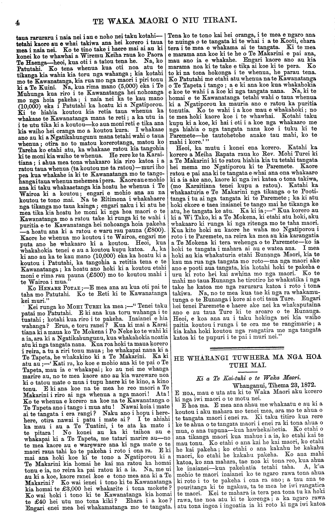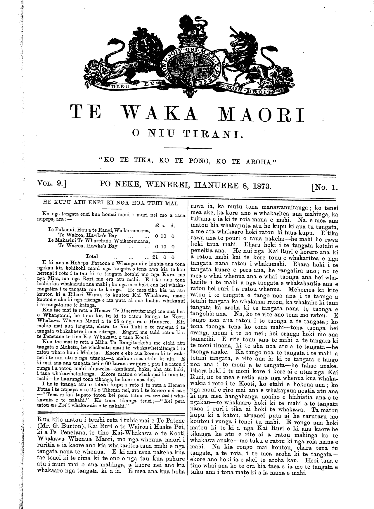 TE WAKA MAORI O NIU TIRANI. KO TE TIKA, KO TE PONO, KO TE AROHA.' VOL 9.] PO NEKE, WENEREI, HANUERE 8, 1873. [No. 1. HE KUPU ATU ENEI KI NGA HOA TUHI MAI. Ko nga tangata enei kua homai moni i muri nei mo a raua nupepa, ara:— £ s. d. Te Pukenui, Hau a te Rangi, Waikaremoana, Te Wairoa, Hawke's Bay ... ... 010 O Te Makarini Te Wharehuia, Waikaremoana, Te Wairoa, Hawke's Bay ... ... 010 O Total ... ... ... £100 E ki ana a Hohepa Paraone o Whanganui e hiahia ana tona ngakau kia kohikohi moni nga tangata o tena awa kia te kau herengi i roto i te tau ki te tangata kotahi mo nga Kura, mo nga Mira, mo nga Rori, me era atu mahi. E tika ana tona hiahia kia whakanuia aua mahi; ko nga mea hoki ena hei whaka- rangatira i te tangata rae te kainga. He mea tika kia pa atu koutou ki a Rihari Wunu, to koutou Kai Whakawa, mana koutou e ako ki nga ritenga e ata puta ai ena hiahia whakanui i te tangata me te kainga. Kua tae mai te reta a Henare Te Haeretuterangi me ona hoa o Whanganui, he tono kia tu ki to ratou kainga te Kooti Whakawa Whenua Maori a te 28 o nga ra o Hanuere. Kia mohio mai aua tangata, ehara te Kai Tuhi o te nupepa i te tangata whakahaere i ena ritenga. Engari me tuhi ratou ki a te Penetana te tino Kai Whakawa o taua Kooti. Kua tae mai te reta a Miha Te Rangituakoha me etahi atu tangata o Maketu, he whakaatu mai i te whakawhetaitanga i to ratou whare hou i Maketu. Kaore e eke ana korero ki te waka nei i te nui atu o nga utanga—a mahue ana etahi ki uta. E ki mai ana aua tangata nei e 60 karana waipiro i pau i a ratou i runga i a ratou mahi ahuareka—kanikani, haka, aha atu hoki, i taua whakawhetaitanga. Ekore matou e whakapai ki taua tu mahi—he haurangi toua tikanga, he kuare noa iho. I he te taanga atu o tetahi kupu i roto i te reta a Henare Potae i te nupepa o te 24 o Tihema nei, ara i te korero nei na; —" Tena ra kia tupato tatou kei pera tatou me era wi i wha- kawaia e te nakahi." Ko tona tikanga tenei;—" Kei pera tatou me Iwi i whakawaia e te nakahi." KUA kite matou i tetahi reta i tuhia mai e Te Patene (Mr. G Burton), Kai Ruri o te Wairoa i Haake Pei, ki a Te Penetana, te tino Kai-whakawa o te Kooti Whakawa Whenua Maori, mo nga whenua maori i ruritia e ia kaore ano kia whakaritea tana mahi e nga tangata nana te whenua. E ki ana taua pakeha kua tae tenei ki te rima ki te ono o nga tau kua pahure atu i muri mai o ana mahinga, a kaore nei ano kia whakaaro nga tangata ki a ia. E mea ana kua hoha rawa ia, ka mutu tona manawanuitanga; ko tenei mea ake, ka kore ano e whakaritea ana mahinga, ka tukuna e ia ki te roia mana e mahi. Na, e mea ana matou kia whakaputa atu he kupu ki aua tu tangata, a me ata whakaaro hoki ratou ki taua kupu. E tika rawa ana te pouri o taua pakeha—he mahi he rawa hoki taua mahi. Ehara hoki i te tangata kotahi e peneitia ana. He nui nga Kai Ruri e korero ana ki a ratou mahi kai te kore tonu e whakaritea e nga tangata nana ratou i whakamahi. Ehara hoki i te tangata kuare e pera ana, he rangatira ano; no te mea e whai whenua ana e whai taonga ana hei wha- karite i te mahi a nga tangata e whakahautia ana e ratou hei ruri i a ratou whenua. Mehemea ka kite ratou i te tangata e tango noa ana i te taonga a tetahi tangata ka whakama ratou, ka whakahe ki taua tangata ka aroha ki te tangata nana te taonga e tangohia ana. Na, ko te rite ano tena mo ratou. E tango noa ana ratou i te taonga a te tangata; ko tona taonga tena ko tona mahi—toua taonga hei oranga mona i te ao nei; hei oranga hoki mo ana tamariki. E rite tonu aua te mahi a te tangata ki te moni tinana, ki te aha noa atu a te tangata—he taonga anake. Ka tango noa te tangata i te mahi a tetahi tangata, e rite ana ia ki te tangata e tango noa ana i te moni a te tangata—he tahae anake. Ehara hoki i te moni kore i kore ai e utua nga Kai Ruri, no te mea e retia ana nga whenua kua whaka- wakia i roto i te Kooti, ko etahi e hokona ana; ko nga moni e riro mai ana e whakapaua noatia atu ana ki nga mea hangahanga noaiho e hiahiatia ana e te ngakau—te whakaaro hoki ki te mahi a te tangata nana i ruri i tika ai hoki te whakawa. Ta matou kupu ki a koutou, akuanei puta ai he raruraru mo koutou i runga i tenei tu mahi. E rongo ana hoki matou ki te ki a nga Kai Ruri e ki aua kaore he tikanga ke atu e rite ai a ratou mahinga ko te whakawa anake—me tuku e ratou ki nga roia mana e mahi. Na kia rongo mai koutou, ehara tena tu tangata, a te roia, i te mea aroha ki te tangata— ekore ano hoki ia e ahei te aroha kau. Heoi tana e tino whai ana ko te ora kia taea e ia mo te tangata e tuku ana i tona mate ki a ia mana e mahi.