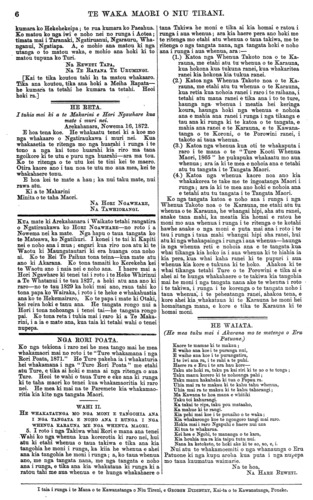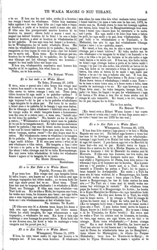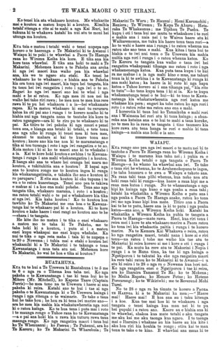 2 TE WAKA MAORI O NIU TIRANI. Ko tenei kia ata whakaaro koutou. Me whakarite mai e koutou a matou kupu ki a koutou. Kimihia tetahi ritenga e rite ai te mahi a nga Kai Ruri, kei tukuna ki te whakawa katahi ka nui atu te moni hei utunga ma koutou. KUA taia e matou i tetahi wahi o tenei nupepa nga korero o te haerenga o Te Makarini ki te Awanui i Waiapu ki te pehi i te whawhai a Paora Te Haenga I raua ko Wiremu Keiha kia kore. E tika ana kia I kore taua whawhai. E tika ana hoki te mahi a Te Makarini. "Mehemea kaore a te Pakeha ana aroha ki nga iwi maori kua waiho pea kia whawhai I ana, kia we te ngaro atu etahi. Ko tenei he whakaaro ke te whakaaro; e hiahia ana te Pakeha kia ora tonu nga iwi maori, kia tupu hei tangata, kia tu tonu hei iwi rangatira i roto i nga iwi o te ao. Engari ko nga iwi maori ano kai te whai i nga mahi e he ai ratou. Ko nga mea iti noa nei ka waiho hei take riri rawa; he mea noa te mea kua rere rawa ki te pu hei whakaora i a ia—hei whakamate rapea. Ki ta matou whakaaro ki enei tu raruraru katoa ka oti pai ano i runga i te korero noaiho ki te hiahia nui nga tangata nana te tautohe kia kore ta Tatou ngangare—ara ki te riro pu te whakaaro ki te pai. Ka titiro te iwi pakeha ki nga maori e penei tonu ana, e hianga ana tetahi ki tetahi, e tete tonu ana nga niho ki runga ki tenei mea ki tera mea, akuanei te mahara ai kai te kuare tonu ano koutou; kaore ano kia tae noa ki te maramatanga e tika ai tou turanga i roto i nga iwi rangatira o te ao. Koia matou i ki ai ko te maori ano ki te whakahe i a ia. Kai te kore hoki koutou e awhina i te Kawana- tanga i runga i ana mahi whakarangatira i a koutou. E hanga ake ana te whare hei oranga hei maru mo koutou, e tukitukitia ana e koutou! E hapai nga ana to koutou rongo me to koutou ingoa ki runga kia whakarangatiratia, e takahia iho ana e koutou ki ro paruparu! E rite ana koutou ki oku tupuna i te wa o to Tatou kuaretanga. Tenei ano pea te takiwa e mahue ai i a koe ena mahi pohehe. Tena ano nga tangata tika, whakaaro marama, i roto i a koutou; ma Tatou tetahi wahi o te pai e whakahaere kia tika ai nga iwi. Kia kaha koutou! Ko to koutou hoa tawhito ko Te Makarini me ona hoa o te Kawana- tanga kai te whakaaro pai ki a koutou. Ki te kore koutou e kake haere i enei rangi no koutou ano te he —ehara i te tangata. He kite iho no matau i te tika o enei whakaaro a matou mo te taha ki Te Pakeha, mo te taha hoki ki a koutou, i puta ai i a matou enei kupu whakapai me enei kupu whakahe. Ka nui te tika o nga reta maha i taia ki te nupepa o te 20 o Nowema; i tuhia mai e etahi o koutou hei whakamihi ki a Te Makarini i te takanga o tona Kawanatanga i mua tata atu nei. Mehemea kore Te Makarini, ko wai he hoa e tika ai koutou? RUATAHUNA KUA tu te hui a Te Urewera ki Ruatahuna i te 5 me te 6 o nga ra o Tihema kua taha nei. Ko nga pakeha o te Kawanatanga i tae ki taua hui ko te Mitere (Mr. Mitchell), ko Kapene Taare (Captain Ferris)—he mea tono na te Urewera i haere ai aua pakeha ki reira. Katahi ano te hui i tae ai nga pakeha o te Kawanatanga ki o Te Urewera kainga i runga i nga ritenga o te waimarie. Te take o taua hui he take hou; he hou ra ki tena iwi marire ano— ara he mea kia mahia kia whakatuwheratia nga rori ki o ratou kainga. Ko te hua tena i puta mai i roto i te maunga rongo o Tuhoe raua ko te Kawanatanga —a e pai ana hoki kia u rawa kia tuturu rawa taua maunga rongo. Ko nga rangatira maori i taua hui ko Te Whenuanui; ko Paerau; Te Pukenui, ara ko Te Kereru; ko Te Makarini Te Wharehuia; Te Makarini Te Waru; Te Haunui; Hemi Karumohiti; Raniera; Te Wiremu; Te Kepa Te Ahuru; Heta- raka Te Whakaunua; me Tipihau Te Puehu. Te kupu i oti i taua hui me mutu te whakakore i te rori e mahia ana i naia nei i te Wairoa haere atu ki Waikaremoana, me tuku kia haere tonu taua rori—a ko te wahi e haere ana i runga i to Tatou whenua ma ratou ake ano tena e mahi. Kua kitea i taua hui te hiahia o te iwi nui tonu o Te Urewera kia mahia nuitia nga rori i runga i o Tatou whenua katoa. Ko Te Kereru te tangata kua waiho e taua iwi hei rangatira whakapuaki tikanga mo ratou i roto i nga whakamenenga katoa. Kua puta tana kupu i te hui ra me mahue i a ia nga mahi kino o mua, me tahuri tonu ia ki te awhina i a te Kawanatanga ki runga ki ana mahi katoa; ka haere ia ki roto ki nga hapu katoa o Tuhoe korero ai i ana tikanga pai, " kia rite te tutu"—ko tana kupu tena i ki ai ia. Ko te kupu whakamutunga tenei o te hui—ki te tono te Kawa- natanga kia whakatuwheratia nga rori katoa me whakaae kia pera; engari ka tohe ratou ko nga rori i roto i o ratou rohe ma Tatou ano ena e mahi. I korerotia ki taua hui ko Tamaikoha e mahi rori ana i Waimana hei rori atu ki toua kainga; a ahua- reka ana kaitaina ana e te hui te mahi a taua koroke, no te mea ko ia rawa te tangata i tino taumaro kia kore rawa atu tena hanga te rori e mahia ki tana kainga—a mahia ana hoki e ia ano. WAIAPU. KUA rongo ano pea nga iwi maori o te motu nei ki te tautohe a Paora Te Haenga raua ko Wiremu Keiha i Waiapu i te marama kua taha nei; i puhia ra e Wiremu Keiha tetahi o nga tangata o Paora Te Haenga—a ka whano ka whawhai aua iwi. Te take o taua TITI he whenua, ko te Aruhemokopuna te ingoa, i te taha hauauru o te awa o Waiapu e takoto ana. Na raua tahi taua piihi whenua, kua noho noa atu hoki raua tahi ki runga—kua haere a raua hipi me a raua mea katoa i runga. No te whanautanga o nga hipi ka kainga nga kuao e nga poaka a raua tahi; katahi ka whakatika a Wiremu Keiha e patu ana i nga poaka a Paora Te Haenga anake, ratou ko tona iwi mo nga kuao hipi kua mate. Titiro ana a Paora kai te he te patu, haere ana ia ki te patu i nga poaka katoa—ana ano, a Wiremu Keiha hoki. Katahi ka whakatika a Wiremu Keiha ka puhia te tangata a Paora te Haenga—mate rawa. Heoi, kua TITI tonu i reira mei i kore te ata whakaaro marire a Paora Tatou ko tona iwi kia whakaotia paitia i runga i te korero marire. Na te Kemara Kai Whakawa o reira, Tatou ko nga rangatira maori, tetahi nana i kore ai e TITI tonu—na ratou
