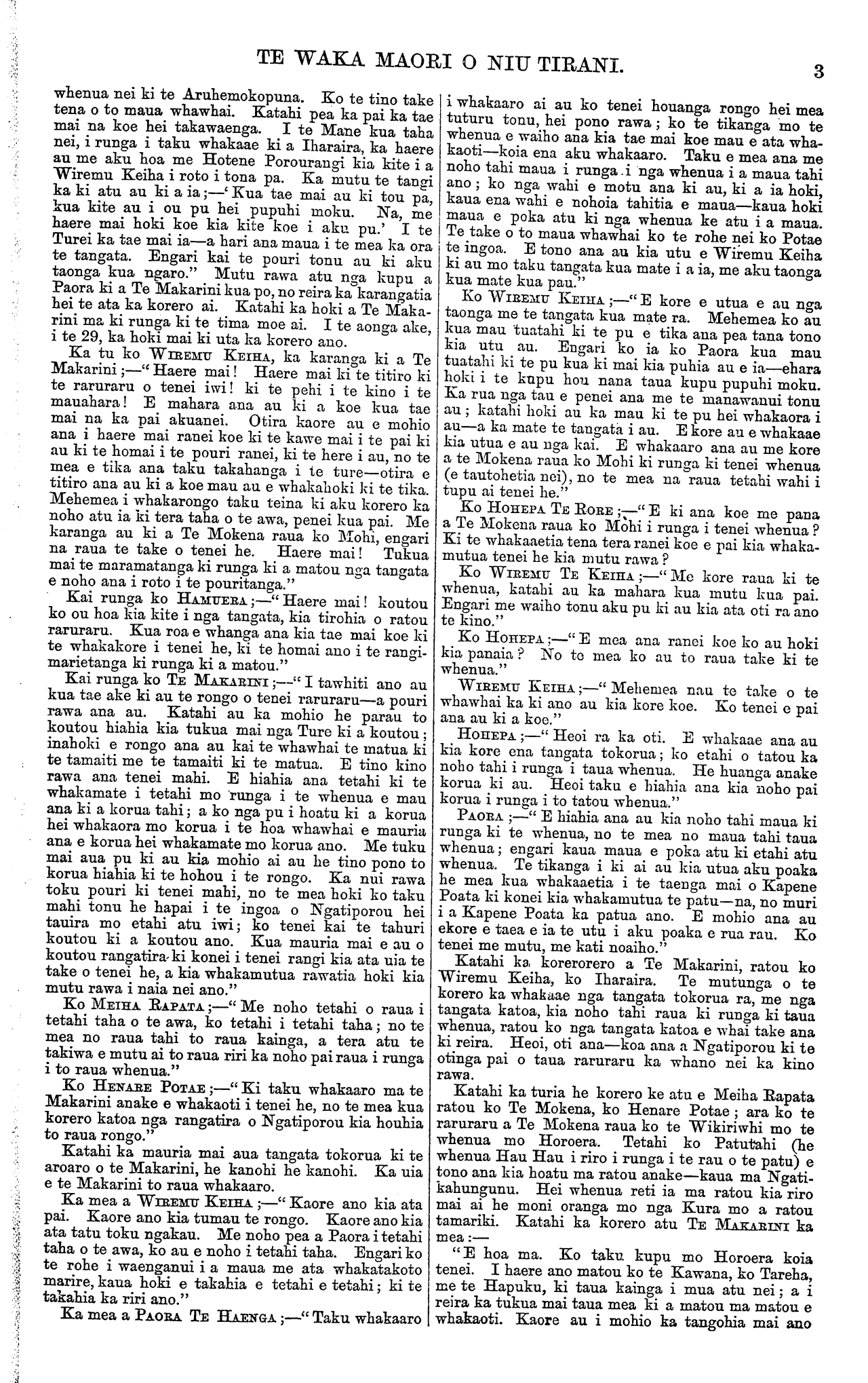 TE WAKA MAORI O NIU TIRANI. 3 whenua nei ki te Aruhemokopuna . Ko te tino take tena o to maua whawhai. Katahi pea ka pai ka tae mai na koe hei takawaenga. I te Mane kua taha nei, i runga i taku whakaae ki a Iharaira, ka haere au me aku hoa me Hotene Porourangi kia kite i a Wiremu Keiha i roto i tona pa. Ka mutu te tangi ka ki atu au ki a ia;—' Kua tae mai au ki tou pa, kua kite au i ou pu hei pupuhi moku. Na, me haere mai hoki koe kia kite koe i aku pu.' I te Turei ka tae mai ia—a hari ana maua i te mea ka ora te tangata. Engari kai te pouri tonu au ki aku taonga kua ngaro." Mutu rawa atu nga kupu a Paora ki a Te Makarini kua po, no reira ka karangatia hei te ata ka korero ai. Katahi ka hoki a Te Maka- rini ma ki runga ki te tima moe ai. I te aonga ake, i te 29, ka hoki mai ki uta ka korero ano. Ka tu ko WIREMU KEIHA, ka karanga ki a Te Makarini;—" Haere mai! Haere mai ki te titiro ki te raruraru o tenei iwi! ki te pehi i te kino i te mauahara! E mahara ana au ki a koe kua tae mai na ka pai akuanei. Otira kaore au e mohio ana i haere mai ranei koe ki te kawe mai i te pai ki au ki te homai i te pouri ranei, ki te here i au, no te mea e tika ana taku takahanga i te ture—otira e titiro ana au ki a koe mau au e whakahoki ki te tika. Mehemea i whakarongo taku teina ki aku korero ka noho atu ia ki tera taha o te awa, penei kua pai. Me karanga au ki a Te Mokena raua ko Mohi, engari na raua te take o tenei he. Haere mai! Tukua mai te maramatanga ki runga ki a matou nga tangata e noho ana i roto i te pouritanga." Kai runga ko HAMUERA; —"Haere mai! koutou ko ou hoa kia kite i nga tangata, kia tirohia o ratou raruraru. Kua roa e whanga ana kia tae mai koe ki te whakakore i tenei he, ki te homai ano i te rangi- marietanga ki runga ki a matou." Kai runga ko TE MAKARINI; " I tawhiti ano au kua tae ake ki au te rongo o tenei raruraru—a pouri rawa ana au. Katahi au ka mohio he parau to koutou hiahia kia tukua mai nga Ture ki a koutou; inahoki e rongo ana au kai te whawhai te matua ki te tamaiti me te tamaiti ki te matua. E tino kino rawa ana tenei mahi. E hiahia ana tetahi ki te whakamate i tetahi mo runga i te whenua e mau ana ki a korua tahi; a ko nga pu i hoatu ki a korua hei whakaora mo korua i te hoa whawhai e mauria ana e korua hei whakamate mo korua ano. Me tuku mai aua pu ki au kia mohio ai au he tino pono to korua hiahia ki te hohou i te rongo. Ka nui rawa toku pouri ki tenei mahi, no te mea hoki ko taku mahi tonu he hapai i te ingoa o Ngatiporou hei tauira mo etahi atu iwi; ko tenei kai te tahuri koutou ki a koutou ano. Kua mauria mai e au o koutou rangatira ki konei i tenei rangi kia ata ma te take o tenei he, a kia whakamutua rawatia hoki kia mutu rawa i naia nei ano." Ko MEIHA RAPATA;—" Me noho tetahi o raua i tetahi taha o te awa, ko tetahi i tetahi taha; no te mea no raua tahi to raua kainga, a tera atu te takiwa e mutu ai to raua TITI ka noho pai raua i runga i to raua whenua." Ko HENARE POTAE;—" Ki taku whakaaro ma te Makarini anake e whakaoti i tenei he, no te mea kua korero katoa nga rangatira o Ngatiporou kia houhia to raua rongo." Katahi ka mauria mai aua tangata tokorua ki te aroaro o te Makarini, he kanohi he kanohi. Ka uia e te Makarini to raua whakaaro. Ka mea a WIREMU KEIHA;—" Kaore ano kia ata pai. Kaore ano kia tumau te rongo. Kaore ano kia ata tatu toku ngakau. Me noho pea a Paora i tetahi taha o te awa, ko au e noho i tetahi taha. Engari ko te rohe i waenganui i a maua me ata whakatakoto marire, kaua hoki e takahia e tetahi e tetahi; ki te takahia ka riri ano." Ka mea a PAORA TE HAENGA;—" Taku whakaaro i whakaaro ai au ko tenei houanga rongo hei mea tuturu tonu, hei pono rawa; ko te tikanga mo te whenua e waiho ana kia tae mai koe mau e ata wha- kaoti—koia ena aku whakaaro. Taku e mea ana me noho tahi maua i runga i nga whenua i a maua tahi ano; ko nga wahi e motu ana ki au, ki a ia hoki, kaua ena wahi e nohoia tahitia e maua—kaua hoki maua e poka atu ki nga whenua ke atu i a maua. Te take o to maua whawhai ko te Tohe nei ko Potae te ingoa. E tono ana au kia utu e Wiremu Keiha ki au mo taku tangata kua mate i a ia, me aku taonga kua mate kua pau." Ko WIREMU KEIHA;—" E kore e utua e au nga taonga me te tangata kua mate ra. Mehemea ko au kua mau "tuatahi ki te pu e tika ana pea tana tono kia utu au. Engari ko ia ko Paora kua mau tuatahi ki te pu kua ki mai kia puhia au e ia—ehara hoki i te kupu hou nana taua kupu pupuhi moku. Ka rua nga tau e penei ana me te manawanui tonu au; katahi hoki au ka mau ki te pu hei whakaora i au—a ka mate te tangata i au. E kore au e whakaae kia utua e au nga kai. E whakaaro ana au me kore a te Mokena raua ko Mohi ki runga ki tenei whenua (e tautohetia ), no te mea na raua tetahi wahi i tupu ai tenei he." Ko HOHEPA TE RORE; " E ki ana koe me pana a Te Mokena raua ko Mohi i runga i tenei whenua? Ki te whakaaetia tena tera ranei koe e pai kia whaka- mutua tenei he kia mutu rawa? Ko WIREMU TE KEIHA;—" Me kore raua ki te whenua, katahi au ka mahara kua mutu kua pai. Engari me waiho tonu aku pu ki au kia ata oti ra ano te kino." Ko HOHEPA;—" E mea ana ranei koe ko au hoki kia panaia? No to mea ko au to raua take ki te whenua." WIREMU KEIHA;—" Mehemea nau te take o te whawhai ka ki ano au kia kore koe. Ko tenei e pai ana au ki a koe." HOHEPA;—" Heoi ra ka oti. E whakaae ana au kia kore ena tangata tokorua; ko etahi o tatou ka noho tahi i runga i taua whenua. He huanga anake korua ki au. Heoi taku e hiahia ana kia noho pai korua i runga i to tatou whenua." PAORA;—" E hiahia ana au kia noho tahi maua ki runga ki te whenua, no te mea no maua tahi taua whenua; engari kaua maua e poka atu ki etahi atu whenua. Te tikanga i ki ai au kia utua aku poaka he mea kua whakaaetia i te taenga mai o Kapene Poata ki konei kia whakamutua te patu—na, no muri i a Kapene Poata ka patua ano. E mohio ana au ekore e taea e ia te utu i aku poaka e rua rau. Ko tenei me mutu, me kati noaiho." Katahi ka korerorero a Te Makarini, ratou ko 