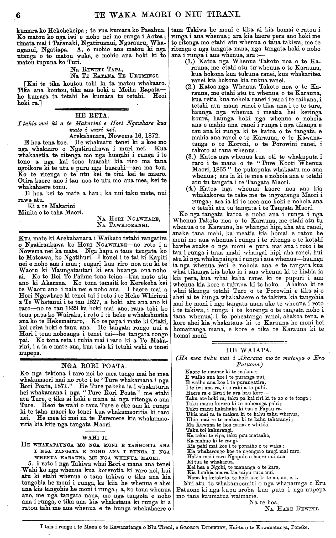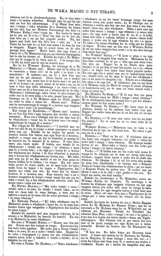 6 TE WAEA MAORI O NIU TIRANI. kumara ko Hekehekeipa; te rua kumara ko Paeahua. Ko matou ko nga iwi e noho nei no runga i Aotea; timata mai i Taranaki, Ngatiruanui, Ngarauru, Wha- nganui, Ngatiapa. A, e mohio ana matou ki nga utanga o to matou waka, e mohio ana hoki ki to matou tupuna ko Turi. Na REWETI TAPA, Na TE RATANA TE URUMINGI. [Kai te tika koutou tahi ki ta matou whakaaro. Tika ana koutou, tika ana hoki a Meiha Rapata— he kumara ta tetahi he kumara ta tetahi. Heoi hoki ra.] HE RETA. I tuhia mai ki a te Makarini e Hori Ngawhare kua mate i muri nei. Arekahanara, Nowema 16, 1872. E hoa tena koe. He whakaatu tenei ki a koe mo nga whakaaro o Ngatiraukawa i muri nei. Kua whakaaetia te ritenga mo nga huarahi i runga i te tono a nga kai tono huarahi, kia riro ma tana ngoikore ki te utu e puru nga huarahi—ara ma tou. Ko te ritenga o te utu kei te tini kei te maero. Otira kaore ano i tau noa te utu mo aua mea, kei te whakahaere tonu. E hoa kei te mate a hau; ka nui taku mate, nui rawa atu. Ki a te Makarini Minita o te taha Maori. NA HORI NGAWHARE, NA TAWHIORANGI. KUA mate ki Arekahanara i Waikato tetahi rangatira o Ngatiraukawa ko HORI NGA WHARE—no roto i a Nowema nei ka mate. Nga hapu o taua tangata ko te Mateawa, ko Ngatihuri. I konei i te tai ki Kapiti nei e noho ana i mua; engari kua riro noa atu ki te Waotu ki Maungatautari ki era huanga ona noho ai. Ko te Rei Te Paihua tona teina—kua mate atu ano ki Akarana. Ko tona tamaiti ko Kerekeha kei te Waotu ano i naia nei e noho ana. I haere mai a Hori Ngawhare ki tenei tai i roto i te Heke Whirinui a Te Whatanui i te tau 1827, a hoki atu ana ano ki raro—no te tau 1829 ka hoki mai ano, raua tahi ko tona papa ko Wairaka, i roto i te heke e whakahuatia ana ko te Hekemairaro, Ko te papa i mate ki Otaki, kei reira hoki e tanu ana. He tangata rongo nui a Hori i tona nohoanga i tenei tai—he tangata rongo pai. Ko tona reta i tuhia mai i raro ki a Te Maka- rini, i a ia e mate ana, kua taia ki tetahi wahi o tenei nupepa. NGA RORI POATA. Ko nga tekiona i raro nei he mea tango mai he mea whakamaori mai no roto i te " Ture whakamana i nga Rori Poata, 1871." He Ture pakeha ia i whakaaturia hei whakamana i nga " Ture Rori Poata " me etahi atu Ture, e, tika ai hoki e mana ai nga ritenga o aua Tare. Heoi te wahi o taua Ture e eke ana ki runga ki te taha maori ko tenei kua whakamaoritia ki raro nei. He mea ki mai na te Paremete kia whakamao- ritia kia kite nga tangata Maori. WAHI 11. HE WHAKATAUNGA MO NGA MONI E TANGOHIA ANA I NGA TANGATA E NOHO ANA I RUNGA I NGA WHENUA KARAUNA. ME NGA WHENUA MAORI. 5. I roto i nga Takiwa whai Rori e mana ana tenei Wahi ko nga whenua kua korerotia ki raro nei, hui atu ki etahi whenua o taua takiwa e tika ana kia tangohia he moni i runga, ka kiia he whenua e ahei ana kia tangohia he moni i runga; a, ko taua whenua ano, me nga tangata nana, me nga tangata e noho ana i runga, e tika ana kia whakataua ki runga ki a ratou tahi me aua whenua e te hunga whakahaere o tana Takiwa he moni e tika ai kia homai e ratou i runga i aua whenua; ara kia haere pera ano hoki me te ritenga mo etahi atu whenua o taua takiwa, me te ritenga o nga tangata nana, nga tangata hoki e noho ana i runga i aua whenua, ara:— (1.) Katoa nga Whenua Takoto noa o te Ka- rauna, me etahi atu tu whenua o te Karauna, kua hokona kua tukuna ranei, kua whakaritea ranei kia hokona kia tukua ranei. (2.) Katoa nga Whenua Takoto noa o te Ka- rauna, me etahi atu tu whenua o te Karauna, kua retia kua nohoia ranei i raro i te raihana, i tetahi atu mana ranei e tika ana i to te ture, haunga nga whenua i meatia hei keringa koura, haunga hoki nga whenua e nohoia ana e mahia ana ranei i runga i nga tikanga e tau ana ki runga ki te katoa o te tangata, e mahia ana ranei e te Karauna, e te Kawana- tanga o te Koroni, o te Porowini ranei, i takoto ai taua whenua. (3.) Katoa nga whenua kua oti te whakaputa i raro i te mana o te " Ture Kooti Whenua Maori, 1865 " he pukapuka whakaatu mo aua whenua; ara ia ki te mea e nohoia ana e tetahi atu tu tangata i te Tangata Maori. (4.) Katoa nga whenua kaore noa ano kia whakakorea te take me te ingoatanga Maori i runga; ara ia ki te mea ano hoki e nohoia ana e tetahi atu tu tangata i te Tangata Maori. Ko nga tangata katoa e noho ana i runga i nga Whenua Takoto noa o te Karauna, me etahi atu tu whenua o te Karauna, he whangai hipi, aha atu ranei, anake tana mahi, ka meatia kia homai e ratou he moni mo aua whenua i runga i te ritenga o te kotahi hawhe anake o nga moni e puta mai ana i roto i te tau i runga i taua mahi whangai hipi aha ranei, hui atu ki nga whakapainga i runga i aua whenua—haunga ia nga whenua reti e nohoia ana e te tangata kua whai tikanga kia hoko ia i aua whenua ki te hiahia ia kia pera, kua whai kaha ranei ki te pupuri i aua whenua kia kore e tukuna ki te hoko. Ahakoa ki te whai tikanga tetahi Ture o te Porowini e tika ai e ahei ai te hunga whakahaere o te takiwa kia tangohia mai he moni i nga tangata nana ake te whenua i roto i te takiwa, i runga i te korenga o te tangata noho i taua whenua, i te peheatanga ranei, ahakoa tena, e kore ahei kia whakataua ki te Karauna he moni hei homaitanga mana, e kore e tika te Karauna ki te homai moni. HE WAIATA. (He mea tuku mai i Akarana mo te matenga o Eru Patuone.) Kaore te mamae ki te makau; E waiho ana koe i te puranga nui, E waiho ana koe i te purangatira, I te iwi ana ra, i te rahi a te puhi. Haere ra e Eru i te ara hau kore— Taku ate hoki ra, taku pa kai riri ki te ao o te tonga; Taku manu korero ki te nohoanga pahi; Taku manu hakahaka ki tua o Papau ra. Uhia mai ra te makau ki te kahu tahu whenua, Uhia mai ra te makau ki te kahu taharangi; Ma Kawana te hoa maua e whitiki Taku toi kahurangi. Ka takai te ripa, taku pou mataaho, Ka mahue ki te rangi. Kia pehi mai koe i te ponaiho o te waka; Kia whakarongo koe te ngongoro tangi mai raro. Hokia mai i raro Ngapuhi e haere nui ana Ki tua te whakama. Kei hea e Ngohi, te mananga o te kara, Kia houhia ma ra kia taipu tutu nui. N