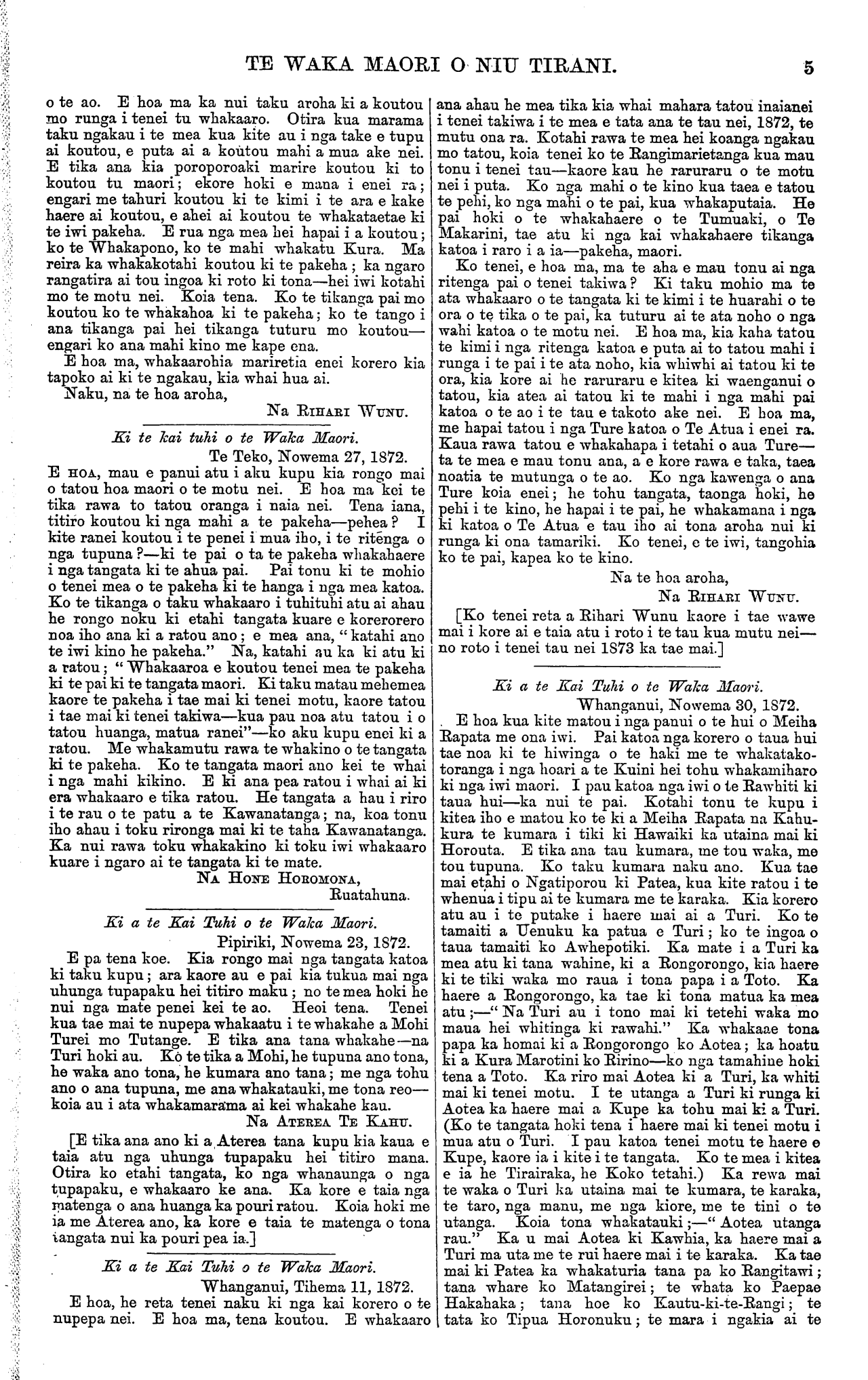 TE WAKA MAORI O NIU TIRANI. 5 o te ao. E hoa ma ka nui taku aroha ki a koutou mo runga i tenei tu whakaaro. Otira kua marama taku ngakau i te mea kua kite au i nga take e tupu ai koutou, e puta ai a koutou mahi a mua ake nei. E tika ana kia poroporoaki marire koutou ki to koutou tu maori; ekore hoki e mana i enei ra; engari me tahuri koutou ki te kimi i te ara e kake haere ai koutou, e ahei ai koutou te whakataetae ki te iwi pakeha. E rua nga mea hei hapai i a koutou; ko te Whakapono, ko te mahi whakatu Kura. Ma reira ka whakakotahi koutou ki te pakeha; ka ngaro rangatira ai tou ingoa ki roto ki tona—hei iwi kotahi mo te motu nei. Koia tena. Ko te tikanga pai mo koutou ko te whakahoa ki te pakeha; ko te tango i ana tikanga pai hei tikanga tuturu mo koutou— engari ko ana mahi kino me kape ena. E hoa ma, whakaarohia mariretia enei korero kia tapoko ai ki te ngakau, kia whai hua ai. Naku, na te hoa aroha, Na RIHARI WUNU. Ki te kai tuhi o te Waka Maori. Te Teko, Nowema 27, 1872. E HOA, mau e panui atu i aku kupu kia rongo mai o tatou hoa maori o te motu nei. E hoa ma kei te tika rawa to tatou oranga i naia nei. Tena iana, titiro koutou ki nga mahi a te pakeha—pehea? I kite ranei koutou i te penei i mua iho, i te ritenga o nga tupuna?—ki te pai o ta te pakeha whakahaere i nga tangata ki te ahua pai. Pai tonu ki te mohio o tenei mea o te pakeha ki te hanga i nga mea katoa. Ko te tikanga o taku whakaaro i tuhituhi atu ai ahau he rongo noku ki etahi tangata kuare e korerorero noa iho ana ki a ratou ano; e mea ana, " katahi ano te iwi kino he pakeha." Na, katahi au ka ki atu ki a ratou; " Whakaaroa e koutou tenei mea te pakeha ki te pai ki te tangata maori Ki taku matau mehemea kaore te pakeha i tae mai ki tenei motu, kaore tatou i tae mai ki tenei takiwa—kua pau noa atu tatou i o tatou huanga, matua ranei"—ko aku kupu enei ki a ratou. Me whakamutu rawa te whakino o te tangata ki te pakeha. Ko te tangata maori ano kei te whai i nga mahi kikino. E ki ana pea ratou i whai ai ki era whakaaro e tika ratou. He tangata a hau i riro i te rau o te patu a te Kawanatanga; na, koa tonu iho ahau i toku rironga mai ki te taha Kawanatanga. Ka nui rawa toku whakakino ki toku iwi whakaaro kuare i ngaro ai te tangata ki te mate. NA HONE HOROMONA, Ruatahuna. Ki a te Kai Tuhi o te Waka Maori. Pipiriki, Nowema 23, 1872. E pa tena koe. Kia rongo mai nga tangata katoa ki taku kupu; ara kaore au e pai kia tukua mai nga uhunga tupapaku hei titiro maku; no te mea hoki he nui nga mate penei kei te ao. Heoi tena. Tenei kua tae mai te nupepa whakaatu i te whakahe a Mohi Turei mo Tutange. E tika ana tana whakahe—na Turi hoki au. Ko te tika a Mohi, he tupuna ano tona, he waka ano tona, he kumara ano tana; me nga tohu ano o ana tupuna, me ana whakatauki, me tona reo— koia au i ata whakamarama ai kei whakahe kau. Na ATEREA. TE KAHU. [E tika ana ano ki a Aterea tana kupu kia kaua e taia atu nga uhunga tupapaku hei titiro mana. Otira ko etahi tangata, ko nga whanaunga o nga tupapaku, e whakaaro ke ana. Ka kore e taia nga matenga o ana huanga ka pouri ratou. Koia hoki me ia me Aterea ano, ka kore e taia te matenga o tona tangata nui ka pouri pea ia.] Ki a te Kai Tuhi o te Waka Maori. Whanganui, Tihema 11, 1872. E hoa, he reta tenei naku ki nga kai korero o te nupepa nei. E hoa ma, tena koutou. E whakaaro ana ahau he mea tika kia whai mahara tatou inaianei i tenei takiwa i te mea e tata ana te tau nei, 1872, te mutu ona ra. Kotahi rawa te mea hei koanga ngakau mo tatou, koia tenei ko te Rangimarietanga kua mau tonu i tenei tau—kaore kau he raruraru o te motu nei i puta. Ko nga mahi o te kino kua taea e tatou te pehi, ko nga mahi o te pai, kua whakaputaia. He pai hoki o te whakahaere o te Tumuaki, o Te Makarini, tae atu ki nga kai whakahaere tikanga katoa i raro i a ia—pakeha, maori Ko tenei, e hoa ma, ma te aha e mau tonu ai nga ritenga pai o tenei takiwa? Ki taku mohio ma te ata whakaaro o te tangata ki te kimi i te huarahi o te ora o te tika o te pai, ka tuturu ai te ata noho o nga wahi katoa o te motu nei. E hoa ma, kia kaha tatou te kimi i nga ritenga katoa e puta ai to tatou mahi i runga i te pai i te ata noho, kia whiwhi ai tatou ki te ora, kia kore ai he raruraru e kitea ki waenganui o tatou, kia atea ai tatou ki te mahi i nga mahi pai katoa o te ao i te tau e takoto ake nei. E hoa ma, me hapai tatou i nga Ture katoa o Te Atua i enei ra. Kaua rawa tatou e whakahapa i tetahi o aua Ture— ta te mea e mau tonu ana, a e kore rawa e taka, taea noatia te mutunga o te ao. Ko nga kawenga o ana Ture koia enei; he tohu tangata, taonga hoki, he pehi i te kino, he hapai i te pai, he whakamana i nga ki katoa o Te Atua e tau iho ai tona aroha nui ki runga ki ona tamariki. Ko tenei, e te iwi, tangohia ko te pai, kapea ko te kino. Na te hoa aroha, Na RIHARI WUNU [Ko tenei reta a Rihari Wunu kaore i tae wawe mai i kore ai e taia atu i roto i te tau kua mutu nei— no roto i tenei tau nei 1873 ka tae mai.] Ki a te Kai Tuhi o te Waka Maori. Whanganui, Nowema 30, 1872. E hoa kua kite matou i nga panui o te hui o Meiha Rapata me ona iwi. Pai katoa nga korero o taua hui tae noa ki te hiwinga o te haki me te whakatako- toranga i nga hoari a te Kuini hei tohu whakamiharo ki nga iwi maori. I pau katoa nga iwi o te Rawhiti ki taua hui—ka nui te pai. Kotahi tonu te kupu i kitea iho e matou ko te ki a Meiha Rapata na Kahu- kura te kumara i tiki ki Hawaiki ka utaina mai ki Horouta. E tika ana tau kumara, me tou waka, me tou tupuna. Ko taku kumara naku ano. Kua tae mai etahi o Ngatiporou ki Patea, kua kite ratou i te whenua i tipu ai te kumara me te karaka. Kia korero atu au i te putake i haere mai ai a Turi. Ko te tamaiti a Uenuku ka patua e Turi; ko te ingoa o taua tamaiti ko Awhepotiki. Ka mate i a Turi ka mea atu ki tana wahine, ki a Rongorongo, kia haere ki te tiki waka mo raua i tona papa i a Toto. Ka haere a Rongorongo, ka tae ki tona matua ka mea atu;—" Na Turi au i tono mai ki tetehi waka mo maua hei whitinga ki rawahi."