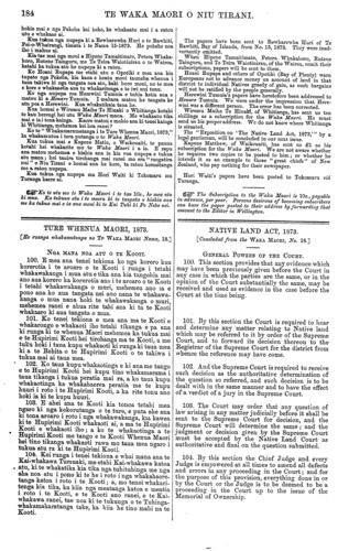 184 TE WAKA MAORI O NIU TIRANI. hokia mai e nga Pakeha kai hoko, ka whakaatu mai i a ratou utu e whakaae ai. Kua tukua nga nupepa ki a Rewharewha Huri o te Rawhiti, Pei-o-Whairangi, timata i te Nama 15-1873. He pohehe noa iho i mahue ai. Kia tae mai nga moni a Hipene Tamaitimate, Petera Whaka- horo, Rutene Tainguru, me Te Teira Waiotinirau o te Wairoa, katahi ka tukua atu he nupepa ki a ratou. Ko Hoani Rupapa me etahi atu o Opotiki e mea ana kia tupato nga Pakeha, kia kaua e hoatu moni taunaha whenua i taua takiwa ki nga tangata noa atu, kaki horo moni, no te mea e kore e whakaaetia aua tu whakaritenga e te iwi nui tonu. Ko nga nupepa ma Herewini Tumuia e tuhia ketia ana e matou ki a Henare Tumuia. I mahara matou he tangata ke atu pea a Herewini. Kua whakatikaia taua he. Kua homai e Wiremu Maihe Te Hinaki o Whitianga kotahi te kau herengi hei utu Waka Maori mana. Me whakaatu tika mai e ia i tona kainga. Kaore matou e mohio ana ki tenei kainga ki Whitianga, mehemea kei hea ranei ? Ko te " Whakamaramatanga i te Ture Whenua Maori, 1873," ka whakamutua i tera putanga o te Waka Maori. Kua tukua mai e Kapene Matiu, o Waikouaiti, te pauna kotahi hei whakarite mo te Waka Maori i a ia. E rapu ana matou mehemea e hiahia ana ia kia rua nupepa e tukua atu mana; hei tauira tirohanga mai ranei mo era " rangatira nui " o Niu Tirani e homai ana he kore, ta ratou homaitanga mo a ratou nupepa. Kua tukua nga nupepa ma Hori" Waiti ki Tokomaru ma Turanga haere ai. Ko te utu mo te Waka Maori i te tau 10s., he mea utu ki mua. Ka tukuna atu i te meera ki te tangata e hiahia ana me ka tukua mai e ia aua moni ki te Kai Tuhi ki Po Neke nei. TURE WHENUA MAORI, 1873. [He roanga whakamutunga no TE WAKA MAORI Nama, 18.] NGA MANA NOA ATU O TE KOOTI. 100. E mea ana tenei tekiona ko nga korero kua korerotia i te aroaro o te Kooti i runga i tetahi whakawakanga i mua atu e tika ana kia tangohia mai ano aua korero ka korerotia ano i te aroaro o te Kooti i tetahi whakawakanga o muri, mehemea ano ia e pono ana ko aua tangata nei ano nana te whakawa- kanga o mua nana hoki te whakawakanga o muri, mehemea ranei e ahua rite tahi ana ki ta te Kooti whakaaro ki aua tangata o mua. 101. Ko tenei tekiona e mea ana ma te Kooti e whakarongo e whakaoti iho tetahi tikanga e pa ana ki runga ki te whenua Maori mehemea ka tukua mai e te Hupirimi Kooti hei tirohanga ma te Kooti, a me tuku hoki i tana kupu whakaoti ki runga ki taua mea ki a te Rehita o te Hupirimi Kooti o te takiwa i tukua mai ai taua mea. 102. Ko taua kupu whakaotinga e ki ana me tango e to Hupirimi Kooti hei kupu tino whakamarama i taua tikanga i tukua peratia mai ra, a ko taua kupu whakaotinga ka whakahaerea peratia me te kupu huuri i roto i te Hupirimi Kooti, a ka rite tonu ano hoki ia ki te kupu huuri. 103. E ahei ana te Kooti kia tonoa tetahi mea ngaro ki nga kokorutanga o te ture, e puta ake ana ki tona aroaro i roto i nga whakawakanga, kia kawea ki te Hupirimi Kooti whakaoti ai, a ma te Hupirimi Kooti e whakaoti iho; a ko te whakaotinga a te Hupirimi Kooti me tango e te Kooti Whenua Maori hei tino tikanga whakaoti rawa mo taua mea ngaro i tukua atu ra ki te Hupirimi Kooti. 104. Kei runga i tenei tekiona e whai mana ana te Kai-whakawa Tumuaki, me etahi Kai-whakawa katoa , atu, ki te whakatika kia tika nga tuhituhinga me nga aha noa atu i pono ki te he i roto i nga whakahaere- tanga katoa i roto i te Kooti; a, mo tenei whakari- tenga kia tika, ka kiia nga meatanga katoa e meatia i roto i te Kooti, e te Kooti ano ranei, e te Kai- whakawa ranei, tae noa ki te tukunga o te Tuhinga- whakamaharatanga take, ka kiia he tino mahi na te Kooti. The papers have been sent to Rewharewha Huri of Te Rawhiti, Bay of Islands, from No. 15, 1873. They were inad- vertently omitted. When Hipene Tamaitimate, Petera Whakahoro, Rutene Tainguru, and Te Teira Waiotinirau, of the Wairoa, remit their subscriptions, papers will be sent to them. Hoani Rupapa and others of Opotiki (Bay of Plenty) warn Europeans not to advance money on account of land in that district to individual Natives greedy of gain, as such bargains will not be ratified by the people generally. Herewini Tumuia's papers have heretofore been addressed to Henare Tumuia. We were under the impression that Here- wini was a different person. The error has been corrected. Wiremu Maihe Te Hinaki, of Whitianga, has sent us ten shillings as a subscription for the Waka Maori. He must send us his proper address. We do not know where Whitianga is situated. The " Exposition on ' The Native Land Act, 1873,' " by a legal gentleman, will be concluded in our next issue. Kapene Matthew, of Waikouaiti, has sent us £1 as his subscription for the Waka Maori. We are not aware whether he requires two copies to be posted to him ; or whether he intends it as an example to those " great chiefs" of New- Zealand, who pay nothing for their newspaper. Hori Waiti's papers have been posted to Tokomaru via Turanga. The Subscriptlon to the Waka Maori is 10s., payable in advance, per year. Persons desirous of becoming subscribers can have the paper posted to their address by forwardwg that amount to the Editor in Wellington. NATIVE LAND ACT, 1873. [Concluded from the WAKA MAORI, No. 18.] GENERAL POWERS OF THE COURT. 100. This section provides that any evidence which may have been previously given before the Court in any case in which the parties are the same, or in the opinion of the Court substantially the same, may be received and used as evidence in the case before the Court at the time being. 101. By this section the Court is required to hear and determine any matter relating to Native land which may be referred to it by order of the Supreme Court, and to forward its decision thereon to the Registrar of the Supreme Court for the district from whence the reference may have come. 102. And the Supreme Court is required to receive such decision as the authoritative determination of the question so referred, and such decision is to be dealt with in the same manner a
