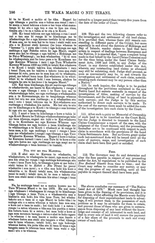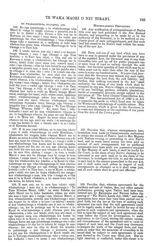TE WAKA MAORI O NIU TIRANI. 185 HE WHAKARITENGA NOATANGA. ATU. 105. Ko nga panuitanga o te whakakorenga take Maori ki runga ki tetahi whenua e panuitia ana ki roto ki te Kahiti o Niu Tirani, e kiia ana na te Kawana, na raro ranei i tona mana, ka waiho aua panuitanga hei tino whakaritenga i taua whakako- renga take e matauria ai, e mohiotia ai hold taua whenua kua mutu tona whenua-Maoritanga ki ta te tikanga o te Ture hou. 106. I tetahi takiwa noa atu i muri o te karaati- tanga whenua i raro i nga tikanga, o nga Ture tawhito, o te Ture hou ranei, e tika aua ma. te Kawana e tango e whakatakoto, hei tikanga mo te katoa, tetahi etahi ranei rama rori, rerewe ranei, i roto i aua whenua; otira ka huia katoatia aua whenua e tangohia peratia aua, e kore e pai kia pahika ake i te ritenga o to rima eka i roto i te kotahi rau eka. Engari kua whakaritea he mea ahei ano ma te Kawana e whakarere atu i taua ritenga ki runga ki tetahi whenua, a ka whakawateatia atu taua whenua kia watea i taua ritenga ; tetahi, kua whakaritea ano hoki kia kore e waiho nga tikanga i roto i te Ture hou "hei tikanga e tika ai te tango i etahi wahi whenua kua turia e etahi pa Maori, kainga Maori ranei, mahinga kai ranei, etahi whare ranei, ngakinga ranei, whakatupuranga rakau hua ranei hei kai, rakau noa atu ranei, whenua whakapaipai ranei, tanumanga tupapaku ranei, haunga nga whenua e tangohia ana i raro i nga tikanga o ' Te Ture Huinga Tikanga Whenua, 1803." Ko tenei Ture i wha- kahuatia i muri nei he mea whakatakoto tikanga ia mo te tangohanga whenua hoi papa mo nga Mahinga nui o te Motu nei. Engari ko tenei mana (tango whenua nei mo nga rori) me mutu i te mutunga iho o nga tau kotahi te kau e timata ana i te ra i tuhia ai te Karauna karaati. 107. E ki ana tenei tekiona, no te mea kua takoto i mua ai etahi whakaritenga na etahi Komihana, i whakaturia hei tangata hoko whenua Maori mo te Kuini, na ratou ko etahi Maori e whai whenua ana, e ki kau ana ranei he whenua ta ratou, a i runga i etahi o aua whakaritenga kua hoatu ano he moni taunaha, engari kaore ano kia ata oti noa nga tikanga, kaore ano hoki kia riro noa mai aua whenua ki a to Kuini; na he mea tika, ahakoa i runga i te tono a tetahi Maori e mea ana he tikanga tana ki runga ki taua whenua, i runga ranei i te tono a te Kawana, he mea tika kia whakawakia kia kimihia e te Kooti te whai- taketanga me nga whai-tikangatanga ki taua whenua i runga i nga tikanga me nga ritenga kua whakata- kotoria i roto i te Ture hou ; a ma te Kooti e whaka- puta i etahi ota (ara he kupu whakaoti) mo runga i aua whakaritenga o mua, kua kiia i runga ra, e tika ana ki ta te Kooti whakaaro, a ka mana tonu aua tu ota katoa, ka tuturu tonu. 108. E mea ana, no to mea kua takoto etahi whakaritenga i mua atu o te whakaturanga o " Te Ture Whenua Maori, 1865," na etahi Pakeha me etahi Maori mo te hoko harakeke, rakau, me etahi atu mea e tupu ana i runga i nga whenua Maori, a kua whakahaeretia ponotia aua whakaritenga i muri nei, engari ko te ahua o te ture i to takiwa i meatia ai aua whakaritenga e whakahe ana ki aua tu whaka- ritenga ; na, kei te putanga mai ki te aroaro o te Kooti te whai-taketanga o etahi whenua pera kia whakawakia, e tika ana tetahi, etahi noa atu ranei, o nga tangata nana aua whakaritenga kia homai ta ratou tono ki te Kooti, a me whakaatu e ratou nga tikanga katoa me nga peheatanga noatanga atu o aua whakaritenga e ki ana kai te takoto ki runga ki aua whenua; hei reira ka tika te Kooti kia kimihia te peheatanga o aua tikanga e korerotia ana, a e pai ana kia whakaputaina e te Kooti tetahi ota mo te Tuhinga-whakamaharatanga take e tukua ana, kia waihotia i raro i te mana o aua whakaritenga, MISCELLANEOUS PEO VISIONS. 105. Any notification of extinguishment of Native title over any land published in the yew Zealand Gazette, and purporting to be made by or by the authority of the Governor, is to be received as con- clusive proof of such extinguishment, and that such land has ceased to be Native land within the mean- ing of the new Act. 106. From and out of any land which may have been or may bo granted under the provisions of any of the repealed Acts, the Governor may at any time thereafter take and lay off for public purposes one or more lines of road or railway through the said lands ; but the total quantity of land which may be so taken must not bo more than after the rate of five acres in every one hundred acres. It is provided, how- ever, that the Governor may release any such right, and discharge the land from the said liability ; and further, that nothing contained in the Act " shall authorize the taking of any lands which shall bo occupied by any pas, Native villages, or cultivations, or by any buildings, gardens, orchards, plantations, burial or ornamental grounds, except subject to the provisions of ' The Land Clauses Consolidation Act, 1863. " This last-mentioned Act of 1863 is an Act to prescribe the mode in which Land may be taken for Works and Undertakings of a public nature. This power, however, which is given to the Governor, is to cease and determine at the expiration of ten years from the date of the Crown grant. 107. Provides that, whereas arrangements have heretofore been made by Commissioners authorized to obtain the cession of Native land to Her Majesty with Natives owning, or pretending to own, Native land, and in some cases money has been paid on account of such arrangements, but no perfected agreements have been made nor possession acquired by Her Majesty of such lands, it shall be lawful for the Court, in the claim of any Native claiming to be interested in any such land, or in the claim of the Governor, to investigate the title to and the interest in such land in the manner prescribed in the new Act, and it shall make such orders in respect of such arrangements as aforesaid as to it shall seem just, and all such orders shall be good and effectual. 108. Provides that, whereas agreements for the purchase and sale of timber, flax, and other natural producti