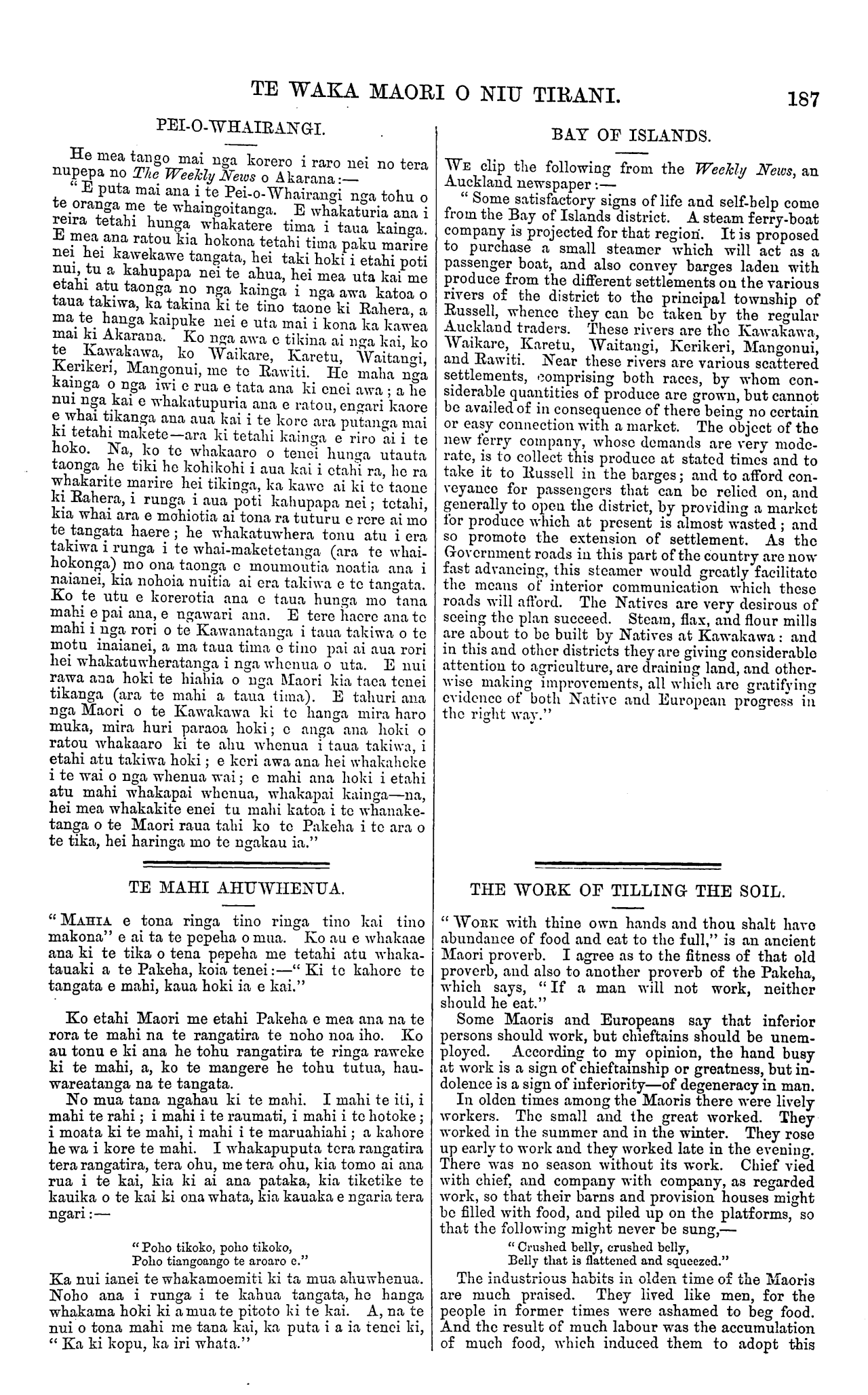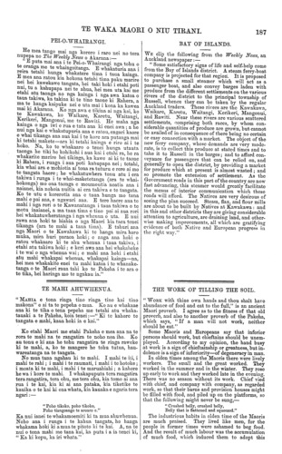 TE WAKA MAORI O NIU TIRANI. 187 PEI-O-WHAIRANGI. He mea tango mai nga korero i raro nei no tera nupepa no The Weekly News o Akarana:— "E puta mai ana i te Pei-o-Whairangi nga tohu o te oranga me te whaingoitanga. E whakaturia ana i reira tetahi hunga whakatere tima i taua kainga. E mea ana ratou kia hokona tetahi tima paku marire nei hei kawekawe tangata, hei taki hoki i etahi poti nui tu a kahupapa nei te ahua, hei mea uta kai me etahi atu taonga no nga kainga i nga awa katoa o taua takiwa, ka takina ki te tino taone ki Rahera, a ma te hanga kaipuke nei e uta mai i kona ka kawea mai ki Akarana. Ko nga awa o tikina ai nga kai, ko te Kawakawa, ko Waikare, Karetu, Waitangi, Kerikeri, Mangonui, me to Rawiti. He maha nga kainga o nga iwi e rua e tata ana Id enei awa ; a he nui nga kai e whakatupuria ana e rato u, engari kaore e whai tikanga ana aua kai i te kore ara putanga mai ki tetahi makete—ara ki tetahi kainga e riro ai i te hoko. Na, ko to whakaaro o tenei hunga utauta taonga ae tiki he kohikohi i aua kai i etahi ra, he ra whakarite marire hei tikinga, ka kawe ai ki to taone ki Rahera, i runga i aua poti kahupapa nei; tetahi, kia whai ara e mohiotia ai tona ra tuturu e rere ai mo te tangata haere ; he whakatuwhera tonu atu i era takiwa i runga i to whai-maketetanga (ara te whai- hokonga) mo ona taonga, e moumoutia noatia ana i naianei, kia nohoia nuitia ai era takiwa e te tangata. Ko te utu e korerotia ana e taua hunga mo tana mahi epai ana, e ngawaki ana. E tere haere ana to mahi i nga rori o te Kawanatanga i taua takiwa o to motu inaianei, a ma taua tima e tino pai ai aua rori hei whakatuwheratanga i nga whenua o uta. E nui rawa ana hoki te hiahia o nga Maori kia taea tenei tikanga (ara te mahi a taua tima). E tahuri ana nga Maori o te Kawakawa ki to hanga mira haro muka, mira huri paraoa hoki; e anga aua hold o ratou whakaaro ki te ahu whenua i taua takiwa, i etahi atu takiwa hoki; e. keri awa ana hei whakaheke i te wai o nga whenua wai; e mahi ana hold i etahi atu mahi whakapai whenua, whakapai kainga—na, hei mea whakakite enei tu mahi katoa i te whanake- tanga o te Maori raua tahi ko te Pakeha i to ara o te tika, hei haunga mo te ngakau ia." TE MAHI AHUWHENUA. " MAHIA e tona ringa tino ringa tino kai tino makona" e ai ta te pepeha o mua. Ko au e whakaae ana ki te tika o tena pepeha me tetahi atu whaka- tauaki a te Pakeha, koia tenei:—" Ki to kahore to tangata e mahi, kaua hoki ia e kai." Ko etahi Maori me etahi Pakeha e mea ana na te rora te mahi na te rangatira te noho noa iho. Ko au tonu e ki ana he tohu rangatira te ringa raweke ki te mahi, a, ko te mangere he tohu tutua, hau- wareatanga na te tangata. No mua tana ngahau ki te mahi. I mahi te iti, i mahi te rahi; i mahi i te raumati, i mahi i to hotoke; i moata ki te mahi, i mahi i te maruahiahi; a kahore he wa i kore te mahi. I whakapuputa tera rangatira tera rangatira, tera ohu, me tera ohu, kia tomo ai ana rua i te kai, kia ki ai ana pataka, kia tiketike te kauika o te kai ki ona whata, kia kauaka e ngaria tera ngari:— " Poho tikoko, poho tikoko, Poho tiangoango te aroaro e." Ka nui ianei te whakamoemiti ki ta mua ahuwhenua. Noho ana i runga i te kahua tangata, ho hanga whakama hoki ki a mua te pitoto ki te kai. A, na te nui o tona mahi me tana kai, ka puta i a ia tenei ki, " Ka ki kopu, ka iri whata." BAY OF ISLANDS. WE clip the following from the Weekly News, an Auckland newspaper:— " Some satisfactory signs of life and self-help come from the Bay of Islands district. A steam ferry-boat company is projected for that region. It is proposed to purchase a small steamer which will act; as a passenger boat, and also convey barges laden with produce from the different settlements on the various rivers of the district to the principal township of Russell, whence they can be taken by the regular Auckland traders. These rivers are the Kawakawa, Waikare, Karetu, Waitangi, Kerikeri, Mangonui, and Kawiti. Near these rivers are various scattered settlements, comprising both races, by whom con- siderable quantities of produce are grown, but cannot bo availed of in consequence of there being no certain or easy connection with a market. The object of the new ferry company, whoso demands are very mode- rate, is to collect this produce at stated times and to take it to Russell in the barges; and to afford con- veyance for passengers that can be relied on, and generally to open the district, by providing a market for produce which at present is almost wasted ; and so promote the extension of settlement. As the Government roads in this part of the country are now fast advancing, this steamer would greatly facilitate the means of interior communication which those roads will afford. The Natives are very desirous of seeing the plan succeed. Steam, flax, and flour mills are about to be built by Natives at Kawakawa ; and in this and other districts they are giving considerable attention to agriculture, are draining land, and other- wise making improvements, all which aro gratifying evidence of both Native and European progress in the right way." THE WORK OF TILLING THE SOIL. " WORK with thine own hands and thou shalt have abundance of food and eat to the full," is an ancient Maori proverb. I agree as to the fitness of that old proverb, and also to another proverb of the Pakeha, which says, " If a man will not work, neither should he eat." Some Maoris and Europeans say that inferior persons should work, but chieftains should be unem- ployed. According to my opinion, the hand busy at work is a sign of chieftainship or greatness, but in- dolence is a sign of inferiority—of degeneracy in man. In olden times among the Maoris there were lively workers. The small and the great worked. They worked in the summer and in the winter. They rose up early to work and they worked late in the evening. There was no season without its work. Chief vied with chief, and company with company, as regarded work, so that their barns and provision houses migh