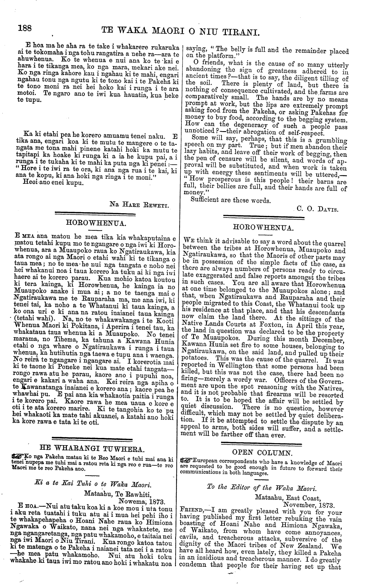188 TE WAKA MAORI O NIU TIRANI. E hoa ma he aha ra te take i whakarere rukaruka ai te tokomaha i nga tohu rangatira a nehe ra—ara te ahuwhenua. Ko te whenua e nui ana ko te kai e hara i te tikanga mea, ko nga mara, mekari ake nei. Ko nga ringa kahore kau i ngahau ki te mahi, engari ngahau tonu nga ngutu ki te tono kai i te Pakeha ki te tono moni ra nei hei hoko kai i runga i te ara motoi. Te ngaro ano te iwi kua hauatia, kua heke te tupu. Ka ki etahi pea he korero amuamu tenei naku. E tika ana, engari koa ki te mutu te mangere o te ta- ngata me tona mahi pinene katahi hoki ka mutu te tapitapi ka hoake ki runga ki a ia he kupu pai, a i runga i te tukaha ki te mahi ka puta nga ki penei;— " Hore i te iwi ra te ora, ki ana nga rua i te kai, ki ana te kopu, ki ana hoki nga ringa i te moni." Heoi-ano enei kupu. Na HARE REWETI. HOROWHENUA. E MEA ana matou he mea tika kia whakaputaina e I matou tetahi kupu mo te ngangare o nga iwi ki Horo- 1 whenua, ara a Muaupoko raua ko Ngatiraukawa, kia ata rongo ai nga Maori o etahi wahi ki te tikanga o taua mea; no te mea he nui nga tangata e noho nei hei whakanui noa i taua korero ka tuku ai ki nga iwi haere ai te korero parau. Kua mohio katoa koutou ki tera kainga, ki Horowhenua, he kainga ia no Muaupoko anake i mua ai; a no te taenga mai o Ngatiraukawa me te Rauparaha ma, me ana iwi, ki tenei tai, ka noho a te Whatanui ki taua kainga, a ko ona uri e ki ana na ratou inaianei taua kainga (tetahi wahi). Na, no te whakawakanga i te Kooti Whenua Maori ki Pokitana, i Aperira i tenei tau, ka whakataua taua whenua ki a Muaupoko. No tenei marama, no Tihema, ka tahuna a Kawana Hunia etahi o nga whare o Ngatiraukawa i runga i taua whenua, ka hutihutia nga taewa e tupu ana i waenga. No reira te ngangare i ngangare ai. I korerotia mai ki te taone ki Poneke nei kua mate etahi tangata— rongo rawa atu he parau, kaore ano i pupuhi noa, engari e kakari a waha ana. Kei reira nga apiha o te Kawanatanga inaianei e korero ana ; kaore pea he whawhai pu. E pai ana kia whakaotia paitia i runga i te korero pai. Kaore rawa he mea uaua e kore e oti i te ata korero marire. Ki te tangohia ko te pu hei whakaoti ka mate tahi akuanei, a katahi ano hoki ka kore rawa e tata ki te oti. HE WHARANGI TUWHERA. Ko nga Pakeha matau ki te Reo Maori e tuhi mai ana ki tenei nupepa me tuhi mai a ratou reta ki nga reo e rua—te reo Maori me te reo Pakeha ano. Ki a te Kai Tuhi o te Waka Maori. Mataahu, Te Rawhiti, Nowema, 1873. E HOA.—Nui atu taku koa ki a koe mou i uta tonu i aku reta tuatahi i tuku atu ai i mua hei pehi iho i te whakapehapeha o Hoani Nahe raua ko Himiona Ngawaka o Waikato, nana nei nga whakatete, me nga ngangaretanga, nga patu whakamoho, e taitaia nei nga iwi Maori o Niu Tirani. Kua rongo katoa tatou ki te matenga o te Pakeha i naianei tata nei i a rato u —he mea patu whakamoho. Nui. atu hoki toku whakahe ki taua iwi mo ratou ano hoki i whakatu noa saying, " The belly is full and the remainder placed on the platform." O friends, what is the cause of so many utterly abandoning the sign of greatness adhered to in ancient times ?—that is to say, the diligent tilling of the soil. There is plenty of land, but there is nothing of consequence cultivated, and the. farms are comparatively small. The hands aro by no means prompt at work, but the lips are extremely prompt asking food from the Pakeha, or asking Pakehas for money to buy food, according to the begging system. How can the degeneracy of such a people pass unnoticed?—their abrogation of self-respect. Some will say, perhaps, that this is a grumbling speech on my part. True; but if men abandon their lazy habits, and leave off their work of begging, then the pen of censure will be silent, and words of ap- proval will be substituted, and when work is taken up with energy these sentiments will be uttered,— <( How prosperous is this people ! their barns are full, their bellies are full, and their hands are full of money." Sufficient are those words. C. O. DAVIS. HOROWHENUA. WE think it advisable to say a word about the quarrel between the tribes at Horowhenua, Muaupoko and Ngatiraukawa, so that the Maoris of other parts may be in possession of the simple facts of the case, as there are always numbers of persons ready to circu- late exaggerated and false reports amongst the tribes in such cases. You are all aware that Horowhenua at one time belonged to the Muaupokos alone; and that, when Ngatiraukawa and Rauparaha and their people migrated to this Coast, the Whatanui took up his residence at that place, and that his descendants now claim the land there. At the sittings of the Native Lands Courts at Foxton, in April this year, the land in question was declared to be the property of Te Muaupokos. During this month December, Kawana Hunia set fire to some houses, belonging to Ngatiraukawa, on the said land, and pulled up their potatoes. This was the cause of the quarrel. It was reported in Wellington that some persons had been killed, but this was not the case, there had been no firing—merely a wordy war. Officers of the Govern- ment are upon the spot reasoning with the Natives, and it is not. probable that firearms will be resorted to. It is to be hoped the affair will be settled by quiet discussion. There is no question, however difficult, which may not be settled by quiet delibera- tion. If it be attempted to settle the dispute by an appeal to arms, both sides will suffer, and a settle- ment will be farther off than ever. OPEN COLUMN. European correspondents who have a knowledge of Maori are requested to be good enough in future to forward their communications in both languages. To the Editor of the Waka Maori. Mataahu, East Coast, November, 1873. FRIEND,—I am greatly pleased with you for your having published my first letter rebuking the vain boasting of Hoani Nahe and Himiona Ngawaka, of Waikato, from whom have come annoyances; cavils, and treacherous attacks, subversive of the dignity of the Maori tribes of New Zeala