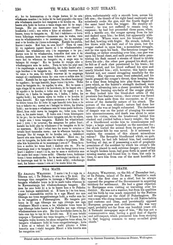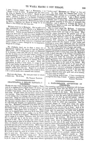 TE WAKA MAORI O NIU TIRANI. 189 i tera "kakaho whati," ara i a Matutaera, i te " Kingi" e ai ki ta ratou. E mahara ana pea rato u he haua te Pakeha, te iwi mohio ? Kaore ra pea. Na, he Maori tonu hoki au, na ka tawai ano au ki a ratou. Ahakoa, e hara au i te Pakeha, e whakapai ana au ki nga whakahaere a tera iwi tangata ke (a te Pakeha); a e hari ana au ki a Wikitoria ano hoki, ki te Kuini o Ingarani, hei Kuini ki runga ki te iwi Maori o Nui Tirani nei ake tonu atu. He kupu tenei mo te Makarini. Kei te mihi au ki nga whakahaere a to tatou Minita a te Makarini e whakau nei ki ia kokorutanga ki ia kokorutanga o tenei motu. Takoto aio ana inaianei te nuinga o nga wahi o te motu nei i to kaha ra o taua tangata ki te whakarata i nga iwi puihi kia rata, a mutu ake aua te noho punanga, kua tahuri anake ki te rapu oranga mo te tinana he kakahu hoki mo to kin, me te whaka- whetai atu ano ki te Atua nana nei i whakahoki mai ratou i runga i o ratou tikanga he ki te rangimarie- tanga me te oranga. He whakaatu tenei mo te ahua o tenei iwi o Ngatiporou inaianei kia matou ai nga hoa Pakeha, Maori hoki. No te taenga mai ra ano o te Makarini ki te Awanui i mua tata ake nei, he takoto marino noa iho te ahua o te iwi, he noho tuturu i runga i te rangimarietanga i roto i te maru o to Kuini Wiki- toria—kaore he mea i raro i to maru o Kingi Matu- taera, kore te tane, te wahine, te tamaiti, kore nga mea katoa o tenei pito o te motu. Kore ona whakaahua, te tohu o toua mana, ki runga ki nga tiki, ki nga taiaha, ki nga mere paraoa, ki nga tewha- tewha, ki nga mere pounamu, ki runga ranei ki nga kakahu, waero kuri, aha atu. Engari ki a te Kuini anake ; te moni koura, te hiriwa, nona anake to ahua, a ko a matou anake era e manaaki ana inaianei. Heoi ano aku kupu. Ka taea pea tenei te tahora e haere aua. Na to hoa, Na TAMATI TAUTUHI. ORAITITANGA O TETAHI TANGATA I TEMERERA. HAERE atu aua i tona kainga tetahi tangata o Teme- rera ki ro ngahere ki te pupuhi haere i te manu, i te kuri ano, o tena whenua. Ho ata i haere atu ai. Ko ia anake i tona haere; otira, he hoa ano ona, ko ona kuri erua. E whai haere ana aua kuri i muri tonu i ona waewae. Tena tona kuri e paingia rawatia ana e ia ka mahue atu i te kainga—ko te kuri toa, kaha rawa tena. Tangi noa taua kuri kia haere tahi i tona ariki, kaore i tukuna—herea ana, mahue ana ki muri. Ko nga mea i mauria ehara i to mea hei whakaora i a ia i nga kuri kai tangata o te ngaherehere, engari ho mau noa. Mehemea i whakaaro ia he mate koi mua, penei, ko te kuri i mahue te mea hei haere te mea kua kitea noatia e ia te kaha, te aroha nui ki a ia, ki tona ariki. Heoi, haere tonu te tangata ra. Haere tonu, mo te pupuhi haere, nawai ra, ka ki tona peeke i te manu. Kotahi te kuri i puhia o ia; he Tia te ingoa—he kai ano na te tangata. Whakama rawatia ana ki runga ki te rakau ; tohutohu rawa, ka waiho iho—e mea ana mo te ata ka tono i tetahi o ona mokai ki te tiki. Ko te hokinga mai i hoki mai ai; Ka whano puta ki waho ki te parae, ka kitea, i tetahi taha o te huarahi e haere atu nei ia, e rua nga mea o puratoke mai ana i roto i te wahi ururua. Mohio tonu ia he kanohi kuri kai tangata e rarama mai ana. He Kouka te ingoa—he kuri ahua rite ki te Taika nei. Katahi ka whakaaro,—"Aue ra; he mate tonu tenei!" Ki te hoki Id muri he mate, ki to haere tonu atu ki mua he mate ano. Kia tupato e tama e; kia toai Kei te ngakau toa anake he oranga mou! Kei to ringa u! kei te kanoti tika! Katahi ka tuku iho te pu ki runga ki te tahau o te ringa maui ta.koto broken reed " Matutaera, or "King," as they call him. Do they think the Pakeha—this people of knowledge and wisdom—is a cowardly and foolish people? They are not so. I am a Maori myself, nevertheless I ridicule them. What though I be not a Pakeha, still I admire the system of management and general economy of this race of strangers (the Pakeha) ; and I rejoice in Victoria, the Queen of England, as a Queen to rule over the Maori people of New Zealand for ever. This is a word about Mr. McLean. I appreciate the labour of our Minister, Mr. McLean, calling in at the various nooks and bays of the island. Tran- quillity reigns throughout the greater part of the island, arising from his exertions in subduing and pacifying the turbulent tribes of the country, who now no longer live in a state of isolation, but are turning their attention to industrial pursuits to acquire means for the support of their bodies and clothing to cover their nakedness, and are thanking God for having brought them back from the error of their ways to the enjoyment of peace and safety. For the information of both Maori and Pakeha friends respecting the present condition of this people, Ngatiporou, I have to state that, since Mr. McLean's visit, a short time ago, to Te Awanui, tranquillity has pre vailed amongst the people. They are living in the peace and under the authority and shelter of Queen Victoria—none acknowledge the authority of King Matutaera, not a single mau, woman, or child, or any other thing in this part of the Island. His likeness, the token of his power, is not upon any of our ornaments, our taiahas, our mere paraoas, our tewhatewhas, or our mere pounamus (weapons made of green-stone, whalebone, or wood, as the case may be), nor upon our clothing, mats, &c. We have the Queen's likeness alone upon gold and silver money, and that alone we respect. I have nothing more to say. I have travelled far enough for this time, I think. I remain, your friend, TAMATI TAUTUHI. A HAIR-BREADTH ADVENTURE IN DEMERARA. ONE morning a gentleman in Demerara left his homo and proceeded alone into the forest on a shooting excursion. He was not absolutely alone, for two hounds followed at his heels. His favourite and powerful bloodhound howled long and plaintively for permission to join the party, but his master was in- exorable; he was tied up and left behind. Indeed, even the two ho took with him were more as com- panions than from any idea he entertained that; their 