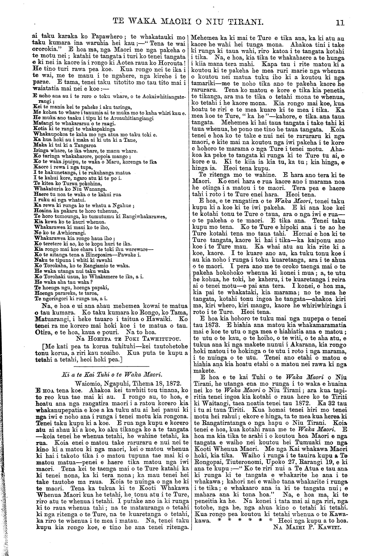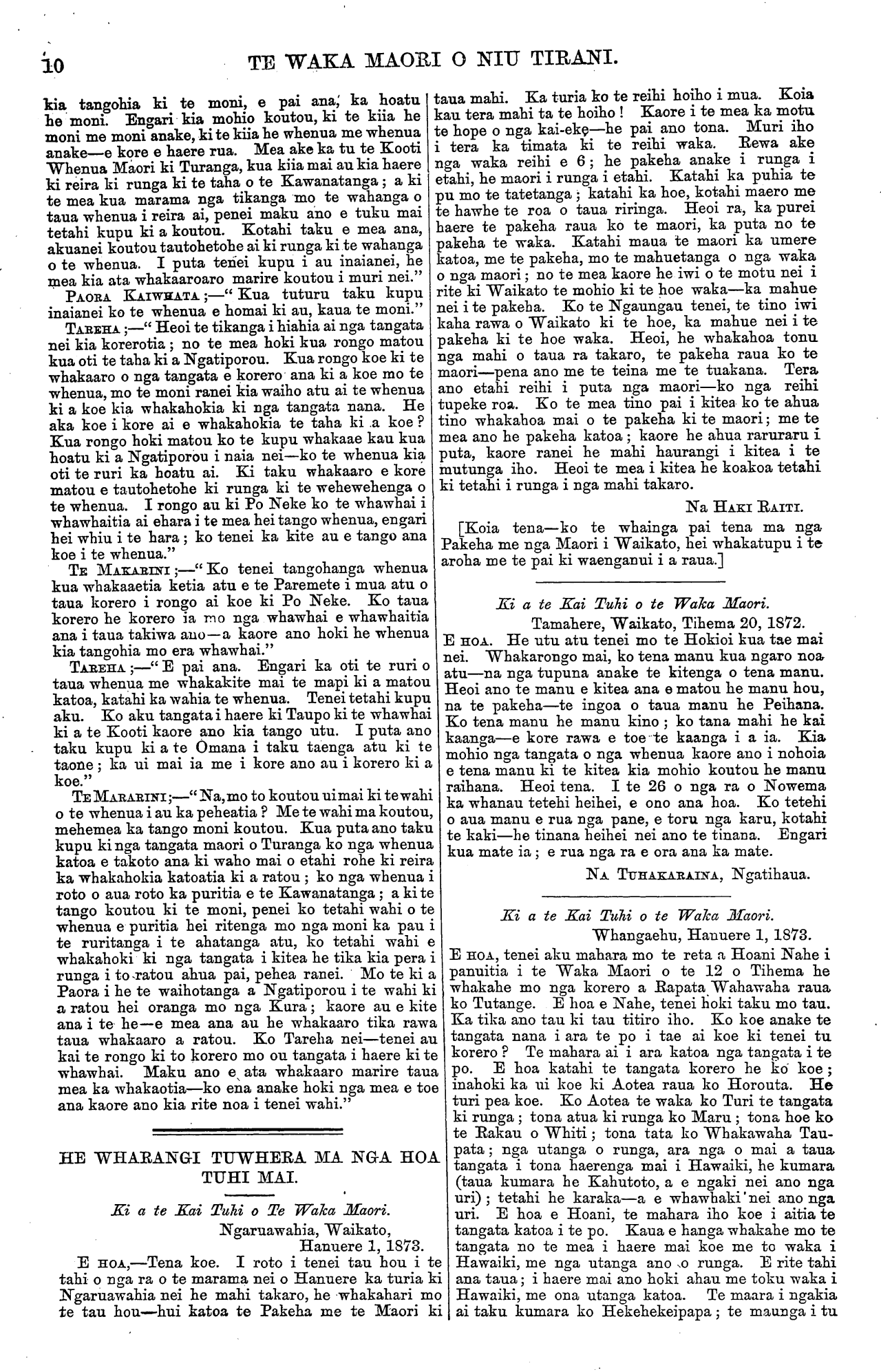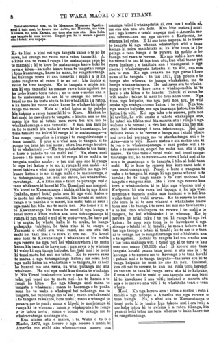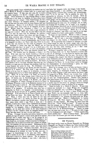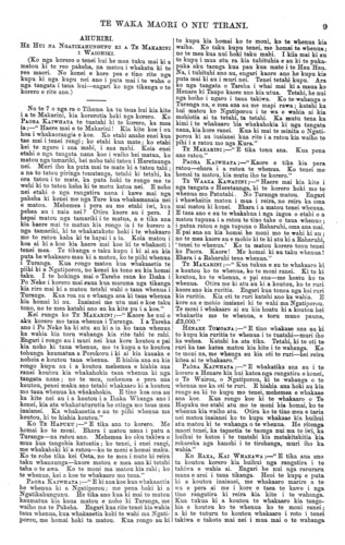 TE WAKA MAORI O NIU TIRANI. "KO TE TIKA, KO TE PONO, KO TE AROHA." VOL. 9.] PO NEKE, WENEREI, HANUERE 22, 1873. [No. 2. HE KUPU ATU ENEI KI NGA HOA TUHI MAI. Ko nga moni enei kua tae mai i muri nei a nga tangata mo a ratou nupepa, ara:— £ s. d. Kapene Matthew o Waikouaiti mo nga tau e rua ... ... ... ... ... 1 O O Irai Tihau o Wairewa, Banks Peninsula ... O 10 O T. Rothwell, Esq., Te Niho o te Kiore ... O 10 O Hoani Nahe o Hotereni Taone, Waikato ... 010 O 1872. Reweti Tapa, Whanganui ... ... 010 O Hakopa Ki wa, ... ... O 10 O 1873. Hakopa Kiwa, ... ... O 10 O Taketake, ... ... O 10 O Ihakara Tukumaru, Manawatu ... O 10 O Noa Te Rauhihi, Reureu ... ... 010 O Hoani Maaka, Matatera ... ... O 10 O Aterea Te Whetu, Whanganui ... O 10 O Poari Kuramate, Whanganui ... O 10 O Te Moanaroa, Patea ... ... O 10 O Tamihana Te Aewa, Putiki ... ... 010 O Paratene Te Wheoro, Putiki ... 010 O 1872. No Ngatiapa enei i raro nei mo nga tau 1872 me 1873: 1873. Reupena Kemetone, Turakina ... 1 O O Hoani Waitere, Turakina ... ... 1 O O Utiku Marumaru, Parewanui ... 1 O O Hoani Hakaraia, ... 1 O O Kawana Ropiha, ... 1 O O Nahona Te Ahukaramu, ... 1 O O 1873-74. Hoani Ngaihi, ... 1 O O Wiremu Kingi, Torere, Opotiki ... 010 O Te Hata, Te Kaha, Opotiki ... 010 O Total ... ... ... 16 10 O Kua kite matou i te reta a Wi te Wheoro mo tona tamaiti e Ia mai nei ia " he tamaiti poriro e kimi ana i tona matua "—ara ko tona pukapuka whakaae ki te utu moni i whakamaoritia e tetahi pakeha ki te reo maori. E mea ana matou he Roia, he Kooti Whakawa, te matua tika mo tena tamaiti, me kawe ki reira. E kore e tau te nupepa hei matua mona—e kore hoki tetahi tangata ke atu e tau. Ki ta matou nei whakaaro ake he tupato noa ta Wi te Wheoro mo taua pukapuka. Ki te rite nga moni i tetahi o nga tangata nana i tuhituhi, e kore hoki e kiia kia utua ano e tetahi, kia tuarua utunga. Engari ki te kore e utua e tetahi, katahi ka kiia ma tetahi e utu a ka rite heoi ano, ka hoki ano te pukapuka ki nga tangata nana—ki ta matou whakaaro ko ta te Ture tenei. Ka kite iho a Wi te Wheoro kua he te tuhinga o taua pukapuka, rae kawe e ia kia tuhia tetahi e te pakeha nana i tuhituhi. Heoi ta matou whakamatuatanga mo taua tamaiti poriro. Tenei te reta a Rewi Raupo o Hiruharama kua tae mai. Kahore tahi he tikanga korero o taua reta e taia atu ai—tetahi e kore e o i te nui o nga reta. Ko ta Hamuera te Raikokiritia hoki, he pena ano—he whakapai kau ki nga korero o nga nupepa e haere atu na. Kua tae mai te reta a Te Watene Te Whiti he whakaatu mai i te matenga o Miriama Hetaraka Nero, he wahine ranga- tira no Ngatihourua hapu o Waikato i Whaingaroa—hei tama- hine ki a Wiremu Nero Te Awaitaia. I hemo i te 8 o nga ra o Nowema kua taha nei, he whakawhanautanga tamaiti. E kore e o ki te nupepa nei taua reta i te nui o te korero. E mea ana matou kia ata tuhi mai koutou i o koutou tangata mate. He tino nui rawa nga reta whakaatu tangata mate e puta mai ana ki a matou. E kore rawa e taea te ta; mehemea ka taia katoatia penei ka kapi katoa te nupepa i te mate anake, te ai he wahi watea mo etahi atu korero. E ki ana a Penetahi Tanuku o Whanganui kua mate tona wahine a Anairi te Auripo—i mate i te 15 o nga ra o Tihema, 1867. Hua noa no naianei i mate ai i tuhi kau mai ai! Hua noa he mea hou. Kati rawa te tuku mai i nga mate tawhito—e kore e panuitia atu a muri ake nei. Ehara te waka nei i te mea hei ekenga mo nga tupapaku anake, engari mo nga tangata ora tetahi wahi. Kaore he tikanga e panuitia ai ki te nupepa nga korero a te kuia o Hone Hira Te Wharetiti (a Heranuku) mo to raua whenua i tona matenga. E ki ana a Irai Tutange o Whanganui kua mate tona matua, a Wharematangi o Ngatihine—i mate ki Putiki i te 8 o nga ra o Hanuere nei. Ko Hone Hira Te Wharetiti e whakapai ana ki te reta a Whiari Turahui mo nga uhunga maori kia kore. Ko Utiku Marumaru o Rangitikei e ki ana kua timata a Ngatiapa ki te kohikohi moni i runga i nga whenua Karaati mo nga tikanga o nga Rori Poata; kua timata hoki ki te mahi mo nga Whare Kura. E ki aua hoki kua tae atu te panui a Wi Parata, a e whakapai ana ia ki taua panui. Tenei te reta a Paora Poutini Ngaiwi o Hiruharama ki Whanganui. Ko etahi enei o nga kupu ki roto, ara;—"Tenei tetahi mahi Kura kua tu ki konei. No te 25 o Tihema i ta ai ta matou hui ki Hiruharama mo te Whare Kura. Kua oti taua korero. Ko nga tangata kei roto i te porohita mo tenei Kura e 70; ko nga pa e 2—ko Hiruharama, ko Kauaeroa." Ko te Reta a Hare Kepa o Little River Wairewa, kaore e tika kia taea ki te nupepa nei. Tenei hoki etahi tangata e tuhituhi reta mai ana kaore i whakaata mai i o ratou ingoa ki roto kia mohiotia ai nga tangata nana—tetahi he korero whaka- kino noa ia ki etahi atu tangata nga korero i roto. E kore e panuitia e matou aua tu reta. Ka tuhi mai te tangata i tana reta me whakaatu pono mai i tona ingoa— a ka kite iho matou kei a matou te whakaaro ki te panui atu, ki te kore ranei.