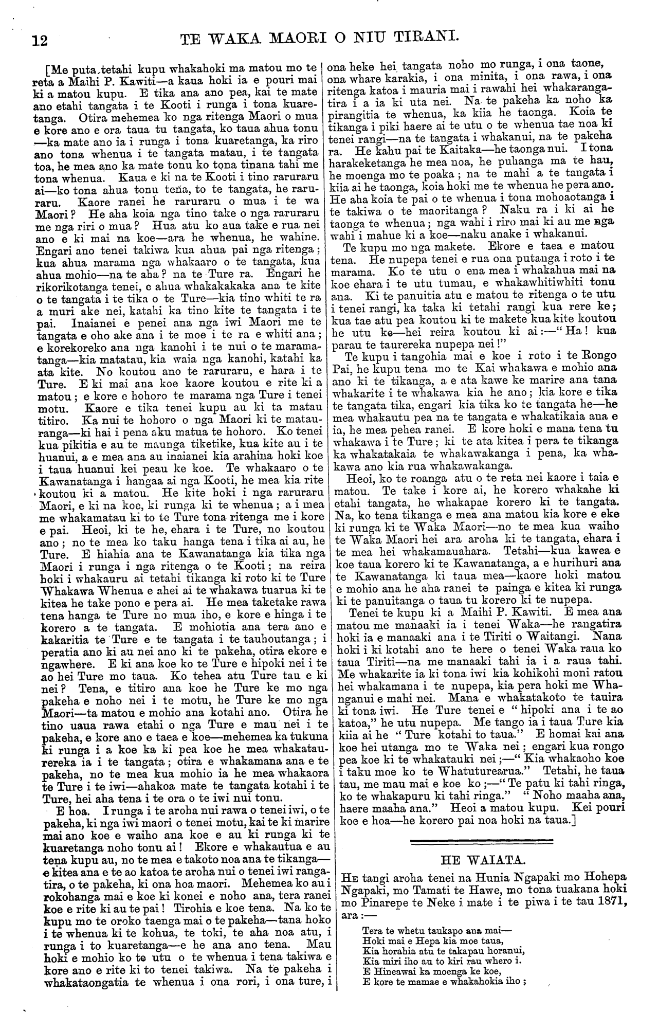 TE WAKA MAORI O NIU TIRANI. 11 ai taku karaka ko Papawhero; te whakatauki mo taku kumara ina waruhia hei kau;—" Tena te wai ororokia." E hoa ma, nga Maori me nga pakeha o te motu nei; katahi te tangata i turi ko tenei tangata e ki nei ia kaore ia i rongo ki Aotea raua ko Horouta! He tino turi rawa pea koe. Kua rongo nei te ika i te wai, me te manu i te ngahere, nga kirehe i te parae. E tama, tenei taku titotito mo tau tito mai i waiatatia mai nei e koe:— E noho ana au i te TOTO o toku whare, o te Aokaiwhitiangate- rangi; Kei te mania kei te paheke i aku taringa, Me kohea to whare i tanumia ai te muka mo to kaha whiri kau e. He muka ano taaku i tipu ki te Aroauhitiangiangi Matangi te whakararau o te rangi. Kotia ki te rangi te whakapakinga Whakaupokoa te kaha mo nga atua mo taku toki e. Ka hua hoki au i maka ai ki uta ki a Tane, Maka ki tai ki a Tangaroa Iringa whare, te ika whare, te manu whare. Ko taringa whakaharore, popoia mango; Ko te waka ipuipu, te waka o Maru, korenga te ika Kaore i rewa i nga tupa, I te hakunetanga, i te rukuhanga matua I te kahui kore, ngaro atu ki te po i. Te kitea ko Turau pokohina, Whakaturia ko Niu Wananga. Haere tu noa te waka o te kahui rua I ruku ai nga whatui. Ka rewa ki runga ko te whatu a Ngahue; Hoaina ka pakaru te horo tuhenua, Te horo tumounga,, ko tumutumu ki Rangiwhakarawea, Kia kewa ko te kauri whenua. Whakarawea ki maui ko te iho, No ko te Awhiorangi. Whakarawea kia rongo haua iho; Ko teretere ki ao, ko te kopu huri te ika. Kia rongo mai koe ehara i te toki ihu wareware— Ko te aitanga tena a Hinepoaira—Pawake i. Naku te tipuna i whiti ki rawahi Ko Torokaha, ko te Rangiamio te waka. He waka utanga nui taku waka Ko Torohaki uaua, ko Whakamere te ika, a i. He waka aha tau waka? Te hoenga ngu, hoenga papaki, Hoenga parareka, te taroa, Te ngoringori ki runga na, a i. Na, e hoa e ui ana ahau mehemea kowai te matua o tau kumara. Ko taku kumara ko Rongo, ko Tama, Matuarangi, i heke tauaro i taitua o Hawaiki. Ko tenei ra me korero mai hoki koe i te matua o tau. Otira, e te hoa, kaua e pouri. Na to hoa. Na HOHEPA TE POKI TAWHITUPOU. [Me kati pea ta korua tuhituhi—kei tautohetohe tonu korua, a riri kau noaiho. Kua puta te kupu a tetahi a tetahi, heoi hoki pea.] Ki a te Kai Tuhi o te Waka Maori. Waiomio, Ngapuhi, Tihema 18, 1872. E HOA tena koe. Ahakoa kei tawhiti tou tinana, ko to reo kua tae mai ki au. I rongo au, to hoa, e hoatu ana nga rangatira maori i a ratou korero kia whakanupepatia e koe a ka tuku atu ai hei panui ki nga iwi e noho ana i runga i tenei motu kia rongona. Tenei taku kupu ki a koe. E rua nga kupu e korero atu ai ahau ki a koe, ko aku tikanga ko a te tangata —koia tenei he whenua tetahi, he wahine tetahi, ka rua. Koia enei o matou take raruraru e nui te kino ki a matou ki nga maori, kei o matou whenua ki hai i takoto tika i o matou tupuna tae mai ki o matou matua—penei e haere tika matou nga iwi maori. Tena kei te taenga mai o te Ture katahi ka ki tenei nona, ka ki tera nona; ka mau tenei hei take tautohe ma raua. Koia te nuinga o nga he ki te maori. Tena ka tukua ki te Kooti Whakawa Whenua Maori kua he tetahi, he tonu atu i te Ture, riro atu te whenua i tetahi. I putake ano ia ki runga ki to raua whenua tahi; na te matauranga o tetahi ki nga ritenga o te Ture, na te kuaretanga o tetahi, ka riro te whenua i te mea i matau. Na, tenei taku kupu kia rongo koe, e tino he ana tenei ritenga. Mehemea ka ki mai te Ture e tika ana, ka ki atu au kaore he wahi hei tunga mona. Ahakoa tini i take ki runga ki taua wahi, riro katoa i te tangata kotahi i tika. Na, e hoa, kia tika te whakahaere a te hunga i kiia mana tera mahi. Kapa tau i rite matou ki a koutou ki te pakeha he mea ruri mane nga whenua o koutou nei matua tuku iho ki a koutou ki nga tamariki—me te noho tika ano te pakeha kaore he raruraru. Tena ko matou e kore e tika kia penetia te tikanga, ara ma te tika o tetahi mona te whenua, ko tetahi i he kaore mona. Kia rongo mai koe, kua hoatu te riri e te mea kuare ki te mea i tika. Ka mea koe te Ture, " ka he"—kahore, e tika. ana taua tangata. Mehemea ki hai taua tangata i take tahi ki taua whenua, he pono me tino he taua tangata. Koia tenei e hoa ko te take e nui nei te raruraru ki nga maori, e kite mai na koutou nga iwi pakeha i te kore e hohoro te marama o nga Ture i tenei motu. Aha- koa ka peke te tangata ki runga ki te Ture tu ai, e kore e u. Ki te kiia ia kia tu, ka tu; kia hinga, e hinga ia. Heoi tena kupu. Te ritenga mo te wahine. E hara ano tera ki te Maori. Ko enei hara e rua kaore ano i marama noa he otinga i a matou i te maori. Tera pea e haere tahi i roto i te Tare enei hara. Heoi tena. E hoa, e te rangatira o te Waka Maori, tenei taku kupu ki a koe ki te iwi pakeha. E ki ana koe kei te kotahi tonu te Ture o taua, ara o nga iwi e rua— o te pakeha o te maori E tika ana. Tenei taku kupu mo tena. Ko te Ture e hipoki ana i te ao he Ture kotahi tena mo taua tahi. Homai e hoa ki te Ture tangata, kaore ki hai i tika—ka kaiponu ano koe i te Ture mau. Ka whai atu au kia rite ki a koe, kaore. I te kuare ano au, ka tuku tonu koe i au kia noho i runga i toku kuaretanga, ara i te ahua o te maori. I pera ano me te oroko taenga mai o te pakeha hokohoko whenua ki konei i mua; a, te utu he kohua, he toki, he kaheru, i te kuaretanga i reira ai o tenei motu—e pai ana tera. I konei, o hoa ma, kia pai te whakataki, kia marama; no te mea he tangata, kotahi tonu ingoa he tangata—ahakoa kiri ma, kiri whero, kiri mangu, kaore he whiriwhiringa i roto i te Ture. Heoi tena. E hoa kia hohoro te tuku mai nga nupepa o tenei tau 1873. -E hiahia ana matou kia whakamaramatia mai e koe te utu o nga mea e hiahiatia ana e matou; te utu o te kau, o te hoiho, o te witi, o te aha atu, e tukua ana ki nga makete nunui i Akarana, kia rongo hoki matou i te hokinga o te utu i roto i nga marama, i te nuinga o te utu. Tenei ano etahi o matou e hiahia ana kia hoatu etahi o a matou nei rawa ki nga makete. E hoa e te kai Tuhi o te Waka Maori o Niu Tirani, 