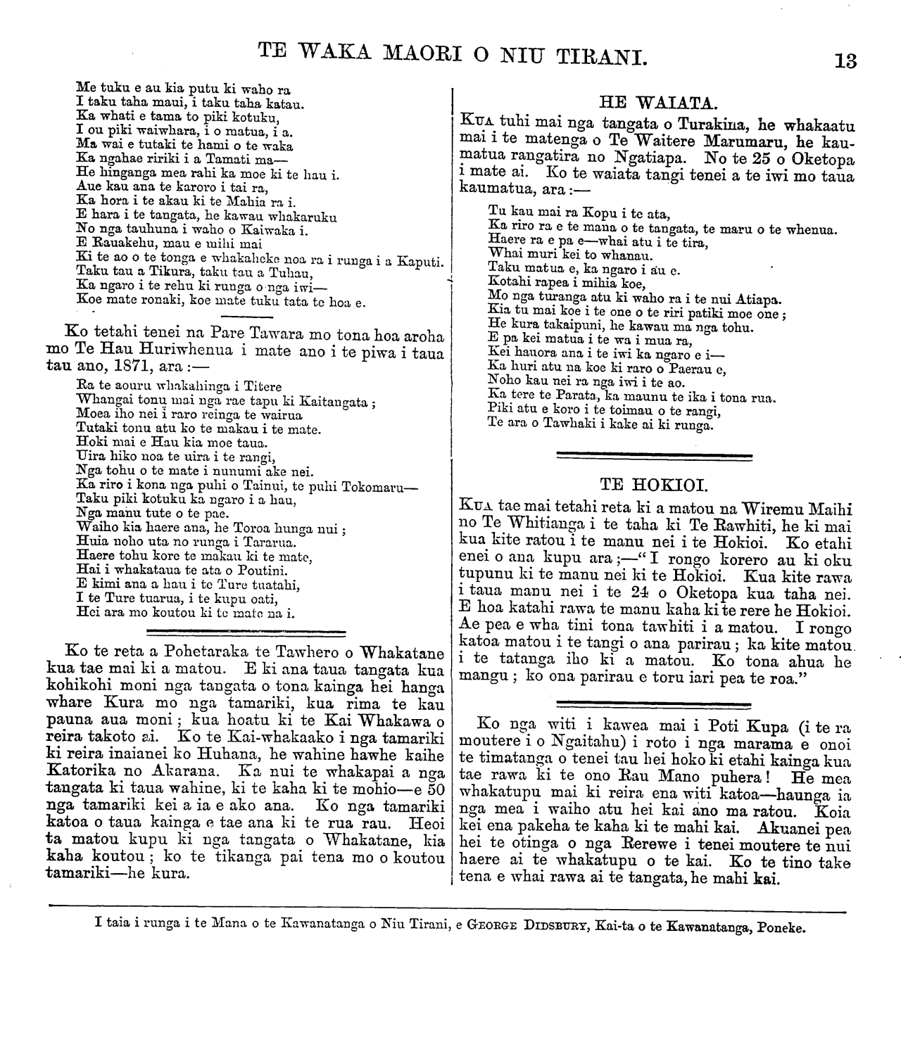 TE WAKA MAORI O NIU TIRANI. 13 Me tuku e au kia putu ki waho ra I taku taha maui, i taku taha katau. Ka whati e tama to piki kotuku, I ou piki waiwhara, i o matua, i a. Ma wai e tutaki te hami o te waka Ka ngahae ririki i a Tamati ma— He hinganga mea rahi ka moe ki te hau i. Aue kau ana te karoro i tai ra, Ka hora i te akau ki te Mahia ra i. E hara i te tangata, he kawau whakaruku No nga tauhuna i waho o Kaiwaka i. E Rauakehu, mau e mihi mai Ki te ao o te tonga e whakaheke noa ra i runga i a Kaputi. Taku tau a Tikura, taku tau a Tuhau, Ka ngaro i te rehu ki runga o nga iwi— Koe mate ronaki, koe mate tuku tata to hoa e. Ko tetahi tenei na Pare Tawara mo tona hoa aroha mo Te Hau Huriwhenua i mate ano i te piwa i taua tau ano, 1871, ara:— Ra te aouru whakahinga i Titere Whangai tonu mai nga rae tapu ki Kaitangata; Moea iho nei i raro reinga te wairua Tutaki tonu atu ko te makau i te mate. Hoki mai e Hau kia moe taua. Uira hiko noa te uira i te rangi, Nga tohu o te mate i nunumi ake nei. Ka riro i kona nga puhi o Tainui, te puhi Tokomaru— Taka piki kotuku ka ngaro i a hau, Nga manu tute o te pae. Waiho kia haere ana, he Toroa hunga nui; Huia noho uta no runga i Tararua. Haere tohu kore te makau ki te mate, Hai i whakataua te ata o Poutini. E kimi ana a hau i te Tura tuatahi, I te Ture tuarua, i te kupu oati, Hei ara mo koutou ki te mate na i. Ko te reta a Pohetaraka te Tawhero o Whakatane kua tae mai ki a matou. E ki ana taua tangata kua kohikohi moni nga tangata o tona kainga hei hanga whare Kura mo nga tamariki, kua rima te kau pauna aua moni; kua hoatu ki te Kai Whakawa o reira takoto ai. Ko te Kai-whakaako i nga tamariki ki reira inaianei ko Huhana, he wahine hawhe kaihe Katorika no Akarana. Ka nui te whakapai a nga tangata ki taua wahine, ki te kaha ki te mohio—e 50 nga tamariki kei a ia e ako ana. Ko nga tamariki katoa o taua kainga e tae ana ki te rua rau. Heoi ta matou kupu ki nga tangata o Whakatane, kia kaha koutou; ko te tikanga pai tena mo o koutou tamariki—he kura. HE WAIATA. KUA tuhi mai nga tangata o Turakina, he whakaatu mai i te matenga o Te Waitere Marumaru, he kau- matua rangatira no Ngatiapa. No te 25 o Oketopa i mate ai. Ko te waiata tangi tenei a te iwi mo taua kaumatua, ara:— Tu kau mai ra Kopu i te ata, Ka riro ra e te mana o te tangata, te maru o te whenua. Haere ra e pa e—whai atu i te tira, Whai muri kei to whanau. Taku matua e, ka ngaro i au e. Kotahi rapea i mihia koe, Mo nga turanga atu ki waho ra i te nui Atiapa. Kia tu mai koe i te one o te riri patiki moe one; He kura takaipuni, he kawau ma nga tohu. E pa kei matua i te wa i mua ra, Kei hauora ana i te iwi ka ngaro e i— Ka huri atu na koe ki raro o Paerau e, Noho kau nei ra nga iwi i te ao. Ka tere te Parata, ka maunu te ika i tona rua. Piki atu e koro i te toimau o te rangi, Te ara o Tawhaki i kake ai ki runga. TE HOKIOI. KUA tae mai tetahi reta ki a matou na Wiremu Maihi no Te Whitianga i te taha ki Te Rawhiti, he ki mai kua kite ratou i te manu nei i te Hokioi. Ko etahi enei o ana kupu ara;—" I rongo korero au ki oku tupunu ki te manu nei ki te Hokioi. Kua kite rawa i taua manu nei i te 24 o Oketopa kua taha nei. E hoa katahi rawa te manu kaha kite rere he Hokioi. Ae pea e wha tini tona tawhiti i a matou. I rongo katoa matou i te tangi o ana parirau; ka kite matou. i te tatanga iho ki a matou. Ko tona ahua he mangu; ko ona parirau e toru iari pea te roa." Ko nga witi i kawea mai i Poti Kupa (i te ra moutere i o Ngaitahu) i roto i nga marama e onoi te timatanga o tenei tau hei hoko ki etahi kainga kua tae rawa ki te ono Rau Mano puhera! He mea whakatupu mai ki reira ena witi katoa—haunga ia nga mea i waiho atu hei kai ano ma ratou. Koia kei ena pakeha te kaha ki te mahi kai. Akuanei pea hei te otinga o nga Rerewe i tenei moutere te nui haere ai te whakatupu o te kai. Ko te tino take tena e whai rawa ai te tangata, he mahi kai. I taia i runga i te Mana o te Kawanatanga o Niu Tirani, e GEORGE DIDSBURY, Kai-ta o te Kawanatanga, Poneke.