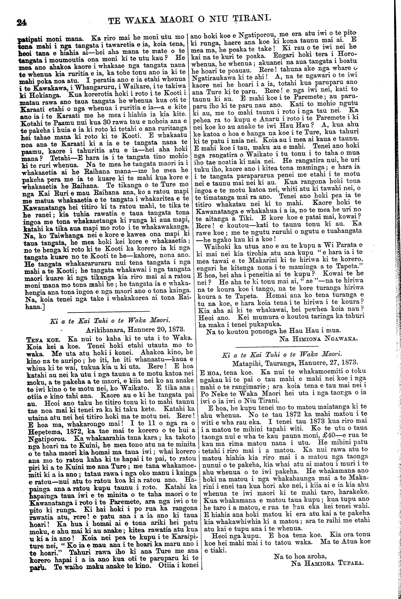 TE WAKA MAORI O NIU TIRANI. patipati moni mana. Ka riro mai he moni utu mo tona mahi i nga tangata i tawaretia e ia, koia tena, heoi tana e hiahia ai—hei aha mana te mate o te tangata i moumoutia ona moni ki te utu kau? He mea ano ahakoa kaore i whakaae nga tangata nana te whenua kia ruritia e ia, ka tohe tonu ano ia ki te mahi poka noa atu. I peratia ano e ia etahi whenua i te Kawakawa, i Whangaruru, i Waikare, i te takiwa ki Hokianga. Kua korerotia hoki i roto i te Kooti i matau rawa ano taua tangata he whenua kua oti te Karaati etahi o nga whenua i ruritia e ia—a e kite ano ia i te Karaati me he mea i hiahia ia kia kite. Kotahi te Paamu nui kua 30 rawa tau e nohoia ana e te pakeha i huia e ia ki roto ki tetahi o ana ruritanga hei tahae mana ki roto ki te Kooti. E whakaatu noa ana te Karaati ti ki a ia e te tangata nana te paamu, kaore i tahuritia atu e ia—hei aha hoki mana? Tetahi—E hara ia i te tangata tino mohio ki te ruri whenua. Na te mea he tangata maori ia i whakaaetia ai he Raihana mana—me he mea he pakeha pera me ia te kuare ki te mahi kua kore e whakaaetia he Raihana. Te tikanga o te Ture mo nga Kai Ruri e mau Raihana ana, ko a ratou mapi me matua whakaaetia e te tangata i whakaritea e te Kawanatanga hei titiro ki ta ratou mahi, te tika te he ranei; kia tuhia rawatia e taua tangata tona ingoa me tona whakaaetanga ki runga ki aua mapi, katahi ka tika aua mapi mo roto i te whakawakanga. Na, ko Taiwhanga nei e kore e kawea ona mapi ki taua tangata, he mea hoki kei kore e whakaaetia; no te henga ki roto ki te Kooti ka korero ia ki nga tangata kuare no te Kooti te he—kahore, nona ano. He tangata whakararuraru nui tena tangata i nga mahi a te Kooti; he tangata whakawai i nga tangata maori kuare ki nga tikanga kia riro mai ai a ratou moni mana mo tona mahi he; he tangata ia e whaka- hengia ana tona ingoa e nga maori ano o tona kainga. Na, koia tenei nga take i whakakorea ai tona Rai- hana.] Ki a te Kai Tuhi o te Waka Maori. Arikihanara, Hanuere 20, 1873. TENA. KOE. Ka nui to kaha ki te uta i to Waka. Koia kei a koe. Tenei hoki etahi utauta mo to waka. Me uta atu hoki i konei. Ahakoa kino, he kino na te auripo; he iti, he iti whakaatu—kaua e whiua ki te wai, tukua kia u ki uta. Rere! E hoa katahi au nei ka utu i nga taunu a te motu katoa nei moku, a te pakeha a te maori, e kiia nei ko au anake te iwi kino o te motu nei, ko Waikato. E. tika ana; otiia e kino tahi ana. Kaore au e ki he tangata pai au. Heoi ano taku he titiro tonu ki to mahi taunu tae noa mai ki tenei ra ka ki taku kete. Katahi ka utaina atu nei hei titiro hoki ma te motu nei. Rere! E hoa ma, whakarongo mai! I te 11 o nga ra o Hepetema, 1872, ka tae mai te korero o te hui a Ngatiporou. Ka whakaarahia tana kara; ka takoto nga hoari na te Kuini, he mea tono atu na te minita o te taha maori kia homai ma taua iwi; whai korero ana mo to ratou kaha ki te hapai i te pai, to ratou piri ki a te Kuini me ana Ture; me tana whakamoe- miti ki a ia ano; tatau rawa i nga oko manu i kainga e ratou—nui atu to ratou koa ki a ratou ano. Ha- painga ana a ratou kupu taunu i roto. Katahi ka hapainga taua iwi e te minita o te taha maori o te Kawanatanga i roto i te Paremete, ara nga iwi o te pito ki runga. Ki hai hoki i po rua ka rangona rawatia atu, rere! e patu ana i a ia ano ki taua hoari! Ka hua i homai ai e tona ariki hei patu moku, e ahu mai ki au anake; kitea rawatia atu kua u ki a ia ano! Koia nei pea te kupu i te Karaipi- ture nei, " Ko ia e mau ana i te hoari ka maru ano i te hoari." Tahuri rawa iho ki ana Ture me ana korero hapai i a ia ano kua oti te paruparu ki te paru. Te waiho maku anake te kino. Otiia i konei ano hoki koe e Ngatiporou, me era atu iwi o te pito ki runga, haere ana koe ki kona taunu mai ai. E mea ma, he poaka te take! Ki rau o te iwi nei he kai na te kuri te poaka. Engari hoki tera i Horo- whenua, he whenua; akuanei na aua tangata i hoatu he hoari te poauau. Rere! tahuna ake nga whare o Ngatiraukawa ki te ahi! A, na te ngawari o te iwi kaore nei he hoari i a ia, totahi kua paruparu ano ana Ture ki te paru. Rere! e nga iwi nei, kati to taunu ki au. E mahi koe i te Paremete; au paru- paru iho ki te paru nau ano. Kati to mohio ngutu ki au, me to mahi taunu i roto i nga tau nei. Ka pehea ra to kupu e Anaru i roto i te Paremete i ki nei koe ko au anake te iwi Hau Hau? A, kua ahu ke katoa o hoa e hanga na koe i te Ture, kua tahuri ki te patu i naia nei. Koia au i mea ai kaua e taunu. E mahi koe i tau, maku au e mahi. Tenei ano hoki nga rangatira o Waikato i tu tonu i to taha o mua iho tae noatia ki naia nei. He rangatira nui, he uri tuku iho, kaore ano i kitea tona maminga; e hara ia i te tangata parapararua penei me etahi i te motu nei e taunu mai nei ki au. Kua rangona hoki tona ingoa e te motu katoa nei, whiti atu ki tawahi nei, o te timatanga mai ra ano. Tenei ano hoki pea ia te titiro whakatau nei ki to mahi. Kaore hoki te Kawanatanga e whakahua i a ia, no te mea he uri no te aitanga a Tiki. E kore koe e patai mai, kowai? Rere! e koutou—kati to taunu tonu ki au. Ka rawe koe; me te ngutu ruruhi o ngutu e tuahangata —he ngako kau ki a koe! Waihoki ka utua ano e au te kupu a Wi Parata e ki mai nei kia tirohia atu ana kupu " e hara ia i te mea tawai e te Makarini ki te hiriwa ki te korero, engari he kitenga nona i te maminga a te Tapeta." E hoa, hei aha i peneitia ai te kupu? Kowai te he nei? He aha te ki tonu mai ai, " ae "—na te hiriwa na te koura koe i tango, na te kore turanga hiriwa koura a te Tapeta. Homai ana ko tena turanga e tu na koe, e hara koia tena i te hiriwa i te koura? Kia aha ai ki te whakawai, hei pewhea koia nau? Heoi ano. Kei mumura o koutou taringa ka tahuri ka maka i tenei pukapuka. Na to koutou pononga he Hau Hau i mua. Na HIMIONA NGAWAKA. Ki a te Kai Tuhi o te Waka Maori. Matapihi, Tauranga, Hanuere, 27, 1873. E HOA, tena koe. Ka nui te whakamoemiti o toku ngakau ki te pai o tau mahi e mahi nei koe i nga mahi o te rangimarie; ara koia tena e tau mai nei i Po Neke te Waka 