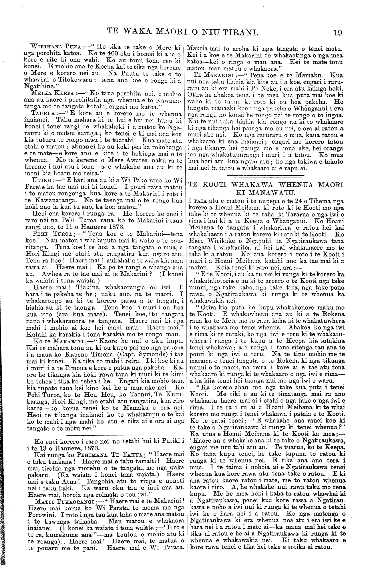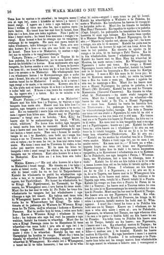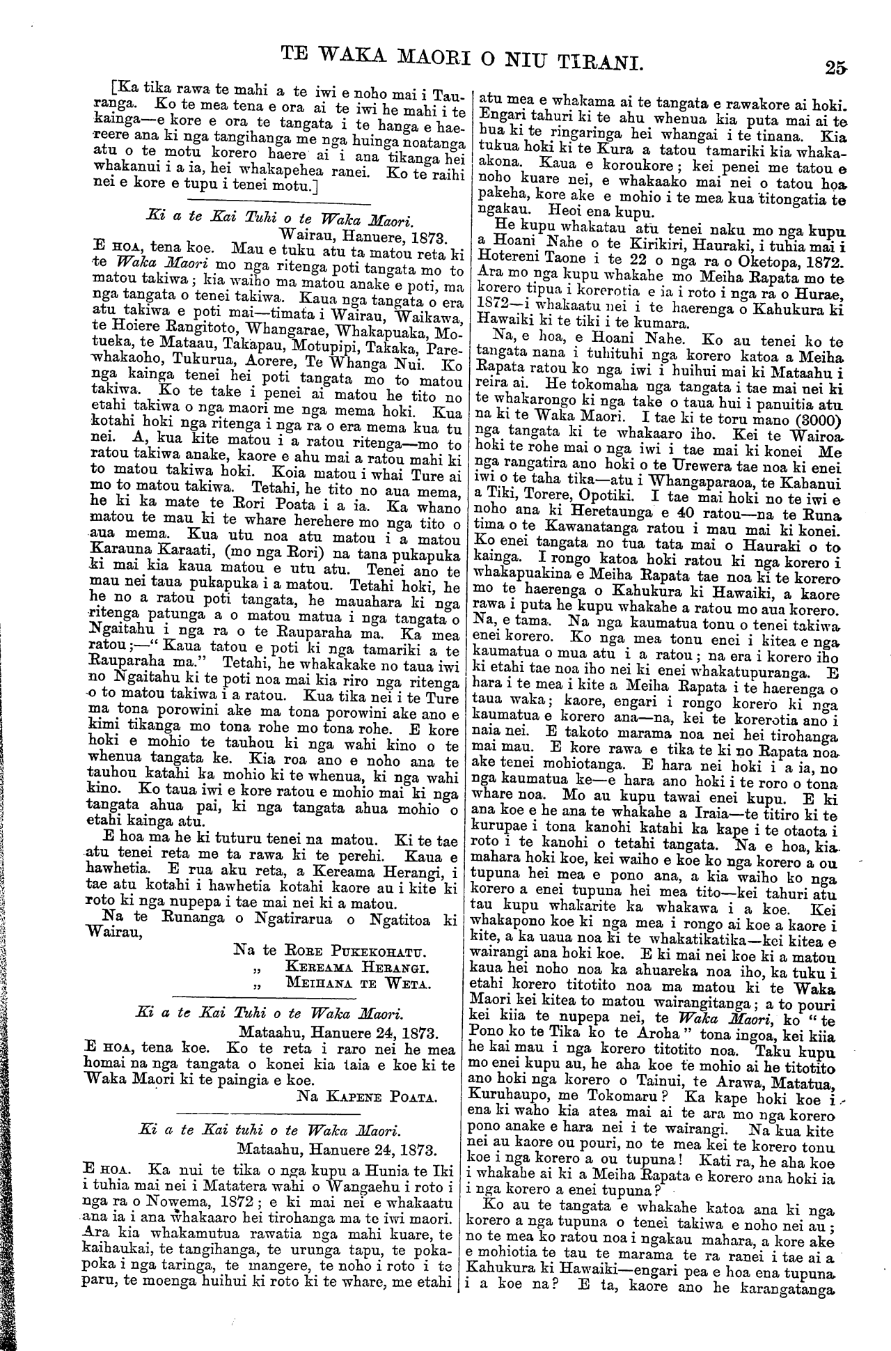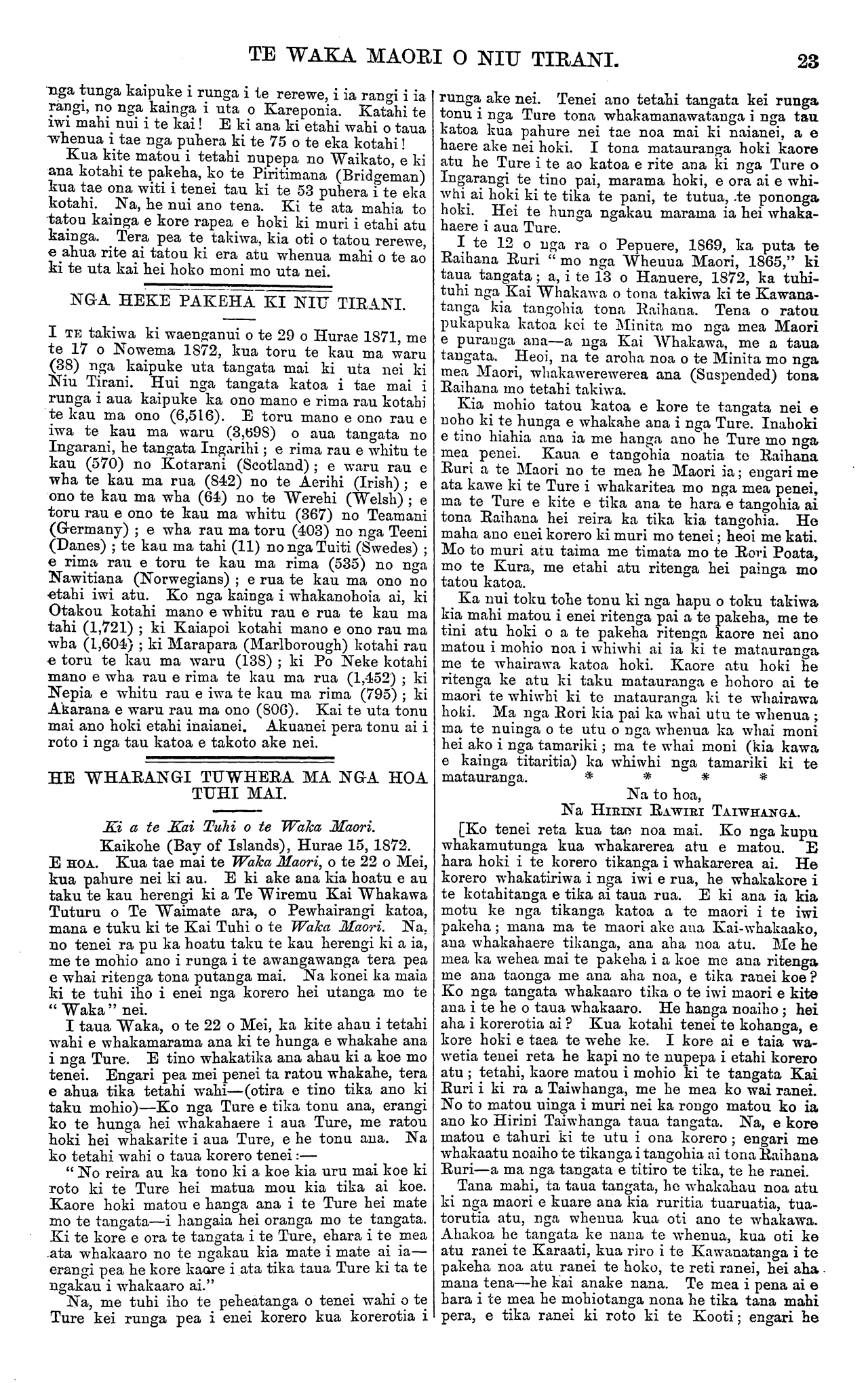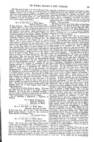 TE WAKA MAORI O NIU TIRANI. [Ka tika rawa te mahi a te iwi e noho mai i Tau- ranga. Ko te mea tena e ora ai te iwi he mahi i te kainga—e kore e ora te tangata i te hanga e hae- reere ana ki nga tangihanga me nga huinga noatanga atu o te motu korero haere ai i ana tikanga hei whakanui i a ia, hei whakapehea ranei. Ko te raihi nei e kore e tupu i tenei motu.] Ki a te Kai Tuhi o te Waka Maori. Wairau, Hanuere, 1873. E HOA, tena koe. Mau e tuku atu ta matou reta ki te Waka Maori mo nga ritenga poti tangata mo to matou takiwa; kia waiho ma matou anake e poti, ma nga tangata o tenei takiwa. Kaua nga tangata o era atu takiwa e poti mai—timata i Wairau, Waikawa, te Hoiere Rangitoto, Whangarae, Whakapuaka, Mo- tueka, te Mataau, Takapau, Motupipi, Takaka, Pare- whakaoho, Tukurua, Aorere, Te Whanga Nui. Ko nga kainga tenei hei poti tangata mo to matou takiwa. Ko te take i penei ai matou he tito no etahi takiwa o nga maori me nga mema hoki. Kua kotahi hoki nga ritenga i nga ra o era mema kua tu nei. A, kua kite matou i a ratou ritenga—mo to ratou takiwa anake, kaore e ahu mai a ratou mahi ki to matou takiwa hoki. Koia matou i whai Ture ai mo to matou takiwa. Tetahi, he tito no aua mema, he ki ka mate te Rori Poata i a ia. Ka whano matou te mau ki te whare herehere mo nga tito o aua mema. Kua utu noa atu matou i a matou Karauna Karaati, (mo nga Rori) na tana pukapuka ki mai kia kaua matou e utu atu. Tenei ano te mau nei taua pukapuka i a matou. Tetahi hoki, he he no a Tatou poti tangata, he mauahara ki nga ritenga patunga a o matou matua i nga tangata o Ngaitahu i nga ra o te Rauparaha ma. Ka mea ratou;—" Kaua tatou e poti ki nga tamariki a te Rauparaha ma." Tetahi, he whakakake no taua iwi no Ngaitahu ki te poti noa mai kia riro nga ritenga o to matou takiwa i a ratou. Kua tika nei i te Ture ma tona porowini ake ma tona porowini ake ano e kimi tikanga mo tona rohe mo tona rohe. E kore hoki e mohio te tauhou ki nga wahi kino o te whenua tangata ke. Kia roa ano e noho ana te tauhou katahi ka mohio ki te whenua, ki nga wahi kino. Ko taua iwi e kore ratou e mohio mai ki nga tangata ahua pai, ki nga tangata ahua mohio o etahi kainga atu. E hoa ma he ki tuturu tenei na matou. Ki te tae atu tenei reta me ta rawa ki te perehi. Kaua e hawhetia. E rua aku reta, a Kereama Herangi, i tae atu kotahi i hawhetia kotahi kaore au i kite ki roto ki nga nupepa i tae mai nei ki a matou. Na te Runanga o Ngatirarua o Ngatitoa ki Wairau, Na te ROKE PUKEKOHATU. KEREAMA HERANGI. MEIHANA TE WETA Ei a te Kai Tuhi o te Waka Maori. Mataahu, Hanuere 24, 1873. E HOA, tena koe. Ko te reta i raro nei he mea homai na nga tangata o konei kia taia e koe ki te Waka Maori ki te paingia e koe. Na KAPENE POATA. Ki a te Kai tuhi o te Waka Maori. Mataahu, Hanuere 24, 1873. E HOA. Ka nui te tika o nga kupu a Hunia te Iki i tuhia mai nei i Matatera wahi o Wangaehu i roto i nga ra o Nowema, 1872; e ki mai nei e whakaatu ana ia i ana whakaaro hei tirohanga ma te iwi maori. Ara kia whakamutua rawatia nga mahi kuare, te kaihaukai, te tangihanga, te urunga tapu, te poka- poka i nga taringa, te mangere, te noho i roto i te paru, te moenga huihui ki roto ki te whare, me etahi atu mea e whakama ai te tangata e rawakore ai hoki. Engari tahuri ki te ahu whenua kia puta mai ai te hua ki te ringaringa hei whangai i te tinana. Kia tukua hoki ki te Kura a tatou tamariki kia whaka- akona. Kaua e koroukore; kei penei me tatou e noho kuare nei, e whakaako mai nei o tatou hoa pakeha, kore ake e mohio i te mea kua titongatia te ngakau. Heoi ena kupu. He kupu whakatau atu tenei naku mo nga kupu a Hoani Nahe o te Kirikiri, Hauraki, i tuhia mai i Hotereni Taone i te 22 o nga ra o Oketopa, 1872. Ara mo nga kupu whakahe mo Meiha Rapata mo te korero tipua i korero tia e ia i roto i nga ra o Hurae, 1872—i whakaatu nei i te haerenga o Kahukura ki Hawaiki ki te tiki i te kumara. Na, e hoa, e Hoani Nahe. Ko au tenei ko te tangata nana i tuhituhi nga korero katoa a Meiha Rapata ratou ko nga iwi i huihui mai ki Mataahu i reira ai. He tokomaha nga tangata i tae mai nei ki te whakarongo ki nga take o taua hui i panuitia atu na ki te Waka Maori. I tae ki te toru mano (3000) nga tangata ki te whakaaro iho. Kei te Wairoa hoki te rohe mai o nga iwi i tae mai ki konei Me nga rangatira ano hoki o te Urewera tae noa ki enei iwi o te taha tika—atu i Whangaparaoa, te Kahanui a Tiki, Torere, Opotiki. I tae mai hoki no te iwi e noho ana ki Heretaunga e 40 ratou—na te Runa tima o te Kawanatanga ratou i mau mai ki konei. Ko enei tangata no tua tata mai o Hauraki o to kainga. I rongo katoa hoki Tatou ki nga korero i whakapuakina e Meiha Rapata tae noa ki te korero mo te haerenga o Kahukura ki Hawaiki, a kaore rawa i puta he kupu whakahe a Tatou mo aua korero. Na, e tama. Na nga kaumatua tonu o tenei takiwa enei korero. Ko nga mea tonu enei i kitea e nga kaumatua o mua atu i a ratou; na era i korero iho ki etahi tae noa iho nei ki enei whakatupuranga. E hara i te mea i kite a Meiha Rapata i te haerenga o taua waka; kaore, engari i rongo korero ki nga kaumatua e korero ana—na, kei te korerotia ano i naia nei. E takoto marama noa nei hei tirohanga mai mau. E kore rawa e tika te ki no Rapata noa ake tenei mohiotanga. E hara nei hoki i a ia, no nga kaumatua ke—e hara ano hoki i te roro o tona- whare noa. Mo au kupu tawai enei kupu. E ki ana koe e he ana te whakahe a Iraia—te titiro ki te kurupae i tona kanohi katahi ka kape i te otaota i roto i te kanohi o tetahi tangata. Na e hoa, kia mahara hoki koe, kei waiho e koe ko nga korero a ou tupuna hei mea e pono ana, a kia waiho ko nga korero a enei tupuna hei mea tito—kei tahuri atu tau kupu whakarite ka whakawa i a koe. Kei whakapono koe ki nga mea i rongo ai koe a kaore i kite, a ka uaua noa ki te whakatikatika—kei kitea e wairangi ana hoki koe. E ki mai nei koe ki a matou kaua hei noho noa ka ahuareka noa iho, ka tuku i etahi korero titotito noa ma matou ki te Waka Maori kei kitea to matou wairangitanga; a to pouri kei 