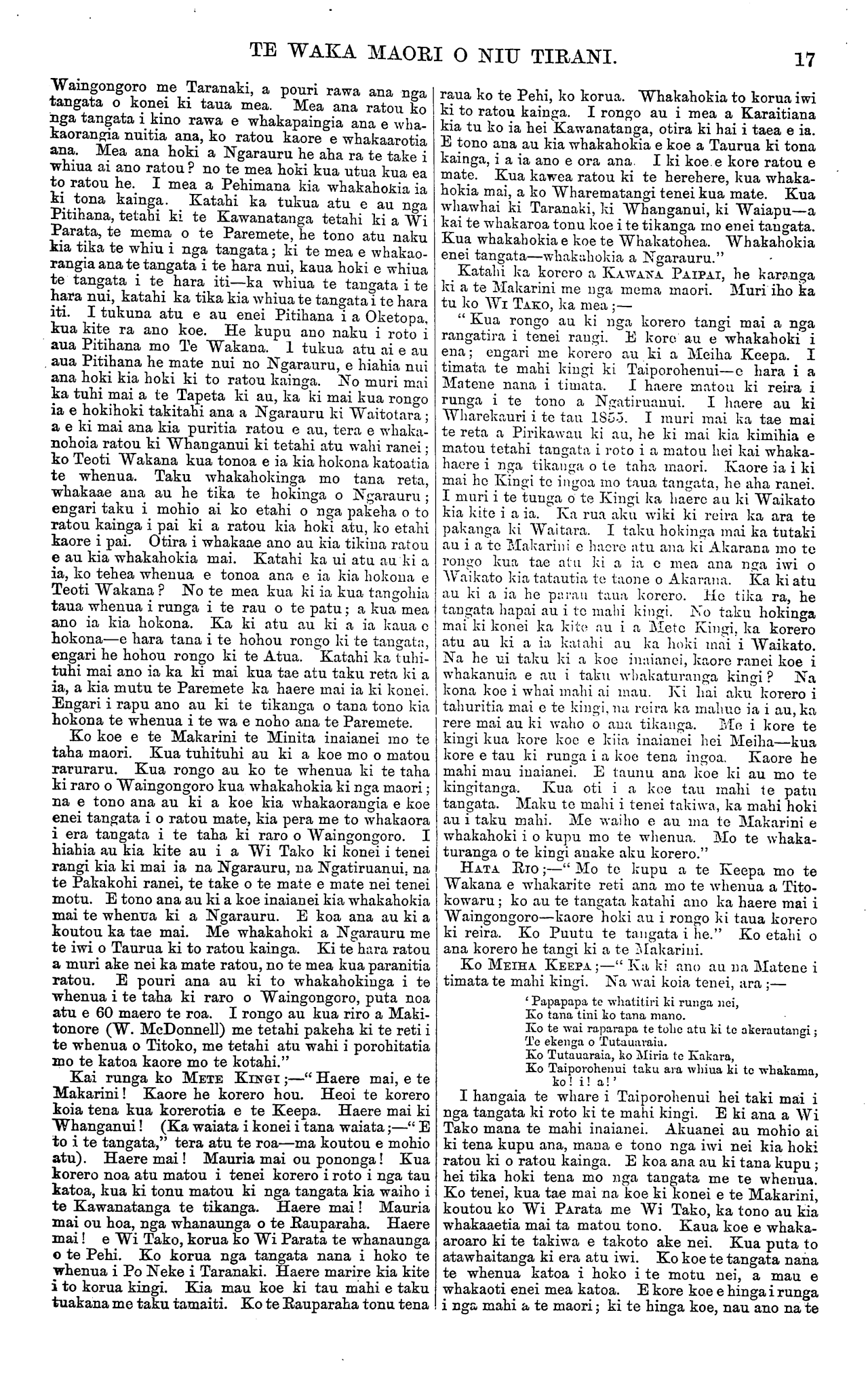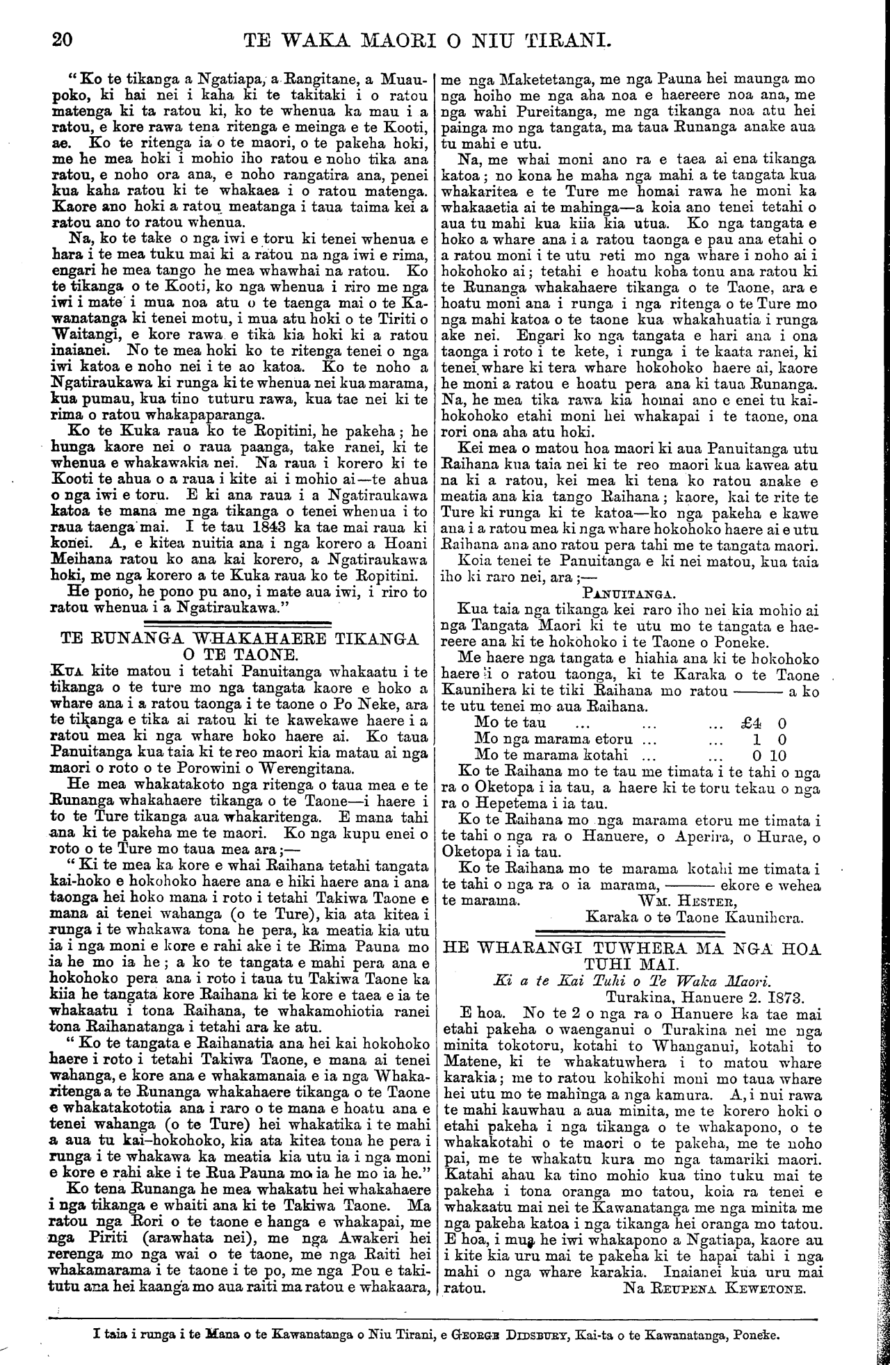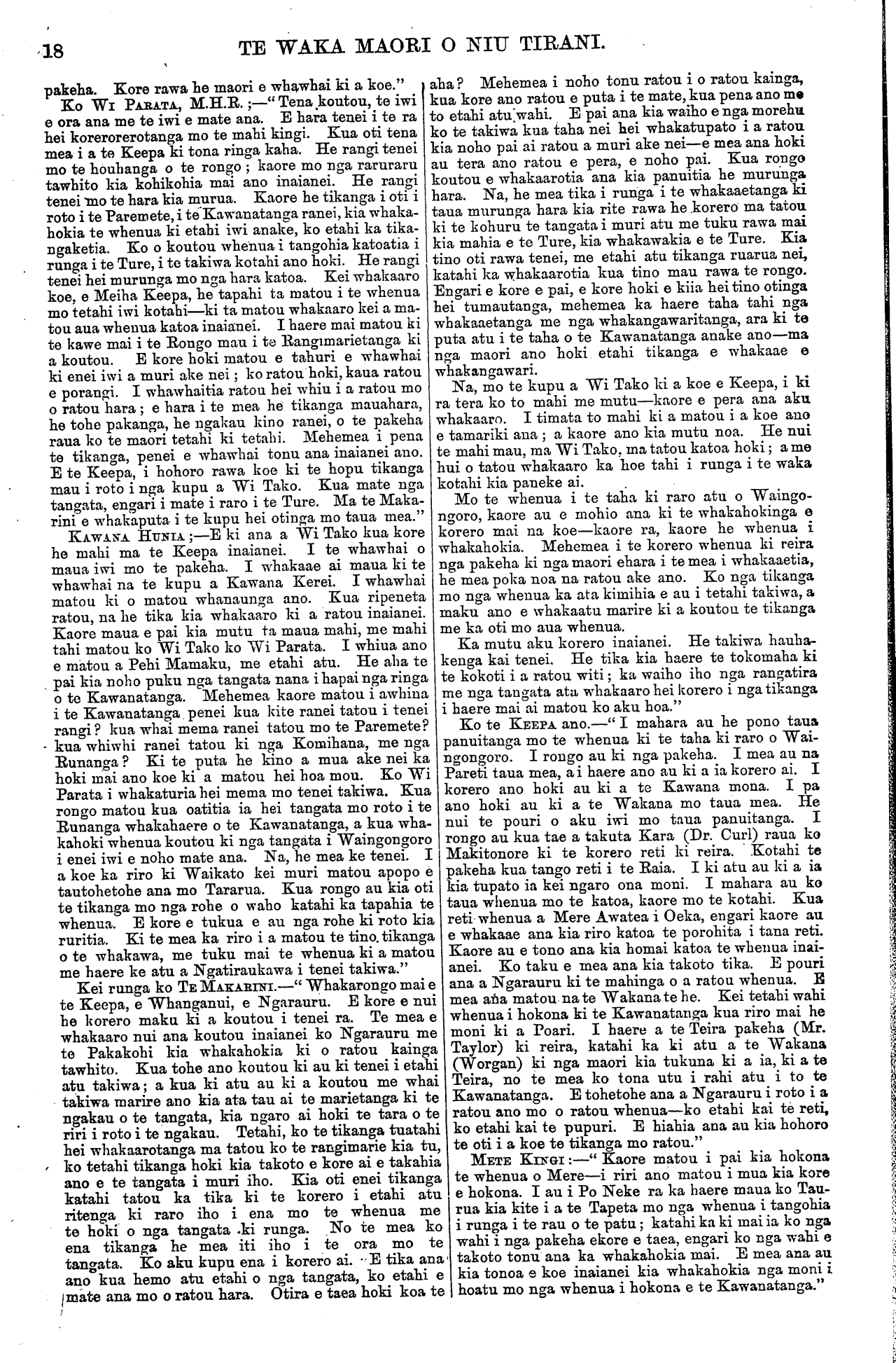 TE WAKA MAORI O NIU TIRANI. [Ka tika rawa te mahi a te iwi e noho mai i Tau- ranga. Ko te mea tena e ora ai te iwi he mahi i te kainga—e kore e ora te tangata i te hanga e hae- reere ana ki nga tangihanga me nga huinga noatanga atu o te motu korero haere ai i ana tikanga hei whakanui i a ia, hei whakapehea ranei. Ko te raihi nei e kore e tupu i tenei motu.] Ki a te Kai Tuhi o te Waka Maori. Wairau, Hanuere, 1873. E HOA, tena koe. Mau e tuku atu ta matou reta ki te Waka Maori mo nga ritenga poti tangata mo to matou takiwa; kia waiho ma matou anake e poti, ma nga tangata o tenei takiwa. Kaua nga tangata o era atu takiwa e poti mai—timata i Wairau, Waikawa, te Hoiere Rangitoto, Whangarae, Whakapuaka, Mo- tueka, te Mataau, Takapau, Motupipi, Takaka, Pare- whakaoho, Tukurua, Aorere, Te Whanga Nui. Ko nga kainga tenei hei poti tangata mo to matou takiwa. Ko te take i penei ai matou he tito no etahi takiwa o nga maori me nga mema hoki. Kua kotahi hoki nga ritenga i nga ra o era mema kua tu nei. A, kua kite matou i a ratou ritenga—mo to ratou takiwa anake, kaore e ahu mai a ratou mahi ki to matou takiwa hoki. Koia matou i whai Ture ai mo to matou takiwa. Tetahi, he tito no aua mema, he ki ka mate te Rori Poata i a ia. Ka whano matou te mau ki te whare herehere mo nga tito o aua mema. Kua utu noa atu matou i a matou Karauna Karaati, (mo nga Rori) na tana pukapuka ki mai kia kaua matou e utu atu. Tenei ano te mau nei taua pukapuka i a matou. Tetahi hoki, he he no a Tatou poti tangata, he mauahara ki nga ritenga patunga a o matou matua i nga tangata o Ngaitahu i nga ra o te Rauparaha ma. Ka mea ratou;—" Kaua tatou e poti ki nga tamariki a te Rauparaha ma." Tetahi, he whakakake no taua iwi no Ngaitahu ki te poti noa mai kia riro nga ritenga o to matou takiwa i a ratou. Kua tika nei i te Ture ma tona porowini ake ma tona porowini ake ano e kimi tikanga mo tona rohe mo tona rohe. E kore hoki e mohio te tauhou ki nga wahi kino o te whenua tangata ke. Kia roa ano e noho ana te tauhou katahi ka mohio ki te whenua, ki nga wahi kino. Ko taua iwi e kore ratou e mohio mai ki nga tangata ahua pai, ki nga tangata ahua mohio o etahi kainga atu. E hoa ma he ki tuturu tenei na matou. Ki te tae atu tenei reta me ta rawa ki te perehi. Kaua e hawhetia. E rua aku reta, a Kereama Herangi, i tae atu kotahi i hawhetia kotahi kaore au i kite ki roto ki nga nupepa i tae mai nei ki a matou. Na te Runanga o Ngatirarua o Ngatitoa ki Wairau, Na te ROKE PUKEKOHATU. KEREAMA HERANGI. MEIHANA TE WETA Ei a te Kai Tuhi o te Waka Maori. Mataahu, Hanuere 24, 1873. E HOA, tena koe. Ko te reta i raro nei he mea homai na nga tangata o konei kia taia e koe ki te Waka Maori ki te paingia e koe. Na KAPENE POATA. Ki a te Kai tuhi o te Waka Maori. Mataahu, Hanuere 24, 1873. E HOA. Ka nui te tika o nga kupu a Hunia te Iki i tuhia mai nei i Matatera wahi o Wangaehu i roto i nga ra o Nowema, 1872; e ki mai nei e whakaatu ana ia i ana whakaaro hei tirohanga ma te iwi maori. Ara kia whakamutua rawatia nga mahi kuare, te kaihaukai, te tangihanga, te urunga tapu, te poka- poka i nga taringa, te mangere, te noho i roto i te paru, te moenga huihui ki roto ki te whare, me etahi atu mea e whakama ai te tangata e rawakore ai hoki. Engari tahuri ki te ahu whenua kia puta mai ai te hua ki te ringaringa hei whangai i te tinana. Kia tukua hoki ki te Kura a tatou tamariki kia whaka- akona. Kaua e koroukore; kei penei me tatou e noho kuare nei, e whakaako mai nei o tatou hoa pakeha, kore ake e mohio i te mea kua titongatia te ngakau. Heoi ena kupu. He kupu whakatau atu tenei naku mo nga kupu a Hoani Nahe o te Kirikiri, Hauraki, i tuhia mai i Hotereni Taone i te 22 o nga ra o Oketopa, 1872. Ara mo nga kupu whakahe mo Meiha Rapata mo te korero tipua i korero tia e ia i roto i nga ra o Hurae, 1872—i whakaatu nei i te haerenga o Kahukura ki Hawaiki ki te tiki i te kumara. Na, e hoa, e Hoani Nahe. Ko au tenei ko te tangata nana i tuhituhi nga korero katoa a Meiha Rapata ratou ko nga iwi i huihui mai ki Mataahu i reira ai. He tokomaha nga tangata i tae mai nei ki te whakarongo ki nga take o taua hui i panuitia atu na ki te Waka Maori. I tae ki te toru mano (3000) nga tangata ki te whakaaro iho. Kei te Wairoa hoki te rohe mai o nga iwi i tae mai ki konei Me nga rangatira ano hoki o te Urewera tae noa ki enei iwi o te taha tika—atu i Whangaparaoa, te Kahanui a Tiki, Torere, Opotiki. I tae mai hoki no te iwi e noho ana ki Heretaunga e 40 ratou—na te Runa tima o te Kawanatanga ratou i mau mai ki konei. Ko enei tangata no tua tata mai o Hauraki o to kainga. I rongo katoa hoki Tatou ki nga korero i whakapuakina e Meiha Rapata tae noa ki te korero mo te haerenga o Kahukura ki Hawaiki, a kaore rawa i puta he kupu whakahe a Tatou mo aua korero. Na, e tama. Na nga kaumatua tonu o tenei takiwa enei korero. Ko nga mea tonu enei i kitea e nga kaumatua o mua atu i a ratou; na era i korero iho ki etahi tae noa iho nei ki enei whakatupuranga. E hara i te mea i kite a Meiha Rapata i te haerenga o taua waka; kaore, engari i rongo korero ki nga kaumatua e korero ana—na, kei te korerotia ano i naia nei. E takoto marama noa nei hei tirohanga mai mau. E kore rawa e tika te ki no Rapata noa ake tenei mohiotanga. E hara nei hoki i a ia, no nga kaumatua ke—e hara ano hoki i te roro o tona- whare noa. Mo au kupu tawai enei kupu. E ki ana koe e he ana te whakahe a Iraia—te titiro ki te kurupae i tona kanohi katahi ka kape i te otaota i roto i te kanohi o tetahi tangata. Na e hoa, kia mahara hoki koe, kei waiho e koe ko nga korero a ou tupuna hei mea e pono ana, a kia waiho ko nga korero a enei tupuna hei mea tito—kei tahuri atu tau kupu whakarite ka whakawa i a koe. Kei whakapono koe ki nga mea i rongo ai koe a kaore i kite, a ka uaua noa ki te whakatikatika—kei kitea e wairangi ana hoki koe. E ki mai nei koe ki a matou kaua hei noho noa ka ahuareka noa iho, ka tuku i etahi korero titotito noa ma matou ki te Waka Maori kei kitea to matou wairangitanga; a to pouri kei 