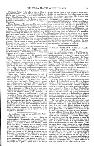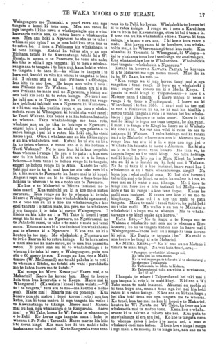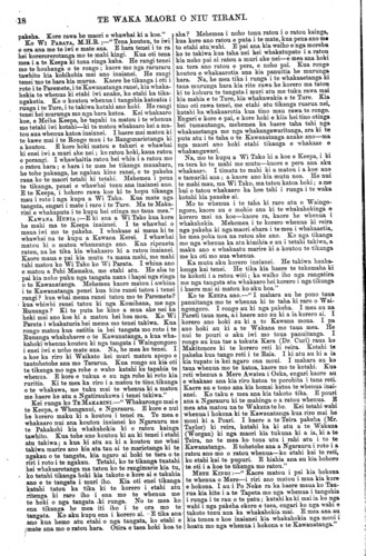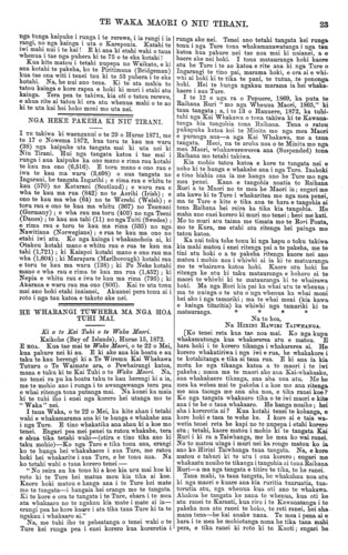 TE WAKA MAORI O NIU TIRANI. "KO TE TIKA, KO TE PONO, KO TE AROHA." VOL. 9.] PO NEKE, WENEREI, PEPUERE o, 1873. [No. 3. HE KUPU ATU ENEI KI NGA HOA TUHI MAI. Tenei kua tae mai te reta a Henare Wiremu te Rahuimango o Ngatirarua raua ko Ngatitoa kei Motueka e noho ana. He reta whakahe taua reta i nga korero a Hoani Meihana i roto i te Kooti i Manawatu i te whakawakanga o te whenua ki reira. E whakaatu ana i te matenga o nga iwi i runga i a Ngatitoa raua ko Ngatiawa. E ki ana kaore i haere a te Pehi ki Ingarani ki te tiki pu mo aua iwi ki ta Hoani Meihana i ki ai; engari i haere ki te tiki pu mo Waikato, mo to matenga o nga rangatira o Waikato i a Ngatitoa raua ko Ngatiawa i Ngamotu—ara ko te Hiakai raua ko Mama. E kore ratou e pai kia whakanuia taua korero ki roto ki te nupepa nei. Kei. te Kooti e mahi aua, e whakarangona ana nga korero o tetahi o tetahi—waiho ma te Kooti e titiro te tikanga. He nui rawa enei reta o nga hoa tuhi mai kei a matou e takoto ana. He tika nga korero o etahi, he hanga noaiho o etahi. E kore e o ki tenei nupepa—taihoa pea e panui atu nga mea e whai tikanga ana. TE mea e whaia ana e nga tangata me nga iwi katoa o te ao he taonga, ho rawa, he moni, hei oranga mo ratou hei rangatiratanga mo ratou. Ko te mea tena e mate nuitia ana e te ngakau o te tangata, he taonga, he rawa—tangata iti, tangata nui, e kotahi ana te whakaaro. (E korero ana matou ki nga mea o tenei ao nei ano; haunga ia te taonga nui. rawa te oranga tonutanga mo te tangata, ara ko te Whakapono— haunga tena.) E tika ana ano hoki taua hiahia o te ngakau o te tangata. Na reira hoki i kitea ai nga mahi pai nga mahi tohunga katoa e kite nei tatou i tenei ao—he whainga hoki na te tangata kia puta tana matauranga. Ko te iwi i nui tona matauranga, i kaha. tona mahi, ko te iwi tena e nui haere ana tona rangatira- tanga—me nga kainga katoa hoki, ko te kainga e tango ana i nga tikanga hei whakanui i a ia, ko te kainga tena e kake ana e whai rawa ana. Tetahi, ko te hunga e mahi rawa ana mana, e kore e kiia ka riro mana anake ana rawa e mahia ana; engari he maha atu nga tangata e whiwhi ana ki te ora ki runga ki tana mahi —ara ko nga tangata e whakaurutia ana ki roto ki ta ratou mahi; me etahi tangata katoa atu e hopu ana i nga tikanga maha e whakamararatia ana e ratou, e te hunga nana te mahi. Ko enei kupu i puta ai i a matou, he rongo korero na matou ki te hinu e pipi ake ana i te whenua i Waiapu i te taha Rawhiti. Kua rongo matou ki tetahi hunga pakeha e hiahia ana kia retia mai e nga maori taua wahi ki a ratou kia mahia e ratou; engari te mea i matakuria ai he kore ano kaore ano kia Karauna Karaatitia taua whenua. Kua kite matou i tetahi o aua pakeha; a e korero ana ia, mehemea ka tika te reti ki a ratou o taua wahi, ka whakapaua e ratou i runga i te mahinga o taua hinu e toru te kau mano pauna, £30, 000!—ara i te hanganga whare, i nga tima, i nga aha noa atu. Ko tetahi o aua pakeha he tohunga mahi i taua tu mahi i Amerika i mua ai. Na, ko tetahi tenei o nga tu mahi hei whakanui whenua, hei whakanui tangata. Mehemea e mahia nuitia ana taua mahi ki Waiapu, penei ma reira e taki atu he tangata kia tokomaha ki reira noho ai. Ka pera, he nui nga ara e kite ai nga tangata maori o kona i to rawa; o kore e taea te korero inaianei. Ko tetahi tikanga pai ma nga tangata nana te whenua mehemea i pera, he ruri i tetahi wahi whenua e tutata ana ki taua mahinga hei taone, a ka retia ki nga pakeha—akuanei he nui te tangata e pirangi Ki te kore e mahia e te pakeha taua hinu, ko tona ahua tonu tena; ka takoto koraha tonu te whenua, e kore e taea ona rawa. Engari me whakawa te whenua me Karauna Karaati kia kaha ai aua pakeha te mahi, kia tika ai hoki te whakapaunga o a ratou moni nui ki runga. Ko te ki tenei i rongo ai matou a etahi tangata nana te whenua, ki te mea ka Karauna Karaatitia ka pau i etahi o ratou ano te mokete Ko te kupu whakahoki mo tena, me here te whenua; me here ki roto ki te Kooti. Katahi ka mau tonu, ka kore e riro i te hoko i te aha noa atu—ko te Reti anake e whakaaetia e te Ture me he mea ka herea te whenua. Kei tetahi atu nupepa pea matou ka whakaputa kupu ano mo tenei. WHANGANUI. HE HUI EI A TE MAKARINI RATOU KO WI TAKO KO WI PARATA. (He penei ano enei korero me era o te hui ki Waiohiki i Ahuriri i taia atu i tera nupepa, ara he mea tuhi mai ki te reo pakeha. Akuanei pea no runga i ta matou whakaturanga ki te reo maori ka ahua rere ke ai etahi kupu i a nga kai korero i wha- kaputa ai; engari ko nga tikanga o roto koia ano enei.) No te 11 o nga ra o Hanuere, 1873, ka hui nga rangatira maori o Whanganui kia kite i a te Maka- rini. Ko etahi enei o a ratou korero kua taia atu ki raro iho nei. Ka korero ko TOPINE TE MAMAKU, ka mea;— " Haere mai e Te Makarini! te minita o te rangima- rietanga nana i homai he maramatanga ki te ao ki nga tangata hoki, puta katoa atu ki te motu nei.