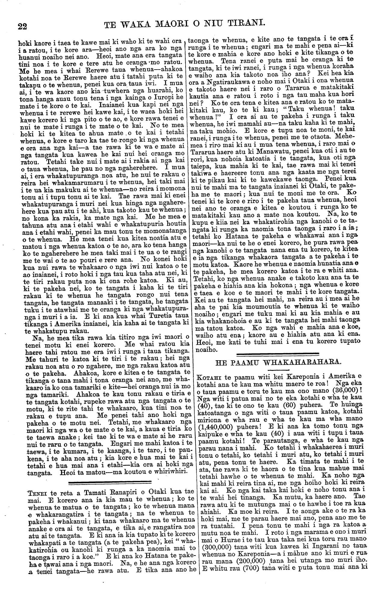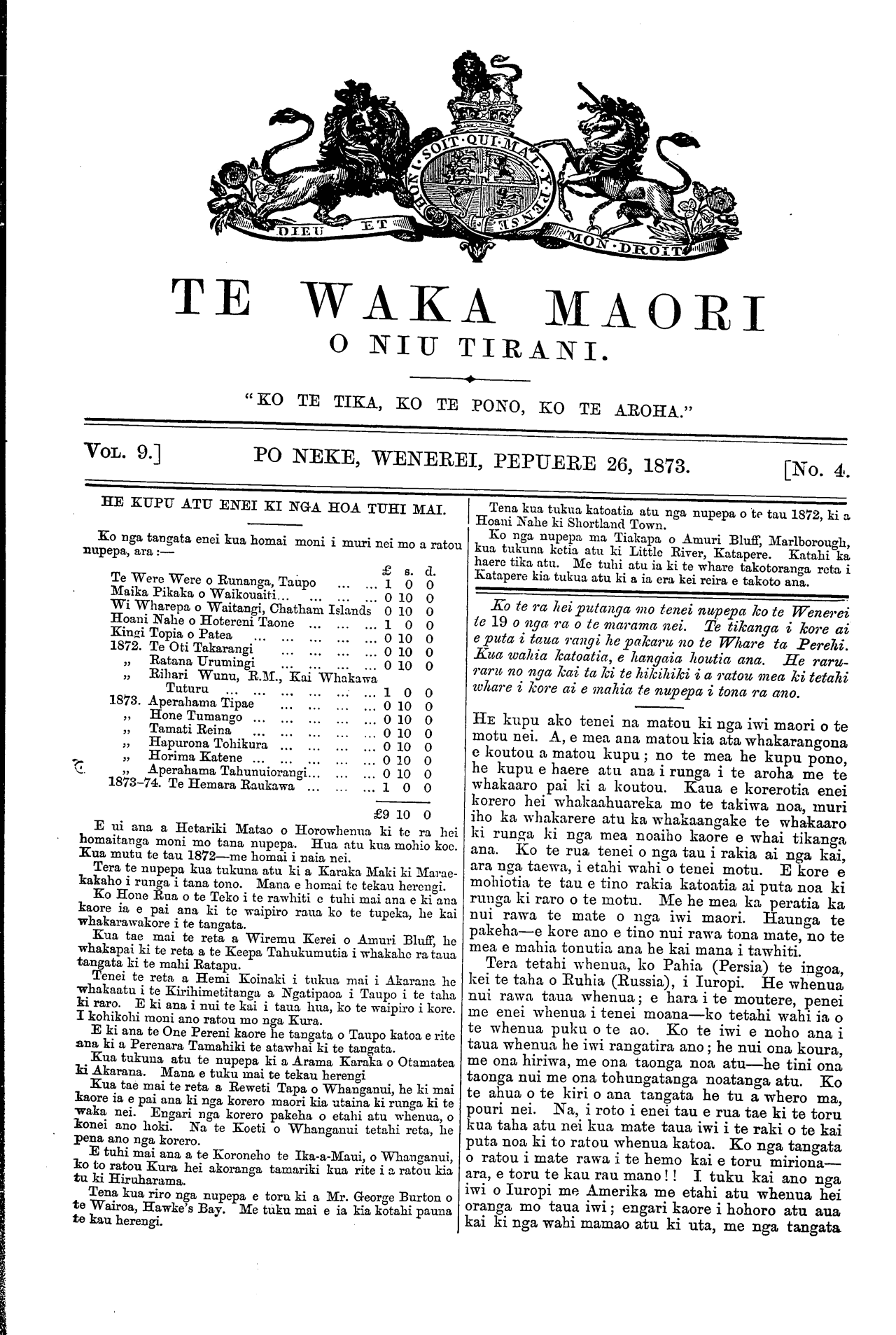TE WAKA MAORI O NIU TIRANI. "KO TE TIKA, KO TE PONO, KO TE AROHA." VOL. 9.] PO NEKE, WENEREI, PEPUERE 26, 1873. [No. 4. HE KUPU ATU ENEI KI NGA HOA TUHI MAI. Ko nga tangata enei kua homai moni i muri nei mo a ratou nupepa, ara:— £ a. d. Te Were Were o Runanga, Taupo ... ... 1 O O Maika Pikaka o Waikouaiti... ... ... ... O 10 O Wi Wharepa o Waitangi, Chatham Islands O 10 O Hoani Nahe o Hotereni Taone ... ... ...I O O Kingi Topia o Patea ... ... ... ... ... O 10 O 1872. Te Oti Takarangi ... ... ... ... O 10 O Ratana Urumingi ... ... ... ... O 10 O Rihari Wunu, R. M., Kai Whakawa Tuturu ... ... ... ... ... ... 1 O O 1873. Aperahama Tipae ... ... ... ... O 10 O Hone Tumango ... ... ... ... ... O 10 O Tamati Reina ... ... ... ... ... O 10 O Hapurona Tohikura ... ... ... ... O 10 O Horima Katene ... ... ... ... ... O 10 O Aperahama Tahunuiorangi ... ... O 10 O 1873-74. Te Hemara Raukawa ... ... ...I O O £9 10 O E ui ana a Herariki Matao o Horowhenua ki te ra hei homaitanga moni mo tana nupepa. Hua atu kua mohio koe. Kua mutu te tau 1872—me homai i naia nei. Tera te nupepa kua tukuna atu ki a Karaka Maki ki Marae- kakaho i runga i tana tono. Mana e homai te tekau herengi. Ko Hone Rua o te Teko i te rawhiti e tuhi mai ana e ki ana kaore ia e pai ana ki te waipiro raua ko to tupeka, he kai whakarawakore i te tangata. Kua tae mai te reta a Wiremu Kerei o Amuri Bluff, he whakapai ki te reta a te Keepa Tahukumutia i whakahe ra taua tangata ki te mahi Ratapu. Tenei te reta a Hemi Koinaki i tukua mai i Akarana he whakaatu i te Kirihimetitanga a Ngatipaoa i Taupo i te taha ki raro. E ki ana i nui te kai i taua hua, ko te waipiro i kore. I kohikohi moni ano ratou mo nga Kura. E ki ana te One Pereni kaore he tangata o Taupo katoa e rite ana ki a Perenara Tamahiki te atawhai ki te tangata. Kua tukuna atu te nupepa ki a Arama Karaka o Otamatea ki Akarana. Mana e tuku mai te tekau herengi Kua tae mai te reta a Reweti Tapa o Whanganui, he ki mai kaore ia e pai ana ki nga korero maori kia utaina ki runga ki te waka nei. Engari nga korero pakeha o etahi atu whenua, o tenei ano hoki. Na te Koeti o Whanganui tetahi reta, he pena ano nga korero. E tuhi mai ana a te Koroneho te Ika-te-Maui , o Whanganui, ko to ratou Kura hei akoranga tamariki kua rite i a ratou kia tu ki Hiruharama. Tena kua riro nga nupepa e toru ki a Mr. George Burton o te Wairoa, Hawke's Bay. Me tuku mai e ia kia kotahi pauna te kau herengi. Tena kua tukua katoatia atu nga nupepa o te tau 1872, ki a Hoani Nahe ki Shortland Town. Ko nga nupepa ma Tiakapa o Amuri Bluff, Marlborough, kua tukuna ketia atu ki Little River, Katapere. Katahi ka haere tika atu. Me tuhi atu ia ki te whare takotoranga reta i Katapere kia tukua atu ki a ia era kei reira e takoto ana. Ko te ra hei putanga mo tenei nupepa ko te Wenerei to 19 o nga ra o te marama nei. Te tikanga i kore ai e puta i taua rangi he pakaru no te Whare ta Perehi. Kua wahia katoatia, e hangaia houtia ana. He raru- raru no nga kai ta ki te hikihiki i a ratou mea ki tetahi whare i kore ai e mahia te nupepa i tona ra ano. HE kupu ako tenei na matou ki nga iwi maori o te motu nei. A, e mea aua matou kia ata whakarangona e koutou a matou kupu; no te mea he kupu pono, he kupu e haere atu ana i runga i te aroha me te whakaaro pai ki a koutou. Kaua e korerotia enei korero hei whakaahuareka mo te takiwa noa, muri iho ka whakarere atu ka whakaangake^ te whakaaro ki runga ki nga mea noaiho kaore e whai tikanga ana. Ko te rua tenei o nga tau i rakia ai nga kai, ara nga taewa, i etahi wahi o tenei motu. E kore e mohiotia te tau e tino rakia katoatia ai puta noa ki runga ki raro o te motu. Me he mea ka peratia ka nui rawa te mate o nga iwi maori. Haunga te pakeha—e kore ano e tino nui rawa tona mate, no te mea e mahia tonutia ana he kai mana i tawhiti. Tera tetahi whenua, ko Pahia (Persia) te ingoa, kei te taha o Ruhia (Russia), i Iuropi. He whenua nui rawa taua whenua; e hara i te moutere, penei me enei whenua i tenei moana—ko tetahi wahi ia o te whenua puku o te ao. Ko te iwi e noho ana i taua whenua he iwi rangatira ano; he nui ona koura, me ona hiriwa, me ona taonga noa atu—he tini ona taonga nui me ona tohungatanga noatanga atu. Ko te ahua o te kiri o ana tangata he tu a whero ma, pouri nei. Na, i roto i enei tau e rua tae ki te toru kua taha atu nei kua mate taua iwi i te raki o te kai puta noa ki to ratou whenua katoa. Ko nga tangata o ratou i mate rawa i te hemo kai e toru miriona— ara, e toru te kau rau mano!! I tuku kai ano nga iwi o Iuropi me Amerika me etahi atu whenua hei oranga mo taua iwi; engari kaore i hohoro atu aua kai ki nga wahi mamao atu ki uta, me nga tangata