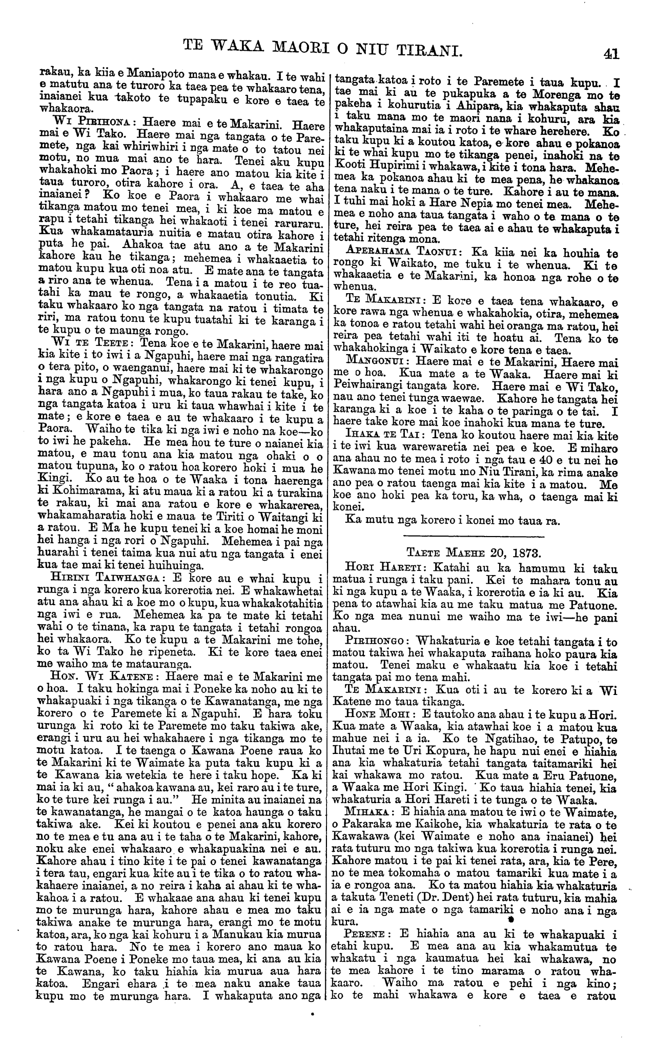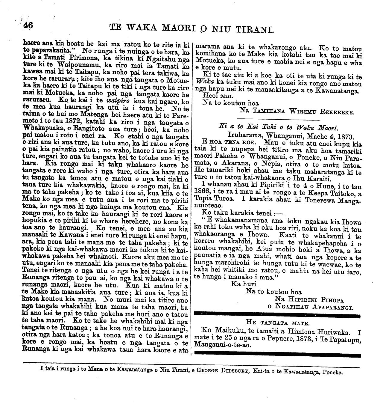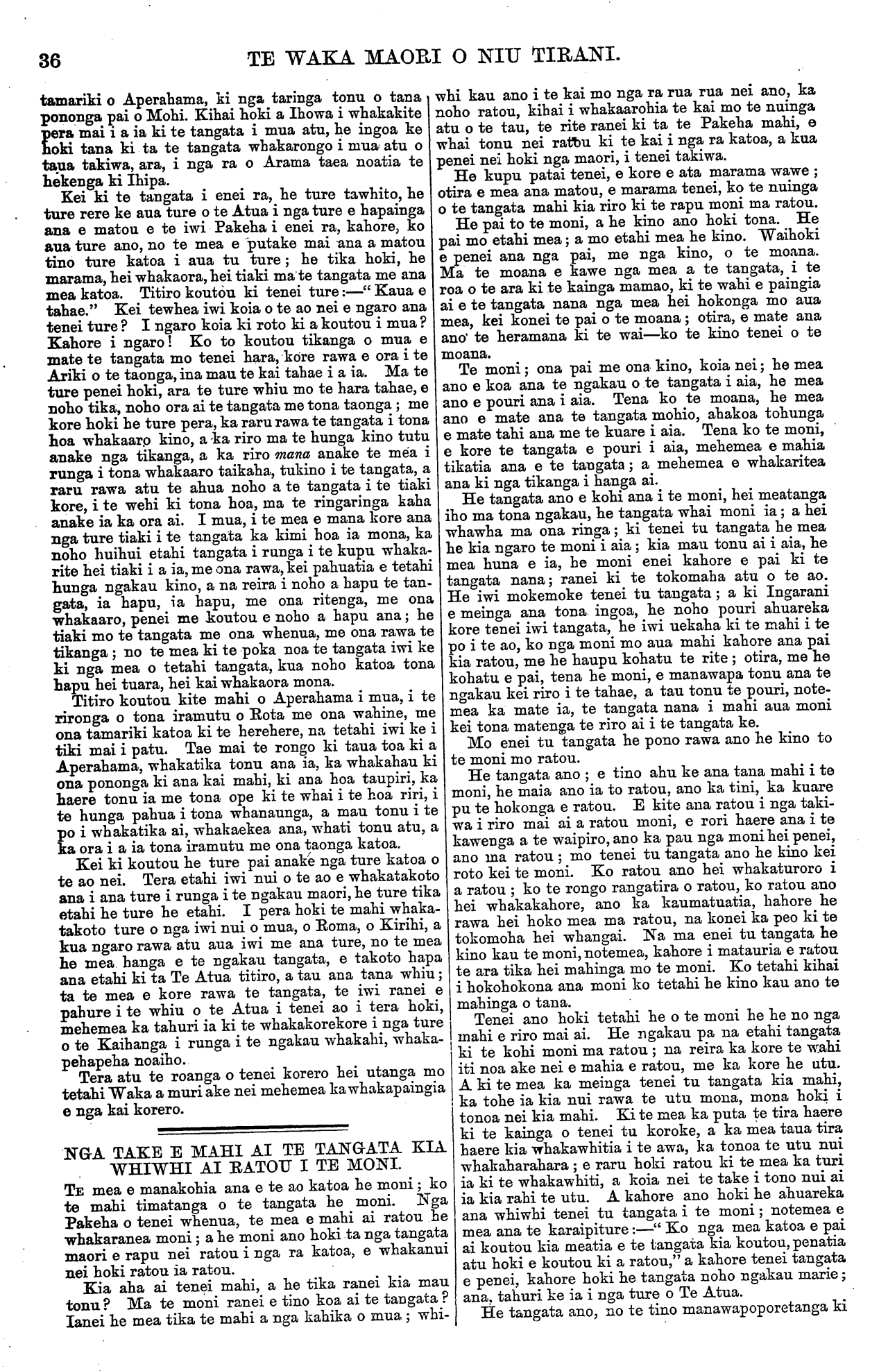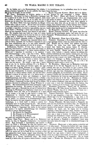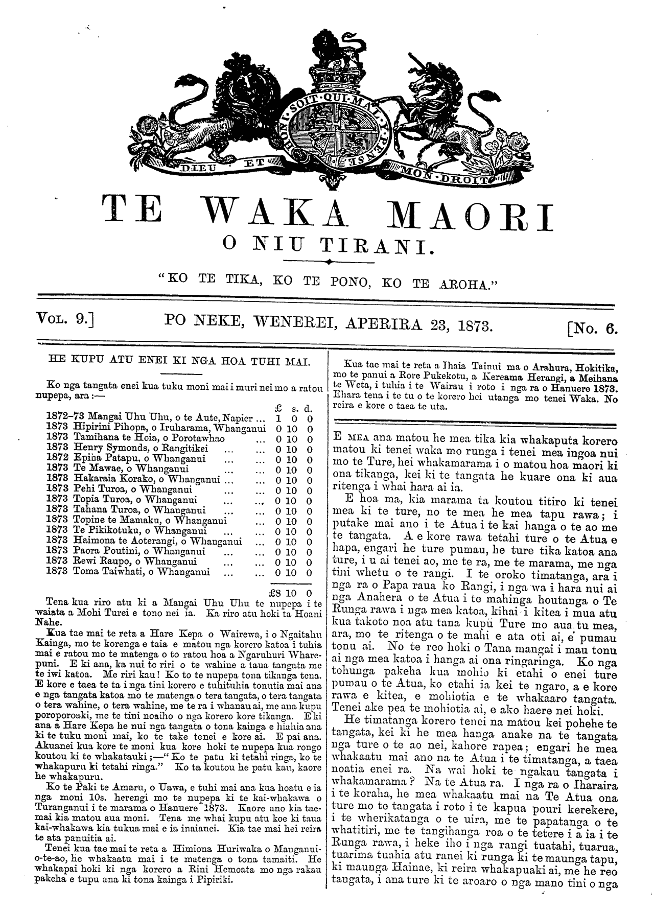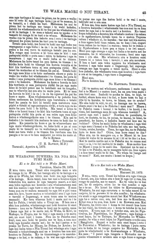 TE WAKA MAORI O NIU TIRANI. "KO TE TIKA, KO TE PONO, KO TE AROHA." VOL. 9.] PO NEKE, WENEREI, APERIRA 23, 1873. [No. 6. HE KUPU ATU ENEI KI NGA HOA TUHI MAI. Ko nga tangata enei kua tuku moni mai i muri nei mo a ratou nupepa, ara:— £ 5. a. 1872-73 Mangai Uhu Uhu, o te Aute, Napier ... 1 O O 1873 Hipirini Pihopa, o Iruharama, Whanganui O 10 O 1873 Tamihana te Hoia, o Porotawhao ... O 10 O 1873 Henry Symonds, o Rangitakei ... ... 010 O 1872 Epiha Patapu, o Whanganui ... ... O 10 O 1873 Te Mawae, o Whanganui ... ... 010 O 1873 Hakaraia Korako, o Whanganui ... ... 010 O 1873 Pehi Turoa, o Whanganui ... ... 010 O 1873 Topia Turoa, o Whanganui ... ... 010 O 1873 Tahana Turoa, o Whanganui ... ... 010 O 1873 Topine te Mamaku, o Whanganui ... 010 O 1873 Te Pikikotuku, o Whanganui ... ... 010 O 1873 Haimona te Aoterangi, o Whanganui ... O 10 O 1873 Paora Poutini, o Whanganui ... ... 010 O 1873 Rewi Raupo, o Whanganui ... ... 010 O 1873 Toma Taiwhati, o Whanganui ... ... 010 O £8 10 O Tena kua riro atu ki a Mangai Uhu Uhu te nupepa i te waiata a Mohi Turei e tono nei ia. Ka riro atu hoki ta Hoani Nahe. Kua tae mai te reta a Hare Kepa o Wairewa, i o Ngaitahu Kainga, mo te korenga e taia e matou nga korero katoa i tuhia mai e ratou mo te matenga o to ratou, hoa a Ngaruhuri Whare- puni. E ki ana, ka nui te riri o te wahine a taua tangata me te iwi katoa. Me riri kau! Ko to te nupepa tona tikanga tena. E kore e taea te ta i nga tini korero e tuhituhia tonutia mai ana e nga tangata katoa mo te matenga o tera tangata, o tera tangata o tera wahine, o tera wahine, me te ra i whanauai, me ana kupu poroporoaki, me te tini noaiho o nga korero kore tikanga. E ki ana a Hare Kepa he nui nga tangata o tona kainga e hiahia ana ki te tuku moni mai, ko te take tenei e kore ai. E pai ana. Akuanei kua kore te moni kua kore hoki te nupepa kua rongo koutou ki te whakatauki;—" Ko te patu ki tetahi ringa, ko te whakapuni ki tetahi ringa." Ko ta koutou he patu kau, kaore he whakapuni. Ko te Paki te Amaru, o Uawa, e tuhi mai ana kua hoatu e ia nga moni 10s. herengi mo te nupepa ki te kai-whakawa o Turanganui i te marama o Hanuere 1873. Kaore ano kia tae- mai kia matou aua moni. Tena me whai kupu atu koe ki taua kai-whakawa kia tukua mai e ia inaianei. Kia tae mai hei reira, te ata panuitia ai. Tenei kua tae mai te reta a Himiona Huriwaka o Manganui- o-te-ao, he whakaatu mai i te matenga o tona tamaiti. He whakapai hoki ki nga korero a Rini Hemoata mo nga rakau pakeha e tupu ana ki tona kainga i Pipiriki. Kua tae mai te reta a Ihaia Tainui ma o Arahura, Hokitika, mo te panui a Rore Pukekotu, a Kereama Herangi, a Meihana te Weta, i tuhia i te Wairau i roto i nga ra o Hanuere 1873. Ehara tena i te tu o te korero hei utanga mo tenei Waka. No reira e kore e taea te uta. E MEA ana matou he mea tika kia whakaputa korero matou ki tenei waka mo runga i tenei mea ingoa nui mo te Ture, hei whakamarama i o matou hoa maori ki ona tikanga, kei ki te tangata he kuare ona ki aua ritenga i whai hara ai ia. E hoa. ma, kia marama ta koutou titiro ki tenei mea ki te ture, no te mea he mea tapu rawa; i putake mai ano i te Atua i te kai hanga o te ao me te tangata. A e kore rawa tetahi ture o te Atua e hapa, engari he ture pumau, he ture tika katoa ana ture, i u ai tenei ao, mo te ra, me te marama, me nga tini whetu o te rangi. I te oroko timatanga, ara i nga ra o Papa raua ko Rangi, i nga wa i hara nui ai nga Anahera o te Atua i to mahinga houtanga o Te Runga rawa i nga mea katoa, kihai i kitea i mua atu kua takoto noa atu tana kupu Ture mo aua tu mea, ara, mo te ritenga o te mahi e ata oti ai, e pumau tonu ai. No te reo hoki o Tana mangai i mau tonu ai nga mea katoa i hanga ai ona ringaringa. Ko nga tohunga pakeha kua mohio ki etahi o enei ture pumau o te Atua, ko etahi ia kei te ngaro, a e kore rawa o kitea, e mohiotia e te whakaaro tangata. Tenei ake pea te mohiotia ai, e ako haere nei hoki. He timatanga korero tenei na matou kei pohehe te tangata, kei ki he mea hanga anake na te tangata nga ture o te ao nei, kahore rapea; engari he mea whakaatu mai ano na te Atua i te timatanga, a taea noatia enei ra. Na wai hoki te ngakau tangata i whakamarama ? Na te Atua ra. I nga ra o Iharaira i te koraha, he mea whakaatu mai na Te Atua ona ture mo to tangata i Toto i te kapua pouri kerekere, i te wherikatanga o te uira, me te papatanga o te whatitiri, mo te tangihanga roa o te tetere i a ia i te Runga rawa, i heke iho i nga rangi tuatahi, tuarua, tuarima tuahia atu ranei ki runga ki te maunga tapu, ki maunga Hainae, ki reira whakapuaki ai, me he reo tangata, i ana ture ki te aroaro o nga mano tini o nga