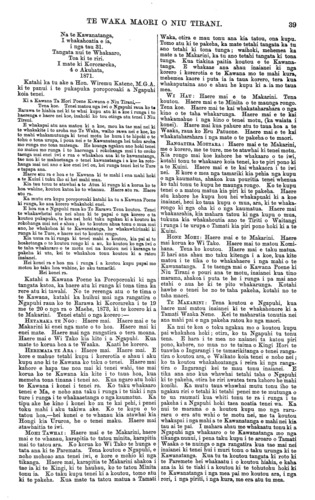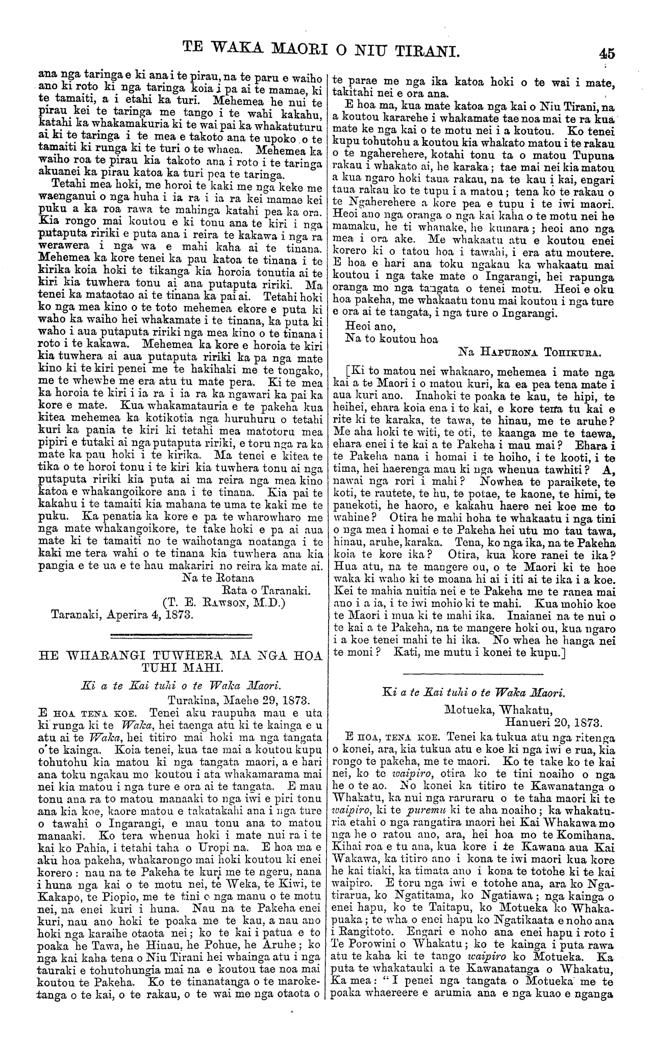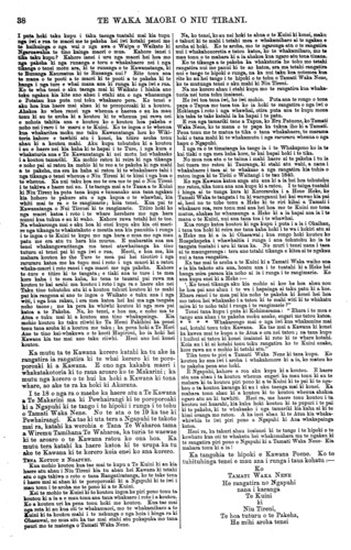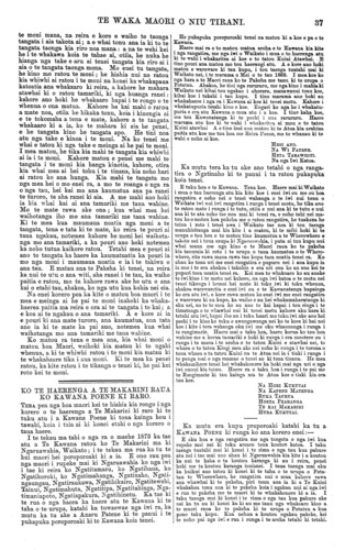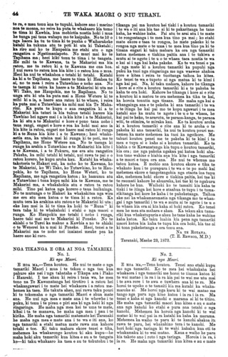 TE WAKA MAORI O NIU TIRANI. 45 ana nga taringa e ki ana i te pirau, na te paru e waiho ano ki roto ki nga taringa koia i pa ai te mamae, ki te tamaiti, a i etahi ka turi. Mehemea he nui te pirau kei te taringa me tango i te wahi kakahu, katahi ka whakamakuria ki te wai pai ka whakatuturu ai ki te taringa i te mea e takoto ana te upoko o te tamaiti ki runga ki te turi o te whaea. Mehemea ka waiho roa te pirau kia takoto ana i roto i te taringa akuanei ka pirau katoa ka turi pea te taringa. Tetahi mea hoki, me horoi te kaki me nga keko me waenganui o nga huha i ia ra i ia ra kei mamae kei puku a ka roa rawa te mahinga katahi pea ka ora. Kia rongo mai koutou e ki tonu ana te kiri i nga putaputa ririki e puta ana i reira te kakawa i nga ra werawera i nga wa e mahi kaha ai te tinana. Mehemea ka kore tenei ka pau katoa te tinana i te kirika koia hoki te tikanga kia horoia tonutia ai te kiri kia tuwhera tonu ai ana putaputa ririki. Ma tenei ka mataotao ai te tinana ka pai ai. Tetahi hoki ko nga mea kino o te toto mehemea ekore e puta ki waho ka waiho hei whakamate i te tinana, ka puta ki waho i aua putaputa ririki nga mea kino o te tinana i roto i te kakawa. Mehemea ka kore e horoia te kiri kia tuwhera ai aua putaputa ririki ka pa nga mate kino ki te kiri penei me te hakihaki me te tongako, me te whewhe me era atu tu mate pera. Ki te mea ka horoia te kiri i ia ra i ia ra ka ngawari ka pai ka kore e mate. Kua whakamatauria e te pakeha kua kitea mehemea ka kotikotia nga huruhuru o tetahi kuri ka pama te kiri ki tetahi mea matotoru mea pipiri e tutaki ai nga putaputa ririki, e toru nga ra ka mate ka pau hoki i te kirika. Ma tenei e kitea te tika o te horoi tonu i te kiri kia tuwhera tonu ai nga putaputa ririki kia puta ai ma reira nga mea kino katoa e whakangoikore ana i te tinana. Kia pai te kakahu i te tamaiti kia mahana te uma te kaki me te puku. Ka penatia ka kore e pa te wharowharo me nga mate whakangoikore, te take hoki e pa ai aua mate ki te tamaiti no te waihotanga noatanga i te kaki me tera wahi o te tinana kia tuwhera ana kia pangia e te ua e te hau makariri no reira ka mate ai. Na te Rotana Rata o Taranaki. (T. E. Rawson, M D.) Taranaki, Aperira 4, 1873. HE WHARANGI TUWHERA MA NGA HOA TUHI MAHI. Ki a te Kai tuhi o te Waka Maori. Turakina, Maehe 29, 1873. E HOA TENA KOE. Tenei aku raupuha mau e uta ki runga ki te Waka, hei taenga atu ki te kainga e u atu ai te Waka, hei titiro mai hoki ma nga tangata o te kainga. Koia tenei, kua tae mai a koutou kupu tohutohu kia matou ki nga tangata maori, a e hari ana toku ngakau mo koutou i ata whakamarama mai nei kia matou i nga ture e ora ai te tangata. E mau tonu ana ra to matou manaaki to nga iwi e piri tonu ana kia koe, kaore matou e takatakahi ana i nga ture o tawahi o Ingarangi, e mau tonu ana to matou manaaki. Ko tera whenua hoki i mate nui ra i te kai ko Pahia, i tetahi taha o Uropi na. E hoa ma e aku hoa pakeha, whakarongo mai hoki koutou ki enei korero : nau na te Pakeha te kuri me te ngeru nana i huna nga kai o te motu nei, te Weka, te Kiwi, te Kakapo, te Piopio, me te tini o nga manu o te motu nei, na enei kuri i huna. Nau na te Pakeha enei kuri, nau ano hoki te poaka me te kau. a nau ano hoki nga karaihe otaota nei; ko te kai i patua e to poaka he Tawa, he Hinau he Pohue, he Aruhe; ko nga kai kaha tena o Niu Tirani hei whainga atu i nga tauraki e tohutohungia mai na e koutou tae noa mai koutou te Pakeha. Ko te tinanatanga o te maroke- tanga o te kai, o te rakau, o te wai me nga otaota o te parae me nga ika katoa hoki o te wai i mate, takitahi nei e ora ana. E hoa ma, kua mate katoa nga kai o Niu Tirani, na a koutou kararehe i whakamate tae noa mai te ra kua mate ke nga kai o te motu nei i a koutou. Ko tenei kupu tohutohu a koutou kia whakato matou i te rakau o te ngaherehere, kotahi tonu ta o matou Tupuna rakau i whakato ai, he karaka; tae mai nei kia matou a kua ngaro hoki taua rakau, na te kau i kai, engari taua rakau ko te tupu i a matou; tena ko te rakau o te Ngaherehere a kore pea e tupu i te iwi maori. Heoi ano nga oranga o nga kai kaha o te motu nei he mamaku, he ti whanake, he kumara; heoi ano nga mea i ora ake. Me whakaatu atu e koutou enei korero ki o tatou hoa i tawahi, i era atu moutere. E hoa e hari ana toku ngakau ka whakaatu mai koutou i nga take mate o Ingarangi, hei rapunga oranga mo nga tangata o tenei motu. Heoi e oku hoa pakeha, me whakaatu tonu mai koutou i nga ture e ora ai te tangata, i nga ture o Ingarangi. Heoi ano, Na to koutou hoa Na HAPURONA TOHIKURA. [Ki to matou nei whakaaro, mehemea i mate nga kai a te Maori i o ratou kuri, ka ea pea tena mate i aua kuri ano. Inahoki te poaka te kau, te hipi, te heihei, ehara koia ena i to kai, e kore tena tu kai e rite ki te karaka, te tawa, te hinau, me te aruhe ? Me aha hoki te witi, te oti, te kaanga me te taewa, ehara enei i te kai a te Pakeha i mau mai ? Ehara i te Pakeha nana i homai i te hoiho, i te kooti, i te tima, hei haerenga mau ki nga whenua tawhiti? A, nawai nga rori i mahi ? Nowhea te paraikete, te koti, te rautete, te hu, te potae, te kaore, te himi, te panekoti, he haere, e kakahu haere nei koe me to wahine? Otira he mahi hoha te whakaatu i nga tini o nga mea i homai e te Pakeha hei utu mo tau tawa, hinau, aruhe, karaka. Tena, ko nga ika, na te Pakeha koia te kore ika? Otira, kua kore ranei te ika? Hua atu, na te mangere ou, o te Maori ki te hoe waka ki waho ki te moana hi ai i iti ai te ika i a koe. Kei te mahia nuitia nei e te Pakeha me te ranea mai ano i a ia, i te iwi mohio ki te mahi. Kua mohio koe te Maori i mua ki te mahi ika. Inaianei na te nui o te kai a te Pakeha, na te mangere hoki ou, kua ngaro i a koe tenei mahi te hi ika. No whea he hanga nei te moni ? Kati, me mutu i konei te kupu.] Ki a te Kai tuhi o te Waka Maori. Motueka, Whakatu, Hanueri 20, 1878. E HOA, TENA KOE. Tenei ka tukua atu nga ritenga o konei, ara, kia tukua atu e koe ki nga iwi e rua, kia rongo te pakeha, me te maori. Ko te take ko te kai nei, ko te waipiro, otira ko te tini n